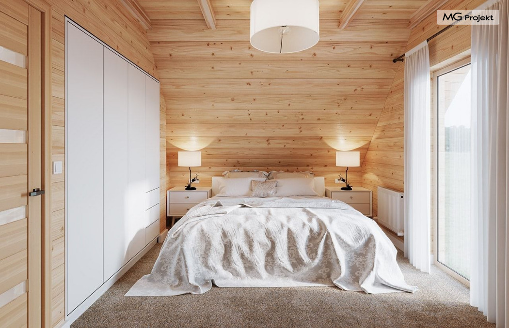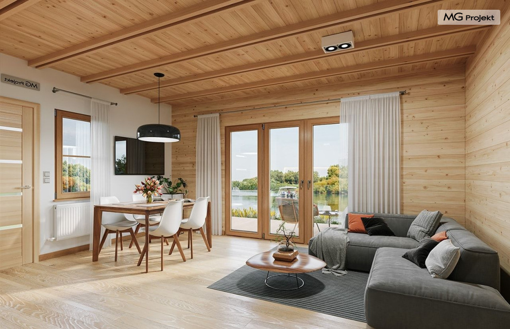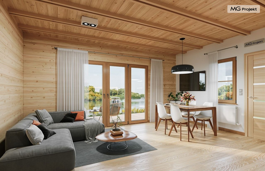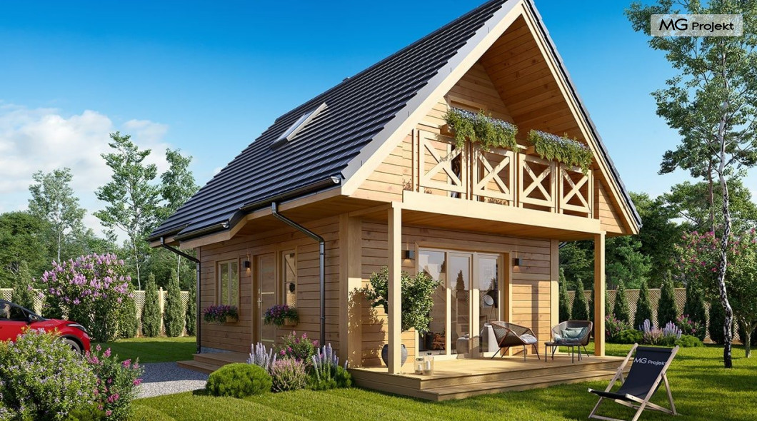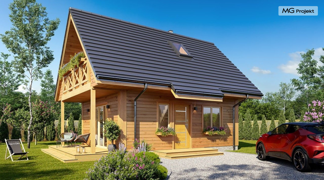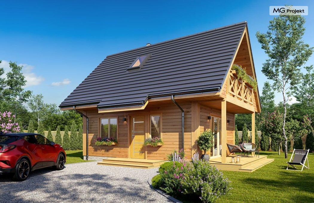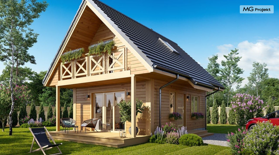 Projekt domu Sosenka Drewniana to mały zgrabny domek. Może pełnić funkcję letniskowego, ale również całorocznego domu. Jego zaletami są właściwe proporcje nadające estetyczny wygląd budynku, funkcjonalne wnętrze oraz prosta, tania w budowie konstrukcja. Pracownia posiada wiele wersji Sosenek ze zmienionymi gabarytami - z balkonem i tarasem z boku domu (Sosenka 4), przedłużony o 0,5 m - bez balkonu, przedłużony o 1,5 m z pomieszczeniem gospodarczym przy kuchni (Sosenka 3), z gankiem wejściowym (Sosenka 2), czy powiększony wariant domu (Sosenka 5). Projekt domu Sosenka Drewniana dostępny jest również w wersji odbicia lustrzanego, oraz dwóch wersjach wariantowych - z gankiem (Projekt domu Sesenka Drewniana Wariant B) i w wersji poszerzonej (Projekt domu Sesenka Drewniana Wariant D).