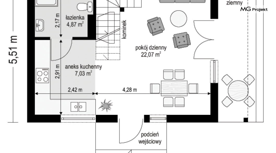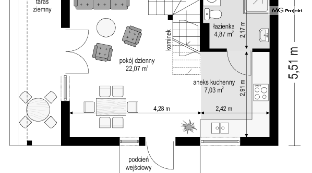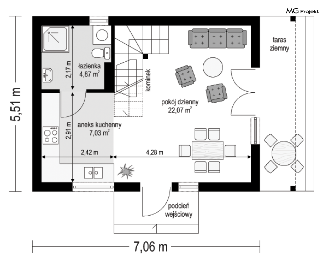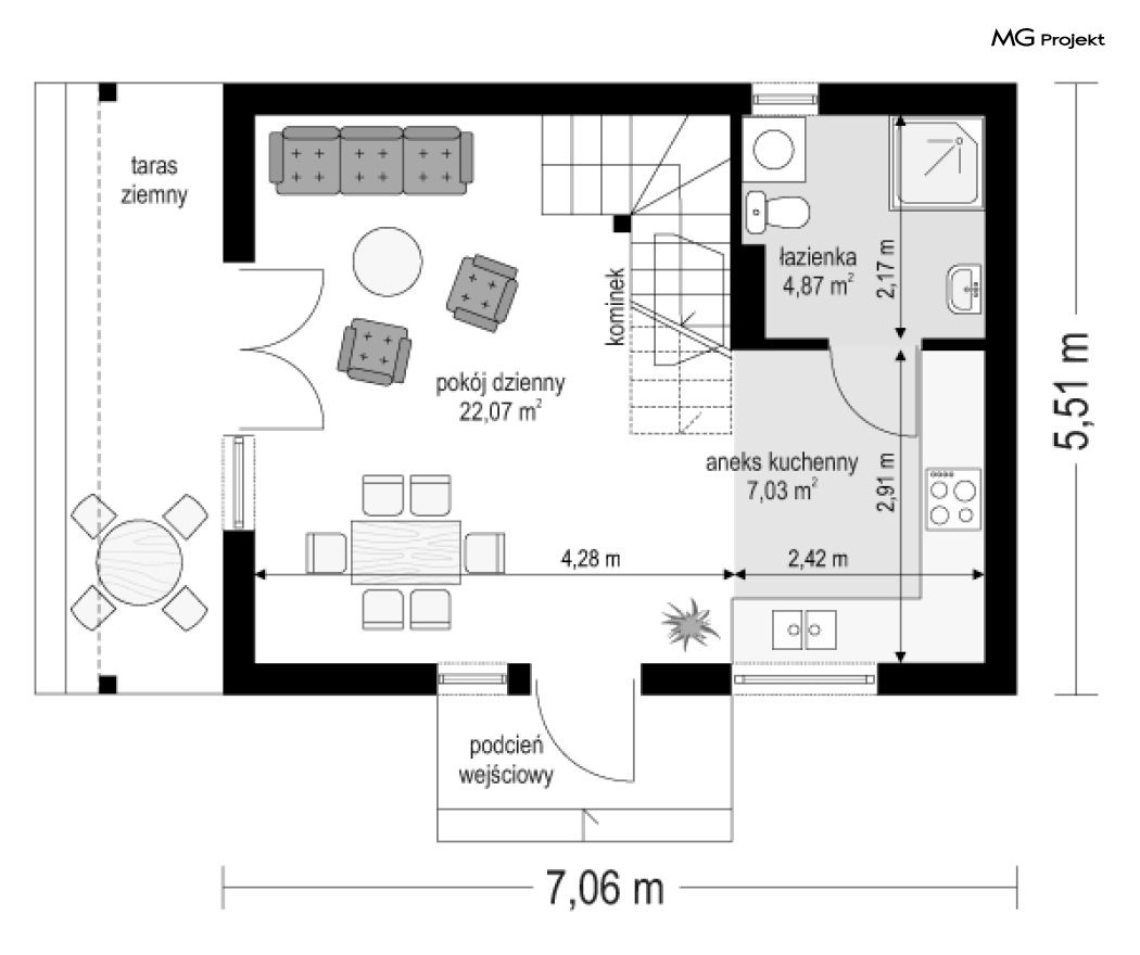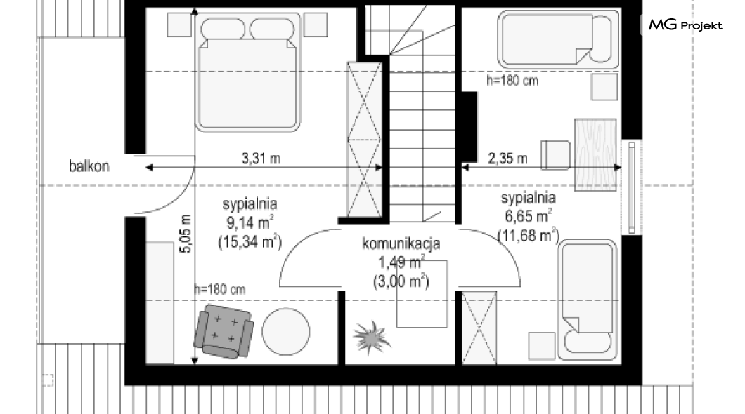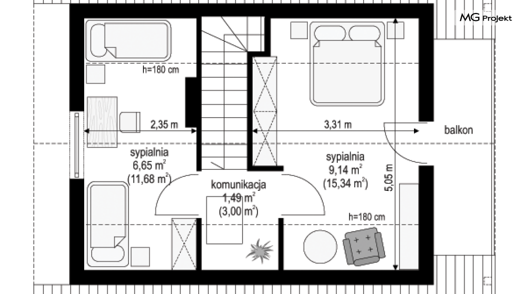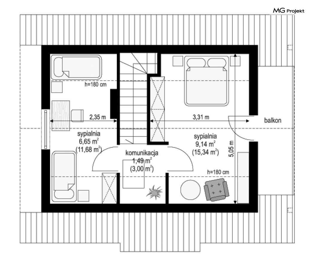 Projekt domu Sosenka Drewniana to mały zgrabny domek. Może pełnić funkcję letniskowego, ale również całorocznego domu. Jego zaletami są właściwe proporcje nadające estetyczny wygląd budynku, funkcjonalne wnętrze oraz prosta, tania w budowie konstrukcja. Pracownia posiada wiele wersji Sosenek ze zmienionymi gabarytami - z balkonem i tarasem z boku domu (Sosenka 4), przedłużony o 0,5 m - bez balkonu, przedłużony o 1,5 m z pomieszczeniem gospodarczym przy kuchni (Sosenka 3), z gankiem wejściowym (Sosenka 2), czy powiększony wariant domu (Sosenka 5). Projekt domu Sosenka Drewniana dostępny jest również w wersji odbicia lustrzanego, oraz dwóch wersjach wariantowych - z gankiem (Projekt domu Sesenka Drewniana Wariant B) i w wersji poszerzonej (Projekt domu Sesenka Drewniana Wariant D).