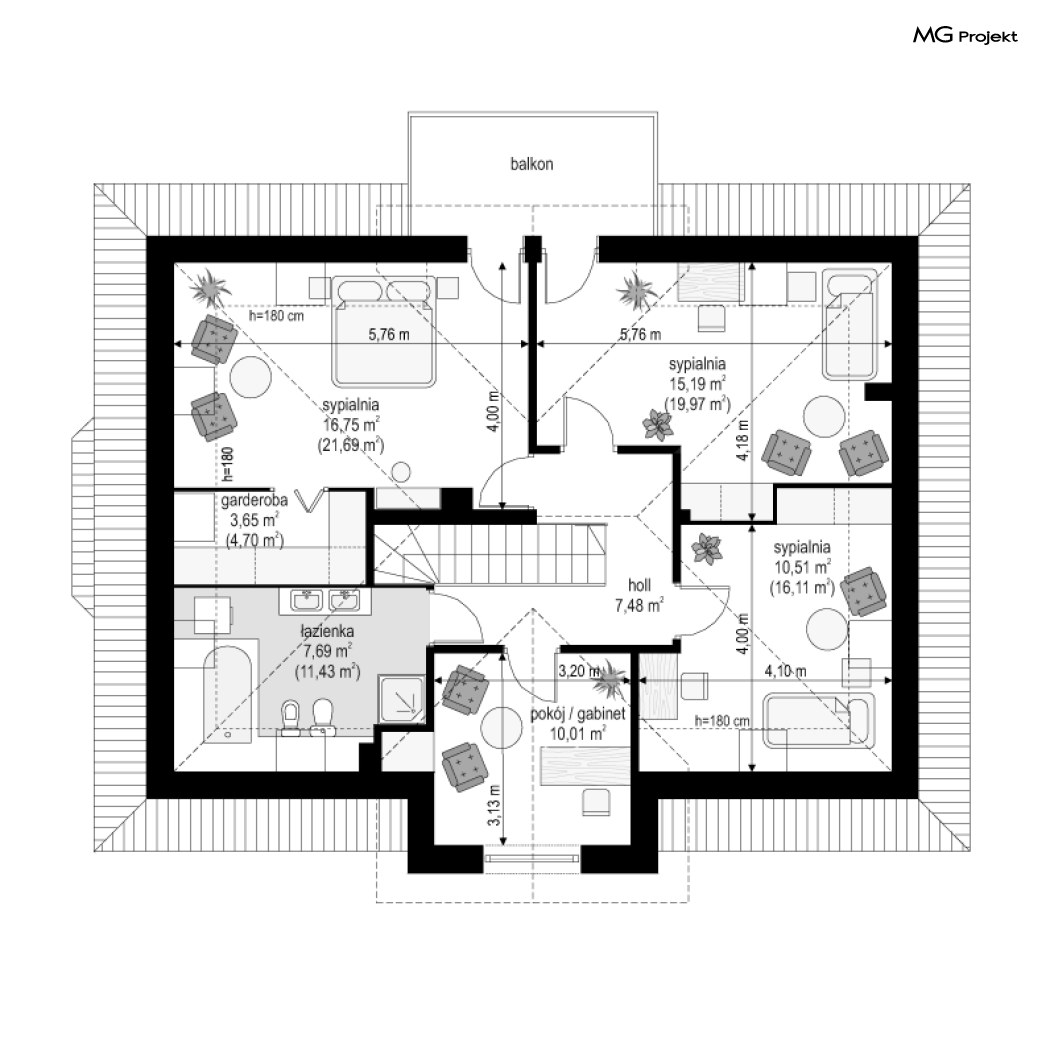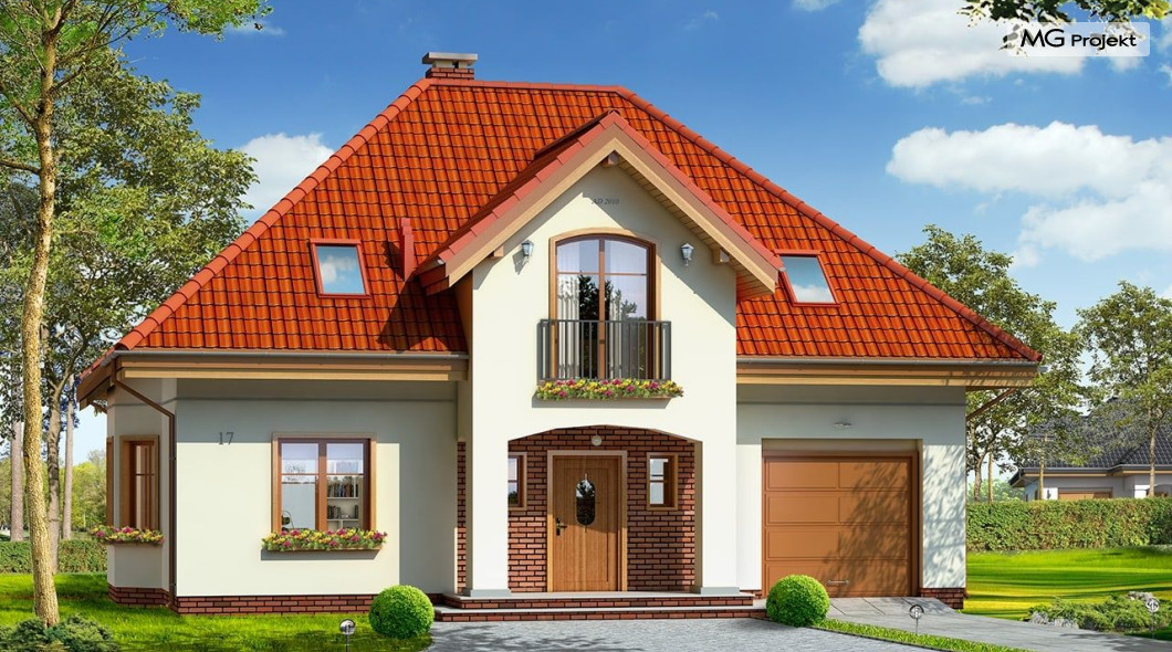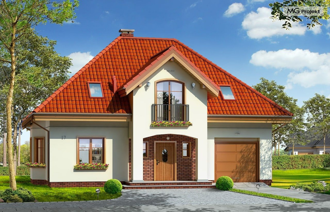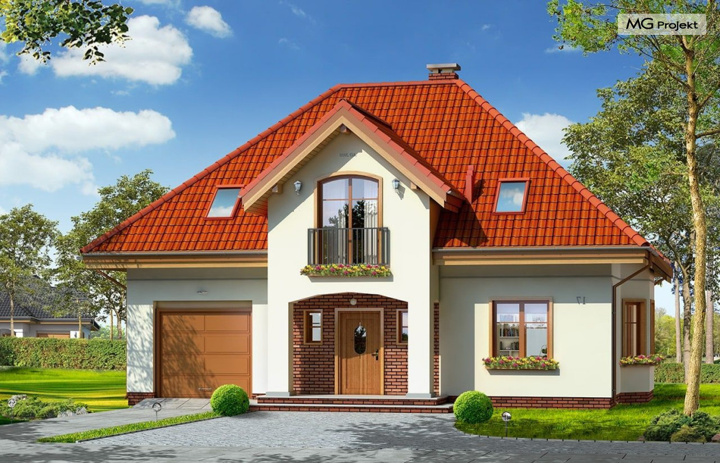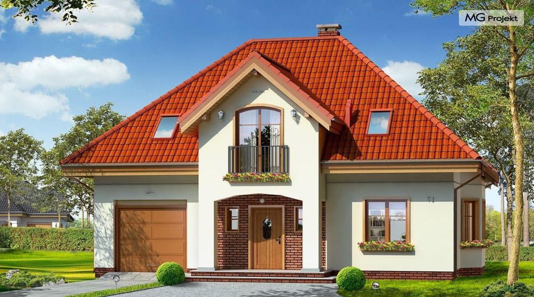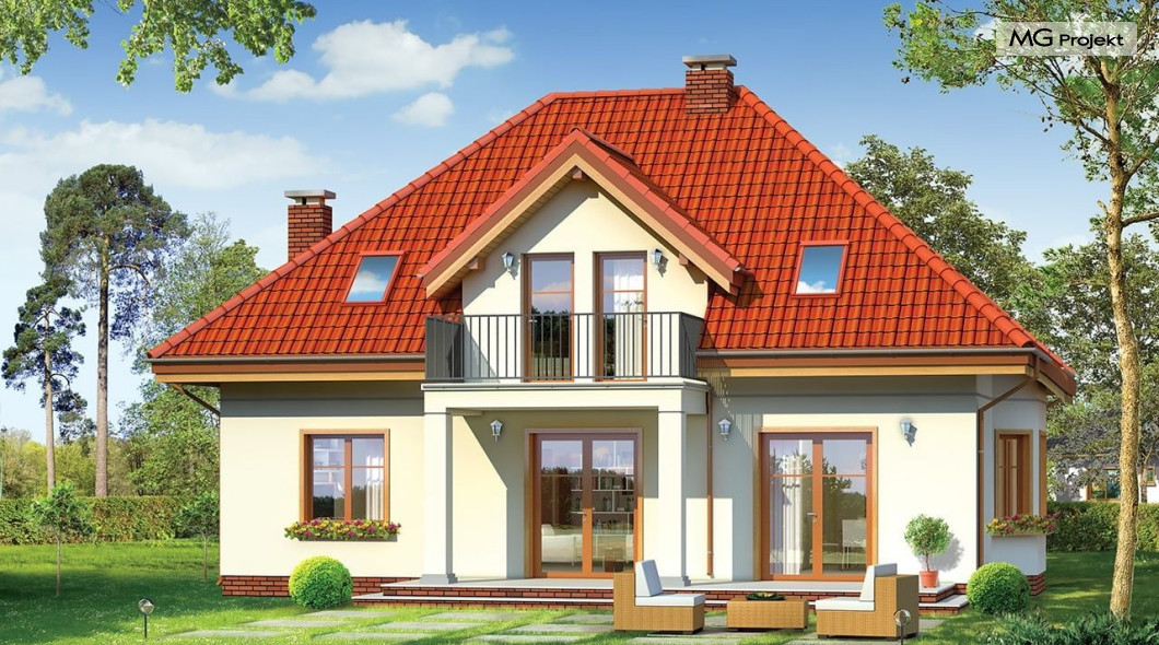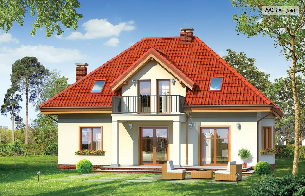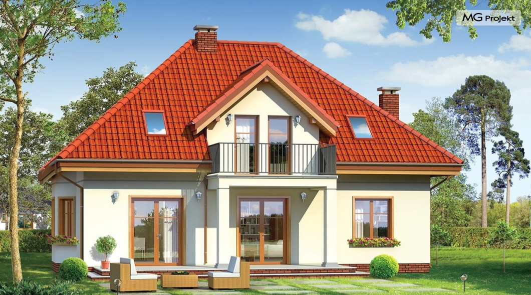 Projekt domu Stokrotka to uroczy budynek o prostej, klarownej bryle. Domek jednorodzinny przeznaczony dla cztero-pięcioosobowej rodziny. Projekt domu Stokrotka zbudowany jest na planie prostokąta. Rzut parteru i poddasza zwieńczony jest czterospadowym dachem z symetrycznie ustawionymi lukarnami od frontu i od strony ogrodu. Frontowa lukarna połączona jest z podcieniem wejściowym na kolumienkach. Od strony ogrodu zaprojektowano częściowe zadaszenie tarasu dużym balkonem. Urok domu to jego prostota i właściwe proporcje, do tego ciekawe detale, oraz funkcjonalnie zaprojektowane, przemyślane wnętrze. Na parterze mieszkania, zaprojektowano obszerny pokój dzienny z centralnie usytuowanym kominkiem, oraz dużymi przeszkleniami na taras i ogród. Salon w Stokrotce łączy się częściowo z półotwartą kuchnią przez aneks jadalny z wykuszem. Bardzo ładny hol z reprezentacyjnymi schodami na poddasze dopełnia wnętrze parteru. Dodatkowo w projekcie, przewidziano jeszcze część gospodarczą z garażem i kotłownią. Na poddaszu zaprojektowano trzy sypialnie z garderobami lub szafami wbudowanymi, łazienkę i dodatkowy pokój - gabinet lub czwartą sypialnię. Pracownia dysponuje wersją odbicia lustrzanego projektu domu Stokrotka.