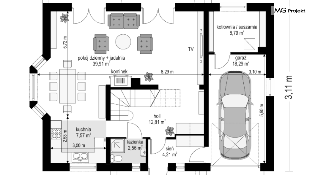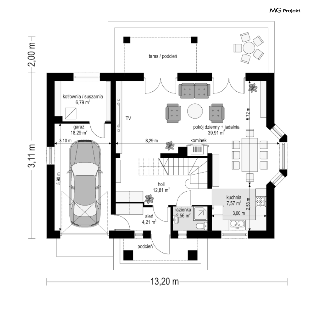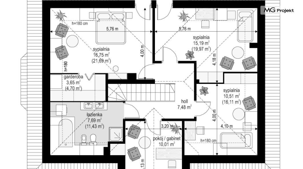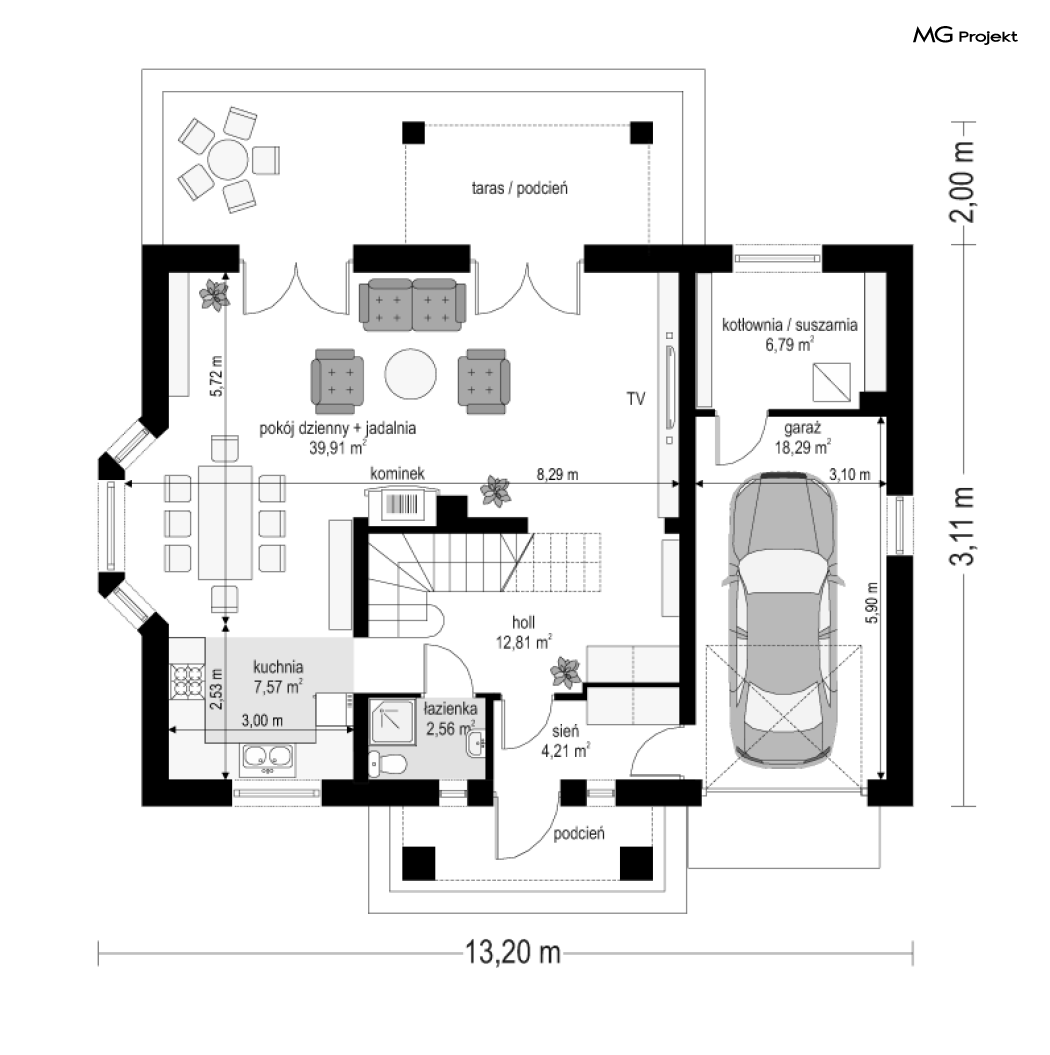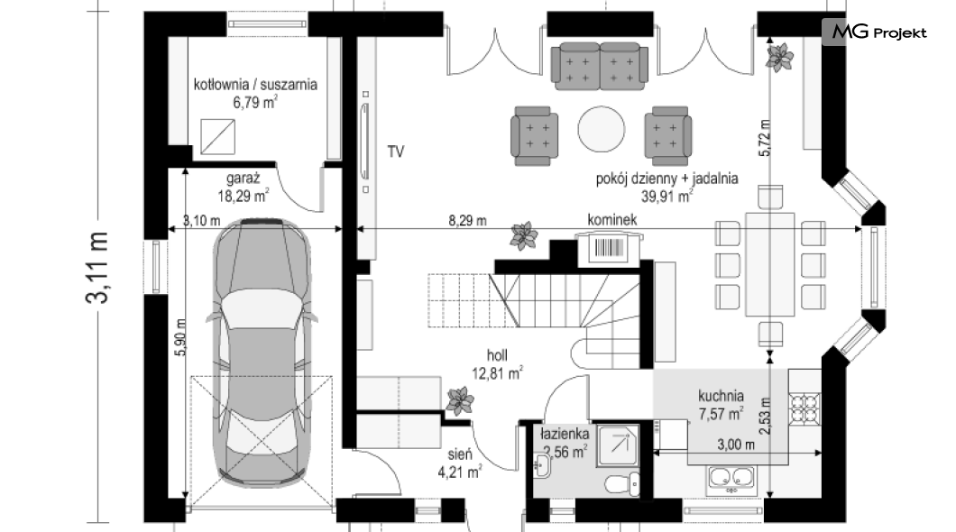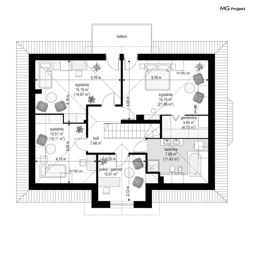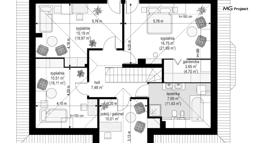 Projekt domu Stokrotka to uroczy budynek o prostej, klarownej bryle. Domek jednorodzinny przeznaczony dla cztero-pięcioosobowej rodziny. Projekt domu Stokrotka zbudowany jest na planie prostokąta. Rzut parteru i poddasza zwieńczony jest czterospadowym dachem z symetrycznie ustawionymi lukarnami od frontu i od strony ogrodu. Frontowa lukarna połączona jest z podcieniem wejściowym na kolumienkach. Od strony ogrodu zaprojektowano częściowe zadaszenie tarasu dużym balkonem. Urok domu to jego prostota i właściwe proporcje, do tego ciekawe detale, oraz funkcjonalnie zaprojektowane, przemyślane wnętrze. Na parterze mieszkania, zaprojektowano obszerny pokój dzienny z centralnie usytuowanym kominkiem, oraz dużymi przeszkleniami na taras i ogród. Salon w Stokrotce łączy się częściowo z półotwartą kuchnią przez aneks jadalny z wykuszem. Bardzo ładny hol z reprezentacyjnymi schodami na poddasze dopełnia wnętrze parteru. Dodatkowo w projekcie, przewidziano jeszcze część gospodarczą z garażem i kotłownią. Na poddaszu zaprojektowano trzy sypialnie z garderobami lub szafami wbudowanymi, łazienkę i dodatkowy pokój - gabinet lub czwartą sypialnię. Pracownia dysponuje wersją odbicia lustrzanego projektu domu Stokrotka.