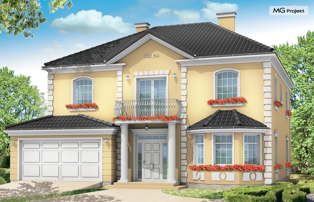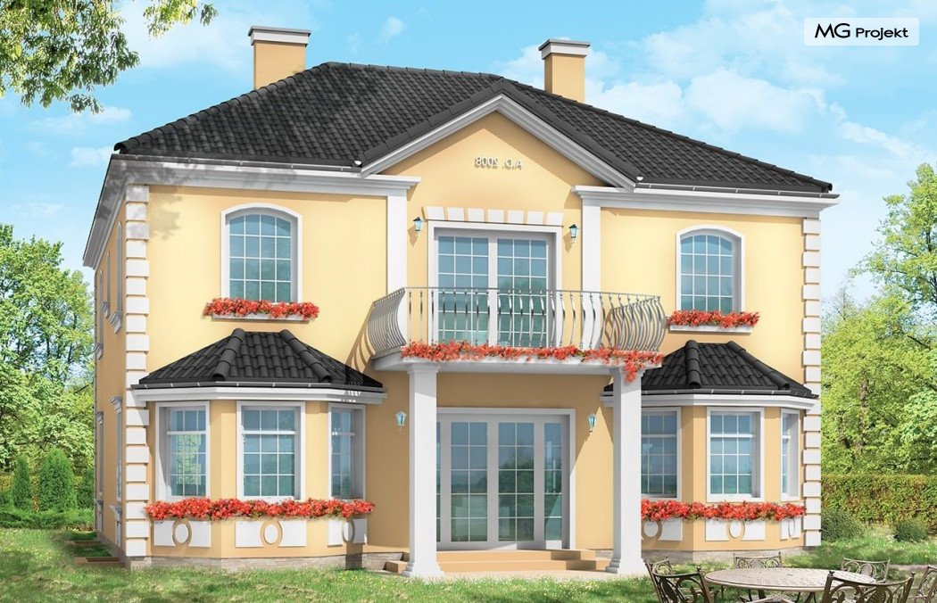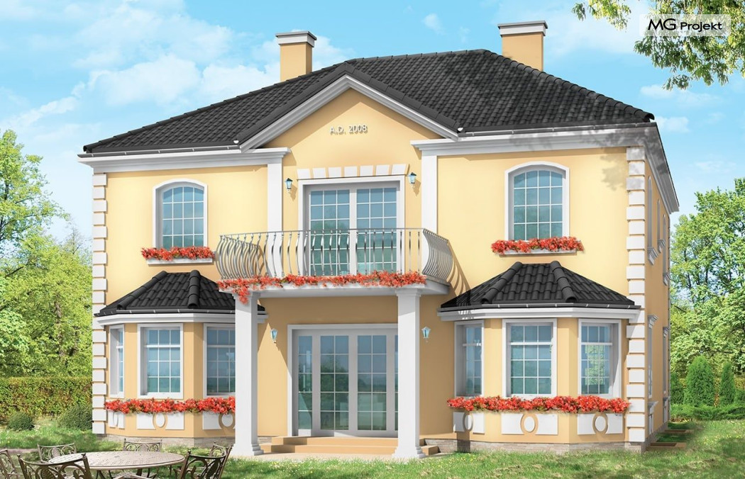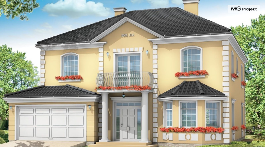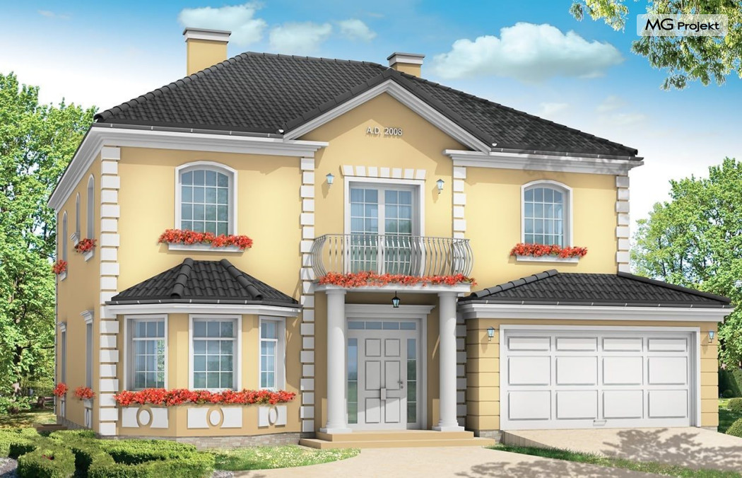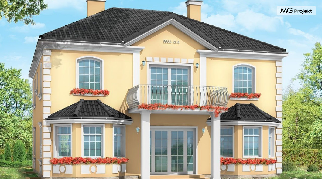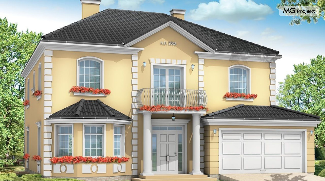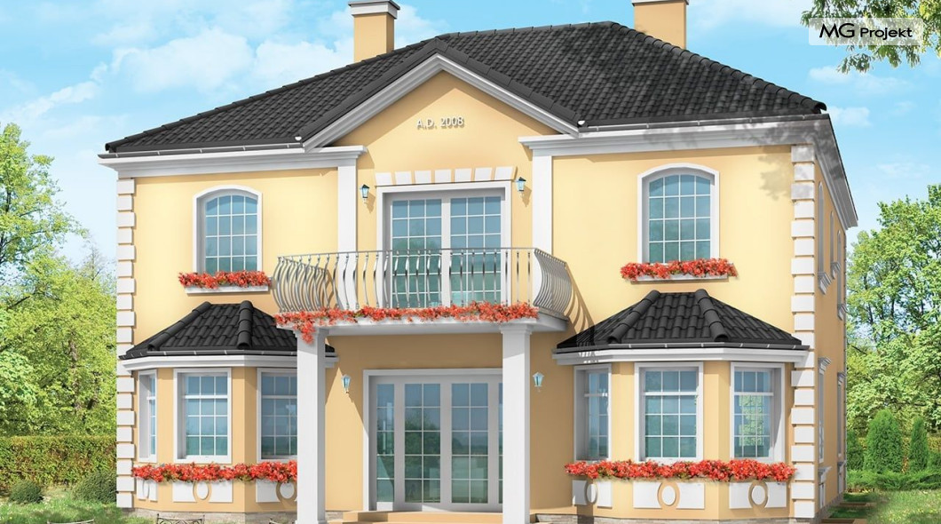 Projekt domu Stylowy to uroczy domek jednorodzinny, z serii naszych piętrowych budynków. Tym razem o trochę mniejszej powierzchni - jeśli nie liczyć piwnicy. Projekt przeznaczony jest dla rodziny 4-6cio osobowej. Projekt domu Stylowy zaprojektowano na planie zbliżonym do kwadratu, z wkomponowanym w bryłę główną garażem. Wykusze, balkony na kolumnach (wejściowy i ogrodowy), frontony, czy łukowo zakańczane piękne okna z podziałami. To wszystko daje domowi piękny klasyczny wygląd zewnętrzny. Wewnątrz mieszkanie również zostało tradycyjnie podzielone, z zachowaniem symetrii i osi widokowych. Z centralnego holu z zabiegowymi schodami przechodzimy do dużego salonu, lub w bok do prawdziwie wielkiej kuchni - z wyspą i kącikiem jadalnym. Z salonu z kolei możemy przejść do gabinetu-biblioteki (biblioteka może być też po prostu połączona z salonem). Ciekawym rozwiązaniem w projekcie, jest możliwość dostępu do schodów piwnicznych zarówno z części gospodarczej - od garażu, jak i od strony wypoczynkowej (część piwnicy jest przeznaczona na rekreację). Na piętrze domu Stylowy zaprojektowano apartament rodziców - z łazienką, garderobą, tarasem ogrodowym i dodatkowym pokojem (np. fitness), oraz dwie sypialnie dzieci z łazienkami. Dodatkowy pokój można przeznaczyć na dodatkową sypialnię zapewniając mu wejście z holu. Swoje miejsce znalazł także nieduży pokój do pracy - gabinet (połączony z holem przeszklonymi ścianami i posiadający wyjście na frontowy balkon). W piwnicy zaprojektowano pomieszczenia techniczne, oraz rekreacyjne. Dom posiada duży strych, który również można zaadaptować. Projekt domu Stylowy dostępny jest też w wersji lustrzanej.