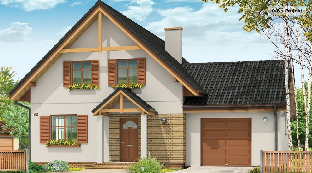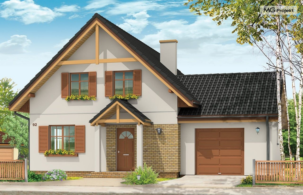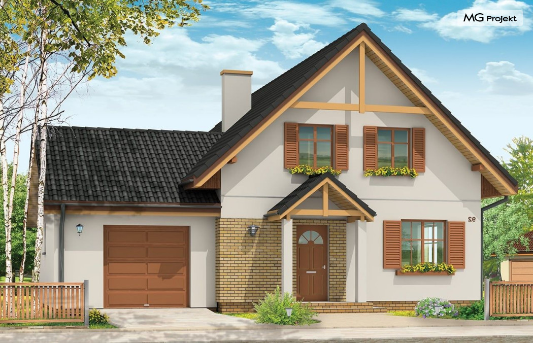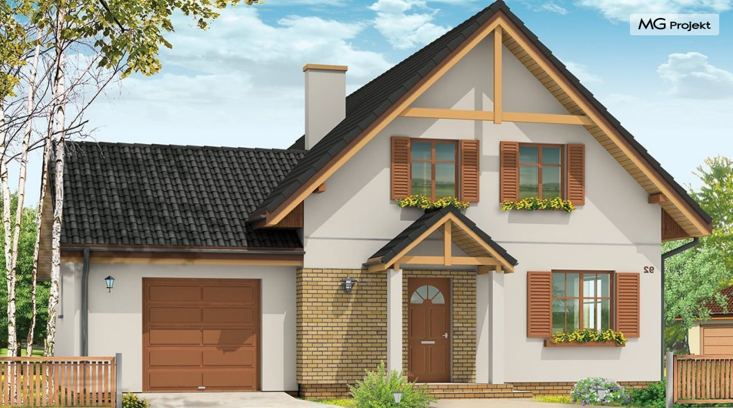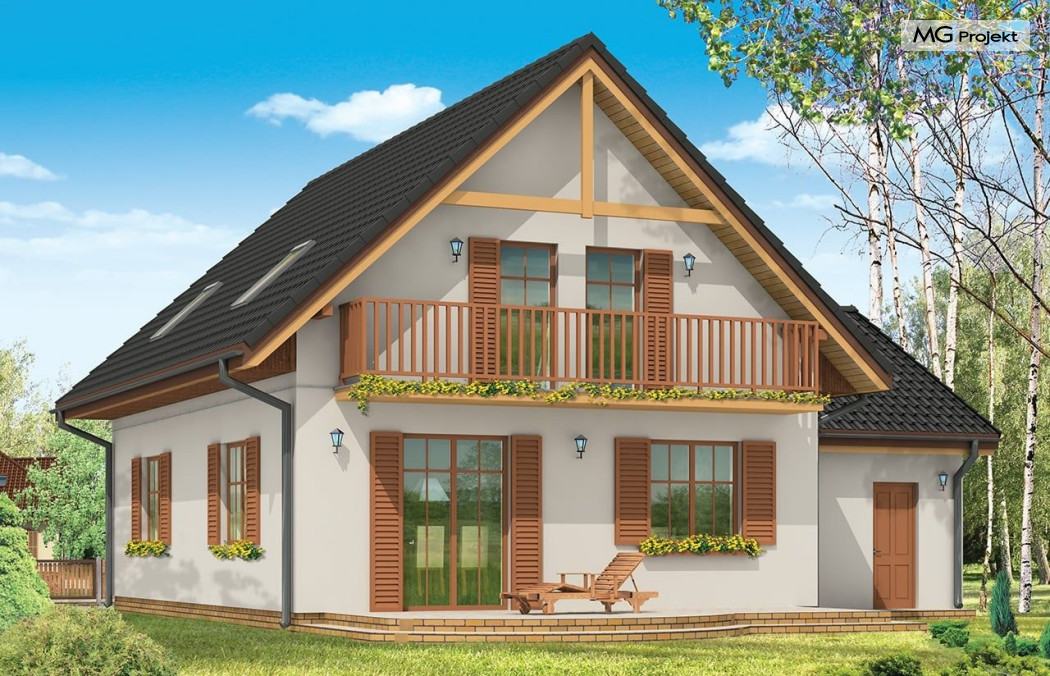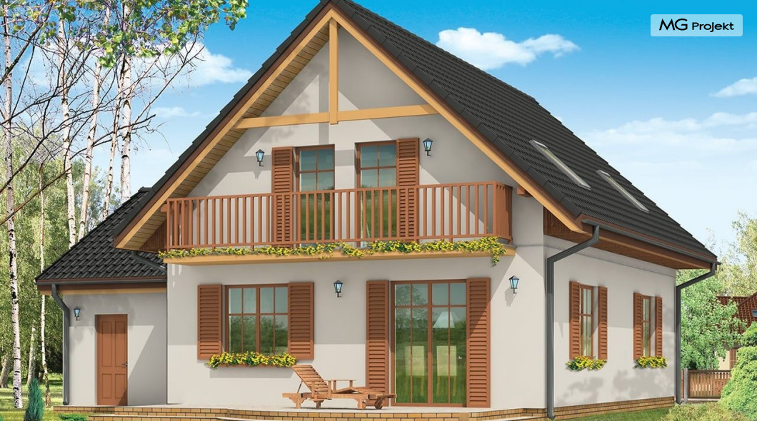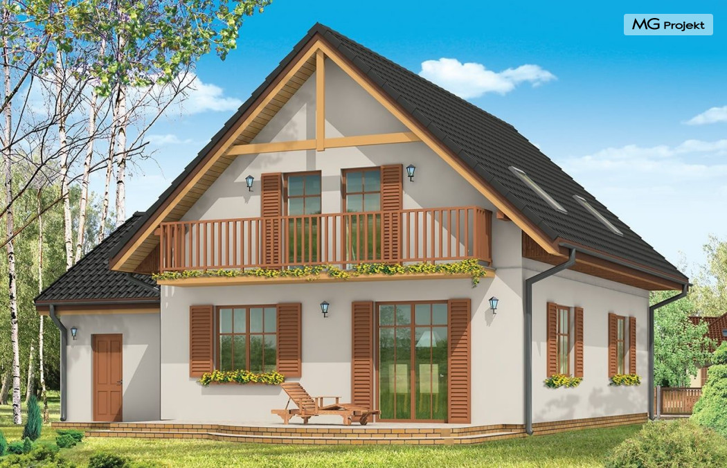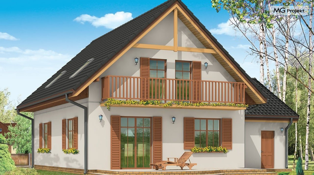 Projekt domu Sylwia to budynek parterowy z użytkowym poddaszem. Przekryty dwuspadowym dachem, z dobudowaną bryłą garażu. Domek jednorodzinny, wręcz idealny dla 4-6 osób. Budynek łączy w sobie bezpretensjonalność bryły i funkcjonalnie zaplanowane wnętrze. Na parterze domu Sylwia zaprojektowano jednoprzestrzenny salon połączony z aneksem jadalnym i kuchnią, na poddaszu umieszczono trzy sypialnie. Duży garaż dobudowany do głównej bryły można z łatwością powiększyć do dwustanowiskowego. Strych nad garażem to przestrzeń magazynowa domu. Taras i balkon otwierają wnętrze na ogród. Front budynku został ozdobiony gankiem wejściowym z zadaszeniem. Pracownia posiada projekt Sylwia w odbiciu lustrzanym.