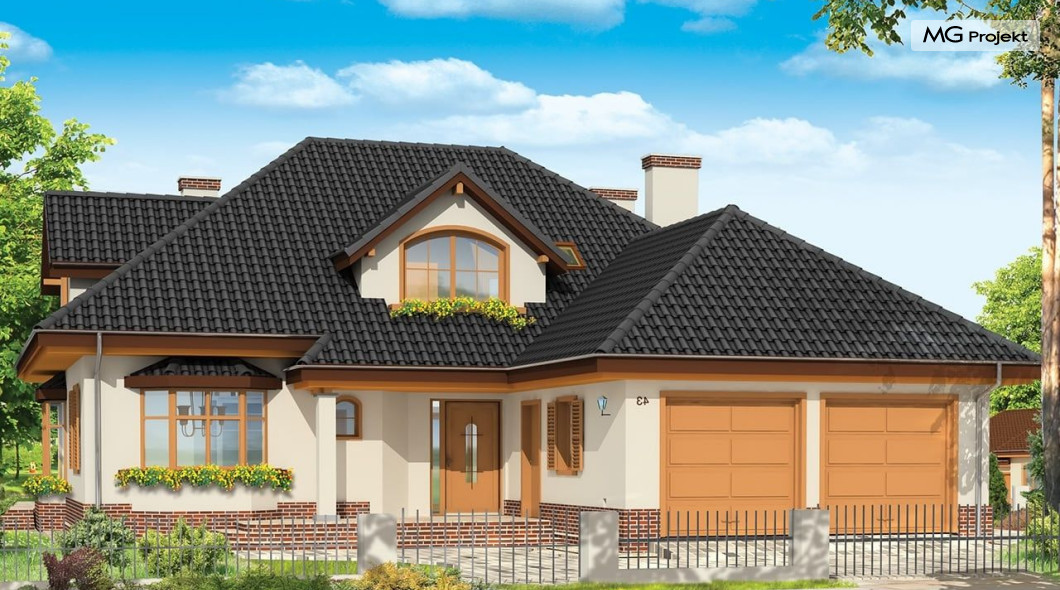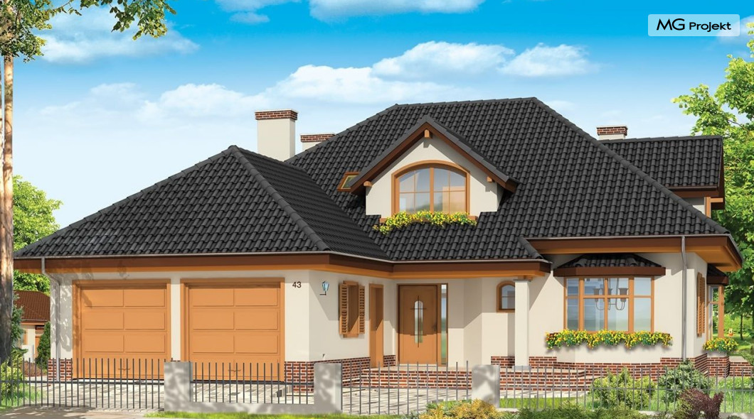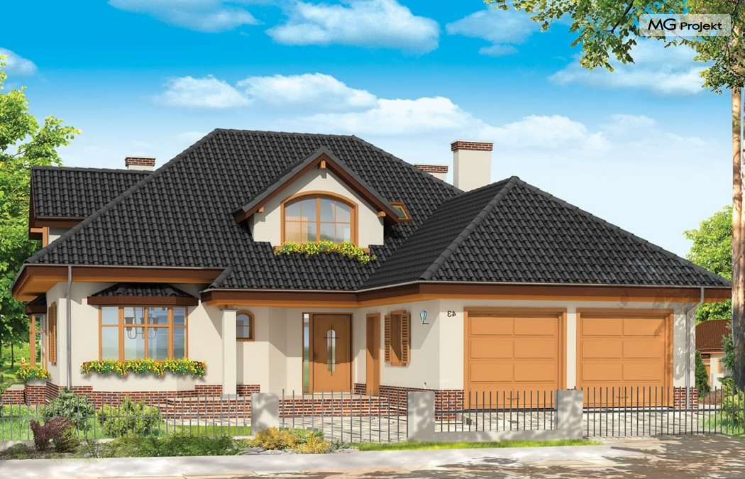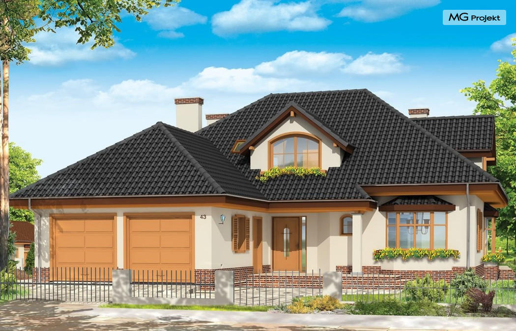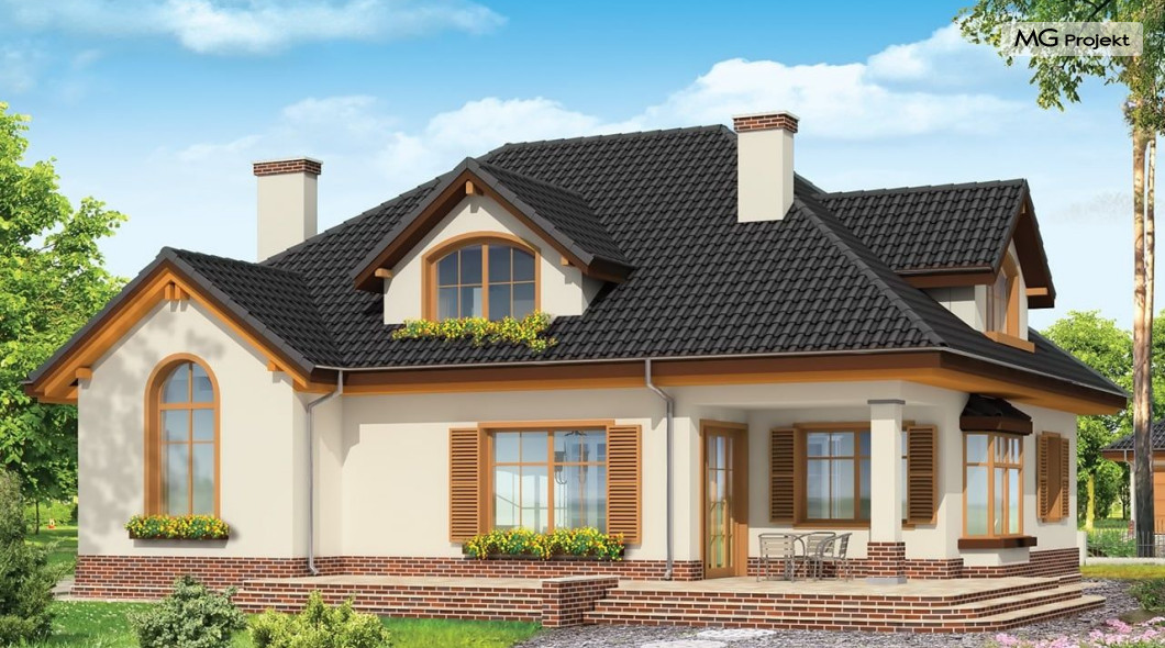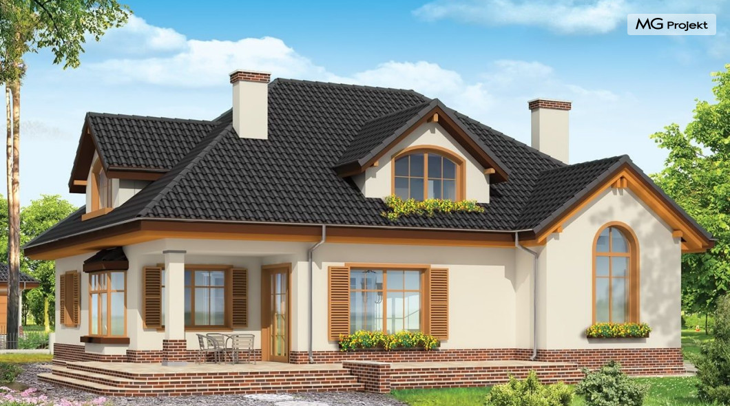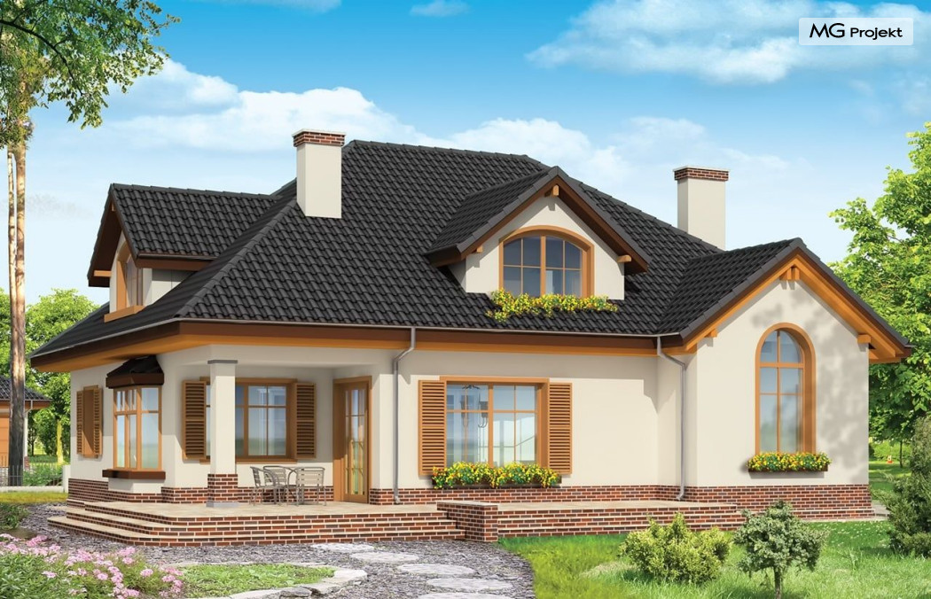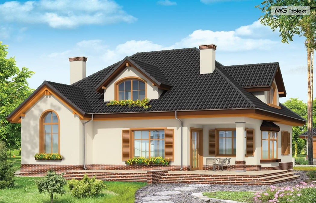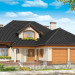 Projekt domu Sympatyczny to parterowy dom z poddaszem. Budynek przystosowany dla 4-5 osobowej rodziny. Spokojna, powściągliwa sylwetka, z dużym wielospadowym dachem mieści w sobie bardzo funkcjonalne, przemyślane wnętrze. Rozwiązania zastosowane w domu Sympatyczny, takie jak duża sień wejściowa, ładny przestrzenny holl z wygodnymi schodami, duża kotłownia, garaż czy spiżarnia sprawiają, że przyszłym właścicielom będzie się dobrze mieszkało w ich domu. Salon połączony z holem i jadalnią tworzą ładne jednoprzestrzenne wnętrze, otwarte na ogród dzięki dużym oknom. Na poddaszu każdy pokój ma swoją garderobę, a duża łazienka została połączona z pralnią nad garażem. Pracownia posiada też wersję projektu domu Sympatyczny w odbiciu lustrzanym.