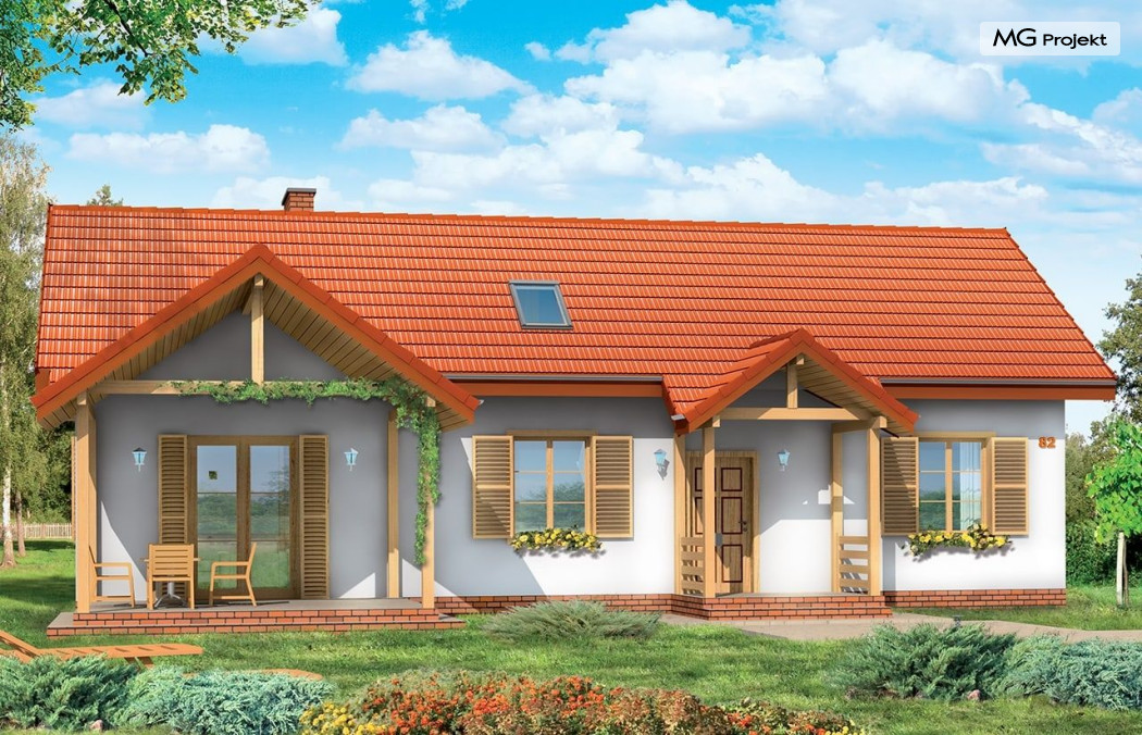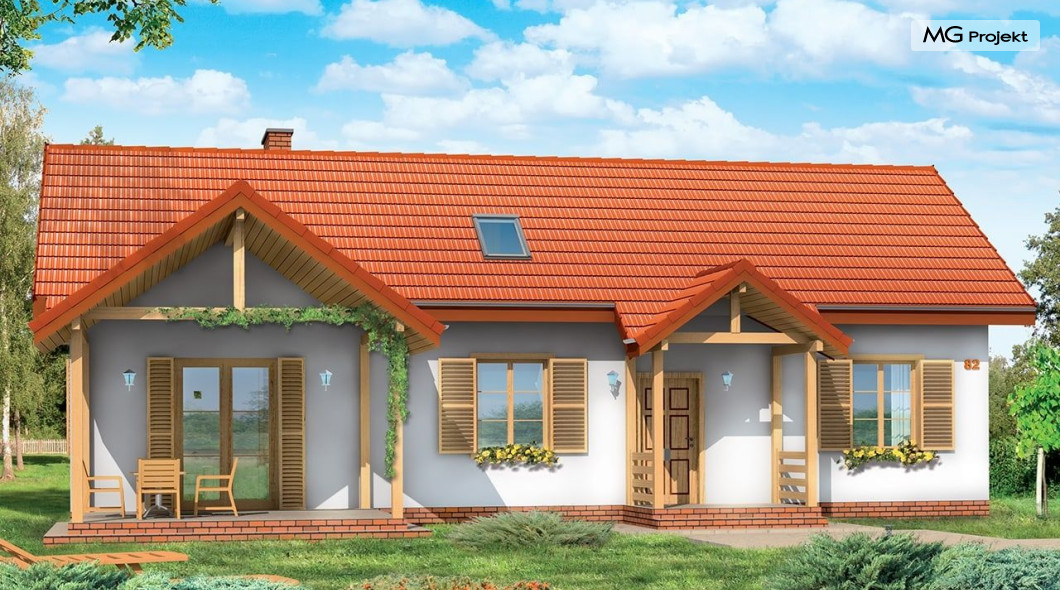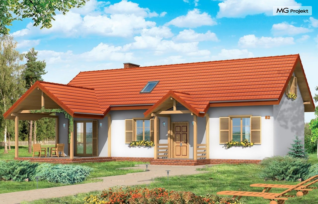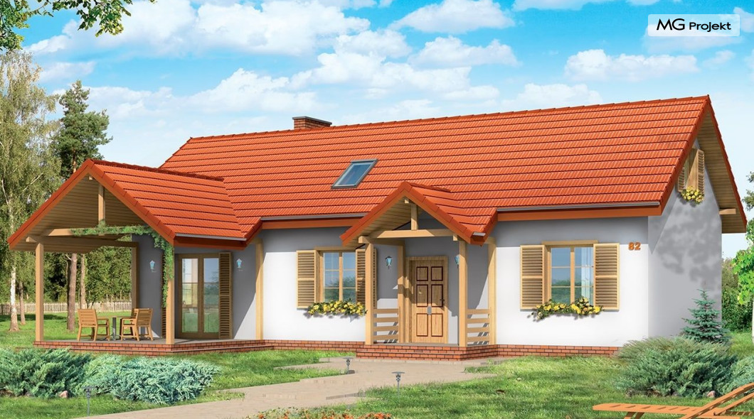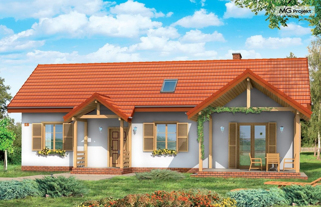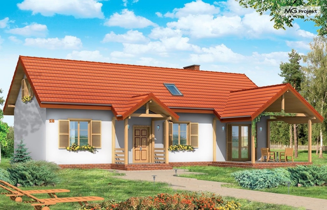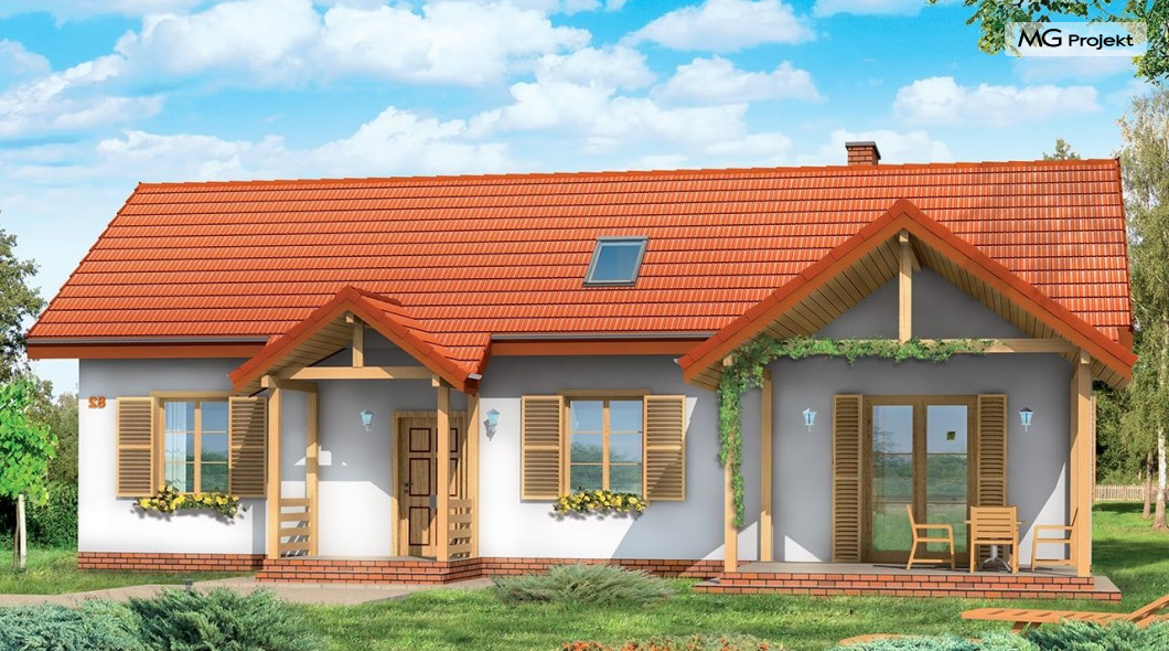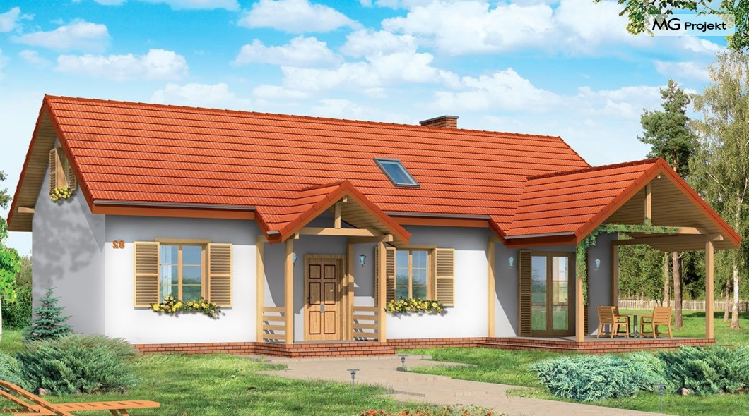 Projekt domu Szczygieł to domek jednorodzinny parterowy, z poddaszem użytkowym. Dom Szczygieł może służyć jako dom jednorodzinny całoroczny, jak również jako budynek letniskowy. Prostokątna bryła została przekryta dwuspadowym dachem poddasza. Do niej dobudowano podcień ogrodowy - z wyjściem z salonu, oraz podcień - ganek wejściowy. Dom doskonale nadaje się na działkę z wejściem od południa lub zachodu - tam, gdzie ogród i wejście są po tej samej stronie domu. Projekt domu Szczygieł ma prostą konstrukcję - jest łatwy i niedrogi w budowie. We wnętrzu na parterze zaplanowano salon z częścią jadalną, otwartą kuchnię - połączoną z pomieszczeniem gospodarczym, łazienkę z toaletą, oraz dwa pokoje, które mogą być wykorzystane jako sypialnie, bądź np. jako gabinet. Na poddaszu zaprojektowano dwie sypialnie i łazienkę. Poddasze można wykończyć w drugim etapie budowy. Projekt domu Szczygieł dostępny jest też jako odbicie lustrzane.