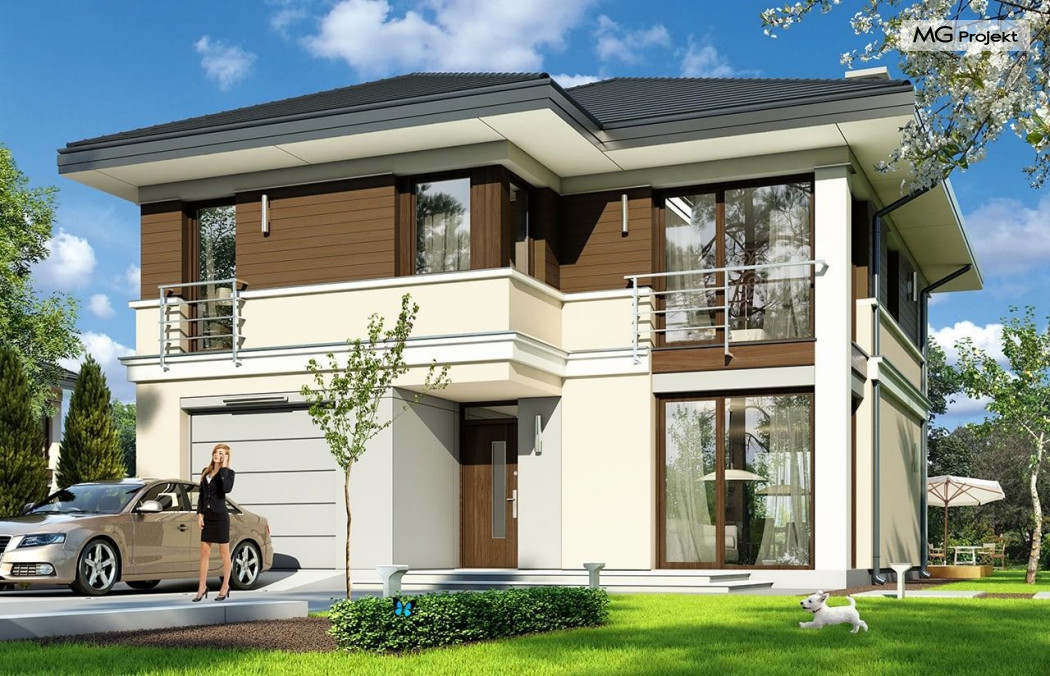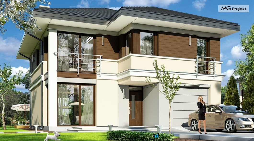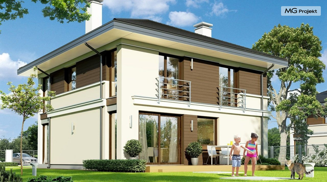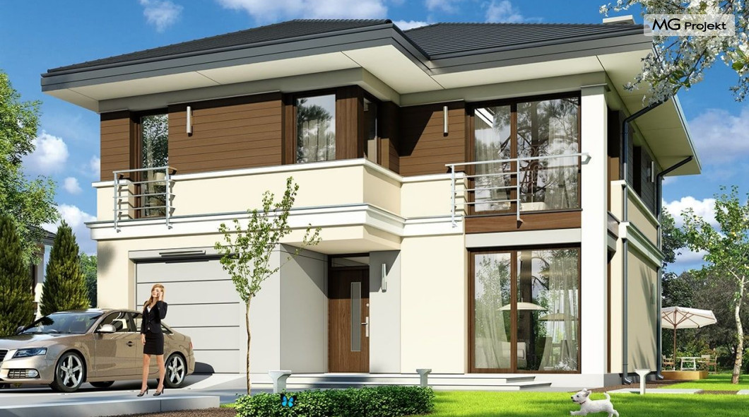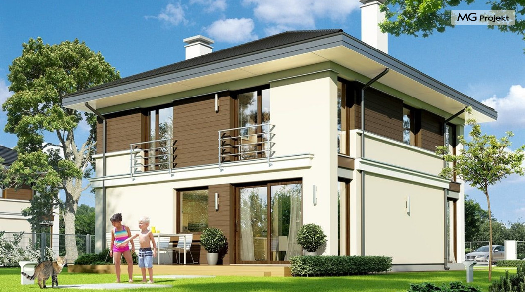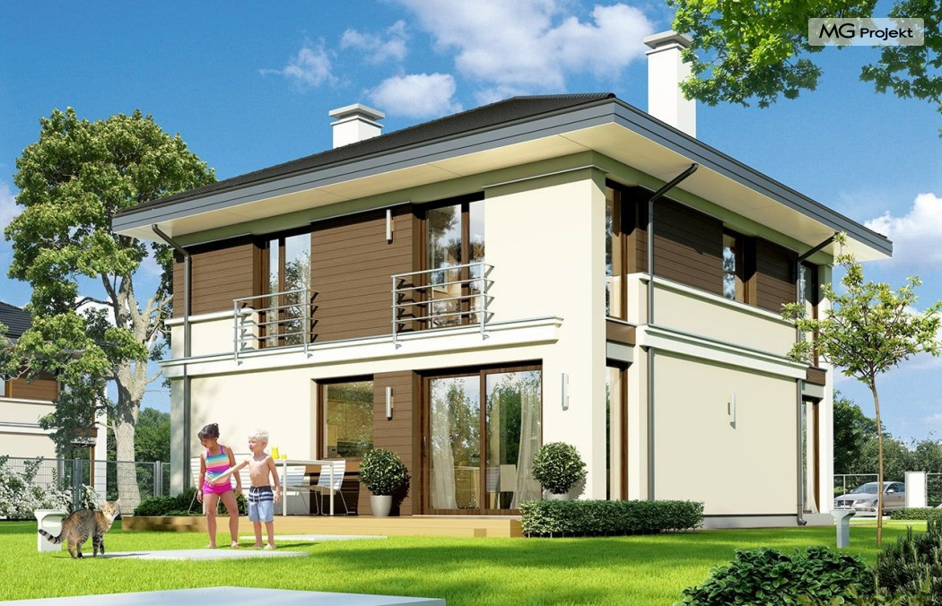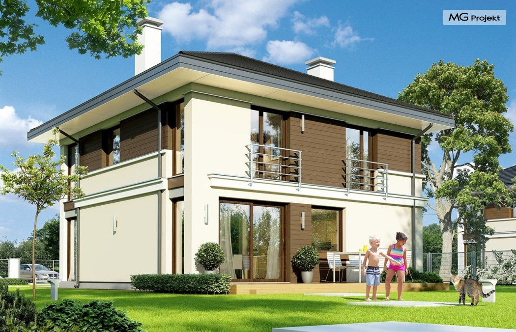 Projekt domu Tytan to projekt piętrowego domu, przeznaczonego dla 4-5cioosobowej rodziny. Projekt domu Tytan przeznaczony jest dla Inwestorów chcących mieszkać w domu „bez skosów”, którzy dysponują niewielką parcelą. Dom jest zaprojektowany w taki sposób, aby pasował na działkę z niekorzystnym nasłonecznieniem – na przykład z ulicą od południa. Prosta bryła, nowoczesny wyraz architektoniczny, połączony z funkcjonalnym wnętrzem, daje bardzo korzystne połączenie. Dom jest funkcjonalny choć niewielki – z ładnym salonem, garażem i czterema pokojami na piętrze ma powierzchnię użytkową poniżej 140 m2. Koszt budowy domu, dzięki prostej konstrukcji, nie jest wygórowany. Technologie, które zastosowano bardzo polepszają energooszczędność - doskonałe ocieplenia, wentylacja mechaniczna z rekuperacją. Wszystkie te elementy pomniejszają koszty przyszłej eksploatacji budynku. Architektura zewnętrzna łączy poziome pasy elewacji wykończonych różnymi materiałami z dużymi przeszkleniami - szczególnie narożnymi oknami salonu i sypialni powyżej. Połączenie tynku, okładziny drewnianej, czy płyt hpl, daje atrakcyjny wygląd domu. Wnętrza podzielono na część dzienną, dzielącą przestrzeń parteru z pomieszczeniami technicznymi, oraz sypialnie na piętrze. Salon połączony z aneksem jadalnym, kuchnią i holem tworzą razem atrakcyjne jednoprzestrzenne wnętrze. Dostępna z przedsionka część techniczna składa się z garażu i kotłowni. Gazowy kocioł może być łatwo zamieniony na kotłownię na paliwo stałe. Na piętrze wydzielono wygodny apartament rodziców, z własną łazienką i naprawdę dużą garderobą. Dodatkowo zaprojektowano dwie sypialnie dziecięce, dodatkowy pokój (gabinet lub sypialnia), oraz drugą łazienkę. Projekt domu Tytan, to solidny, niewielki, funkcjonalnie zaprojektowany dom, w sam raz dla kilkuosobowej rodziny pragnącej mieszkać z nowoczesnej architekturze. Prostota konstrukcji pozwoli utrzymać koszt budowy w granicach rozsądku, a energooszczędne rozwiązania pozwolą osiągnąć niskie koszty eksploatacji budynku. Tytan dostępny jest w odbiciu lustrzanym. Zapraszamy również do zapoznania się z pełną ofertą pracowni MG Projekt: projekt domu Tytan 2, projekt domu Tytan 2B, projekt domu Tytan 3, projekt domu Tytan 4.