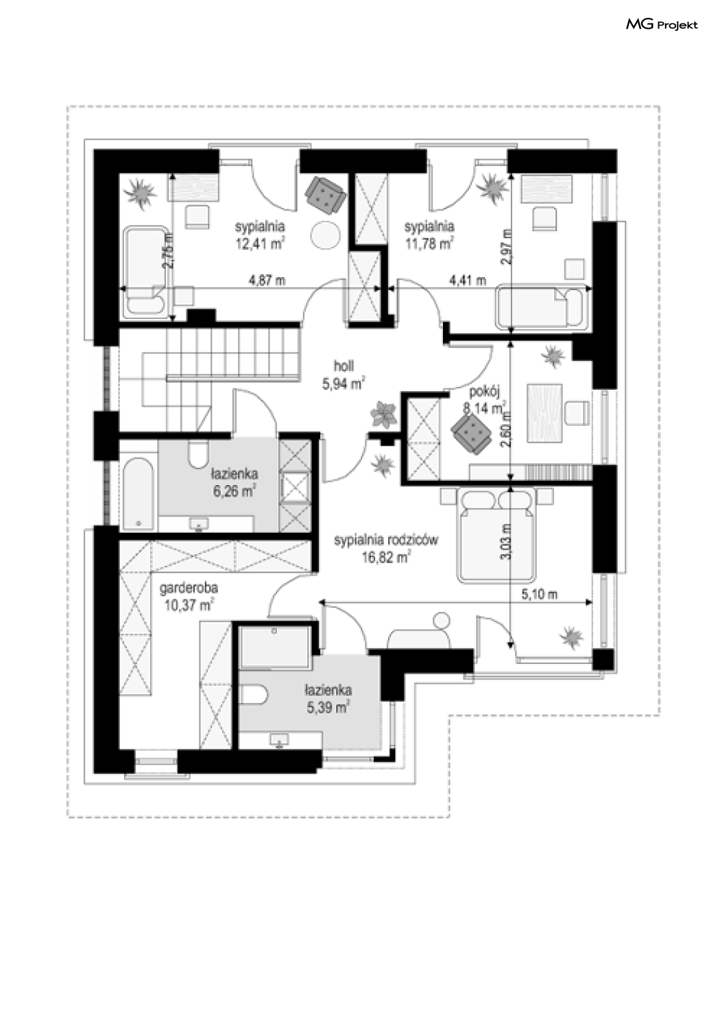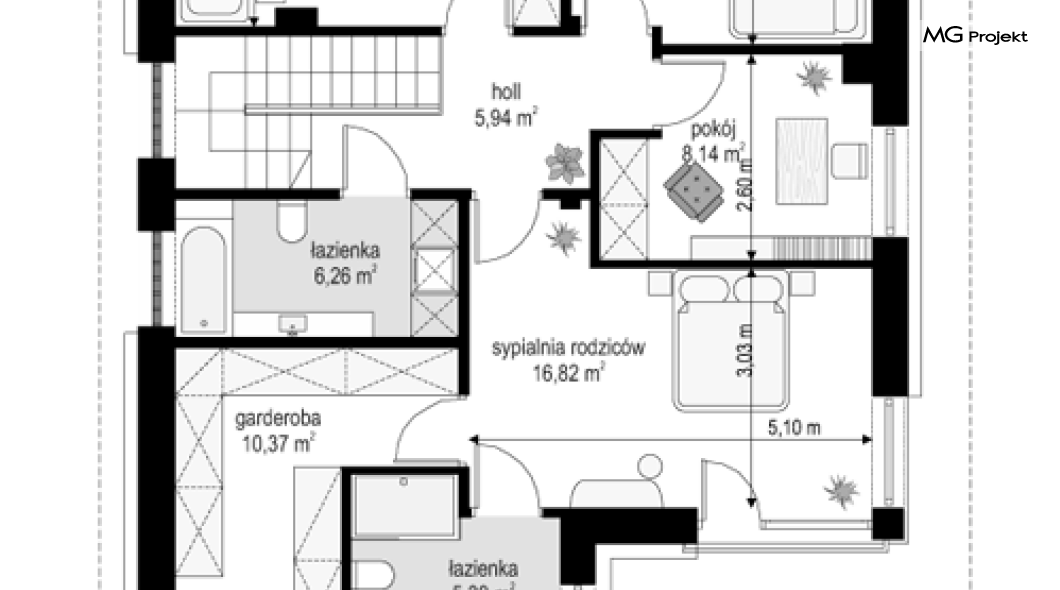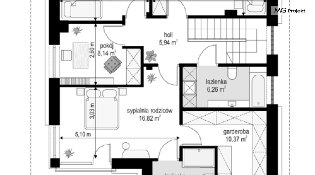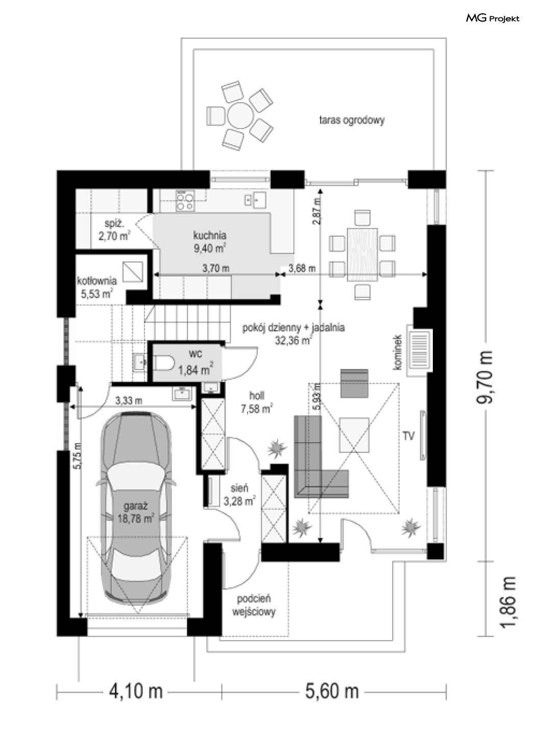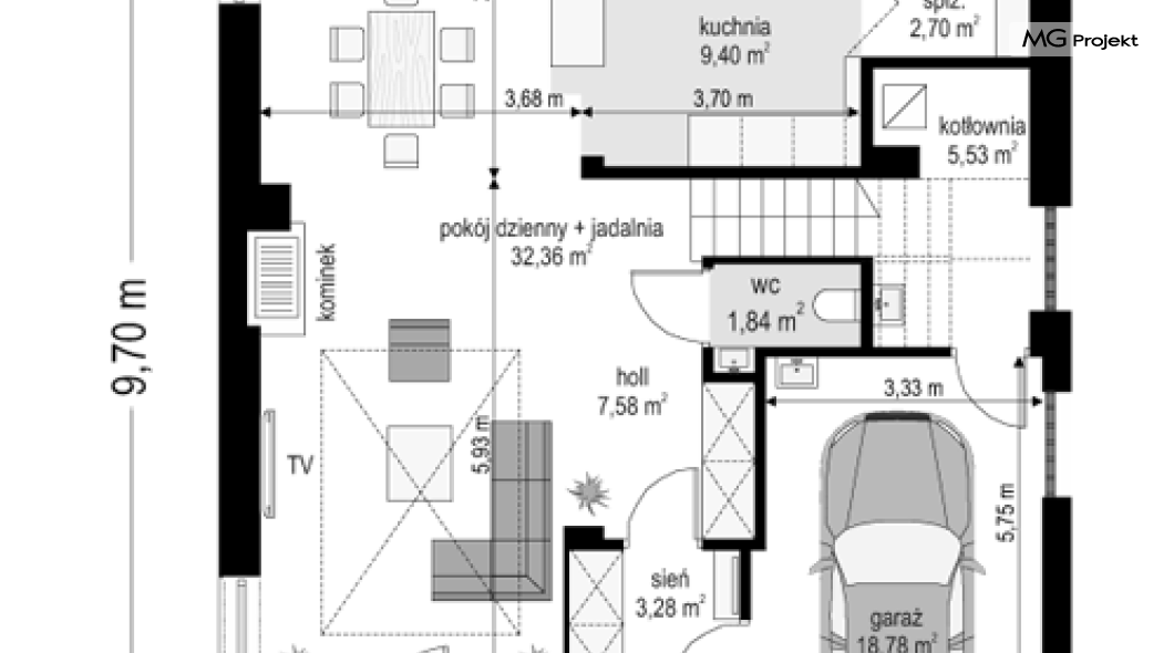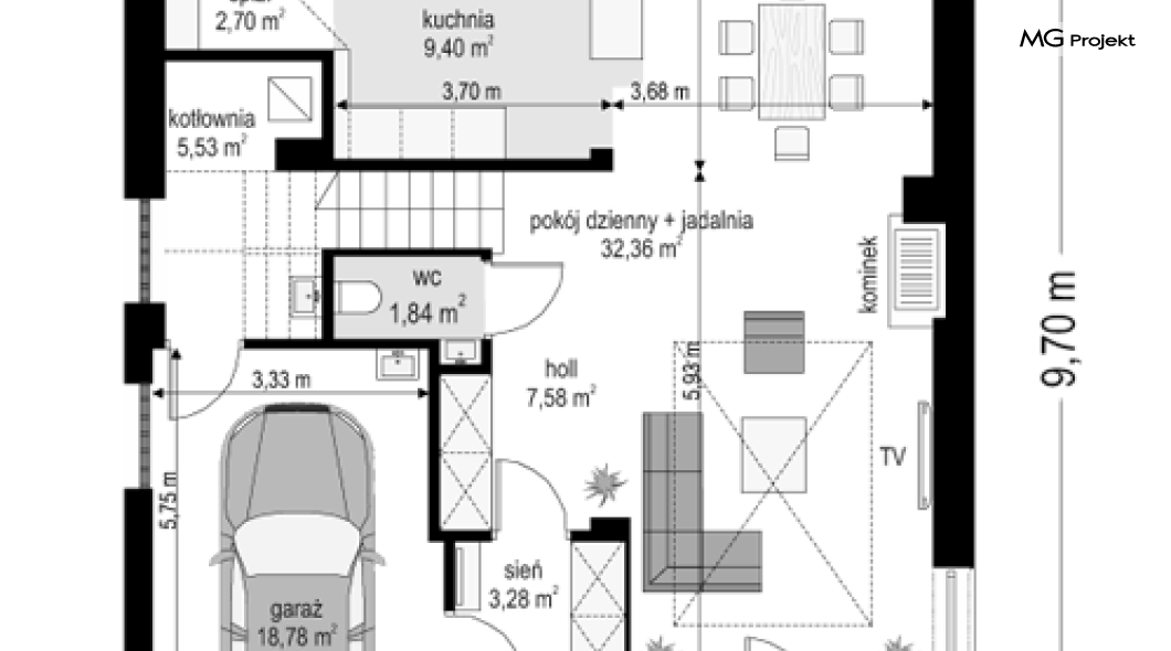Projekt domu Tytan to projekt piętrowego domu, przeznaczonego dla 4-5cioosobowej rodziny. Projekt domu Tytan przeznaczony jest dla Inwestorów chcących mieszkać w domu „bez skosów”, którzy dysponują niewielką parcelą. Dom jest zaprojektowany w taki sposób, aby pasował na działkę z niekorzystnym nasłonecznieniem – na przykład z ulicą od południa. Prosta bryła, nowoczesny wyraz architektoniczny, połączony z funkcjonalnym wnętrzem, daje bardzo korzystne połączenie. Dom jest funkcjonalny choć niewielki – z ładnym salonem, garażem i czterema pokojami na piętrze ma powierzchnię użytkową poniżej 140 m2. Koszt budowy domu, dzięki prostej konstrukcji, nie jest wygórowany. Technologie, które zastosowano bardzo polepszają energooszczędność - doskonałe ocieplenia, wentylacja mechaniczna z rekuperacją. Wszystkie te elementy pomniejszają koszty przyszłej eksploatacji budynku. Architektura zewnętrzna łączy poziome pasy elewacji wykończonych różnymi materiałami z dużymi przeszkleniami - szczególnie narożnymi oknami salonu i sypialni powyżej. Połączenie tynku, okładziny drewnianej, czy płyt hpl, daje atrakcyjny wygląd domu. Wnętrza podzielono na część dzienną, dzielącą przestrzeń parteru z pomieszczeniami technicznymi, oraz sypialnie na piętrze. Salon połączony z aneksem jadalnym, kuchnią i holem tworzą razem atrakcyjne jednoprzestrzenne wnętrze. Dostępna z przedsionka część techniczna składa się z garażu i kotłowni. Gazowy kocioł może być łatwo zamieniony na kotłownię na paliwo stałe. Na piętrze wydzielono wygodny apartament rodziców, z własną łazienką i naprawdę dużą garderobą. Dodatkowo zaprojektowano dwie sypialnie dziecięce, dodatkowy pokój (gabinet lub sypialnia), oraz drugą łazienkę. Projekt domu Tytan, to solidny, niewielki, funkcjonalnie zaprojektowany dom, w sam raz dla kilkuosobowej rodziny pragnącej mieszkać z nowoczesnej architekturze. Prostota konstrukcji pozwoli utrzymać koszt budowy w granicach rozsądku, a energooszczędne rozwiązania pozwolą osiągnąć niskie koszty eksploatacji budynku. Tytan dostępny jest w odbiciu lustrzanym. Zapraszamy również do zapoznania się z pełną ofertą pracowni MG Projekt: projekt domu Tytan 2, projekt domu Tytan 2B, projekt domu Tytan 3, projekt domu Tytan 4.
