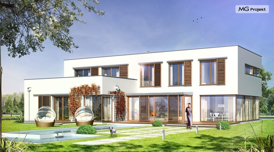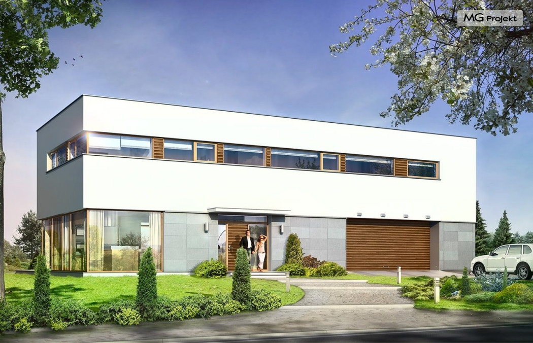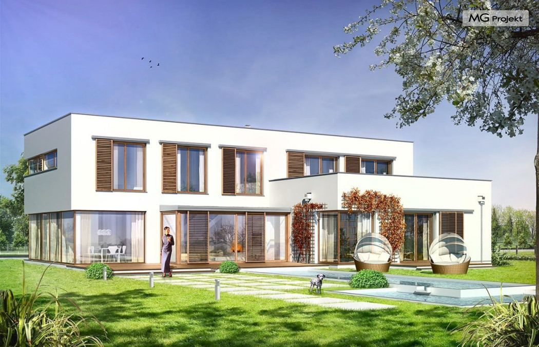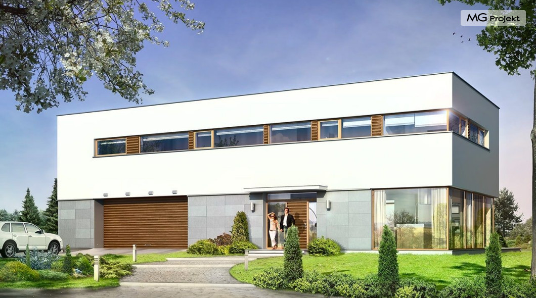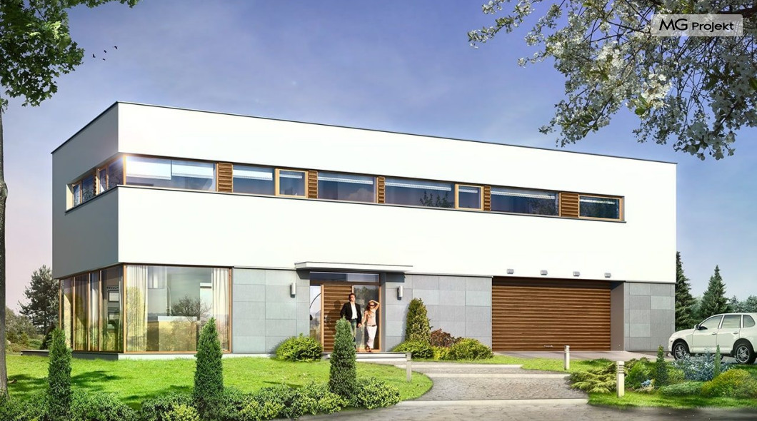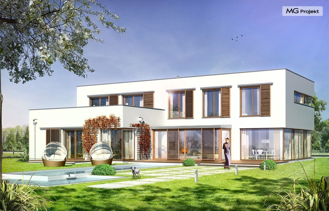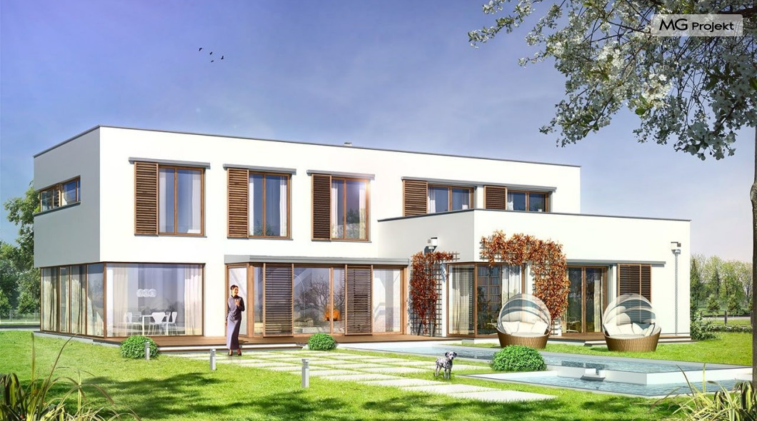 Projekt domu Vertigo to budynek przeznaczony dla dużej, nawet siedmioosobowej rodziny, zaprojektowany w konwencji nowoczesnych miejskich willi. Budynek zaprojektowano jako piętrowy, z płaskim dachem, złożony z dwóch zestawionych ze sobą i przenikających się wzajemnie prostopadłościennych brył. Architektura zewnętrzna domu Vertigo ma dwa oblicza. Od strony elewacji frontowej budynek sprawia wrażenie masywnego, zamkniętego przed okiem obcych, z niewielką ilością przeszkleń, z jedynie zaakcentowaną częścią wejściową przedsionka w dużymi naświetlami. Od strony elewacji ogrodowej dom prezentuje inne oblicze - otwarte na ogród, z wieloma przeszklonymi powierzchniami ścian, z oranżerią między wnętrzem salonu a tarasem. Od strony ogrodu masywna piętrowa bryła budynku została zrównoważona częścią parterową i dużymi przeszkleniami wnikającymi we wnętrze. Przesuwne okiennice i rytm okien piętra nawiązują do śródziemnomorskich willi - mimo ultranowoczesnej linii budynku. Sensem projektu było ujarzmienie surowej geometrycznej nowoczesności i zmiękczenie jej naturalnymi, odwołującymi się do przyrody materiałami. Wnętrze domu Vertigo podzielono na cztery części. Na parterze: część dzienną - z salonem, apartament państwa domu, część gospodarczą - z garażem i kotłownią, oraz część z sypialniami na piętrze. Uwagę zwraca duże jednoprzestrzenne wnętrze dzienne, z salonem, jadalnią, holem - z reprezentacyjnymi schodami, oraz kuchnią. Wszystkie pomieszczenia są maksymalnie otwarte na ogród - dzięki przeszklonym ścianom od podłogi do sufitu przebywając w salonie czy jadalni - mamy ogród na wyciągnięcie ręki. Ozdoby, jak oranżeria w salonie, narożny duży kominek, piękna kuchnia z centralną wyspą -sprawiają, że dom jest wyjątkowy i niepowtarzalny. Duża liczba pokoi - np. sypialnych - pozwoli zamieszkać w domu Vertigo nawet bardzo licznej rodzinie. Pracownia posiada projekt domu Vertigo również w odbiciu lustrzanym.