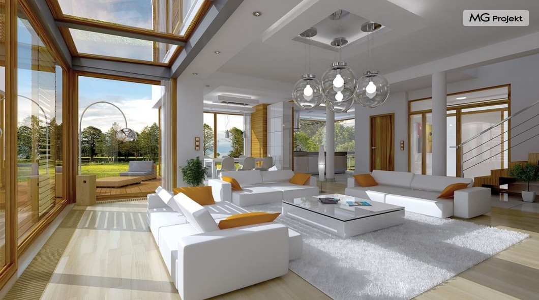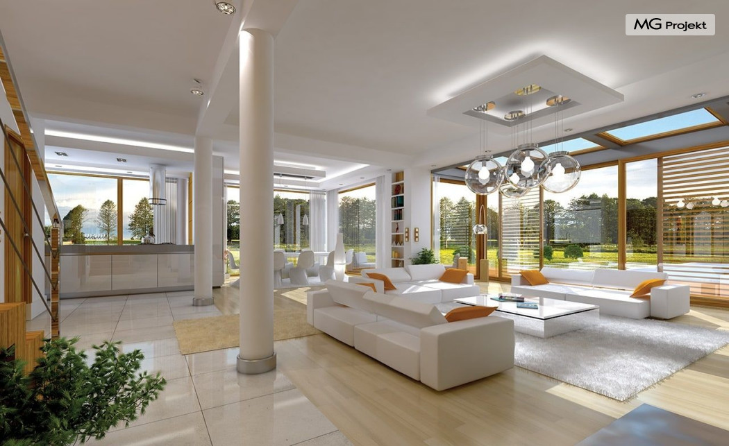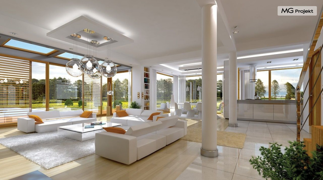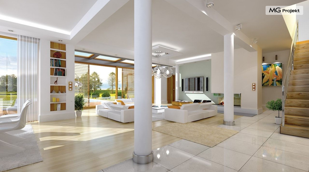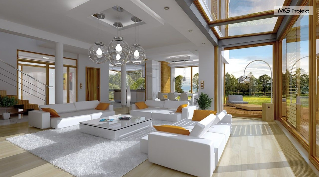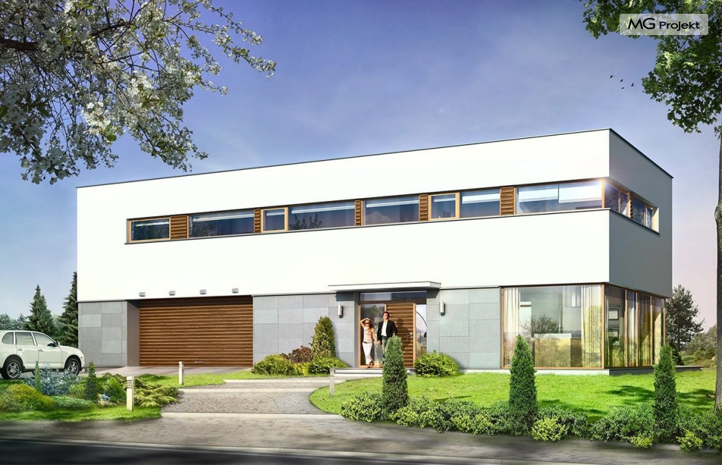 Projekt domu Vertigo to budynek przeznaczony dla dużej, nawet siedmioosobowej rodziny, zaprojektowany w konwencji nowoczesnych miejskich willi. Budynek zaprojektowano jako piętrowy, z płaskim dachem, złożony z dwóch zestawionych ze sobą i przenikających się wzajemnie prostopadłościennych brył. Architektura zewnętrzna domu Vertigo ma dwa oblicza. Od strony elewacji frontowej budynek sprawia wrażenie masywnego, zamkniętego przed okiem obcych, z niewielką ilością przeszkleń, z jedynie zaakcentowaną częścią wejściową przedsionka w dużymi naświetlami. Od strony elewacji ogrodowej dom prezentuje inne oblicze - otwarte na ogród, z wieloma przeszklonymi powierzchniami ścian, z oranżerią między wnętrzem salonu a tarasem. Od strony ogrodu masywna piętrowa bryła budynku została zrównoważona częścią parterową i dużymi przeszkleniami wnikającymi we wnętrze. Przesuwne okiennice i rytm okien piętra nawiązują do śródziemnomorskich willi - mimo ultranowoczesnej linii budynku. Sensem projektu było ujarzmienie surowej geometrycznej nowoczesności i zmiękczenie jej naturalnymi, odwołującymi się do przyrody materiałami. Wnętrze domu Vertigo podzielono na cztery części. Na parterze: część dzienną - z salonem, apartament państwa domu, część gospodarczą - z garażem i kotłownią, oraz część z sypialniami na piętrze. Uwagę zwraca duże jednoprzestrzenne wnętrze dzienne, z salonem, jadalnią, holem - z reprezentacyjnymi schodami, oraz kuchnią. Wszystkie pomieszczenia są maksymalnie otwarte na ogród - dzięki przeszklonym ścianom od podłogi do sufitu przebywając w salonie czy jadalni - mamy ogród na wyciągnięcie ręki. Ozdoby, jak oranżeria w salonie, narożny duży kominek, piękna kuchnia z centralną wyspą -sprawiają, że dom jest wyjątkowy i niepowtarzalny. Duża liczba pokoi - np. sypialnych - pozwoli zamieszkać w domu Vertigo nawet bardzo licznej rodzinie. Pracownia posiada projekt domu Vertigo również w odbiciu lustrzanym.