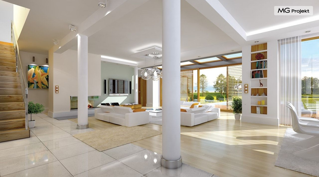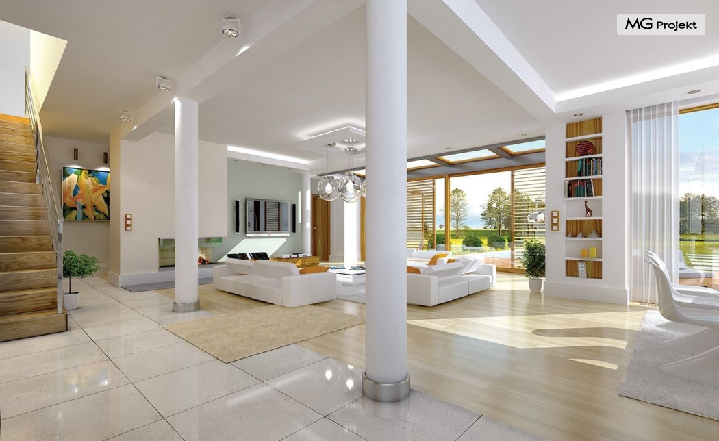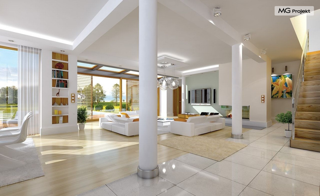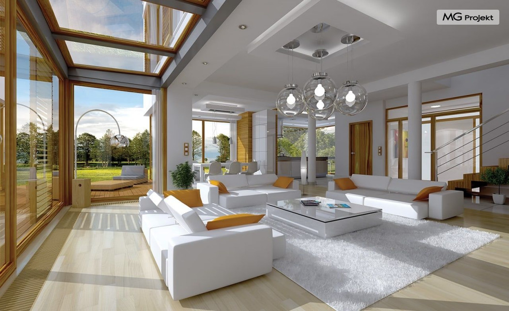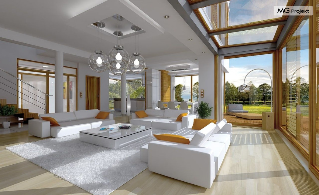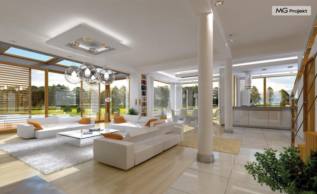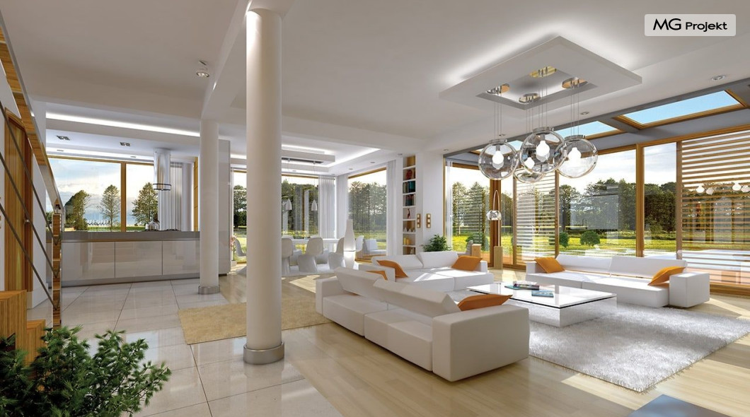 Projekt domu Vertigo to budynek przeznaczony dla dużej, nawet siedmioosobowej rodziny, zaprojektowany w konwencji nowoczesnych miejskich willi. Budynek zaprojektowano jako piętrowy, z płaskim dachem, złożony z dwóch zestawionych ze sobą i przenikających się wzajemnie prostopadłościennych brył. Architektura zewnętrzna domu Vertigo ma dwa oblicza. Od strony elewacji frontowej budynek sprawia wrażenie masywnego, zamkniętego przed okiem obcych, z niewielką ilością przeszkleń, z jedynie zaakcentowaną częścią wejściową przedsionka w dużymi naświetlami. Od strony elewacji ogrodowej dom prezentuje inne oblicze - otwarte na ogród, z wieloma przeszklonymi powierzchniami ścian, z oranżerią między wnętrzem salonu a tarasem. Od strony ogrodu masywna piętrowa bryła budynku została zrównoważona częścią parterową i dużymi przeszkleniami wnikającymi we wnętrze. Przesuwne okiennice i rytm okien piętra nawiązują do śródziemnomorskich willi - mimo ultranowoczesnej linii budynku. Sensem projektu było ujarzmienie surowej geometrycznej nowoczesności i zmiękczenie jej naturalnymi, odwołującymi się do przyrody materiałami. Wnętrze domu Vertigo podzielono na cztery części. Na parterze: część dzienną - z salonem, apartament państwa domu, część gospodarczą - z garażem i kotłownią, oraz część z sypialniami na piętrze. Uwagę zwraca duże jednoprzestrzenne wnętrze dzienne, z salonem, jadalnią, holem - z reprezentacyjnymi schodami, oraz kuchnią. Wszystkie pomieszczenia są maksymalnie otwarte na ogród - dzięki przeszklonym ścianom od podłogi do sufitu przebywając w salonie czy jadalni - mamy ogród na wyciągnięcie ręki. Ozdoby, jak oranżeria w salonie, narożny duży kominek, piękna kuchnia z centralną wyspą -sprawiają, że dom jest wyjątkowy i niepowtarzalny. Duża liczba pokoi - np. sypialnych - pozwoli zamieszkać w domu Vertigo nawet bardzo licznej rodzinie. Pracownia posiada projekt domu Vertigo również w odbiciu lustrzanym.