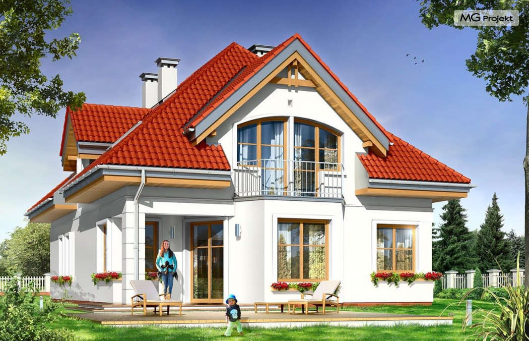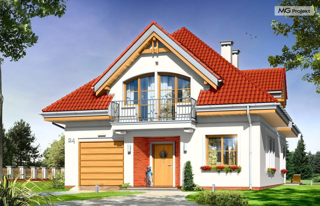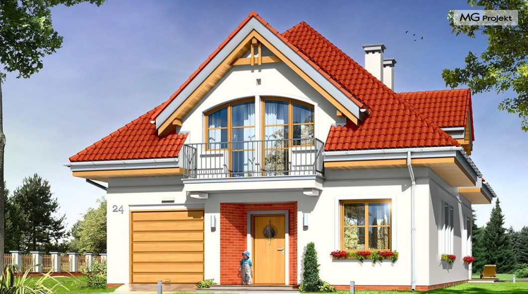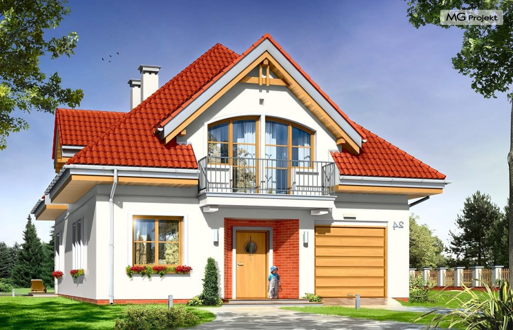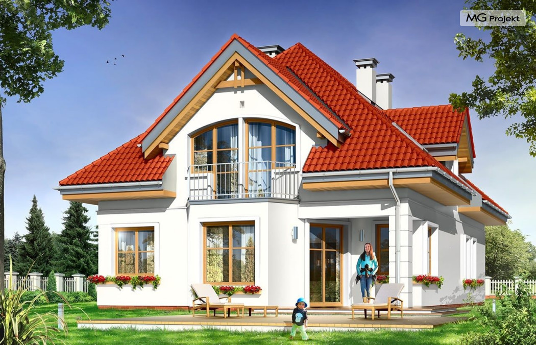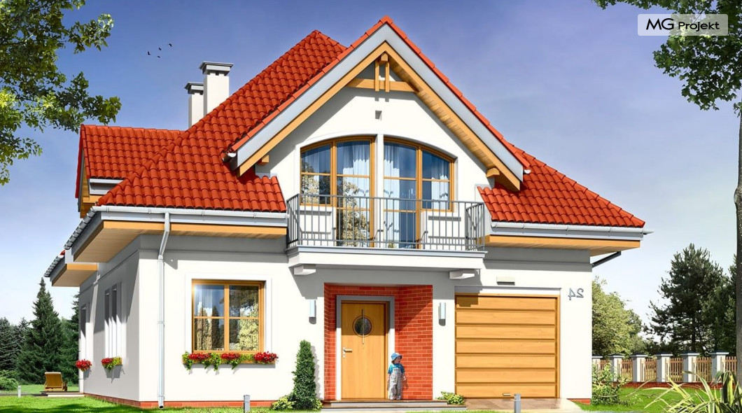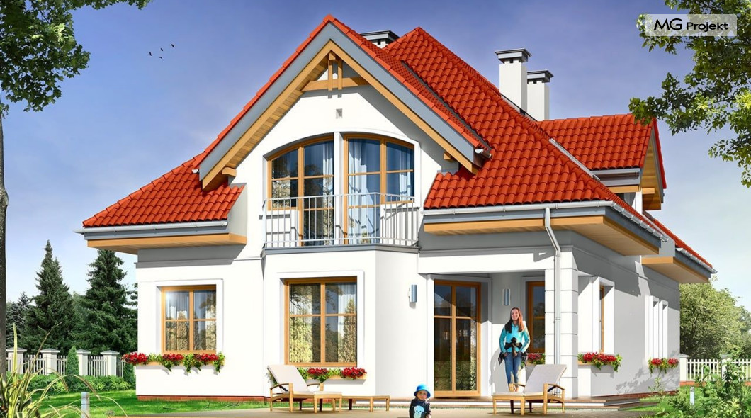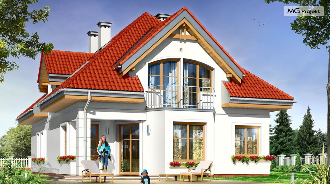 Projekt domu Weronika to uroczy domek jednorodzinny dla cztero-pięcioosobowej rodziny, parterowy z poddaszem użytkowym, zbudowany na planie prostokąta, przekryty czterospadowym dachem. Projekt domu Weronika dedykowany jest Inwestorom posiadającym dość wąską działkę, chcącym mimo to zbudować zgrabny, ładny dom nie przypominający „tramwaju”. Spokojna w wyrazie architektura domu Weronika łączy w sobie tradycyjną formą ze współczesnymi detalami i nowoczesnymi materiałami oraz kolorystyką. Front domu zdobi duża symetryczna lukarna z balkonem będącym jednocześnie zadaszeniem podestu wejściowego. Wejście zaakcentowano podcieniem wykończonym klinkierem. Elewację ogrodową zdobi podobna lukarna z balkonem, oraz wykusz aneksu jadalnego, oraz podcień salonu, przekrywający część tarasu. Wnętrze Weroniki podzielono na część dzienną i pomieszczenia techniczne na parterze, oraz pokoje sypialne na poddaszu. Na dole, bardzo ładne wnętrze, z eleganckim holem z reprezentacyjnymi schodami, przechodzi w salon z ciekawie zaprojektowanym aneksem jadalnym z widokiem na ogród, oraz otwartą na salon kuchnią. W pobliżu wejścia znajduje się dodatkowy pokój – gabinet lub extra sypialnia. Na parterze znajdują się też: wbudowany w bryłę garaż, oraz kotłownia. Na poddaszu zaprojektowano cztery sypialnie, dużą wspólną łazienkę i garderobę dostępną z holu. W łatwy sposób można zamienić ogrodowe sypialnie na apartament rodziców z osobną łazienką i garderobą – jeśli jest taka potrzeba. Nad poddaszem znajduje się duży, bardzo przydatny strych. Projekt domu Weronika jest budynkiem o prostej konstrukcji, niedrogim w realizacji, energooszczędnym. Dom pasować będzie na wąską działkę. Pracownia posiada wersję odbicia lustrzanego projektu.