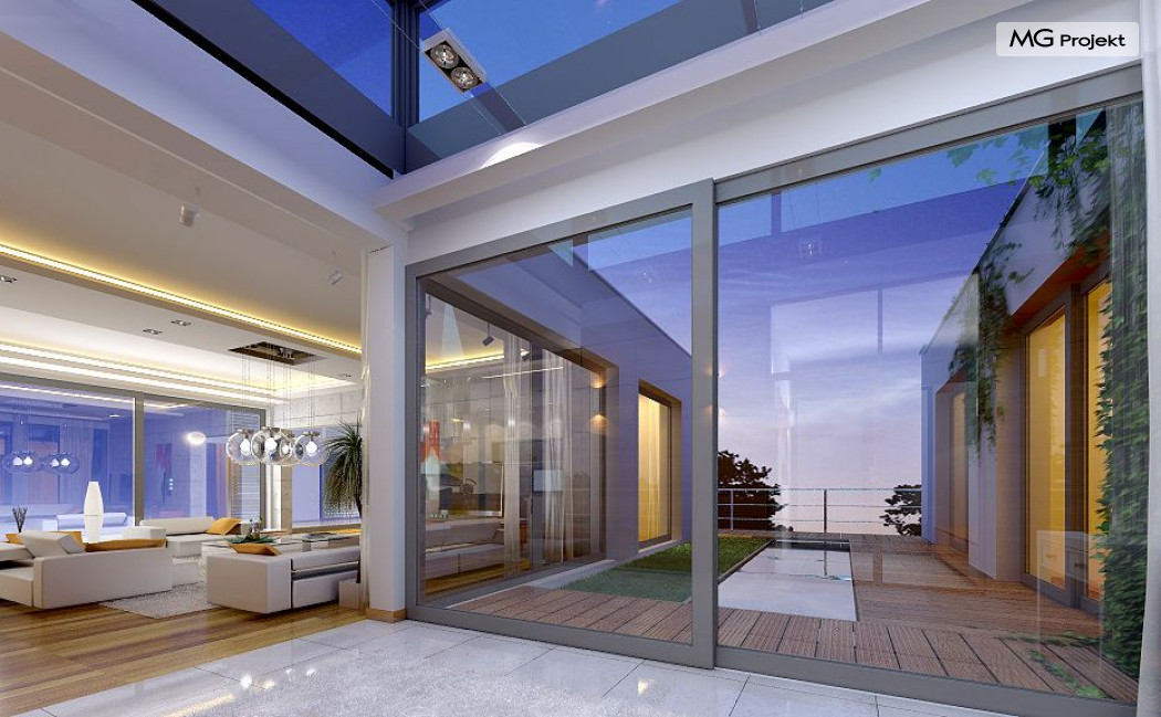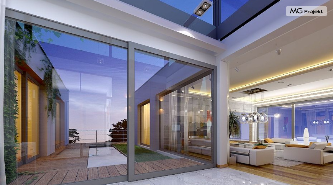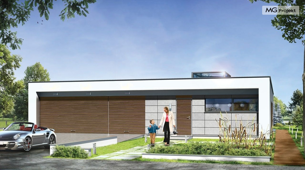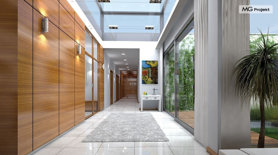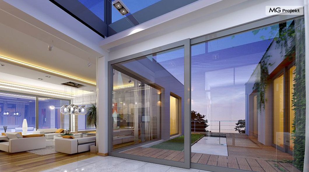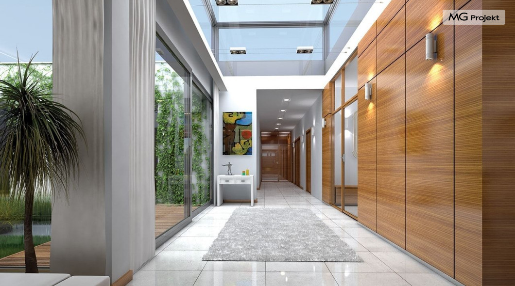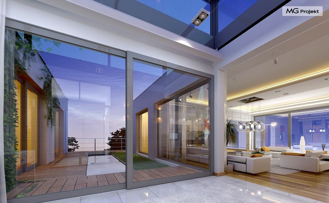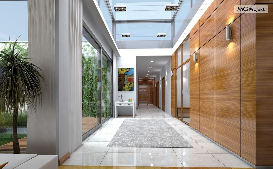Projekt domu Willa Atrium - parterowy dom jednorodzinny, zaprojektowany jako jednokondygnacyjne przekryte płaskim dachem "pudełko", z otwartą elewacją frontową - wejściową, oraz przeszkloną elewacją ogrodową i tytułowym wewnętrznym atrium. Atrium w środkowej części bryły pozwala na doświetlenie wewnętrznych pomieszczeń, oraz stworzenie prywatnego, intymnego ogródka - zupełnie odizolowanego od oczu sąsiadów. W projekcie domu Willa Atrium przestrzeń podzielono funkcjonalnie na części. W bryle frontowej zaprojektowano zaplecze gospodarcze - z dużym garażem i kotłownią, umieszczono sypialnie dziecięce i gościnną z łazienkami, oraz gabinet - biuro. W bryle ogrodowej zaprojektowano salon, połączony z kuchnią, aneksem jadalnym i holem, oraz apartament rodziców - z sypialnią, łazienką i garderobą. Wiele otwarć i duża ilość przeszkleń - z salonu i sypialni - daje możliwość unikalnego wręcz kontaktu domowników z otaczającą przyrodą. Dom posiada dwa niezależne wejścia: codzienne - od strony elewacji frontowej, między garażem a gabinetem, oraz drugie - reprezentacyjne, wiodące wzdłuż elewacji bocznej, po oświetlonym decku, do wejścia przez szklany przedsionek do podwyższonego centralnego westybulu, ze świetlikiem w dachu i pięknym widokiem na wewnętrzne atrium. W projekcie zastosowano rzadko spotykane detale, materiały i rozwiązania - jak całkowicie przeszklona, schowana w podcieniu elewacja ogrodowa, z dwustronnym masywnym kominkiem, czy piękna wyspa kuchni widoczna z salonu. Elementy te świadczą o wyjątkowości i stylu domu. Zarówno wygląd zewnętrzny domu, jak i jego wnętrza tworzą niepowtarzalny, oryginalny efekt. Projekt domu Willa Atrium dostępny jest także w wersji odbicia lustrzanego.