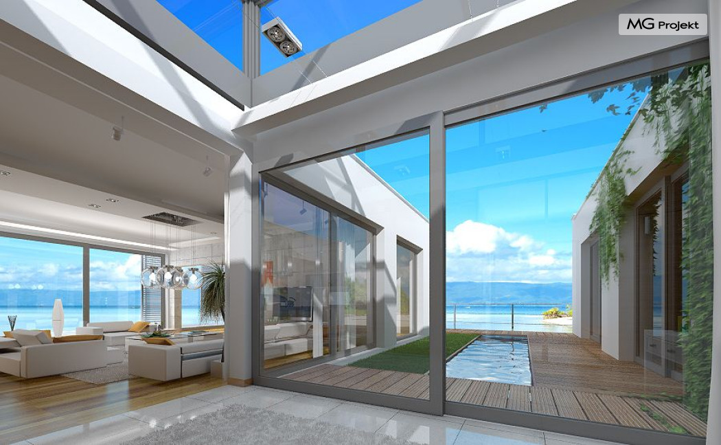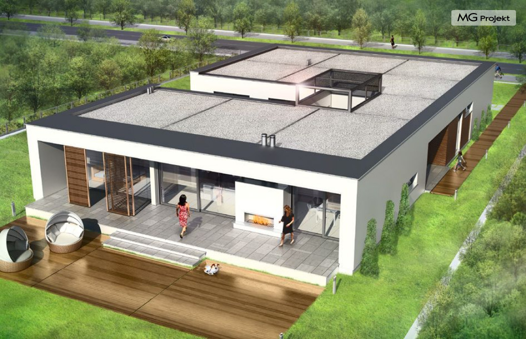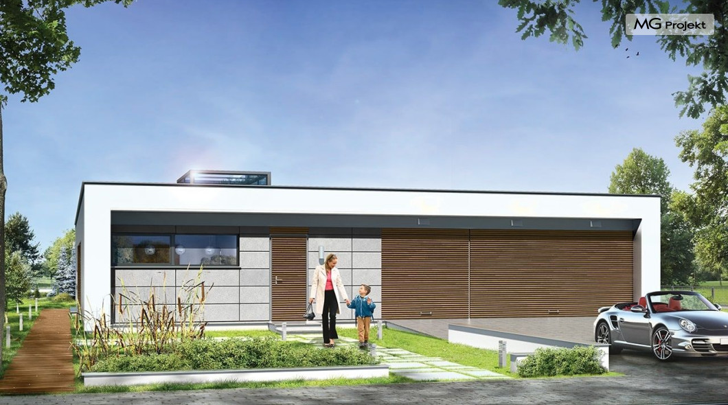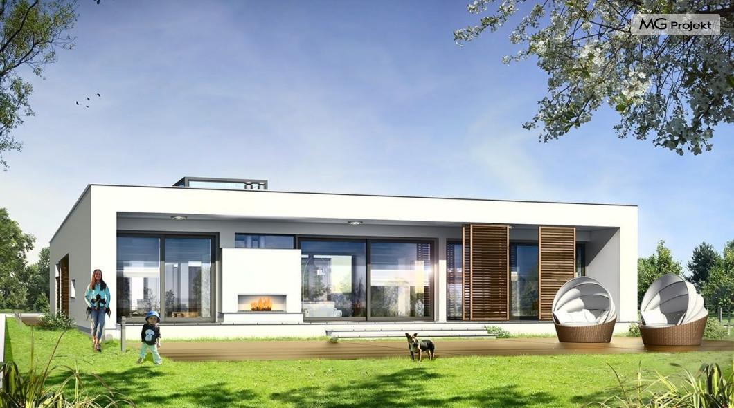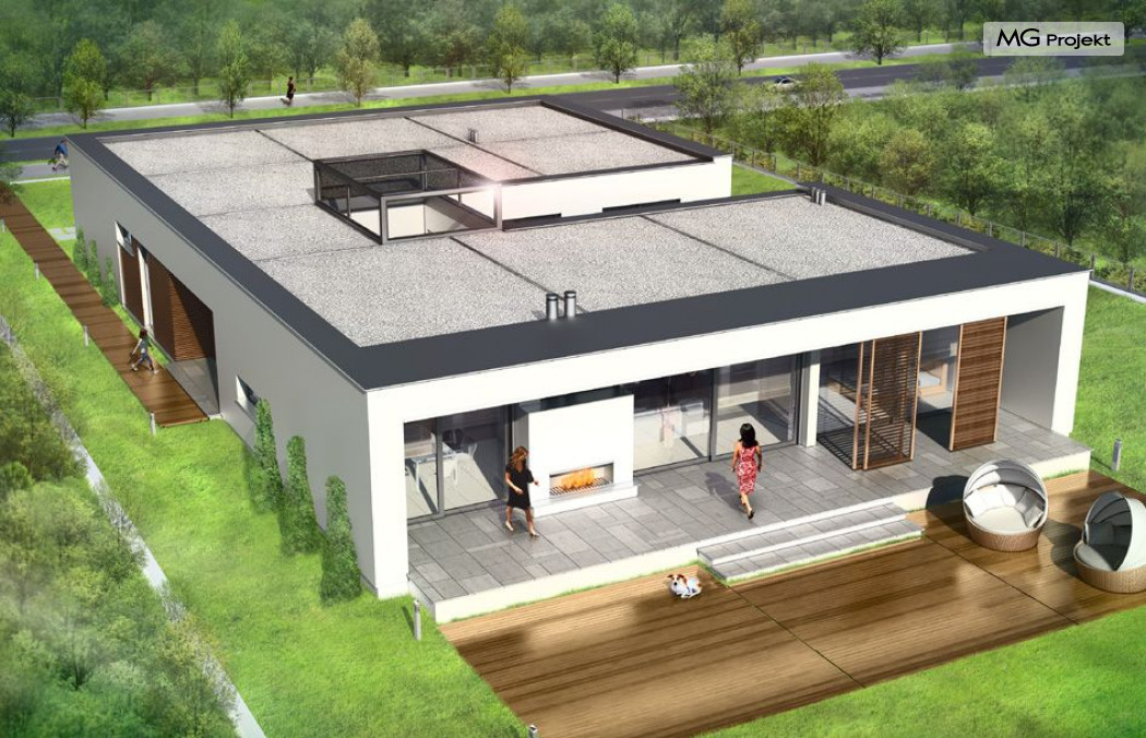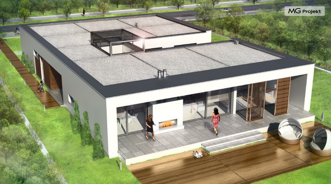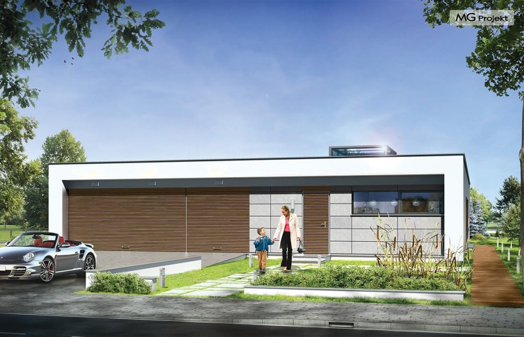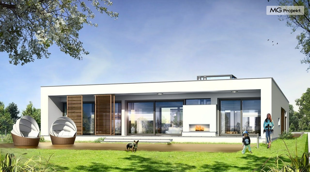 Projekt domu Willa Atrium - parterowy dom jednorodzinny, zaprojektowany jako jednokondygnacyjne przekryte płaskim dachem "pudełko", z otwartą elewacją frontową - wejściową, oraz przeszkloną elewacją ogrodową i tytułowym wewnętrznym atrium. Atrium w środkowej części bryły pozwala na doświetlenie wewnętrznych pomieszczeń, oraz stworzenie prywatnego, intymnego ogródka - zupełnie odizolowanego od oczu sąsiadów. W projekcie domu Willa Atrium przestrzeń podzielono funkcjonalnie na części. W bryle frontowej zaprojektowano zaplecze gospodarcze - z dużym garażem i kotłownią, umieszczono sypialnie dziecięce i gościnną z łazienkami, oraz gabinet - biuro. W bryle ogrodowej zaprojektowano salon, połączony z kuchnią, aneksem jadalnym i holem, oraz apartament rodziców - z sypialnią, łazienką i garderobą. Wiele otwarć i duża ilość przeszkleń - z salonu i sypialni - daje możliwość unikalnego wręcz kontaktu domowników z otaczającą przyrodą. Dom posiada dwa niezależne wejścia: codzienne - od strony elewacji frontowej, między garażem a gabinetem, oraz drugie - reprezentacyjne, wiodące wzdłuż elewacji bocznej, po oświetlonym decku, do wejścia przez szklany przedsionek do podwyższonego centralnego westybulu, ze świetlikiem w dachu i pięknym widokiem na wewnętrzne atrium. W projekcie zastosowano rzadko spotykane detale, materiały i rozwiązania - jak całkowicie przeszklona, schowana w podcieniu elewacja ogrodowa, z dwustronnym masywnym kominkiem, czy piękna wyspa kuchni widoczna z salonu. Elementy te świadczą o wyjątkowości i stylu domu. Zarówno wygląd zewnętrzny domu, jak i jego wnętrza tworzą niepowtarzalny, oryginalny efekt. Projekt domu Willa Atrium dostępny jest także w wersji odbicia lustrzanego.