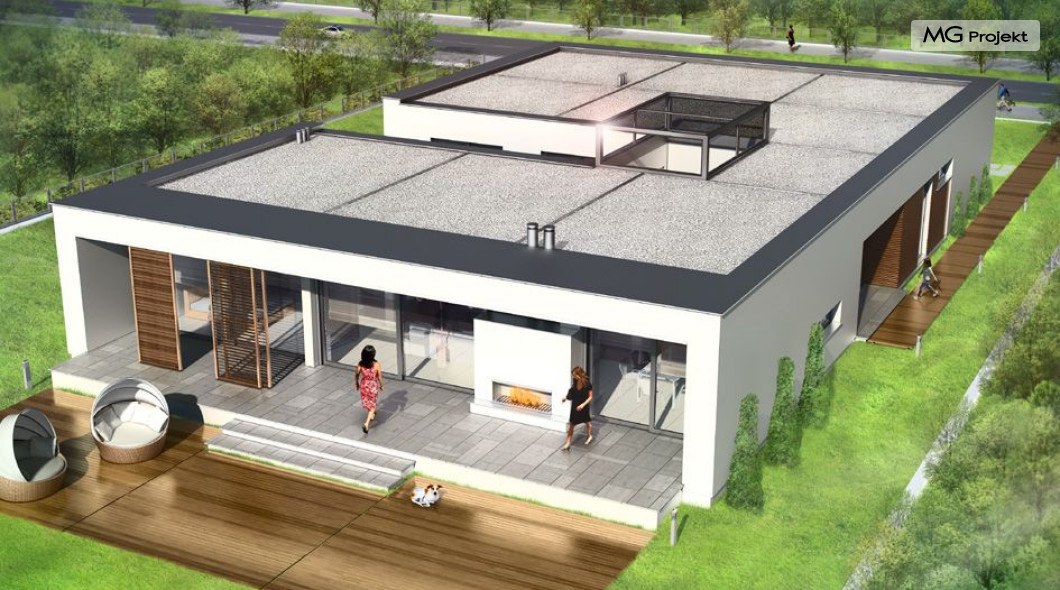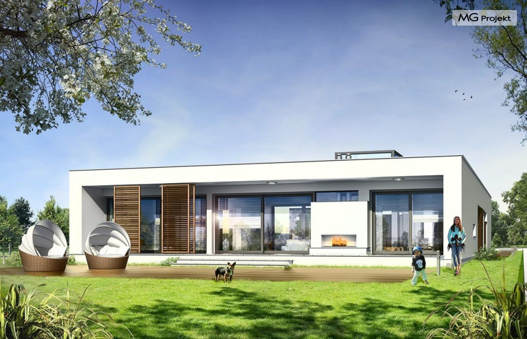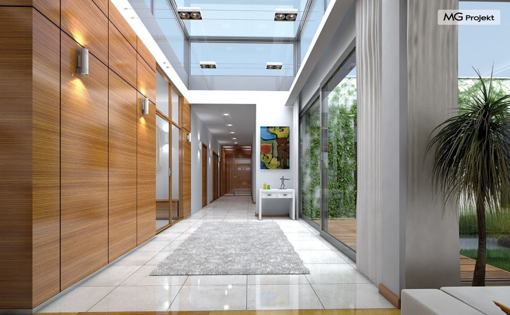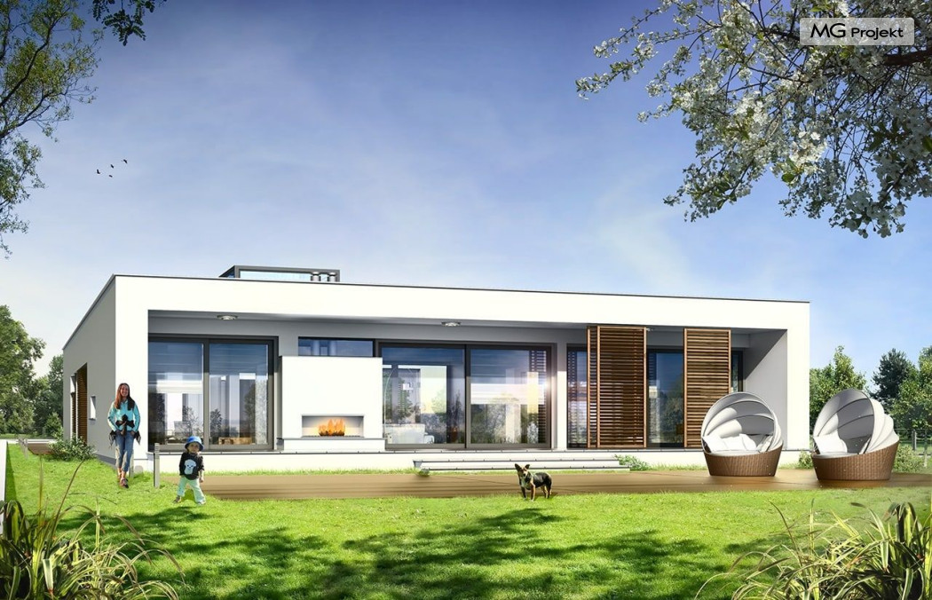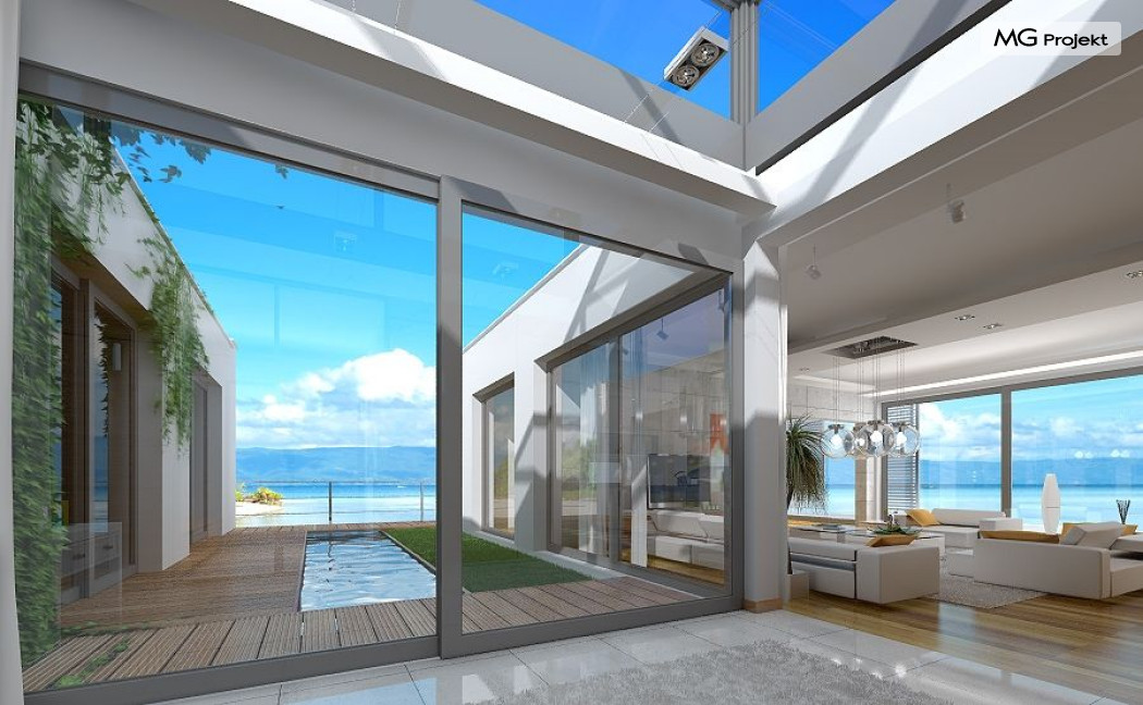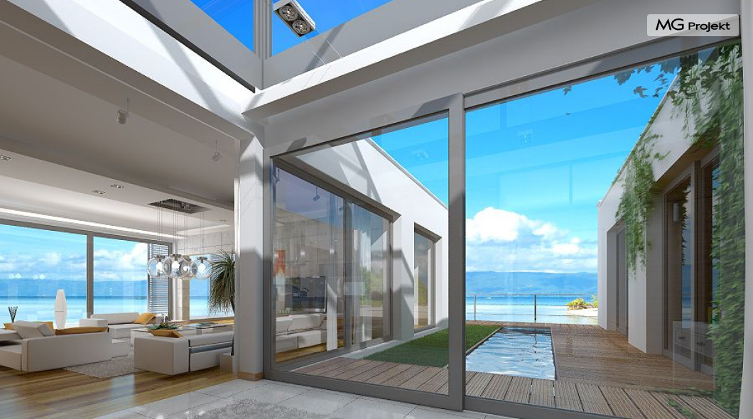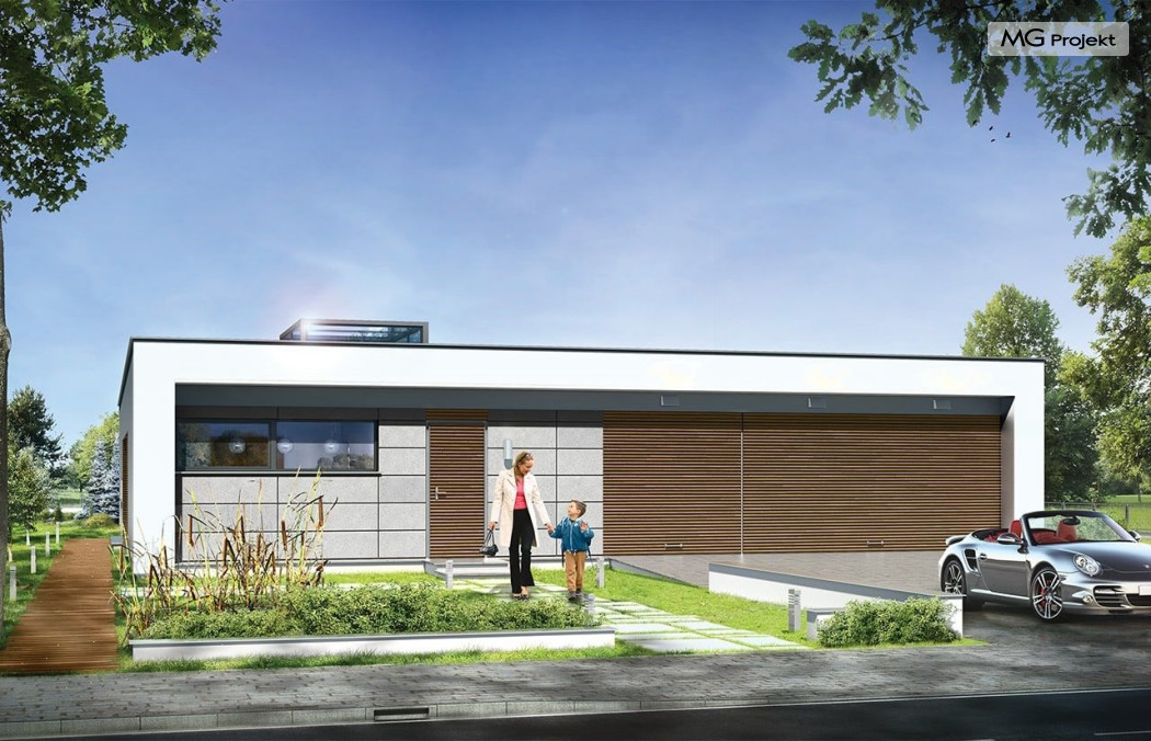 Projekt domu Willa Atrium - parterowy dom jednorodzinny, zaprojektowany jako jednokondygnacyjne przekryte płaskim dachem "pudełko", z otwartą elewacją frontową - wejściową, oraz przeszkloną elewacją ogrodową i tytułowym wewnętrznym atrium. Atrium w środkowej części bryły pozwala na doświetlenie wewnętrznych pomieszczeń, oraz stworzenie prywatnego, intymnego ogródka - zupełnie odizolowanego od oczu sąsiadów. W projekcie domu Willa Atrium przestrzeń podzielono funkcjonalnie na części. W bryle frontowej zaprojektowano zaplecze gospodarcze - z dużym garażem i kotłownią, umieszczono sypialnie dziecięce i gościnną z łazienkami, oraz gabinet - biuro. W bryle ogrodowej zaprojektowano salon, połączony z kuchnią, aneksem jadalnym i holem, oraz apartament rodziców - z sypialnią, łazienką i garderobą. Wiele otwarć i duża ilość przeszkleń - z salonu i sypialni - daje możliwość unikalnego wręcz kontaktu domowników z otaczającą przyrodą. Dom posiada dwa niezależne wejścia: codzienne - od strony elewacji frontowej, między garażem a gabinetem, oraz drugie - reprezentacyjne, wiodące wzdłuż elewacji bocznej, po oświetlonym decku, do wejścia przez szklany przedsionek do podwyższonego centralnego westybulu, ze świetlikiem w dachu i pięknym widokiem na wewnętrzne atrium. W projekcie zastosowano rzadko spotykane detale, materiały i rozwiązania - jak całkowicie przeszklona, schowana w podcieniu elewacja ogrodowa, z dwustronnym masywnym kominkiem, czy piękna wyspa kuchni widoczna z salonu. Elementy te świadczą o wyjątkowości i stylu domu. Zarówno wygląd zewnętrzny domu, jak i jego wnętrza tworzą niepowtarzalny, oryginalny efekt. Projekt domu Willa Atrium dostępny jest także w wersji odbicia lustrzanego.