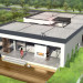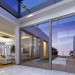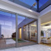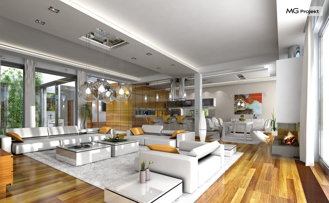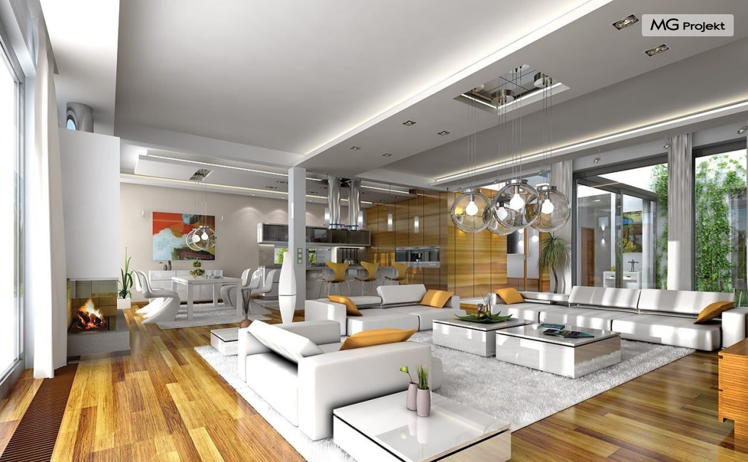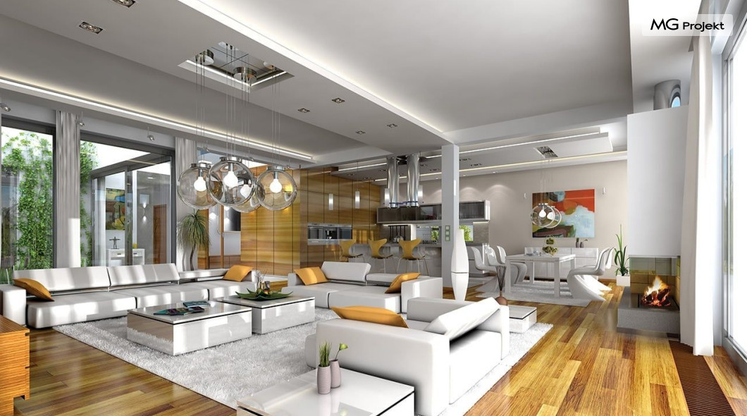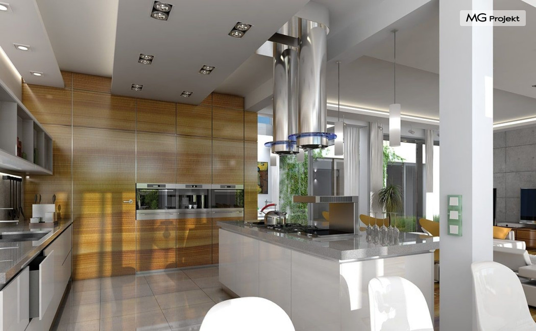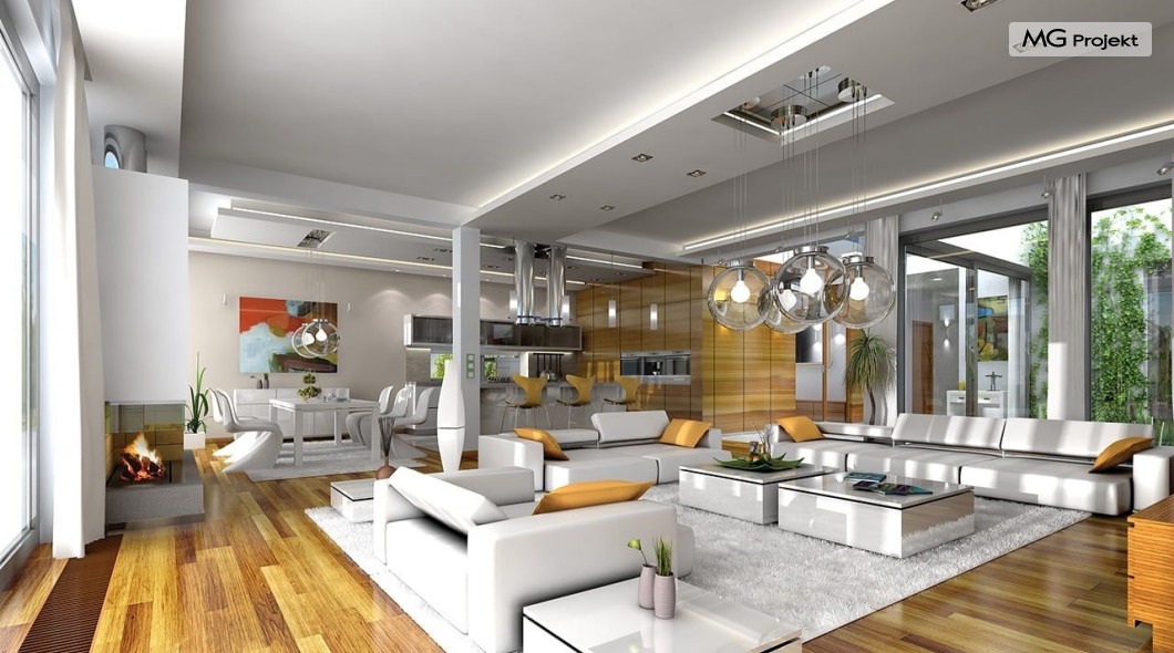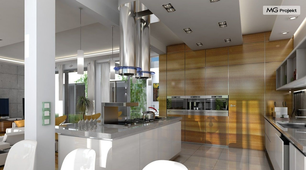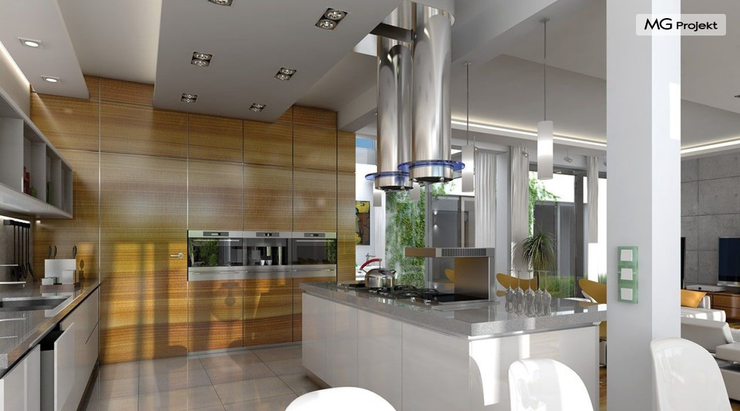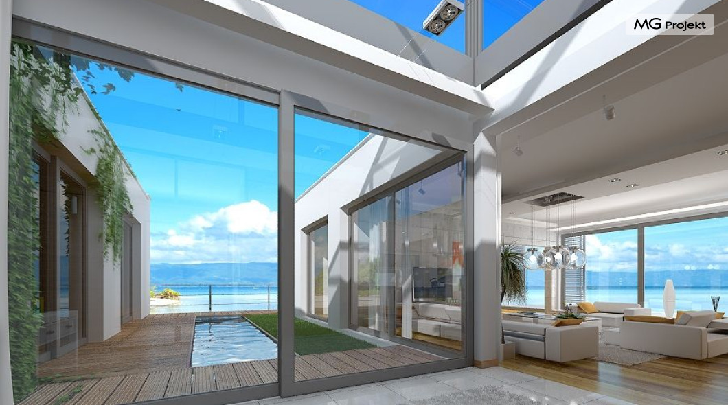 Projekt domu Willa Atrium - parterowy dom jednorodzinny, zaprojektowany jako jednokondygnacyjne przekryte płaskim dachem "pudełko", z otwartą elewacją frontową - wejściową, oraz przeszkloną elewacją ogrodową i tytułowym wewnętrznym atrium. Atrium w środkowej części bryły pozwala na doświetlenie wewnętrznych pomieszczeń, oraz stworzenie prywatnego, intymnego ogródka - zupełnie odizolowanego od oczu sąsiadów. W projekcie domu Willa Atrium przestrzeń podzielono funkcjonalnie na części. W bryle frontowej zaprojektowano zaplecze gospodarcze - z dużym garażem i kotłownią, umieszczono sypialnie dziecięce i gościnną z łazienkami, oraz gabinet - biuro. W bryle ogrodowej zaprojektowano salon, połączony z kuchnią, aneksem jadalnym i holem, oraz apartament rodziców - z sypialnią, łazienką i garderobą. Wiele otwarć i duża ilość przeszkleń - z salonu i sypialni - daje możliwość unikalnego wręcz kontaktu domowników z otaczającą przyrodą. Dom posiada dwa niezależne wejścia: codzienne - od strony elewacji frontowej, między garażem a gabinetem, oraz drugie - reprezentacyjne, wiodące wzdłuż elewacji bocznej, po oświetlonym decku, do wejścia przez szklany przedsionek do podwyższonego centralnego westybulu, ze świetlikiem w dachu i pięknym widokiem na wewnętrzne atrium. W projekcie zastosowano rzadko spotykane detale, materiały i rozwiązania - jak całkowicie przeszklona, schowana w podcieniu elewacja ogrodowa, z dwustronnym masywnym kominkiem, czy piękna wyspa kuchni widoczna z salonu. Elementy te świadczą o wyjątkowości i stylu domu. Zarówno wygląd zewnętrzny domu, jak i jego wnętrza tworzą niepowtarzalny, oryginalny efekt. Projekt domu Willa Atrium dostępny jest także w wersji odbicia lustrzanego.