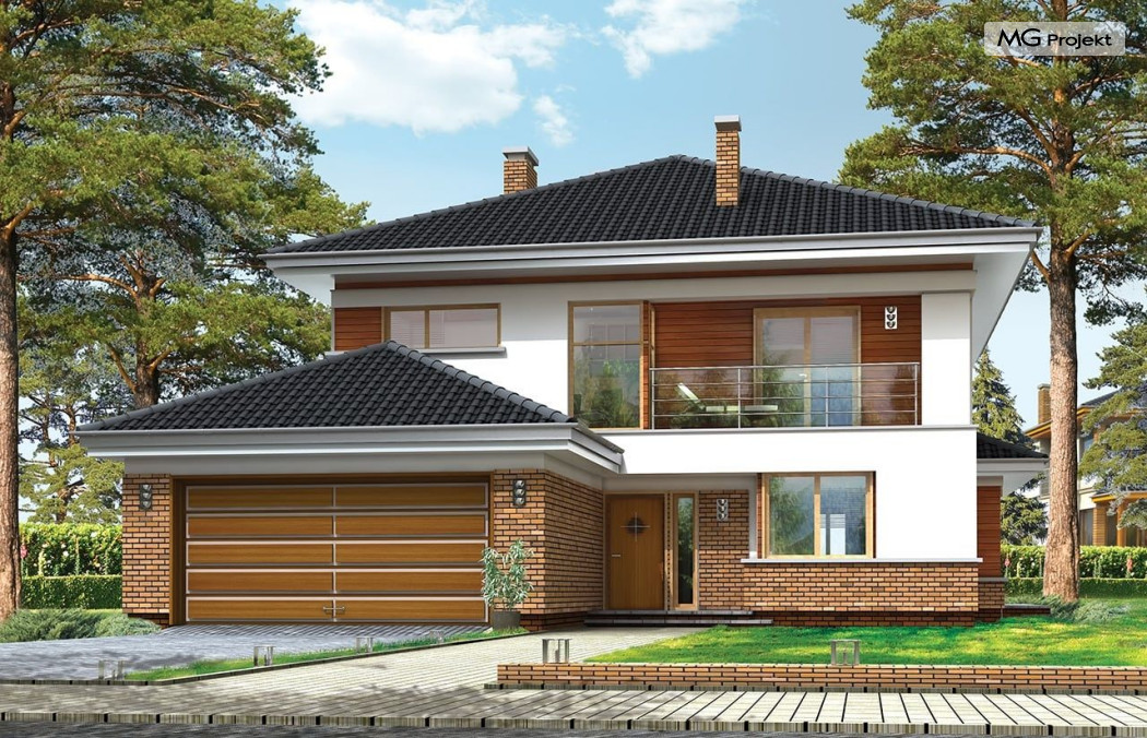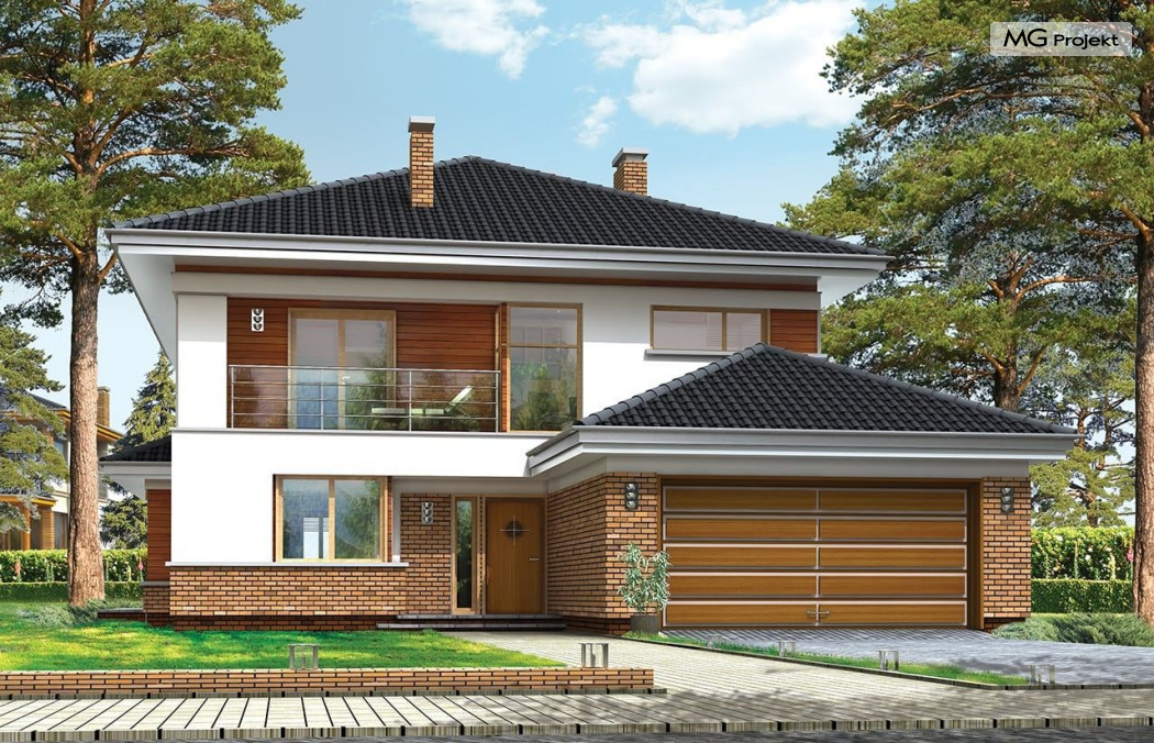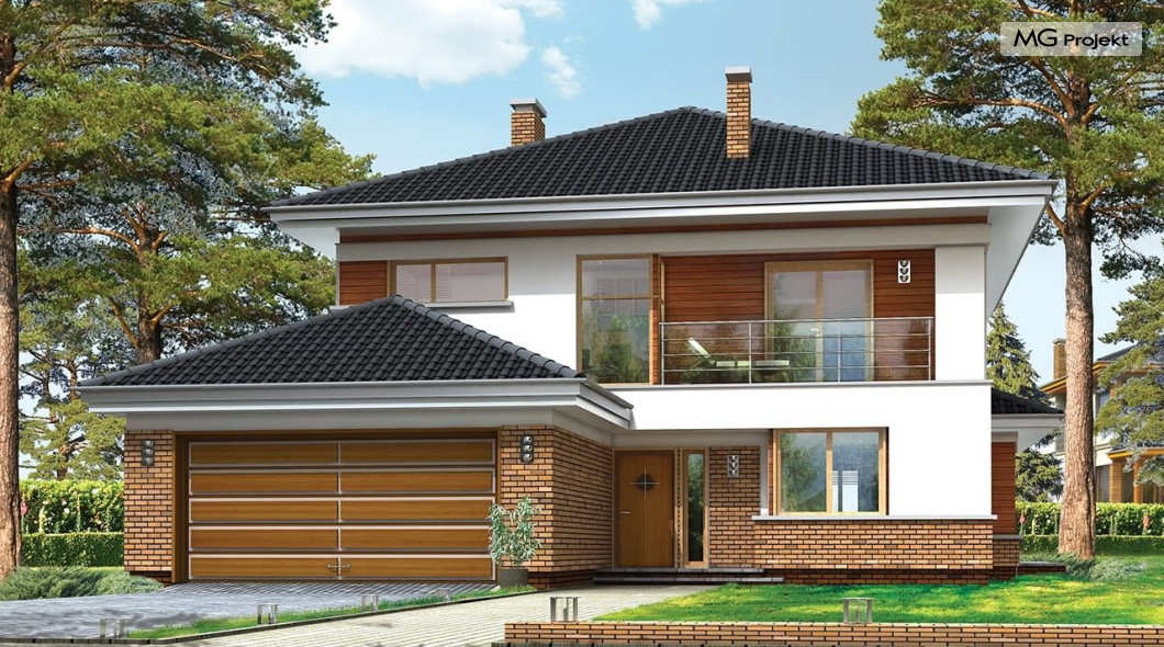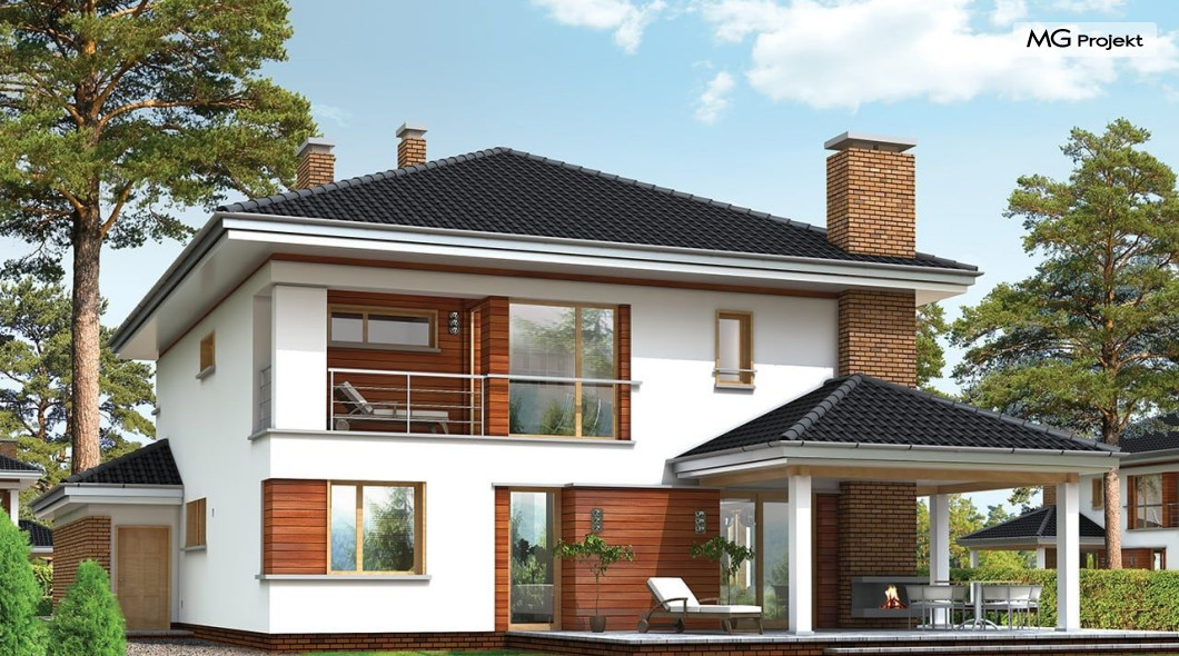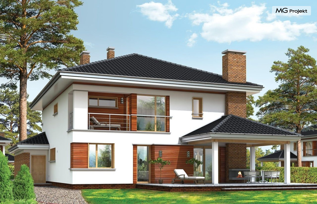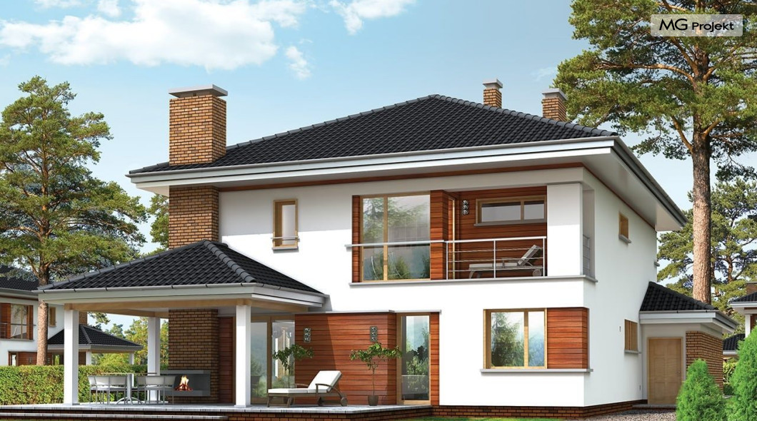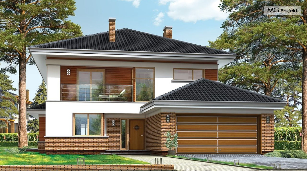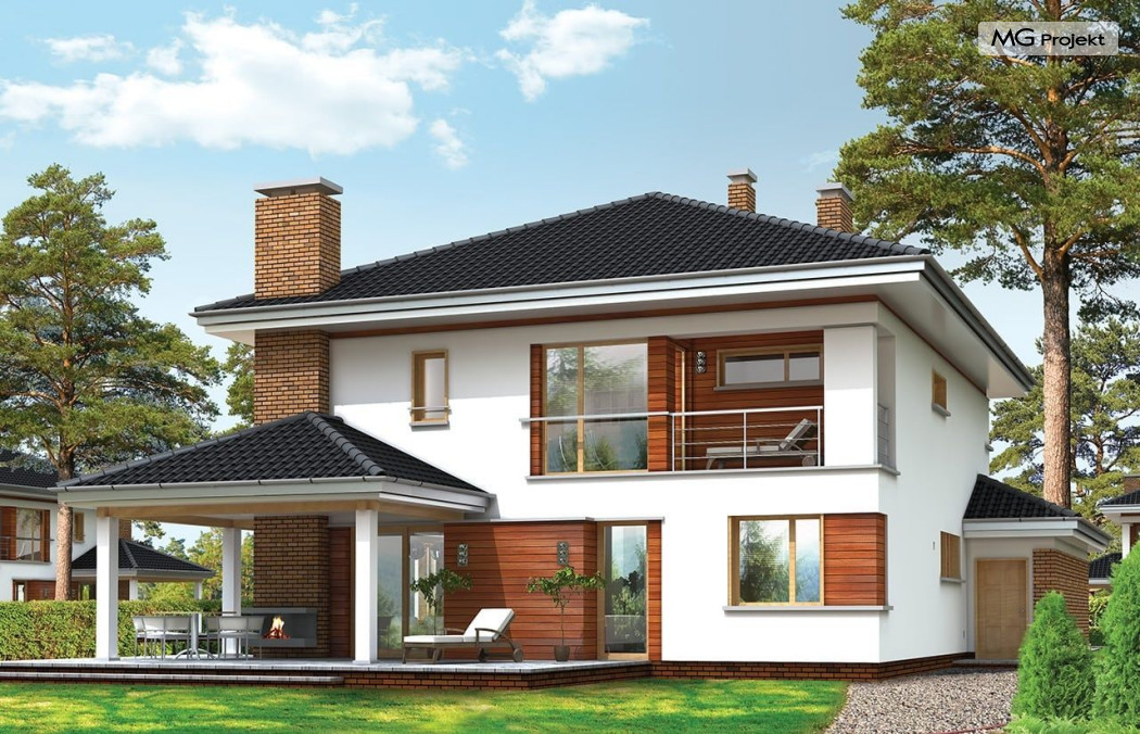 Projekt domu Willa na Borowej to piętrowy dom jednorodzinny dla rodziny cztero-sześcioosobowej, przykryty czterospadowym dachem. Dom jest podmiejską willą o nowoczesnej ale spokojnej architekturze. Zwarta bryła budynku z dobudowanym garażem i dużym zadaszonym podcieniem z tyłu domu, została ciekawie ozdobiona klinkierowymi i drewnianymi okładzinami elewacji, oraz loggiami i podcieniem wejściowym. Masywny ozdobny komin kominka wewnętrznego i zewnętrznego, czy narożne okna - to dodatkowe ozdoby bryły. Wszystkie elementy tworzą spójną, spokojną kompozycyjnie całość. W projekcie domu Willa na Borowej, na parterze zaprojektowano duży salon z jadalnią i holem, z częściowo otwartą kuchnią, oraz dodatkowy pokój - gabinet lub sypialnię gościnną. Na piętrze umieszczono sypialnie, z odrębnym apartamentem rodziców, z własną łazienką, garderobą i balkonem z widokiem na ogród. Na parterze przez szerokie przeszklenia z salonu zaplanowano wyjście do dużego podcienia i na taras ogrodowy. Pracownia posiada wersję odbicia lustrzanego projektu domu Willa na Borowej. Zapraszamy do obejrzenia wszystkich propozycji pracowni MGProjekt z tej serii: https://www.mgprojekt.com.pl/willa-na-borowej, https://www.mgprojekt.com.pl/willa-na-borowej-wariant-b, https://www.mgprojekt.com.pl/willa-na-borowej-wariant-c, https://www.mgprojekt.com.pl/willa-na-borowej-wariant-d, https://www.mgprojekt.com.pl/willa-na-borowej-wariant-e.