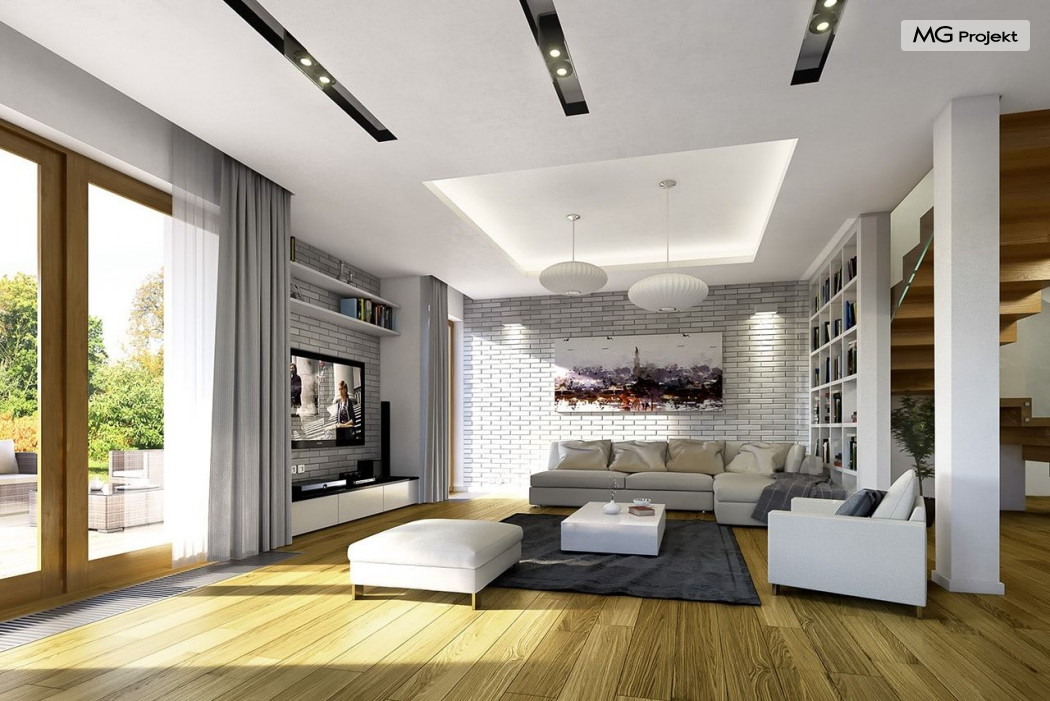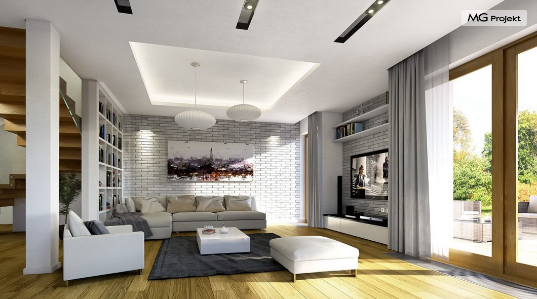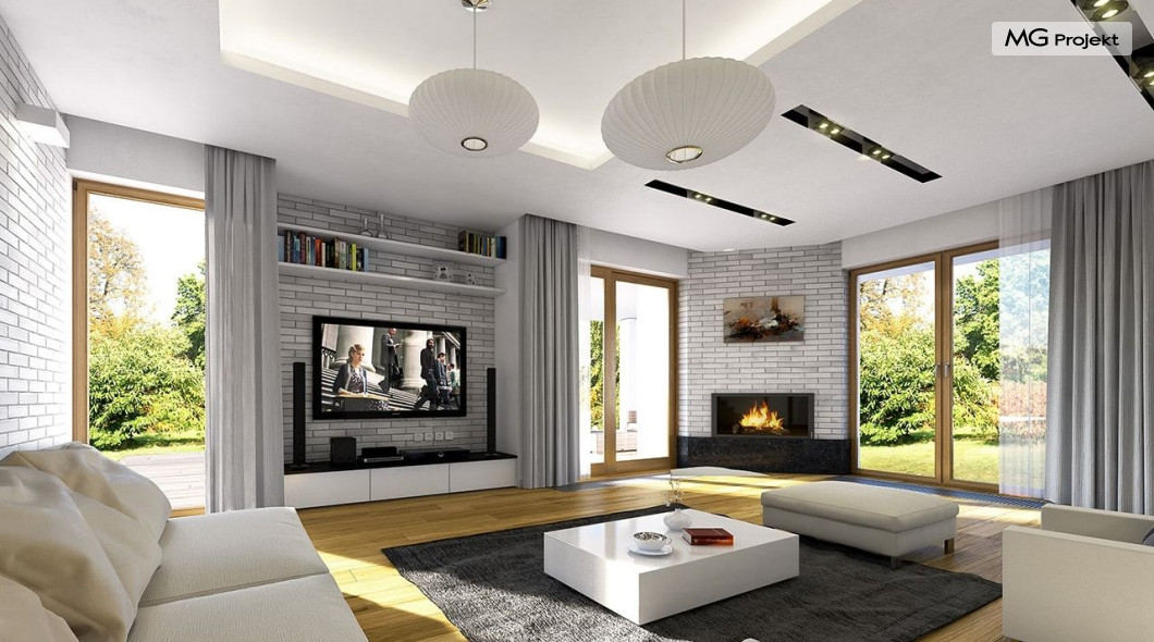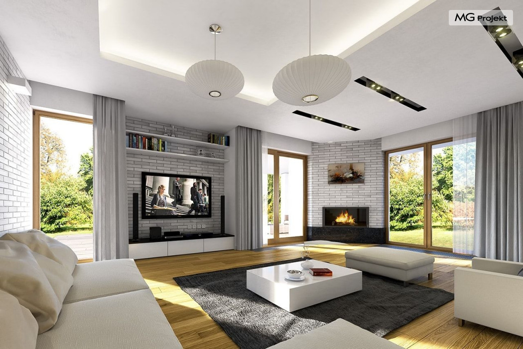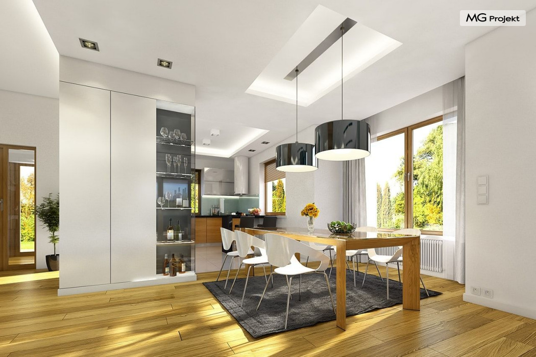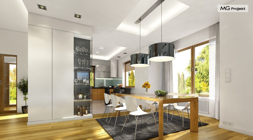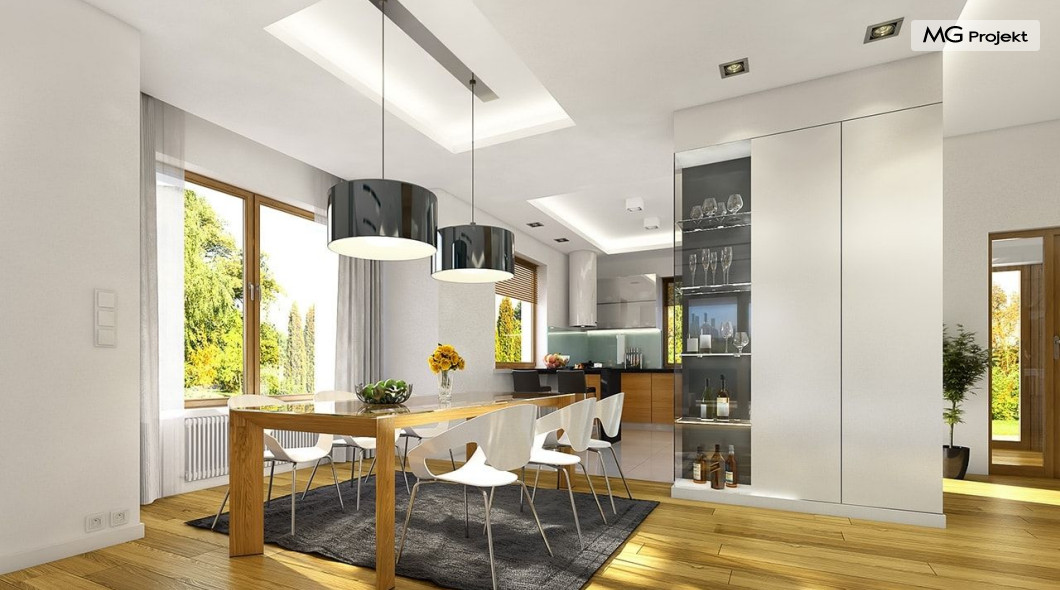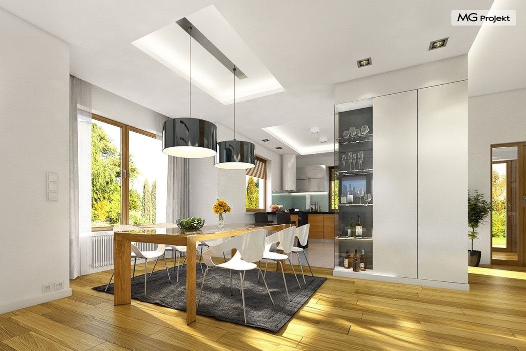 Projekt domu Willa na Borowej to piętrowy dom jednorodzinny dla rodziny cztero-sześcioosobowej, przykryty czterospadowym dachem. Dom jest podmiejską willą o nowoczesnej ale spokojnej architekturze. Zwarta bryła budynku z dobudowanym garażem i dużym zadaszonym podcieniem z tyłu domu, została ciekawie ozdobiona klinkierowymi i drewnianymi okładzinami elewacji, oraz loggiami i podcieniem wejściowym. Masywny ozdobny komin kominka wewnętrznego i zewnętrznego, czy narożne okna - to dodatkowe ozdoby bryły. Wszystkie elementy tworzą spójną, spokojną kompozycyjnie całość. W projekcie domu Willa na Borowej, na parterze zaprojektowano duży salon z jadalnią i holem, z częściowo otwartą kuchnią, oraz dodatkowy pokój - gabinet lub sypialnię gościnną. Na piętrze umieszczono sypialnie, z odrębnym apartamentem rodziców, z własną łazienką, garderobą i balkonem z widokiem na ogród. Na parterze przez szerokie przeszklenia z salonu zaplanowano wyjście do dużego podcienia i na taras ogrodowy. Pracownia posiada wersję odbicia lustrzanego projektu domu Willa na Borowej. Zapraszamy do obejrzenia wszystkich propozycji pracowni MGProjekt z tej serii: https://www.mgprojekt.com.pl/willa-na-borowej, https://www.mgprojekt.com.pl/willa-na-borowej-wariant-b, https://www.mgprojekt.com.pl/willa-na-borowej-wariant-c, https://www.mgprojekt.com.pl/willa-na-borowej-wariant-d, https://www.mgprojekt.com.pl/willa-na-borowej-wariant-e.