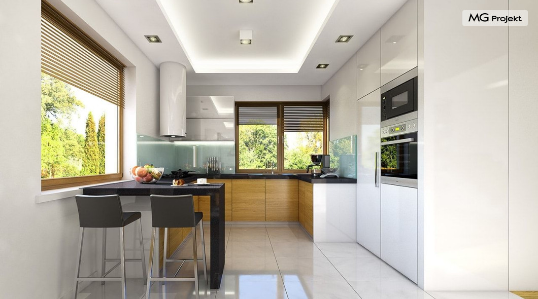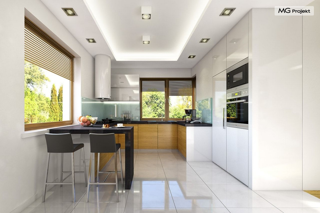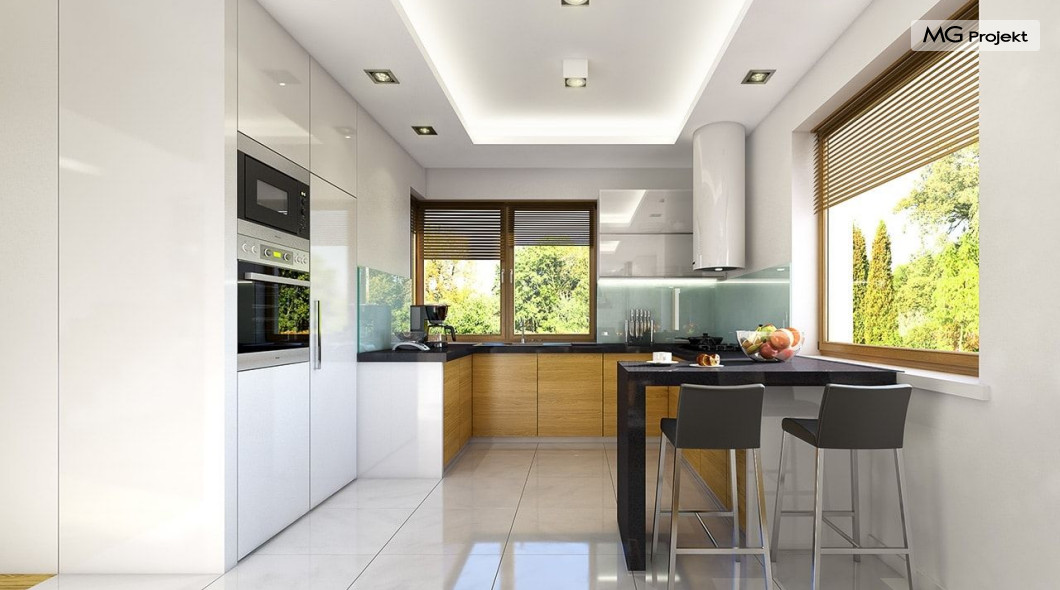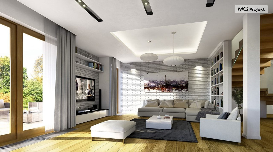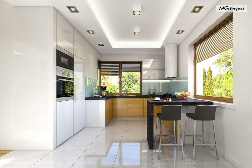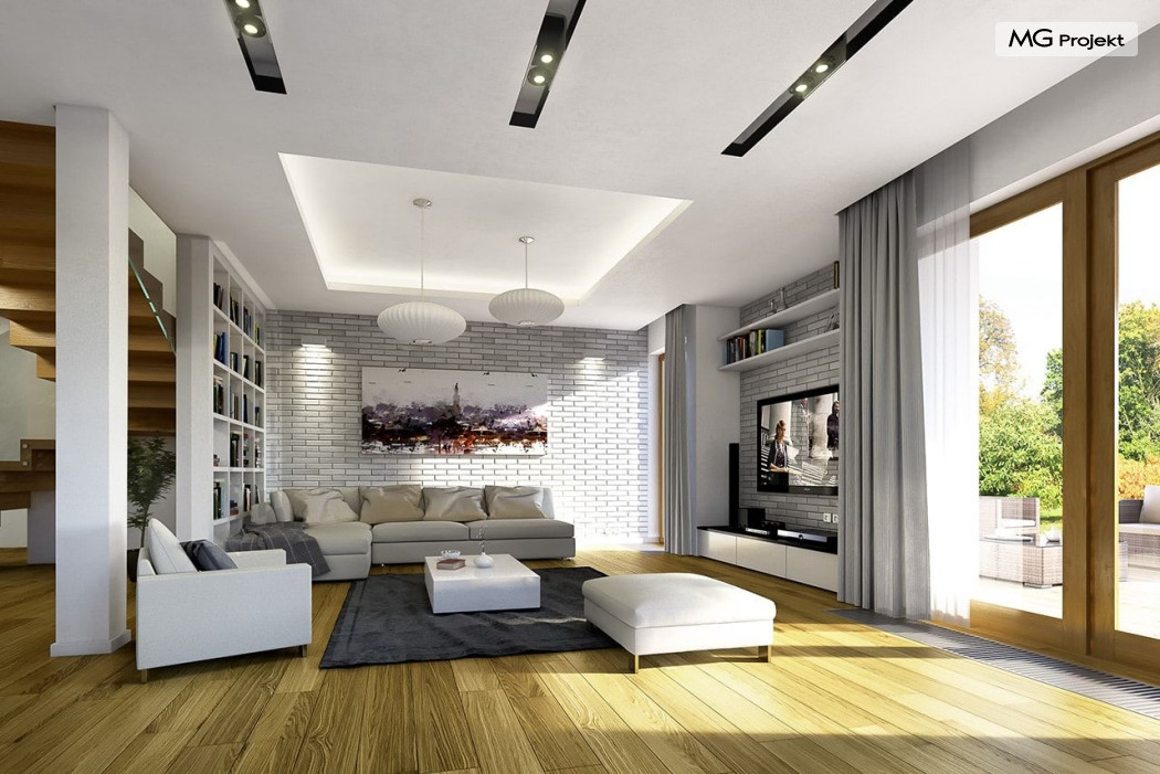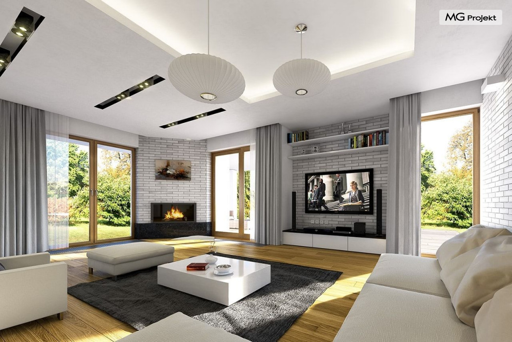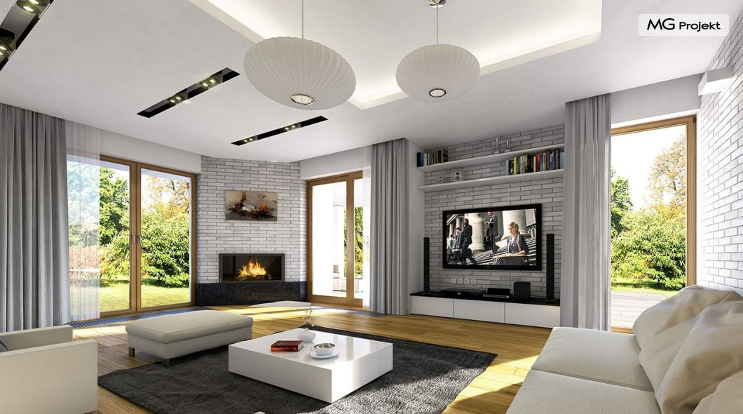 Projekt domu Willa na Borowej to piętrowy dom jednorodzinny dla rodziny cztero-sześcioosobowej, przykryty czterospadowym dachem. Dom jest podmiejską willą o nowoczesnej ale spokojnej architekturze. Zwarta bryła budynku z dobudowanym garażem i dużym zadaszonym podcieniem z tyłu domu, została ciekawie ozdobiona klinkierowymi i drewnianymi okładzinami elewacji, oraz loggiami i podcieniem wejściowym. Masywny ozdobny komin kominka wewnętrznego i zewnętrznego, czy narożne okna - to dodatkowe ozdoby bryły. Wszystkie elementy tworzą spójną, spokojną kompozycyjnie całość. W projekcie domu Willa na Borowej, na parterze zaprojektowano duży salon z jadalnią i holem, z częściowo otwartą kuchnią, oraz dodatkowy pokój - gabinet lub sypialnię gościnną. Na piętrze umieszczono sypialnie, z odrębnym apartamentem rodziców, z własną łazienką, garderobą i balkonem z widokiem na ogród. Na parterze przez szerokie przeszklenia z salonu zaplanowano wyjście do dużego podcienia i na taras ogrodowy. Pracownia posiada wersję odbicia lustrzanego projektu domu Willa na Borowej. Zapraszamy do obejrzenia wszystkich propozycji pracowni MGProjekt z tej serii: https://www.mgprojekt.com.pl/willa-na-borowej, https://www.mgprojekt.com.pl/willa-na-borowej-wariant-b, https://www.mgprojekt.com.pl/willa-na-borowej-wariant-c, https://www.mgprojekt.com.pl/willa-na-borowej-wariant-d, https://www.mgprojekt.com.pl/willa-na-borowej-wariant-e.