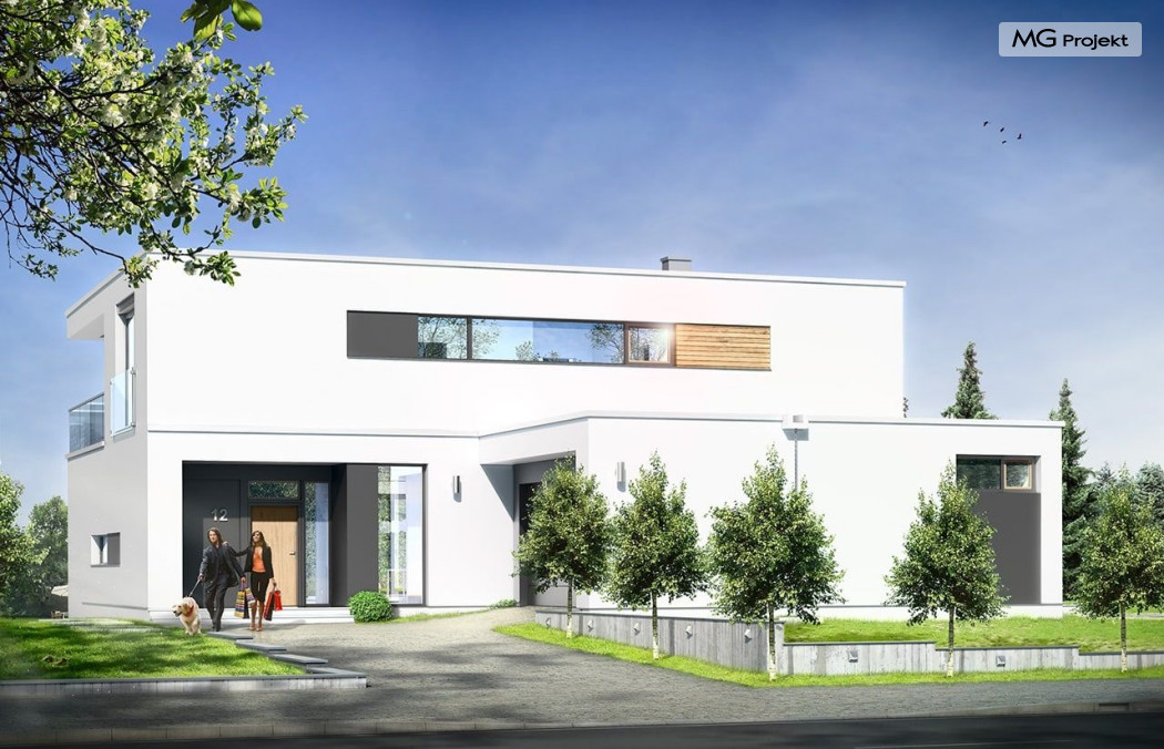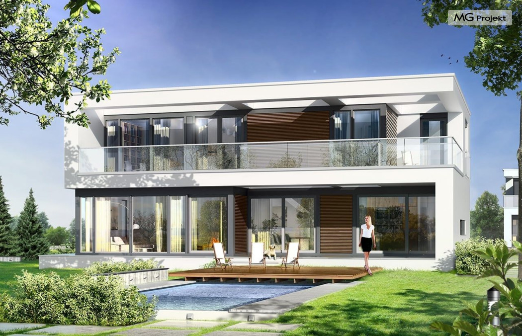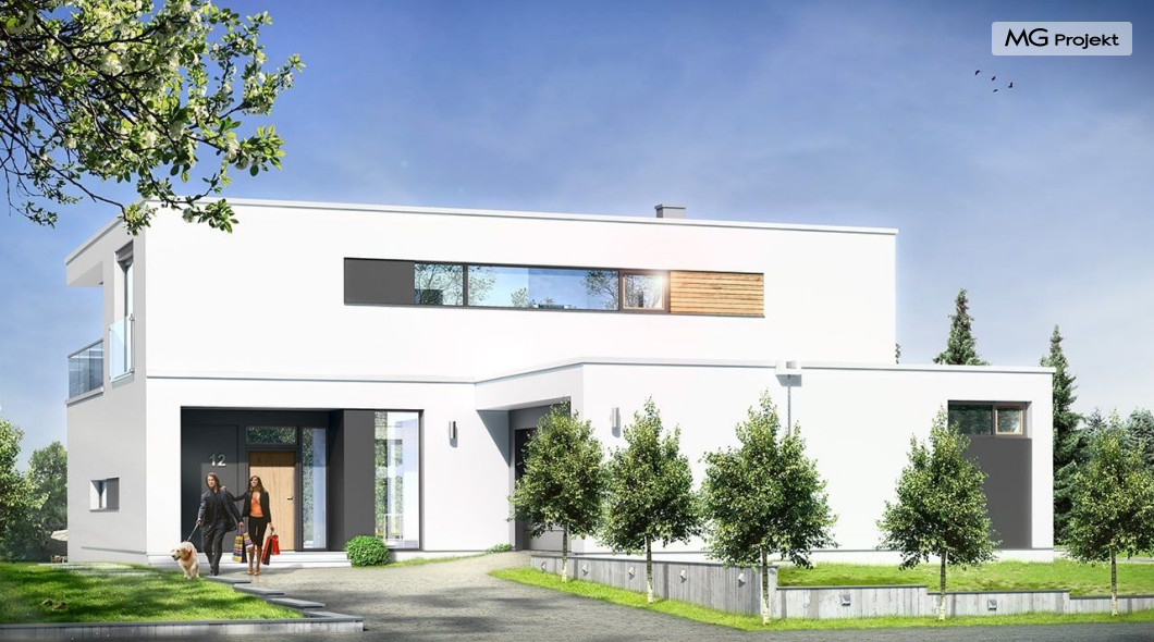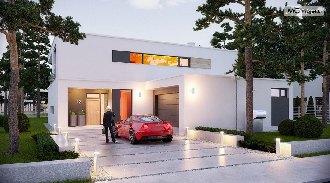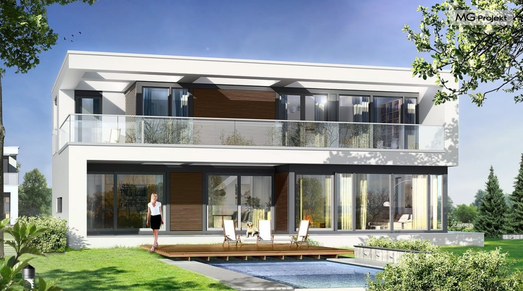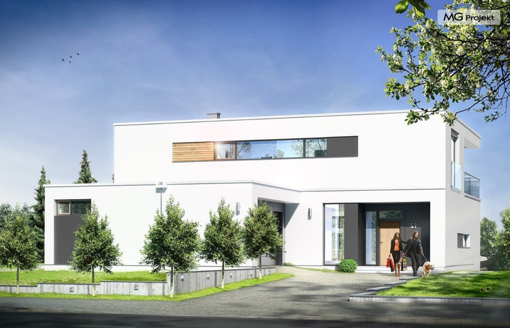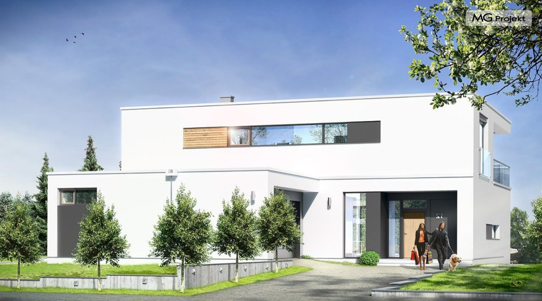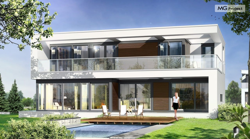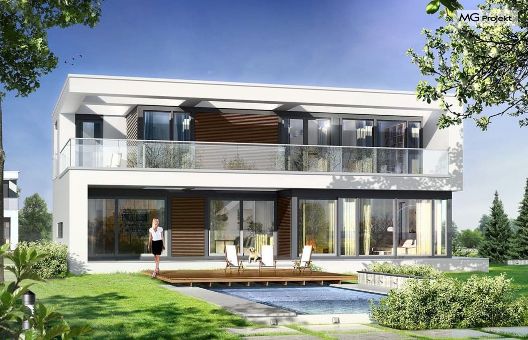 Projekt domu Willa Słoneczna to nowoczesna miejska willa. Dom przeznaczony jest dla cztero-sześcioosobowej rodziny. Nowoczesna piętrowa forma z płaskim dachem, została połączona z funkcjonalnym przemyślanym wnętrzem. Zasada kompozycji bryły budynku polega na maksymalnym otwarciu wnętrza domu na ogród, przy jednoczesnej minimalnej ekspozycji od strony frontowej. Elewacja frontowa, z niewielką ilością okien, z dużą białą powierzchnią ścian, jest przeciwieństwem otwartej, przeszklonej elewacji ogrodowej, urozmaiconej podcieniami i tarasami. Taki układ pozwala też na maksymalne wykorzystanie naturalnego nasłonecznienia i jednocześnie podwyższenie energooszczędności budynku. Wzajemnie przenikające się pełne białe ściany, z dużymi przeszklonymi powierzchniami, oraz drewnianymi okładzinami, wprowadzają ostre kontrasty w elewacjach domu. Siatka podciągów od strony ogrodu zamyka prostopadłościenną bryłę i jednocześnie stanowi naturalną osłonę przed nadmiernym nasłonecznieniem wnętrza. Od frontu - parterowy garaż z wjazdem z bocznego wewnętrznego dziedzińca łagodzi masywną piętrową sylwetkę domu. Wnętrze składa się z części dziennej na parterze, oraz sypialni na piętrze. Wariantowo w projekcie domu Willa Słoneczna zaplanowano częściowe podpiwniczenie z domowym spa i centrum rekreacji. Na parterze zaprojektowano jednoprzestrzenne, otwarte na ogród wnętrze połączonego salonu, jadalni, holu, oraz półotwartej kuchni. Dodatkowo mieści się tam pokój - np. gabinet, łazienka, oraz garaż i kotłownia. Pięknymi ażurowymi schodami kierujemy się z holu na piętro, gdzie zaplanowano apartament rodziców - z własną łazienką, garderobami i tarasem, sypialnie dziecięce z łazienką i dodatkowy zapasowy pokój. Oryginalne rozwiązania wnętrz, ciekawe detale, nowoczesna forma architektoniczna dadzą przyszłym użytkownikom niekłamaną przyjemność z posiadania takiego domu. Pracownia posiada projekt domu Willa Słoneczna w wersji z podpiwniczeniem lub bez piwnicy, oraz w odbiciu lustrzanym.