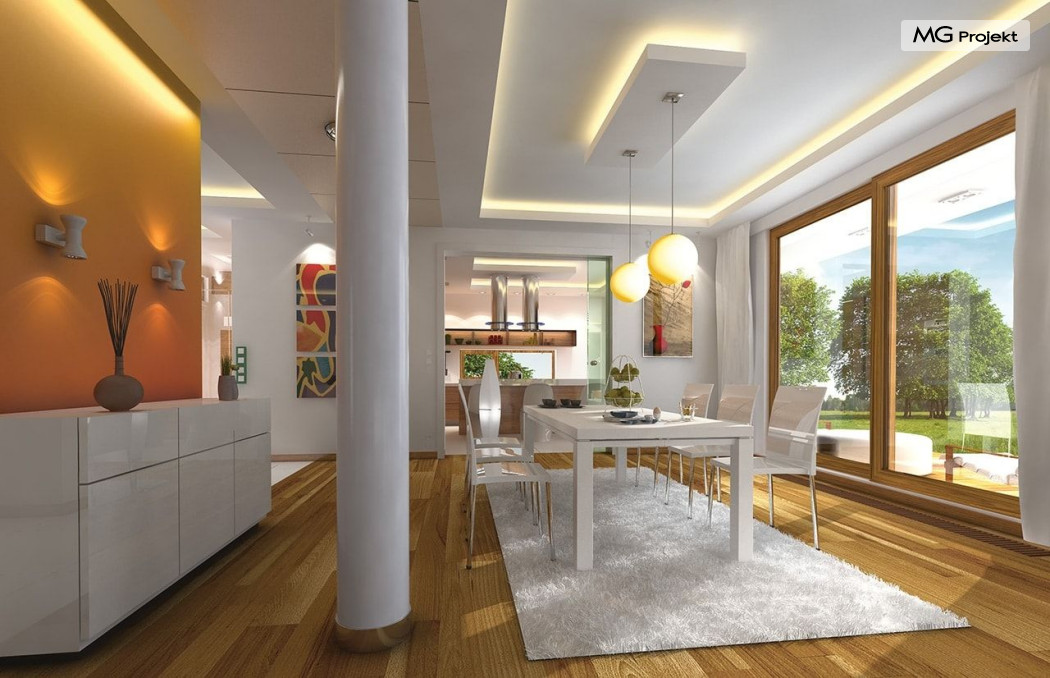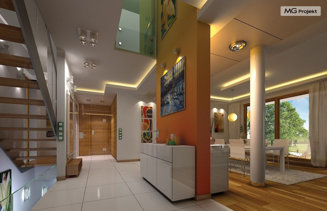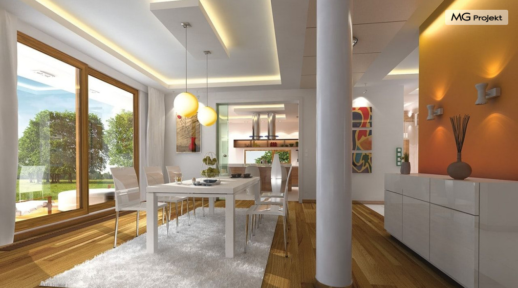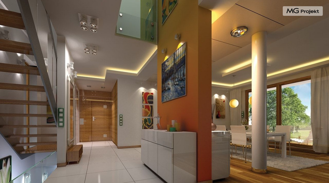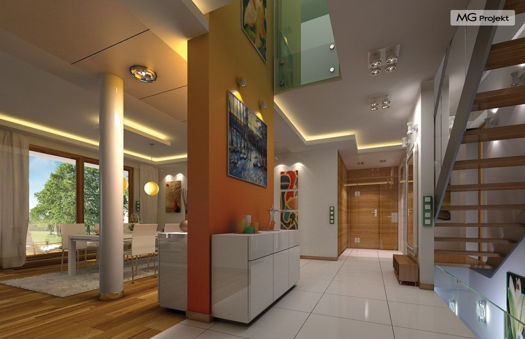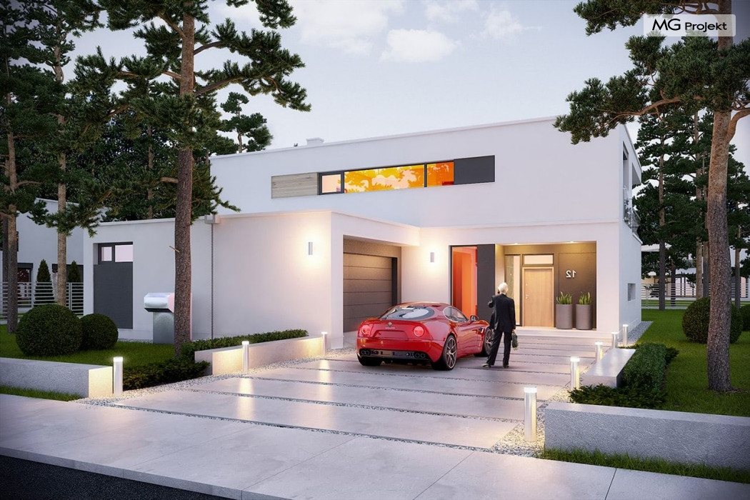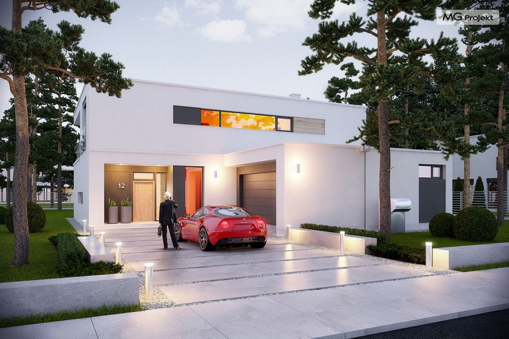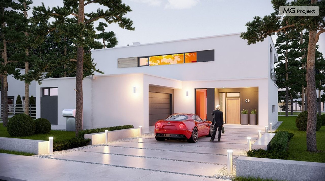 Projekt domu Willa Słoneczna to nowoczesna miejska willa. Dom przeznaczony jest dla cztero-sześcioosobowej rodziny. Nowoczesna piętrowa forma z płaskim dachem, została połączona z funkcjonalnym przemyślanym wnętrzem. Zasada kompozycji bryły budynku polega na maksymalnym otwarciu wnętrza domu na ogród, przy jednoczesnej minimalnej ekspozycji od strony frontowej. Elewacja frontowa, z niewielką ilością okien, z dużą białą powierzchnią ścian, jest przeciwieństwem otwartej, przeszklonej elewacji ogrodowej, urozmaiconej podcieniami i tarasami. Taki układ pozwala też na maksymalne wykorzystanie naturalnego nasłonecznienia i jednocześnie podwyższenie energooszczędności budynku. Wzajemnie przenikające się pełne białe ściany, z dużymi przeszklonymi powierzchniami, oraz drewnianymi okładzinami, wprowadzają ostre kontrasty w elewacjach domu. Siatka podciągów od strony ogrodu zamyka prostopadłościenną bryłę i jednocześnie stanowi naturalną osłonę przed nadmiernym nasłonecznieniem wnętrza. Od frontu - parterowy garaż z wjazdem z bocznego wewnętrznego dziedzińca łagodzi masywną piętrową sylwetkę domu. Wnętrze składa się z części dziennej na parterze, oraz sypialni na piętrze. Wariantowo w projekcie domu Willa Słoneczna zaplanowano częściowe podpiwniczenie z domowym spa i centrum rekreacji. Na parterze zaprojektowano jednoprzestrzenne, otwarte na ogród wnętrze połączonego salonu, jadalni, holu, oraz półotwartej kuchni. Dodatkowo mieści się tam pokój - np. gabinet, łazienka, oraz garaż i kotłownia. Pięknymi ażurowymi schodami kierujemy się z holu na piętro, gdzie zaplanowano apartament rodziców - z własną łazienką, garderobami i tarasem, sypialnie dziecięce z łazienką i dodatkowy zapasowy pokój. Oryginalne rozwiązania wnętrz, ciekawe detale, nowoczesna forma architektoniczna dadzą przyszłym użytkownikom niekłamaną przyjemność z posiadania takiego domu. Pracownia posiada projekt domu Willa Słoneczna w wersji z podpiwniczeniem lub bez piwnicy, oraz w odbiciu lustrzanym.