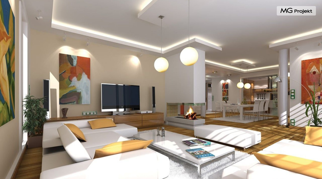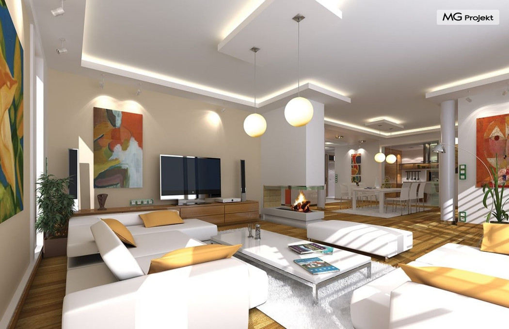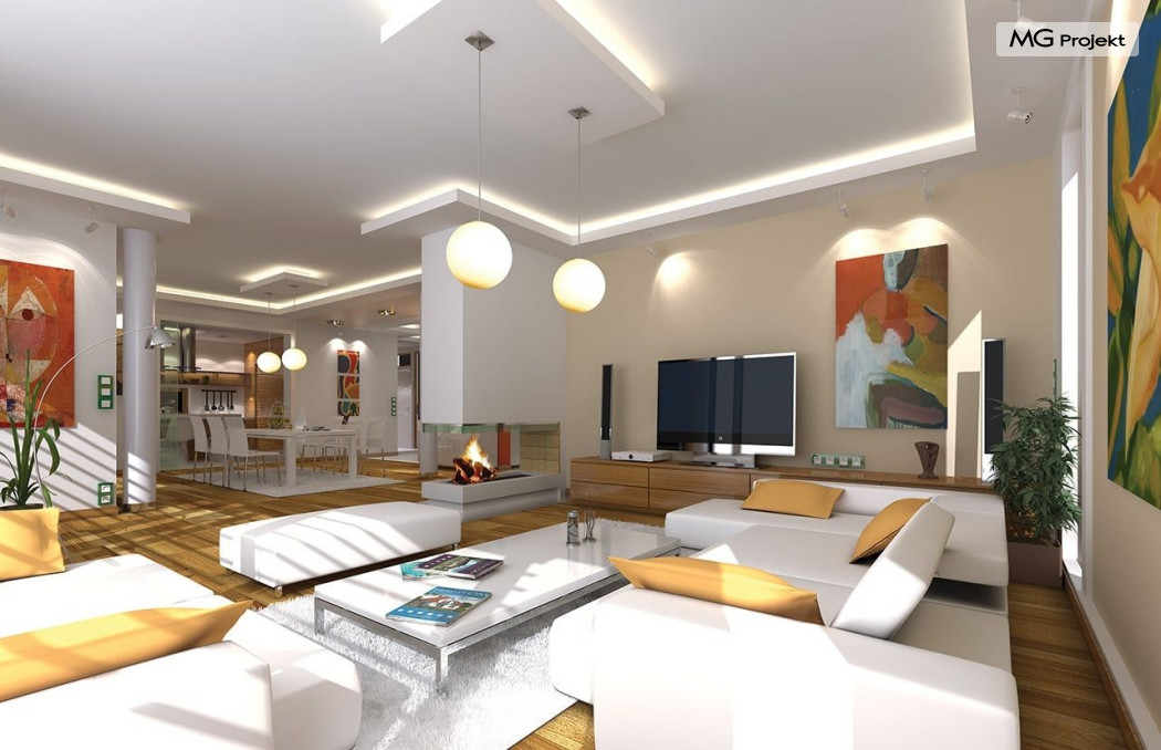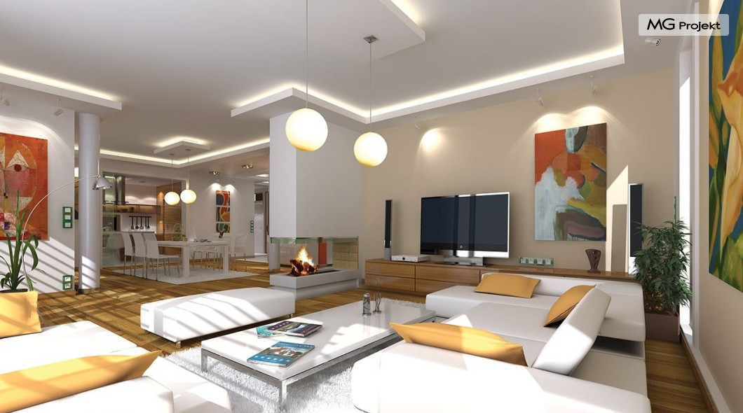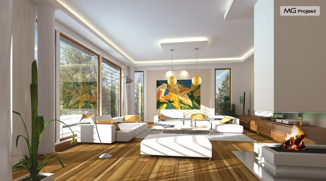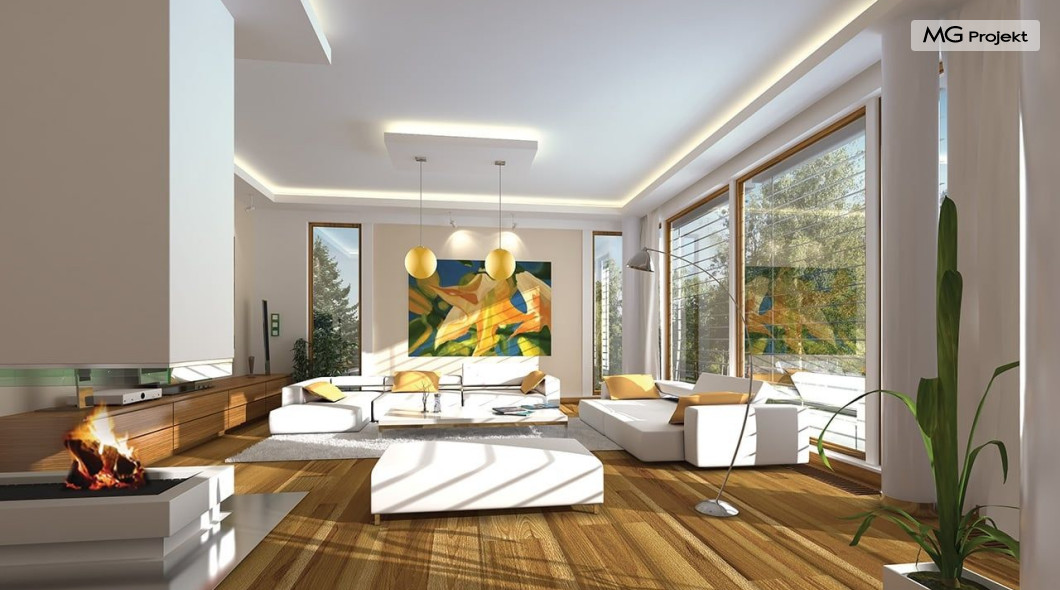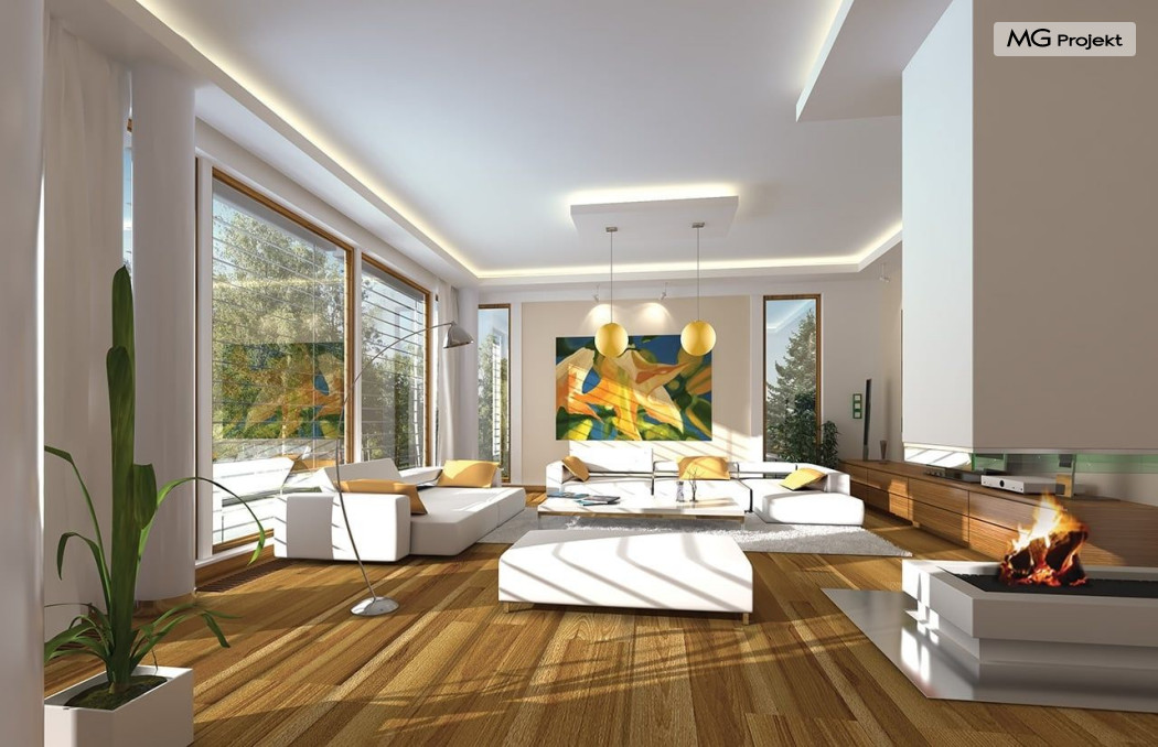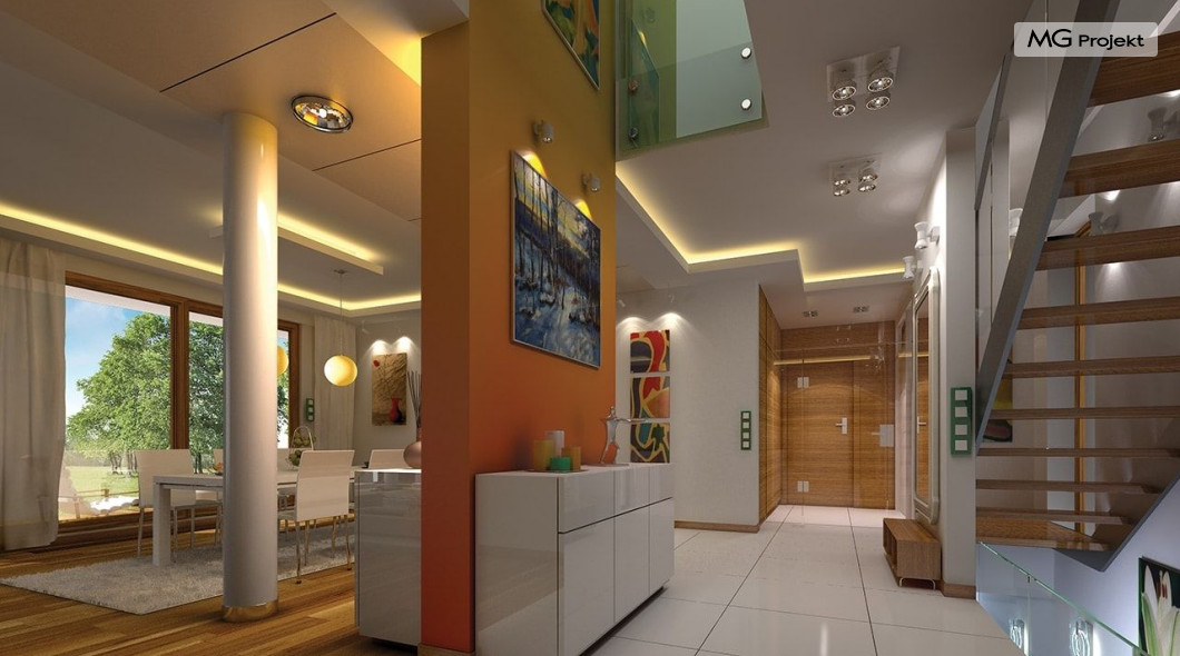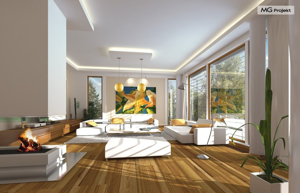 Projekt domu Willa Słoneczna to nowoczesna miejska willa. Dom przeznaczony jest dla cztero-sześcioosobowej rodziny. Nowoczesna piętrowa forma z płaskim dachem, została połączona z funkcjonalnym przemyślanym wnętrzem. Zasada kompozycji bryły budynku polega na maksymalnym otwarciu wnętrza domu na ogród, przy jednoczesnej minimalnej ekspozycji od strony frontowej. Elewacja frontowa, z niewielką ilością okien, z dużą białą powierzchnią ścian, jest przeciwieństwem otwartej, przeszklonej elewacji ogrodowej, urozmaiconej podcieniami i tarasami. Taki układ pozwala też na maksymalne wykorzystanie naturalnego nasłonecznienia i jednocześnie podwyższenie energooszczędności budynku. Wzajemnie przenikające się pełne białe ściany, z dużymi przeszklonymi powierzchniami, oraz drewnianymi okładzinami, wprowadzają ostre kontrasty w elewacjach domu. Siatka podciągów od strony ogrodu zamyka prostopadłościenną bryłę i jednocześnie stanowi naturalną osłonę przed nadmiernym nasłonecznieniem wnętrza. Od frontu - parterowy garaż z wjazdem z bocznego wewnętrznego dziedzińca łagodzi masywną piętrową sylwetkę domu. Wnętrze składa się z części dziennej na parterze, oraz sypialni na piętrze. Wariantowo w projekcie domu Willa Słoneczna zaplanowano częściowe podpiwniczenie z domowym spa i centrum rekreacji. Na parterze zaprojektowano jednoprzestrzenne, otwarte na ogród wnętrze połączonego salonu, jadalni, holu, oraz półotwartej kuchni. Dodatkowo mieści się tam pokój - np. gabinet, łazienka, oraz garaż i kotłownia. Pięknymi ażurowymi schodami kierujemy się z holu na piętro, gdzie zaplanowano apartament rodziców - z własną łazienką, garderobami i tarasem, sypialnie dziecięce z łazienką i dodatkowy zapasowy pokój. Oryginalne rozwiązania wnętrz, ciekawe detale, nowoczesna forma architektoniczna dadzą przyszłym użytkownikom niekłamaną przyjemność z posiadania takiego domu. Pracownia posiada projekt domu Willa Słoneczna w wersji z podpiwniczeniem lub bez piwnicy, oraz w odbiciu lustrzanym.