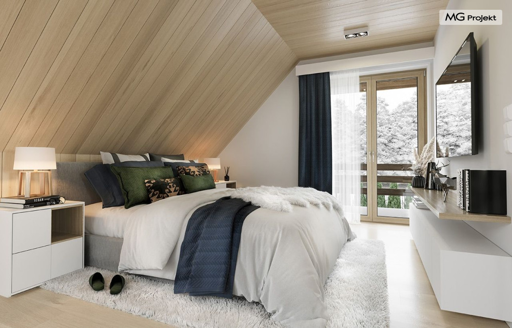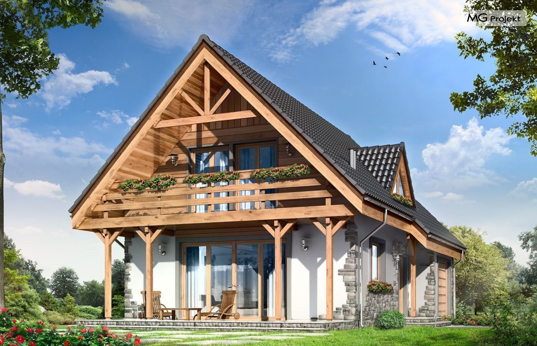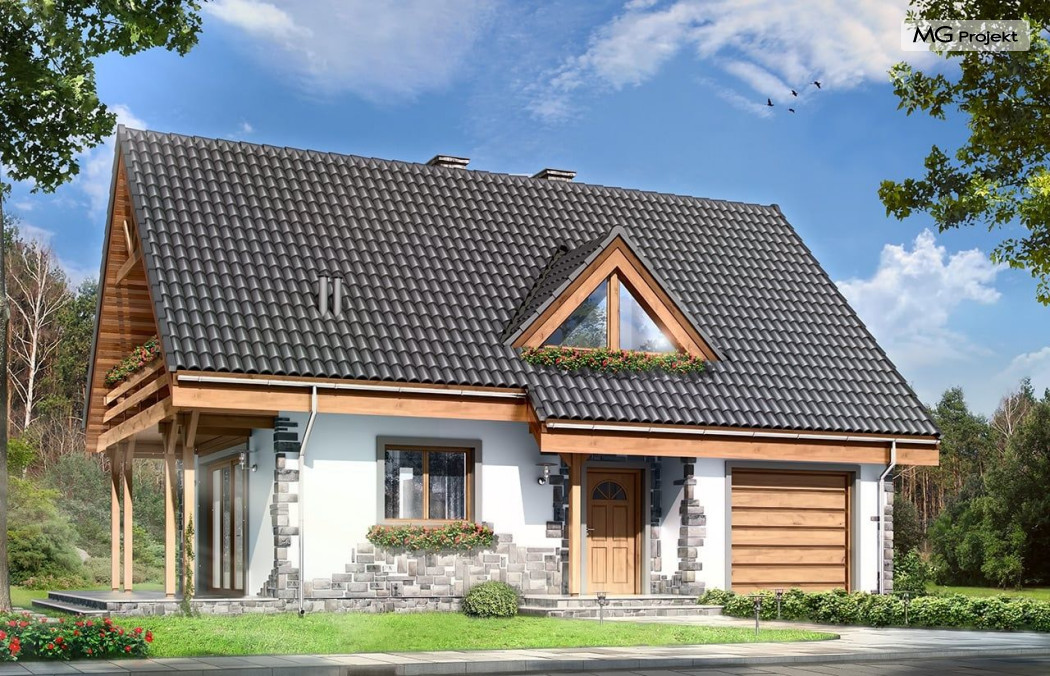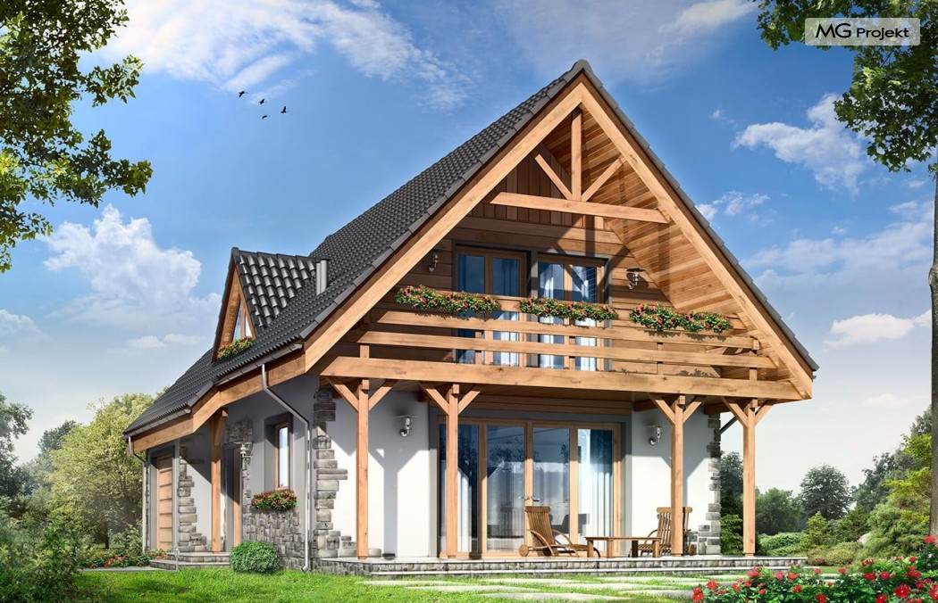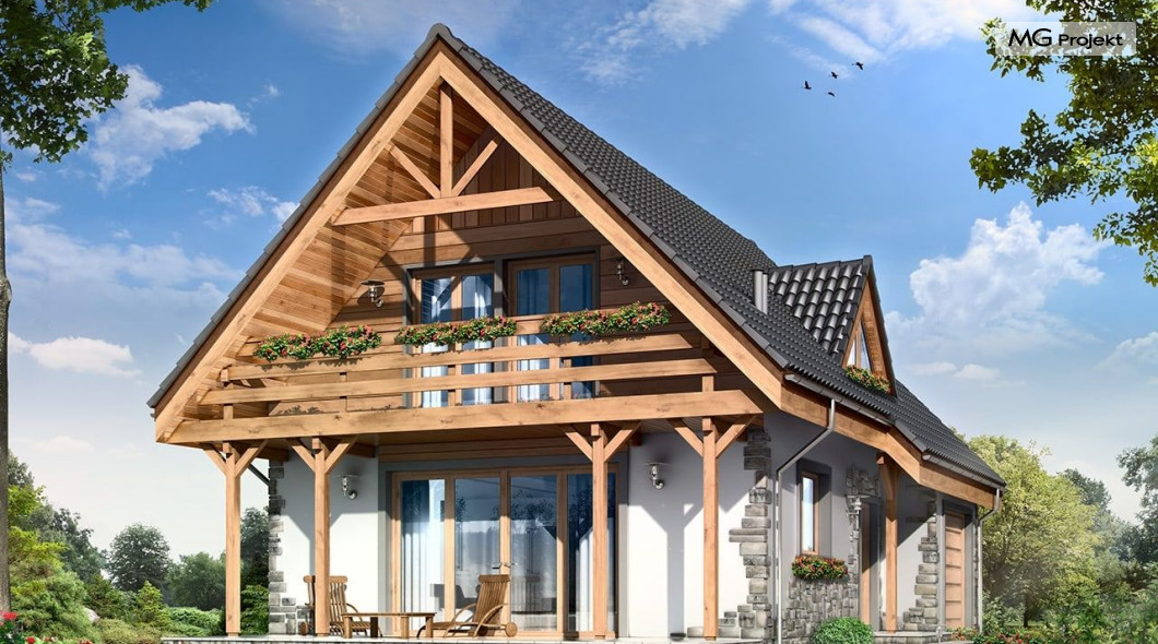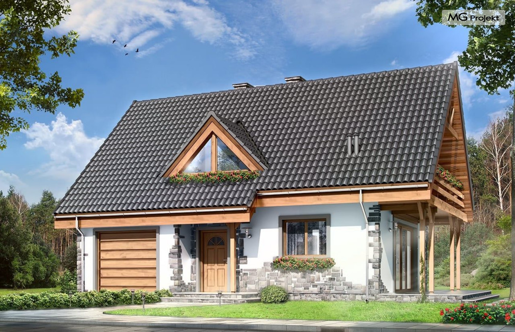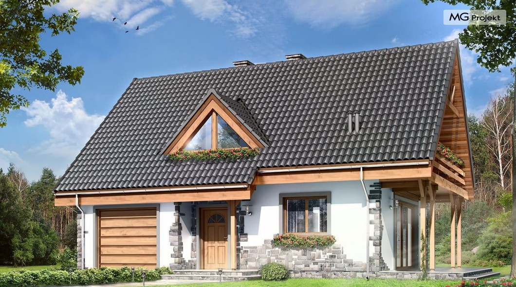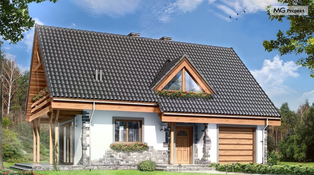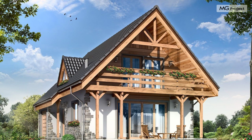 Projekt domu Wisełka to parterowy, jednorodzinny dom z poddaszem użytkowym, przekryty dwuspadowym, symetrycznym dachem. Projekt domu Wisełka zaprojektowano z myślą o cztero-pięcioosobowej rodzinie. Dom może służyć również jako letniskowy. Architektonicznie budynek nawiązuje do południowych rejonów Polski. Drewniane wykończenia szczytów domu Wisełka, słupy z zastrzałami, balkon, kamienne okładziny elewacji - wszystkie te elementy przywodzą na myśl podhalańskie wzory. Jednocześnie inspiracja jest na tyle delikatna, że domek nie będzie wyglądał dziwnie wybudowany na Mazurach, Śląsku, czy Mazowszu. Wnętrze domu Wisełka podzielono na część dzienną na parterze, oraz sypialnie na poddaszu. Na parterze zaprojektowano salon połączony z otwartą kuchnią i holem, oraz pięknym szerokim przeszklonym wyjściem na częściowo zadaszony taras i ogród. W centralnym miejscu umieszczono kominek i schody na górę. Dodatkowo na parterze przewidziano garaż i kotłownię. Na poddaszu znajdują się trzy sypialnie i łazienka. Pracownia posiada odbicie lustrzane projektu domu Wisełka, oraz wersję z dodatkowym pokojem zamiast garażu. Zapraszamy!