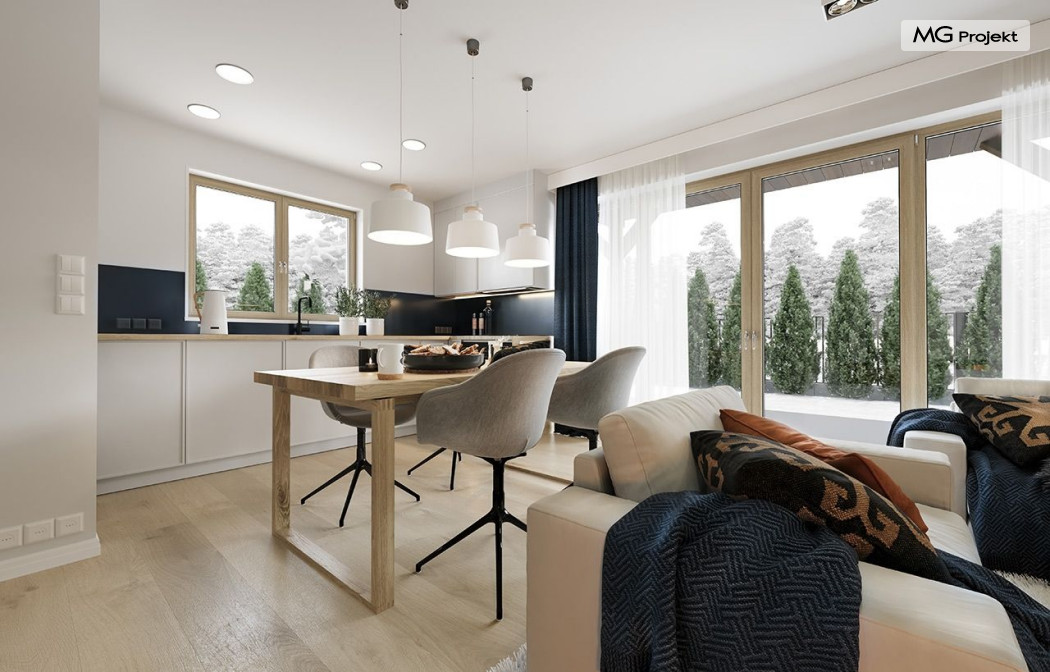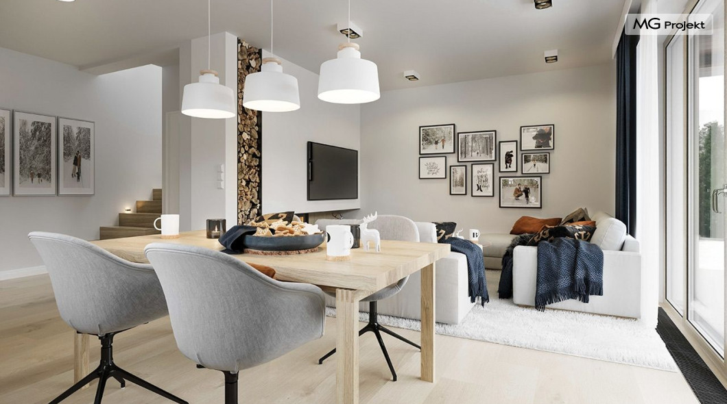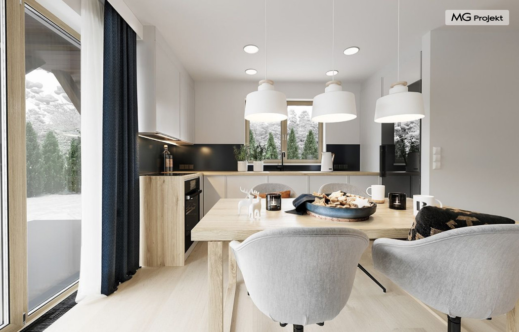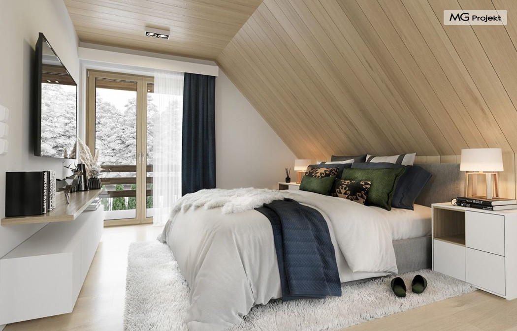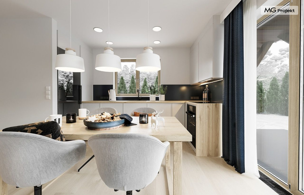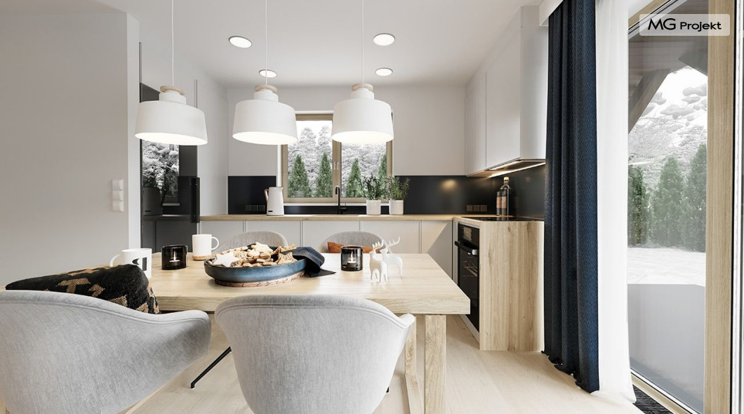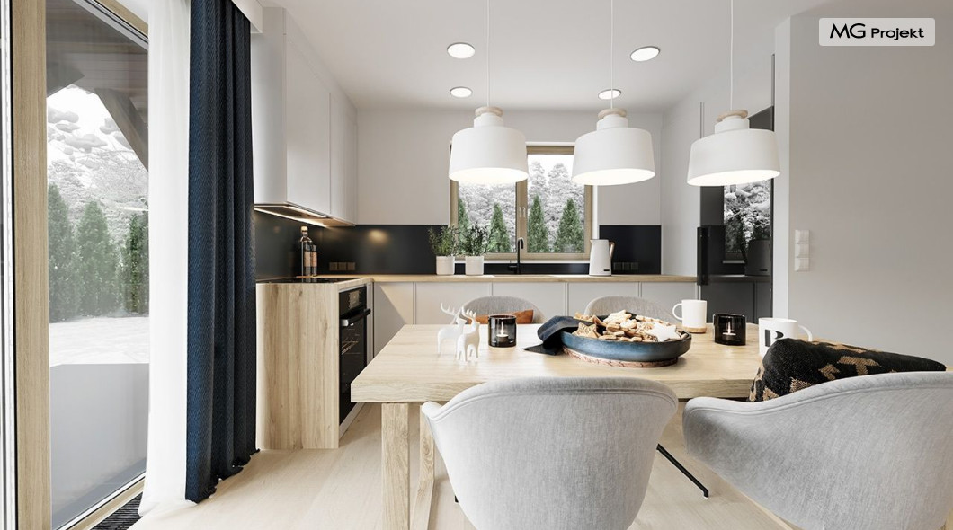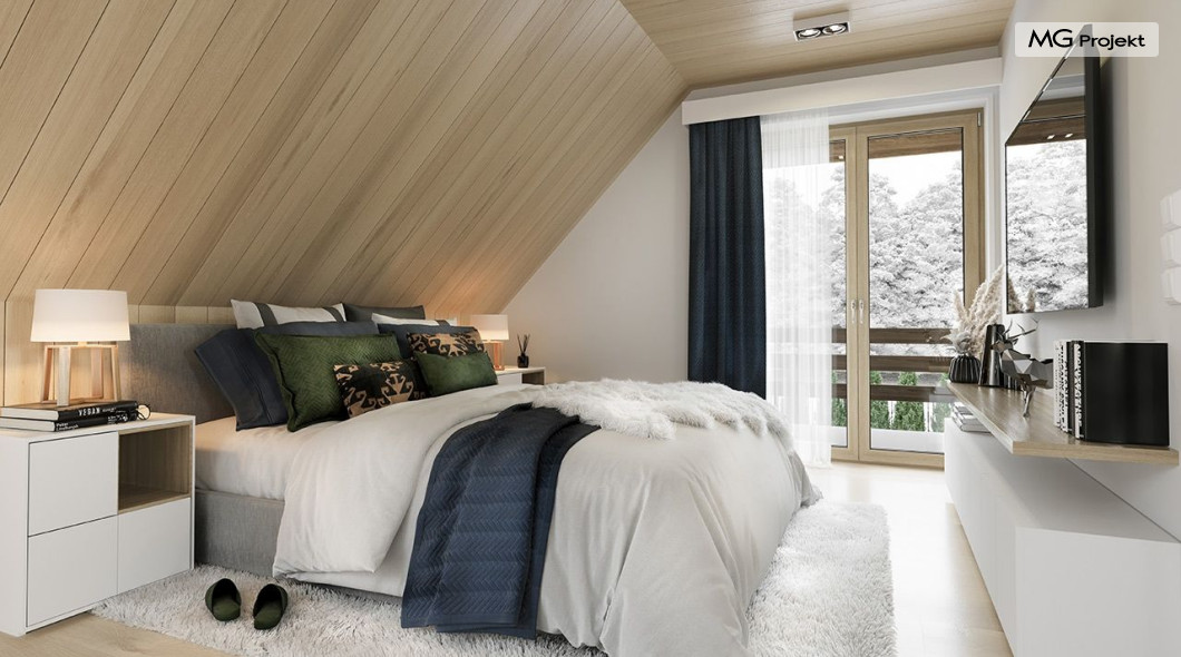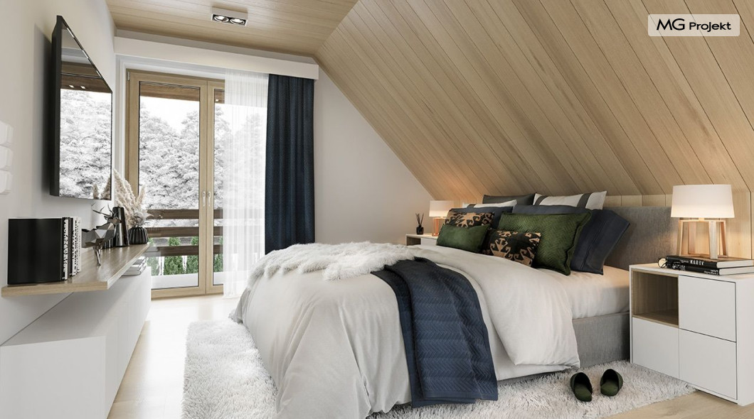 Projekt domu Wisełka to parterowy, jednorodzinny dom z poddaszem użytkowym, przekryty dwuspadowym, symetrycznym dachem. Projekt domu Wisełka zaprojektowano z myślą o cztero-pięcioosobowej rodzinie. Dom może służyć również jako letniskowy. Architektonicznie budynek nawiązuje do południowych rejonów Polski. Drewniane wykończenia szczytów domu Wisełka, słupy z zastrzałami, balkon, kamienne okładziny elewacji - wszystkie te elementy przywodzą na myśl podhalańskie wzory. Jednocześnie inspiracja jest na tyle delikatna, że domek nie będzie wyglądał dziwnie wybudowany na Mazurach, Śląsku, czy Mazowszu. Wnętrze domu Wisełka podzielono na część dzienną na parterze, oraz sypialnie na poddaszu. Na parterze zaprojektowano salon połączony z otwartą kuchnią i holem, oraz pięknym szerokim przeszklonym wyjściem na częściowo zadaszony taras i ogród. W centralnym miejscu umieszczono kominek i schody na górę. Dodatkowo na parterze przewidziano garaż i kotłownię. Na poddaszu znajdują się trzy sypialnie i łazienka. Pracownia posiada odbicie lustrzane projektu domu Wisełka, oraz wersję z dodatkowym pokojem zamiast garażu. Zapraszamy!
