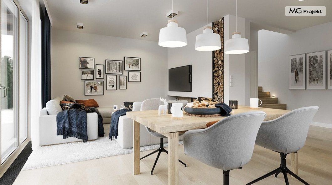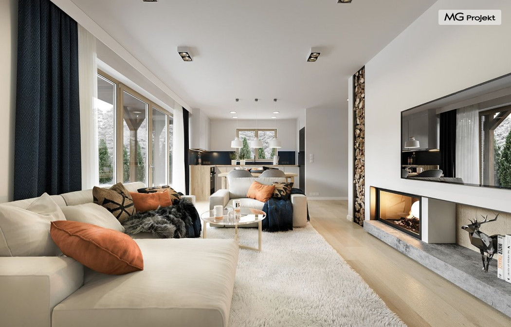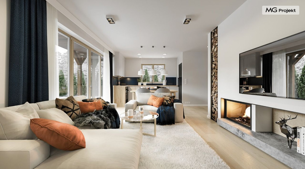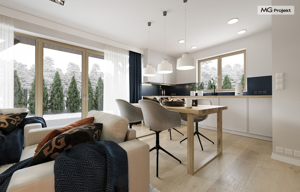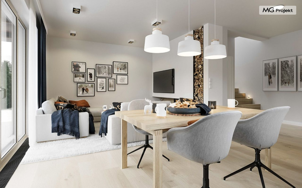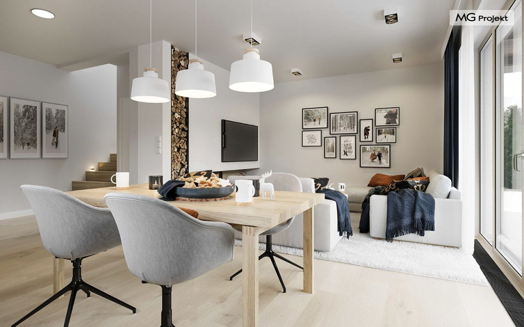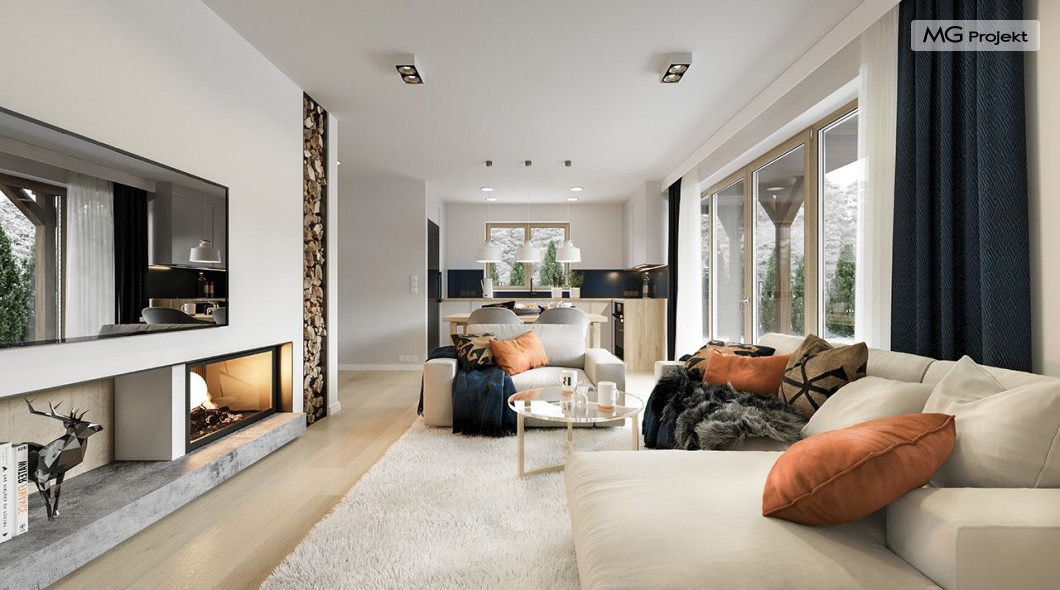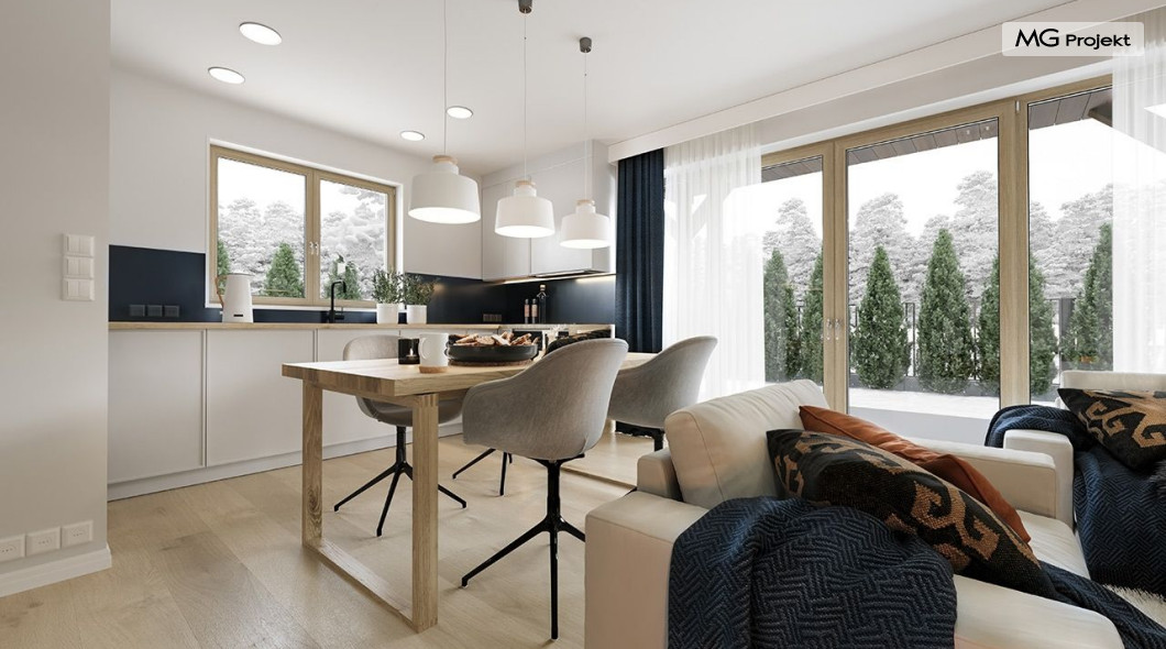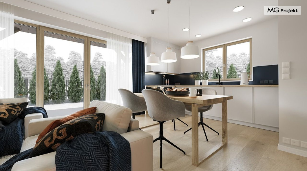 Projekt domu Wisełka to parterowy, jednorodzinny dom z poddaszem użytkowym, przekryty dwuspadowym, symetrycznym dachem. Projekt domu Wisełka zaprojektowano z myślą o cztero-pięcioosobowej rodzinie. Dom może służyć również jako letniskowy. Architektonicznie budynek nawiązuje do południowych rejonów Polski. Drewniane wykończenia szczytów domu Wisełka, słupy z zastrzałami, balkon, kamienne okładziny elewacji - wszystkie te elementy przywodzą na myśl podhalańskie wzory. Jednocześnie inspiracja jest na tyle delikatna, że domek nie będzie wyglądał dziwnie wybudowany na Mazurach, Śląsku, czy Mazowszu. Wnętrze domu Wisełka podzielono na część dzienną na parterze, oraz sypialnie na poddaszu. Na parterze zaprojektowano salon połączony z otwartą kuchnią i holem, oraz pięknym szerokim przeszklonym wyjściem na częściowo zadaszony taras i ogród. W centralnym miejscu umieszczono kominek i schody na górę. Dodatkowo na parterze przewidziano garaż i kotłownię. Na poddaszu znajdują się trzy sypialnie i łazienka. Pracownia posiada odbicie lustrzane projektu domu Wisełka, oraz wersję z dodatkowym pokojem zamiast garażu. Zapraszamy!