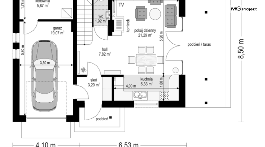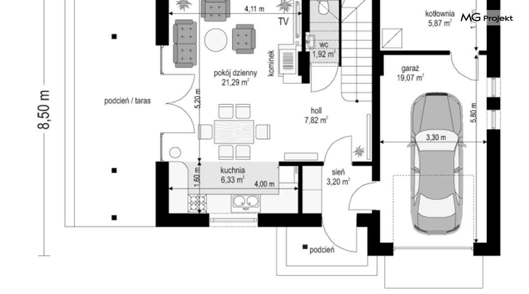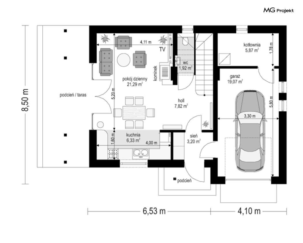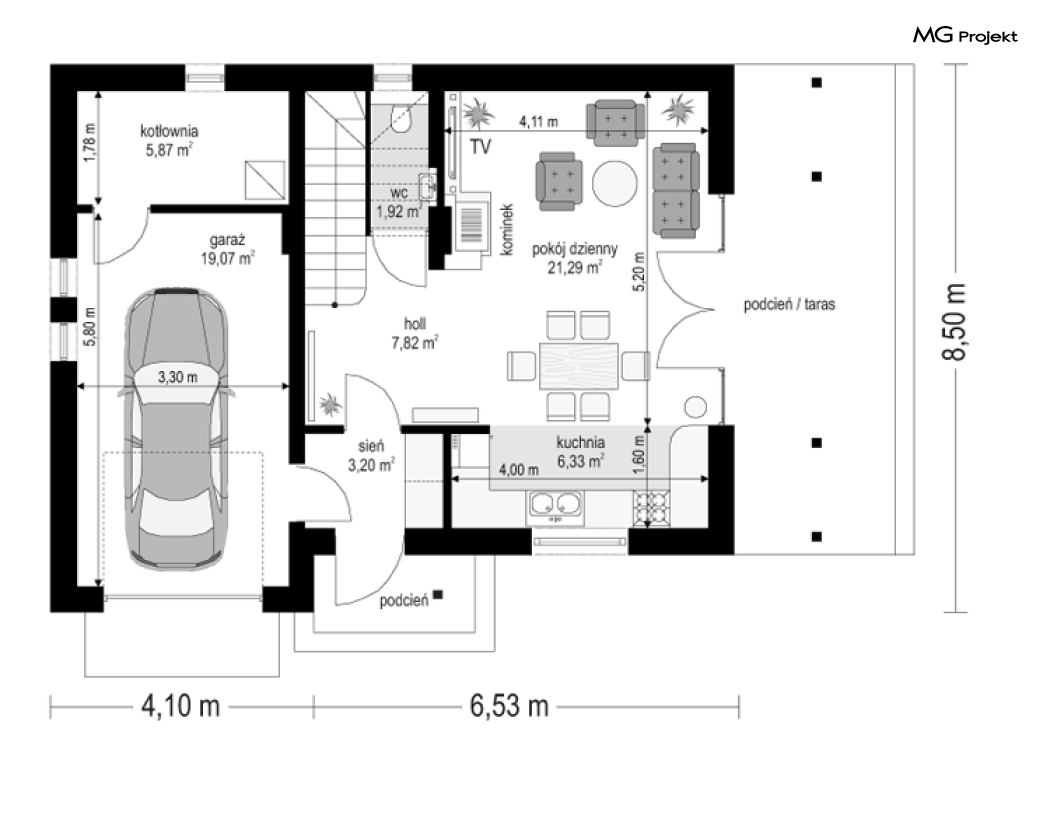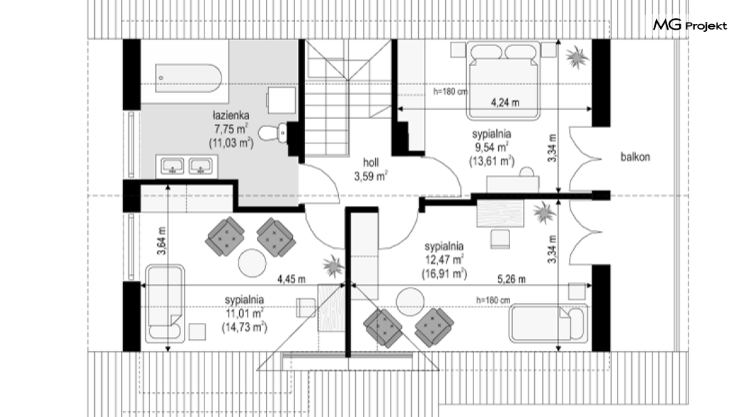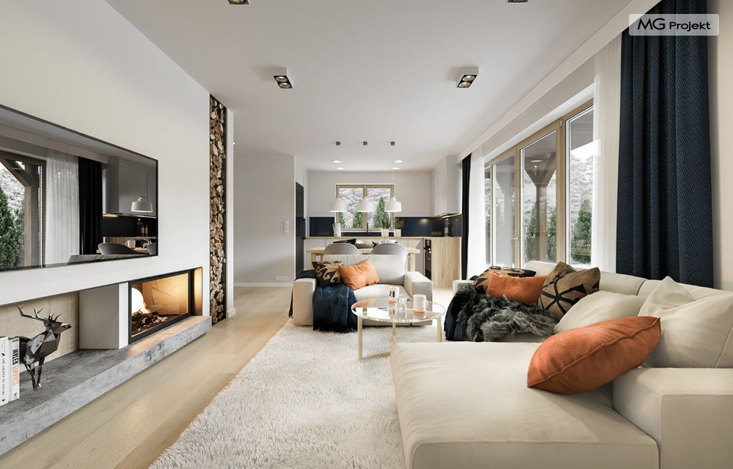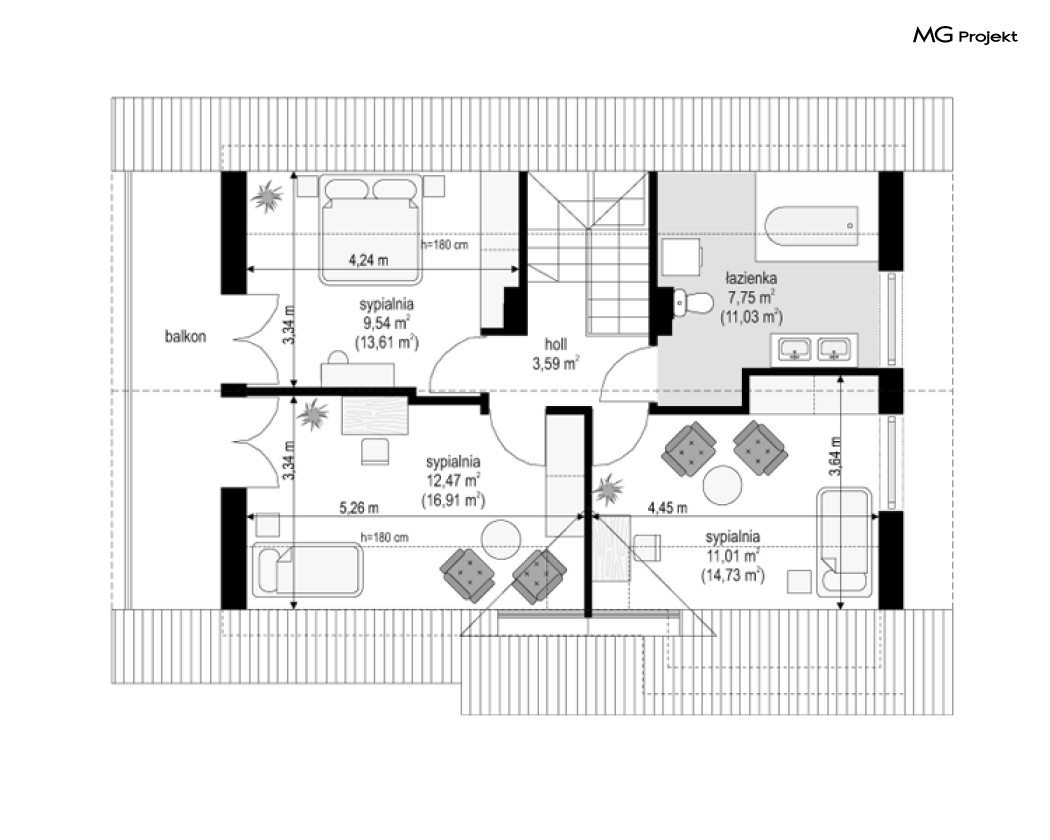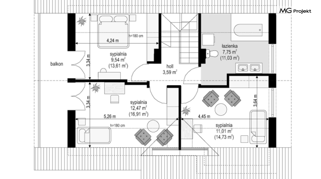 Projekt domu Wisełka to parterowy, jednorodzinny dom z poddaszem użytkowym, przekryty dwuspadowym, symetrycznym dachem. Projekt domu Wisełka zaprojektowano z myślą o cztero-pięcioosobowej rodzinie. Dom może służyć również jako letniskowy. Architektonicznie budynek nawiązuje do południowych rejonów Polski. Drewniane wykończenia szczytów domu Wisełka, słupy z zastrzałami, balkon, kamienne okładziny elewacji - wszystkie te elementy przywodzą na myśl podhalańskie wzory. Jednocześnie inspiracja jest na tyle delikatna, że domek nie będzie wyglądał dziwnie wybudowany na Mazurach, Śląsku, czy Mazowszu. Wnętrze domu Wisełka podzielono na część dzienną na parterze, oraz sypialnie na poddaszu. Na parterze zaprojektowano salon połączony z otwartą kuchnią i holem, oraz pięknym szerokim przeszklonym wyjściem na częściowo zadaszony taras i ogród. W centralnym miejscu umieszczono kominek i schody na górę. Dodatkowo na parterze przewidziano garaż i kotłownię. Na poddaszu znajdują się trzy sypialnie i łazienka. Pracownia posiada odbicie lustrzane projektu domu Wisełka, oraz wersję z dodatkowym pokojem zamiast garażu. Zapraszamy!
