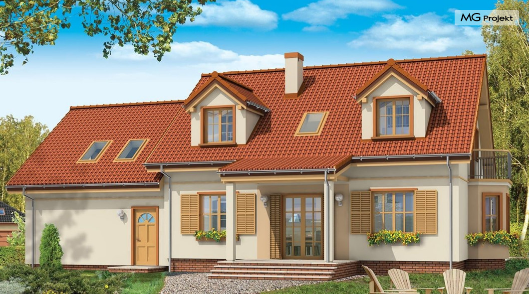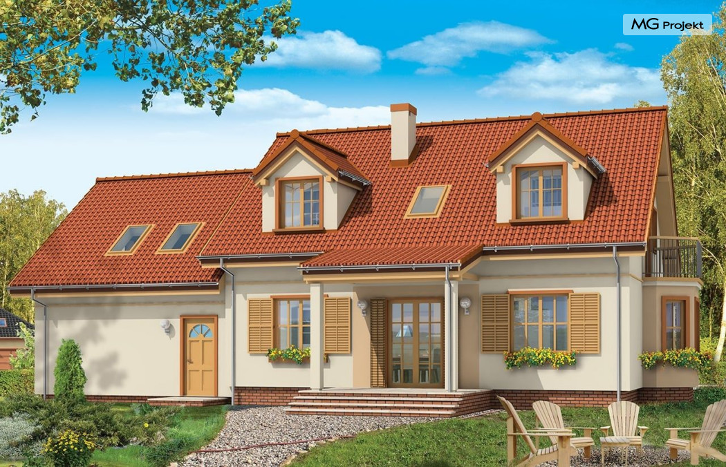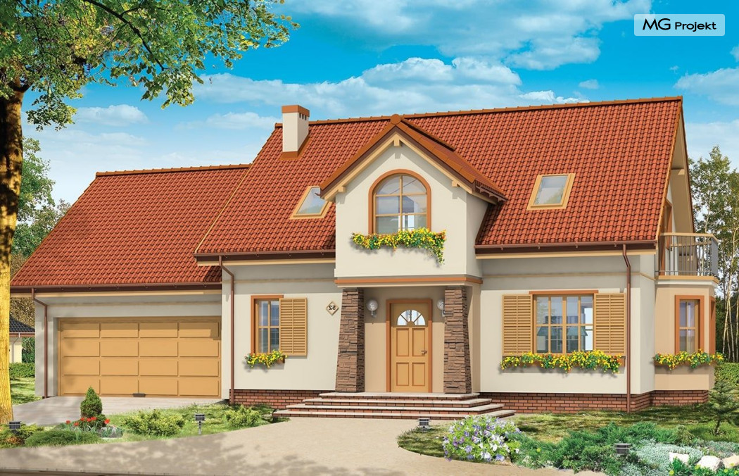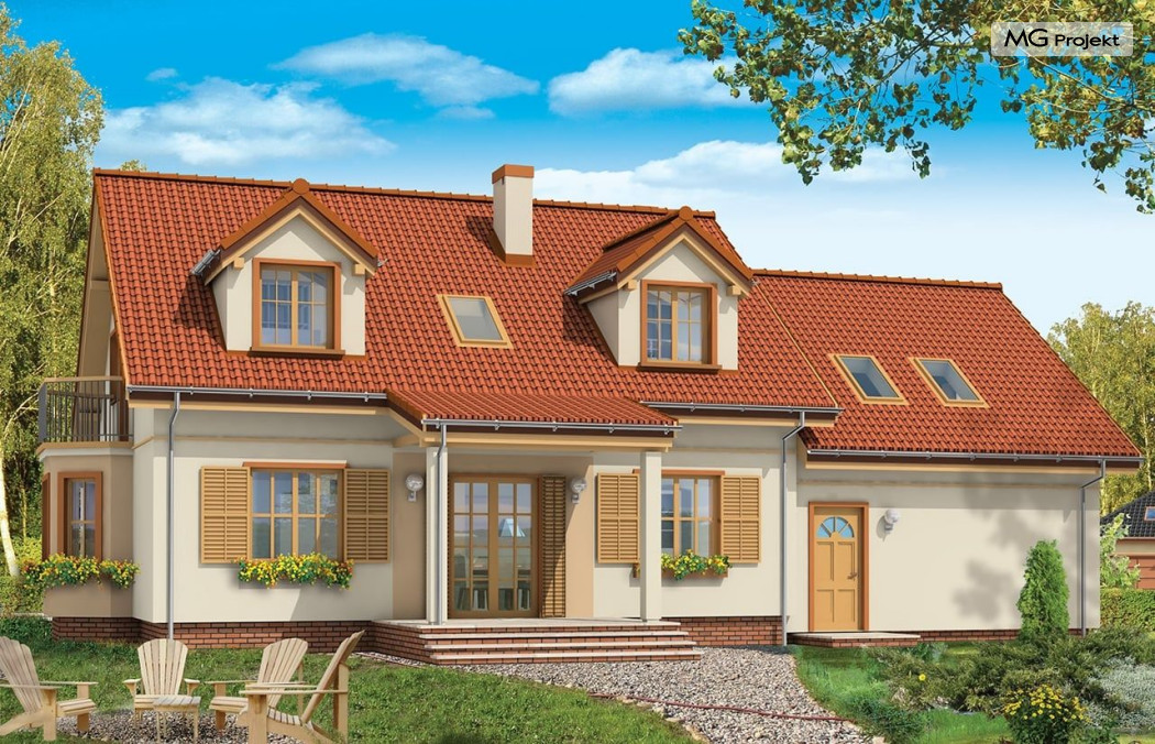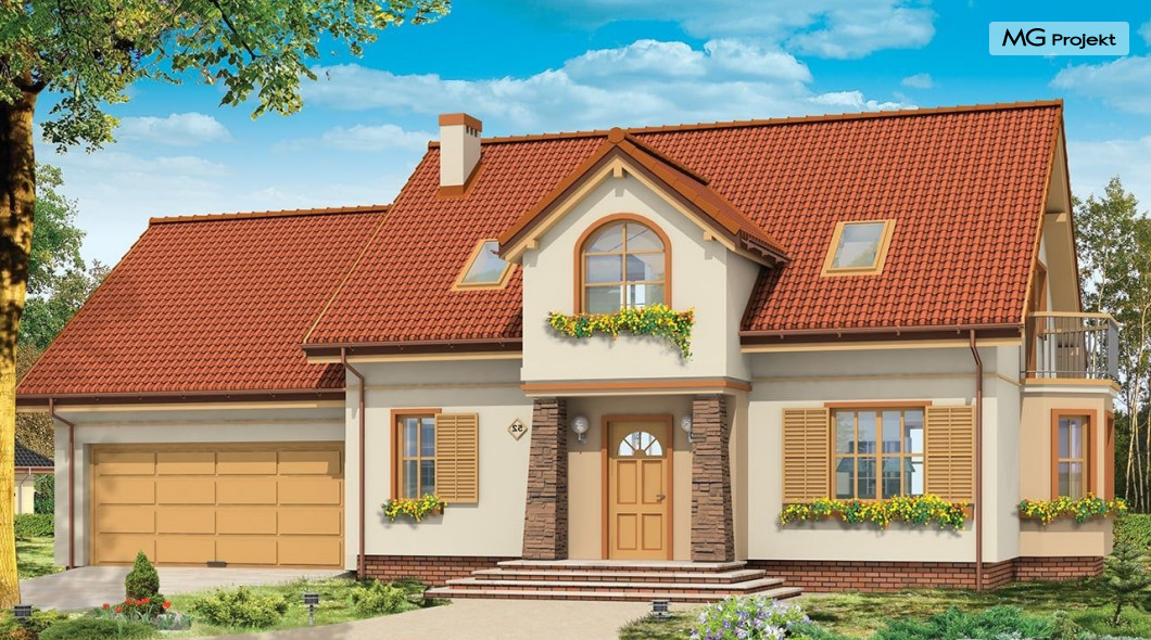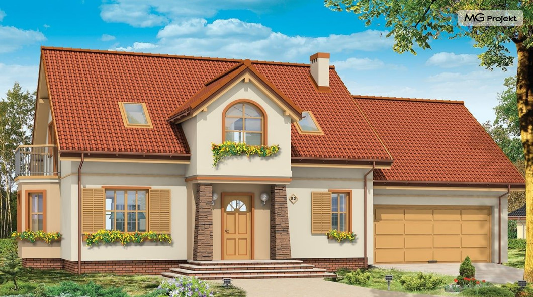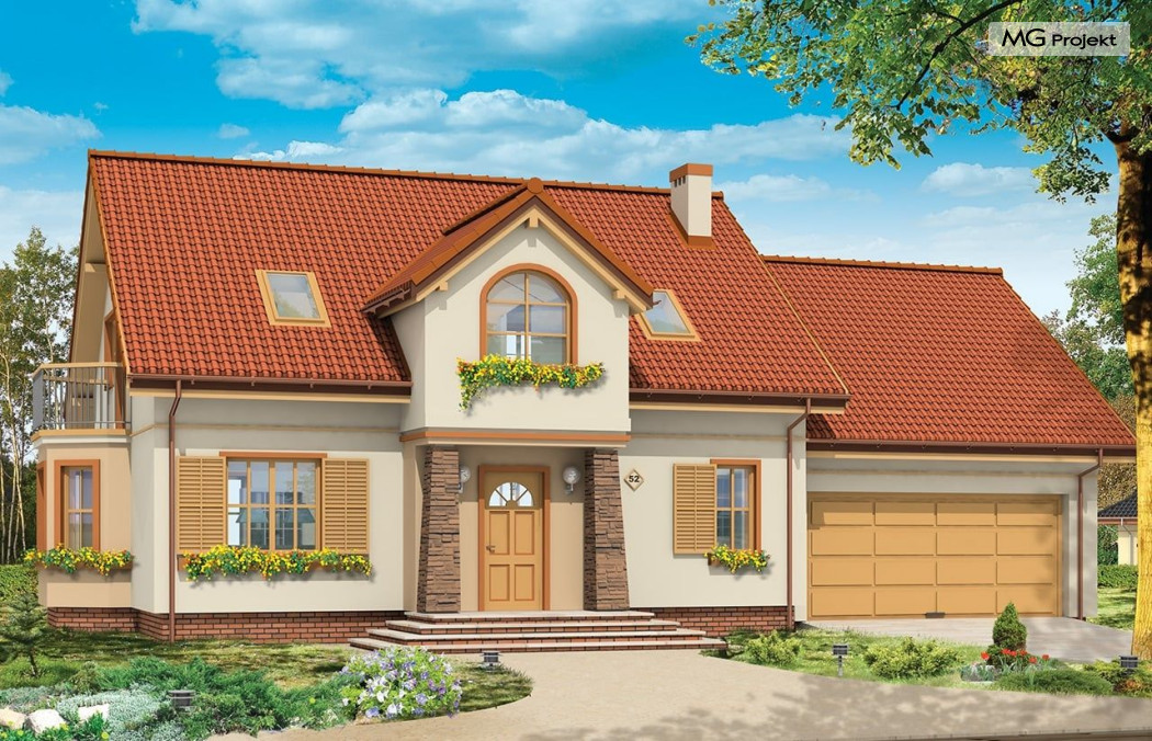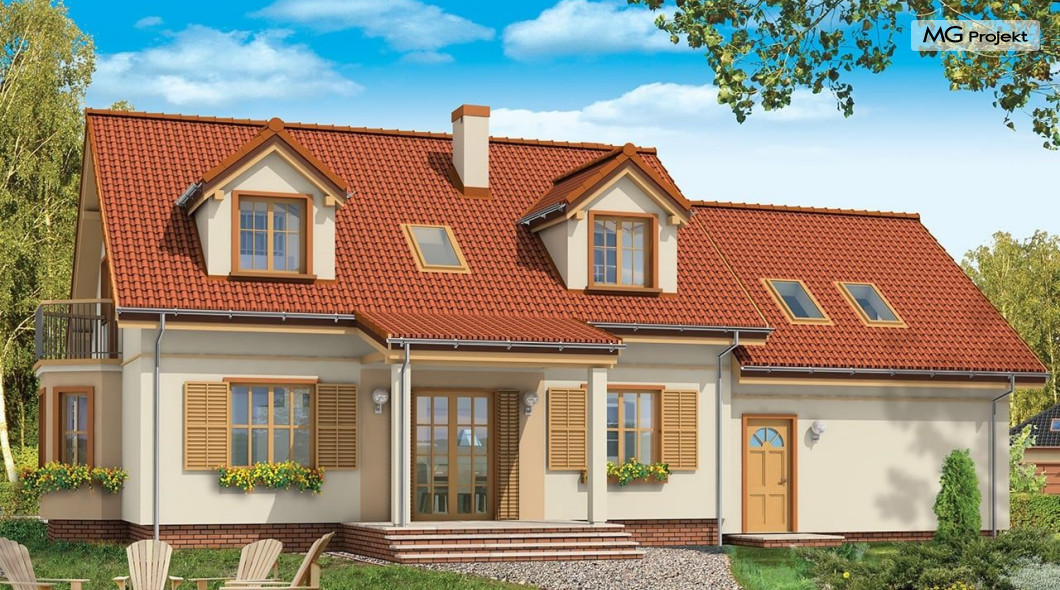 Projekt domu Zgrabny 5 to kolejna odsłona jednego z najpopularniejszych projektów pracowni MG Projekt, domu Zgrabny. Projekt ten posiada dwustanowiskowy garaż i rozbudowaną część mieszkalną. Na parterze zaprojektowano salon z aneksem jadalnym i kuchnią, oraz dodatkowy pokój - sypialnia lub gabinet. Na poddaszu znajdują się trzy przestronne sypialnie z łazienką, oraz duże pomieszczenie uniwersalne nad garażami. W projekcie Zgrabny 5, dzięki podniesieniu ścian kolankowych poddasza pokoje są większe. Lukarny umożliwiły umieszczenie okien w każdym z pokoi. Dom stanowi rozsądną propozycję dla rodziny 4-6 osobowej. Można również zamieszkać w tym domu z dziadkami. Duży garaż wraz z pomieszczeniem gospodarczym to dodatkowy atut projektu. Projekt domu Zgrabny 5 można również zamówić w wersji odbicia lustrzanego oraz inne jego wersje: projekt domu Zgrabny, projekt domu Zgrabny 2, projekt domu Zgrabny 3, projekt domu Zgrabny 4, projekt domu Zgrabny z lukarnami, projekt domu Zgrabny z przedsionkiem. Zapraszamy!