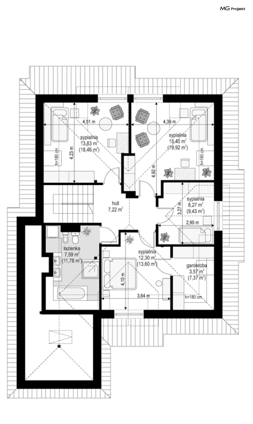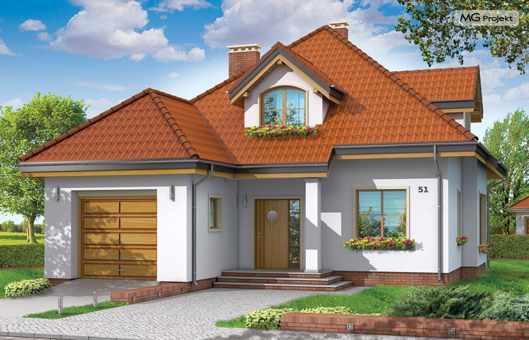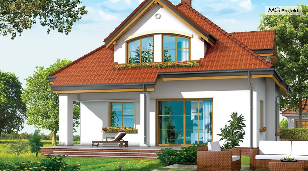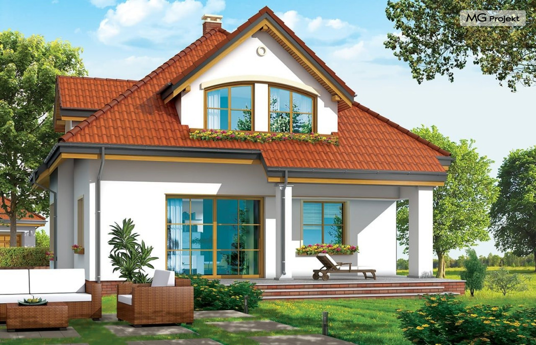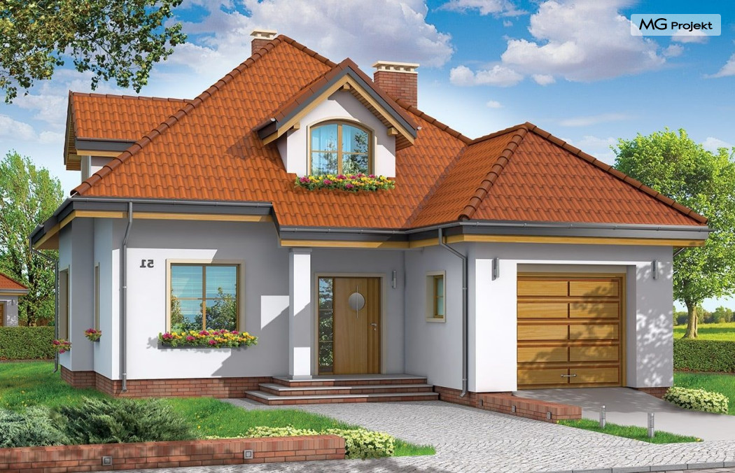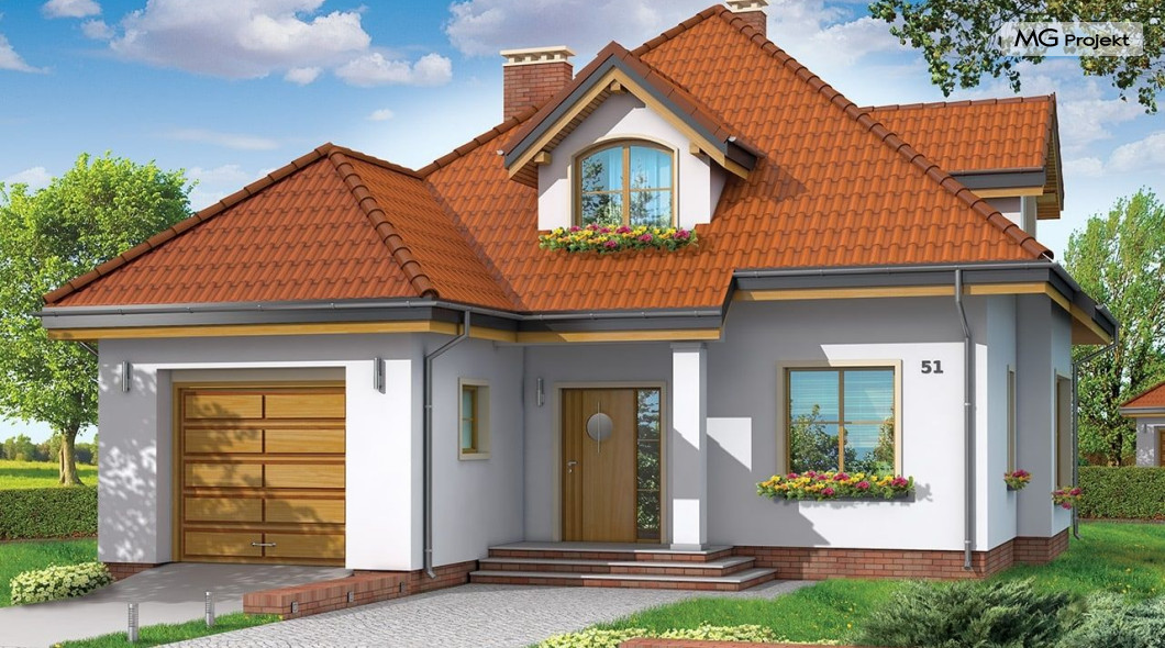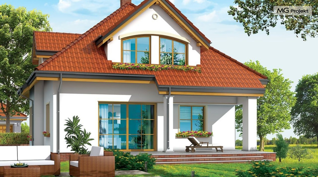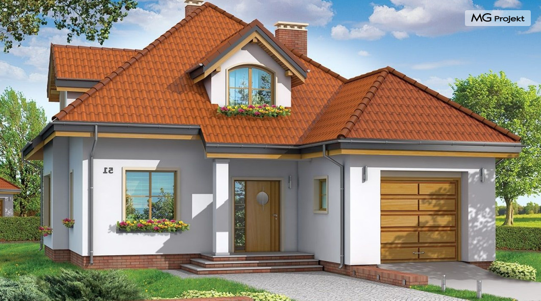 Projekt domu Zuzia, to bardzo praktyczny a zarazem uroczy dom jednorodzinny. W sam raz dla cztero-pięcioosobowej rodziny planującej budowę. Budynek jest parterowy, z poddaszem użytkowym, przekryty czterospadowym dachem, z częściowo wbudowanym w bryłę garażem. Bryła ozdobiona jest dużymi lukarnami poddasza, wejściem z zadaszeniem i kolumną, wykuszem jadalni i podcieniem ogrodowym. Tradycyjna forma polskiego domu została podana w nowoczesnym, świeżym ujęciu. Zastosowane w Zuzi materiały, czy duże przeszklenia otwierające wnętrze na ogród, funkcjonalny układ wnętrz domu - całość podkreśla współczesność rozwiązań. Wnętrze parteru zostało zaprojektowane jako otwarta, jednoprzestrzenna część dzienna, z salonem, holem, aneksem jadalnym, oraz częściowo otwartą kuchnią. Dodatkowo na parterze przewidziano pokój mogący służyć jako gabinet, lub sypialnia, oraz garaż i kotłownię. Na poddaszu umieszczono trzy wygodne sypialnie z garderobami lub szafami wbudowanymi, łazienkę i dodatkowy pokój. W średniej wielkości domu, dzięki funkcjonalnemu układowi wnętrz udało się zmieścić wiele pomieszczeń, tak że dom sprawia wrażenie większego niż jest w rzeczywistości. Pracownia posiada również projekt domu Zuzia w wersji odbicia lustrzanego.