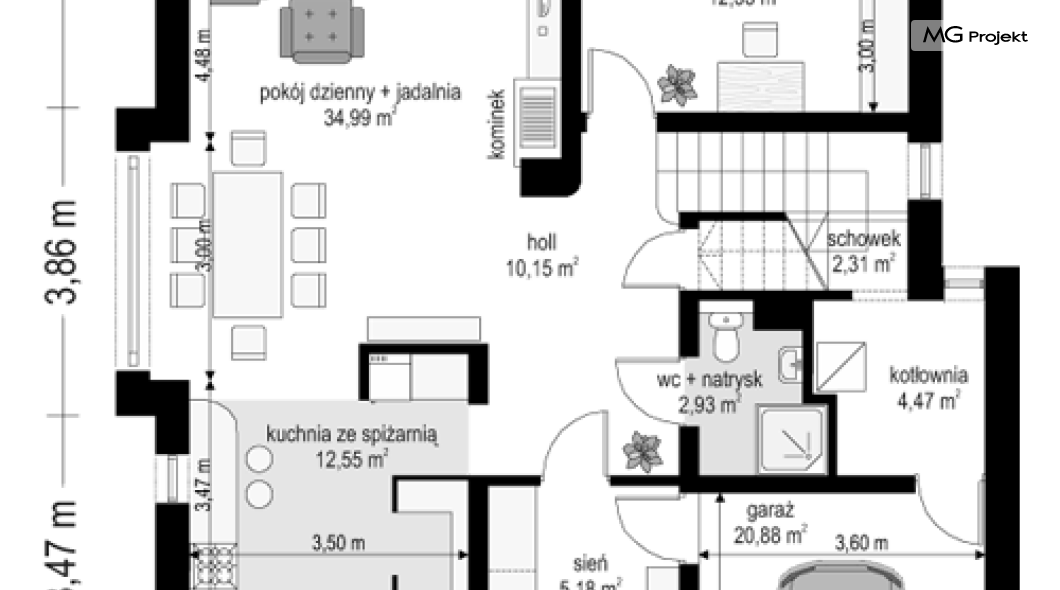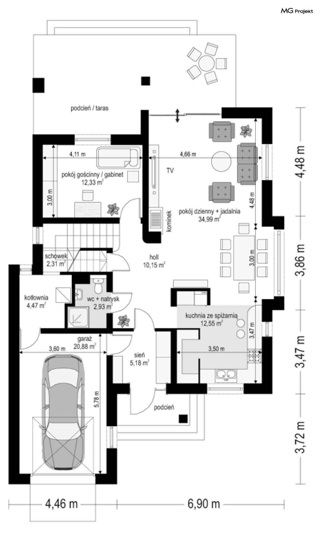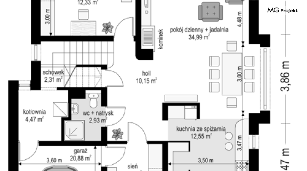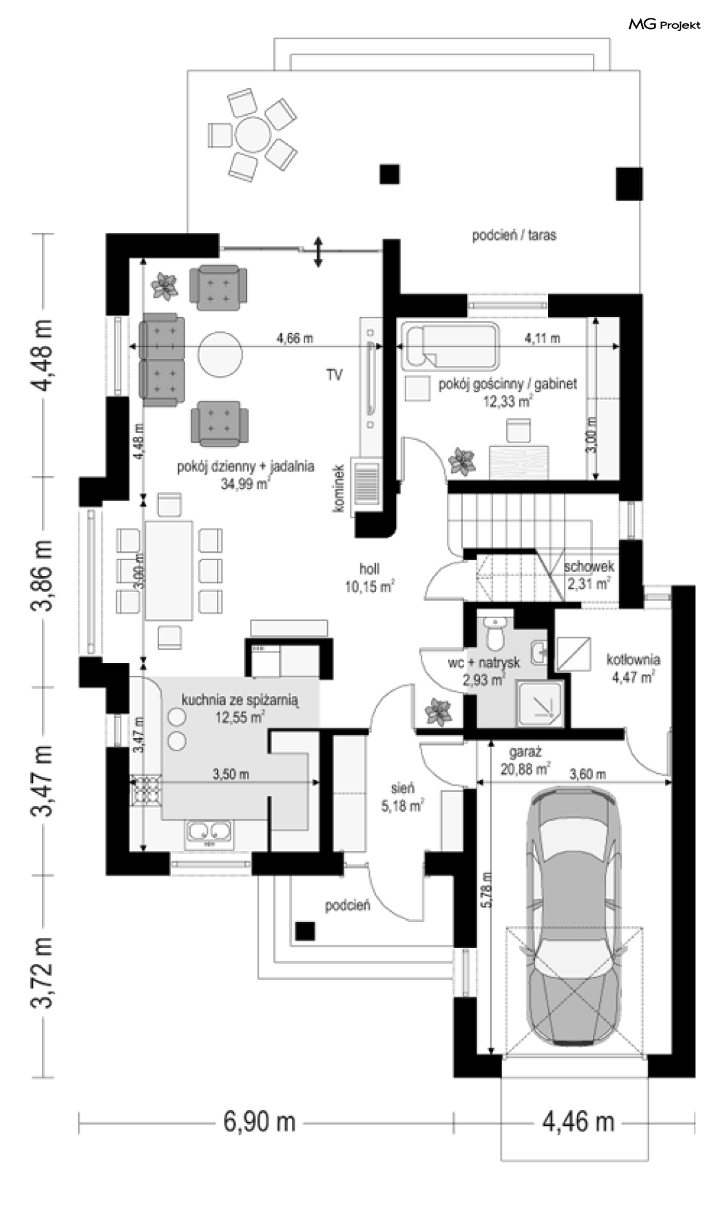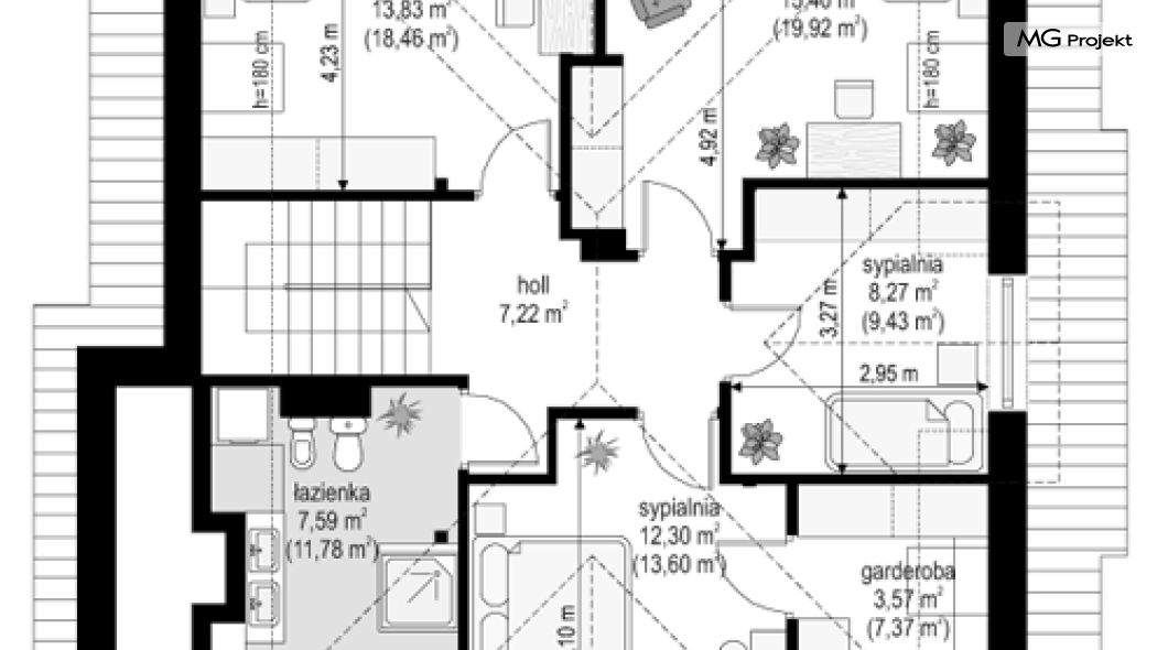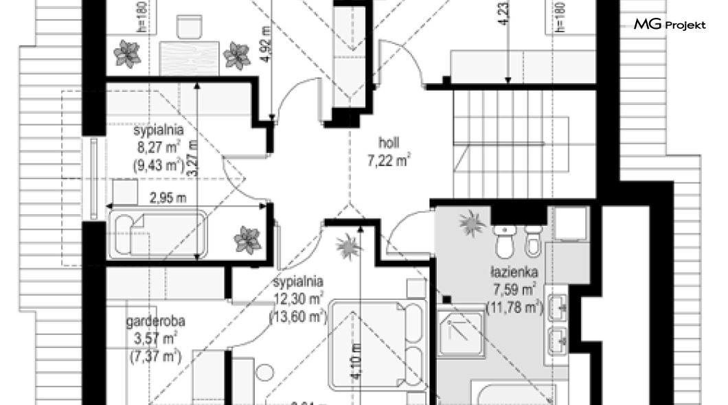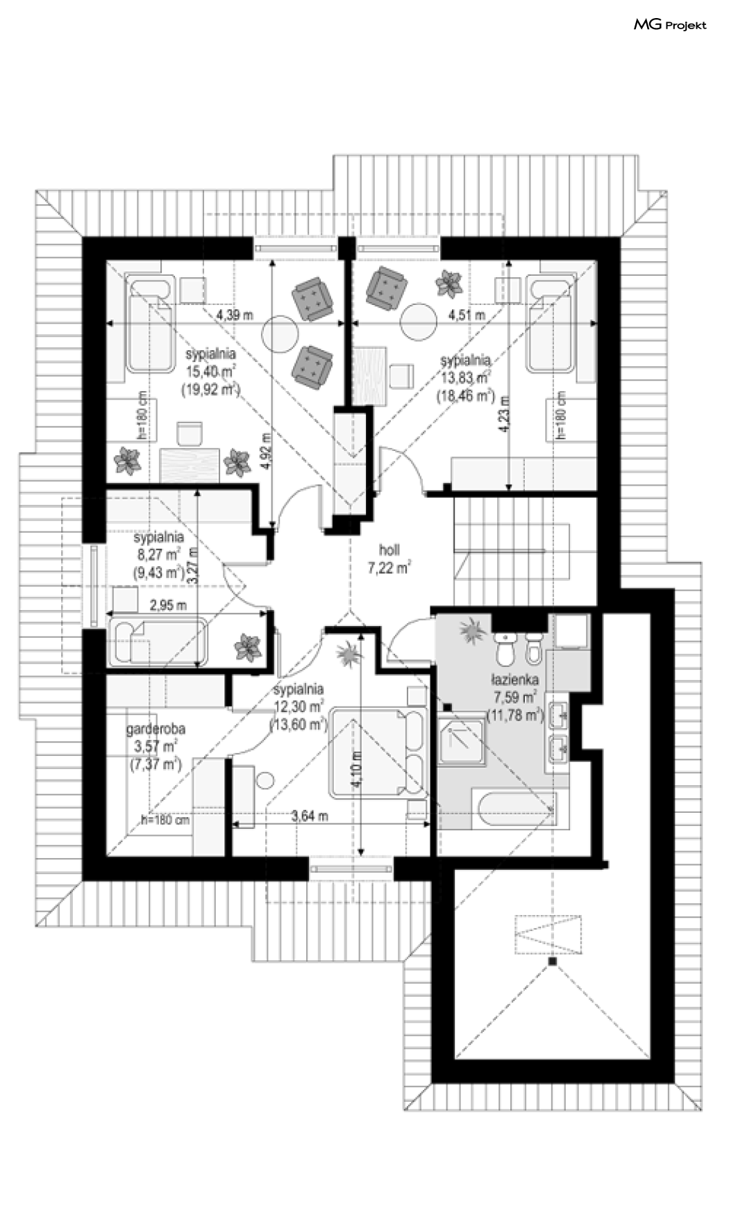 Projekt domu Zuzia, to bardzo praktyczny a zarazem uroczy dom jednorodzinny. W sam raz dla cztero-pięcioosobowej rodziny planującej budowę. Budynek jest parterowy, z poddaszem użytkowym, przekryty czterospadowym dachem, z częściowo wbudowanym w bryłę garażem. Bryła ozdobiona jest dużymi lukarnami poddasza, wejściem z zadaszeniem i kolumną, wykuszem jadalni i podcieniem ogrodowym. Tradycyjna forma polskiego domu została podana w nowoczesnym, świeżym ujęciu. Zastosowane w Zuzi materiały, czy duże przeszklenia otwierające wnętrze na ogród, funkcjonalny układ wnętrz domu - całość podkreśla współczesność rozwiązań. Wnętrze parteru zostało zaprojektowane jako otwarta, jednoprzestrzenna część dzienna, z salonem, holem, aneksem jadalnym, oraz częściowo otwartą kuchnią. Dodatkowo na parterze przewidziano pokój mogący służyć jako gabinet, lub sypialnia, oraz garaż i kotłownię. Na poddaszu umieszczono trzy wygodne sypialnie z garderobami lub szafami wbudowanymi, łazienkę i dodatkowy pokój. W średniej wielkości domu, dzięki funkcjonalnemu układowi wnętrz udało się zmieścić wiele pomieszczeń, tak że dom sprawia wrażenie większego niż jest w rzeczywistości. Pracownia posiada również projekt domu Zuzia w wersji odbicia lustrzanego.