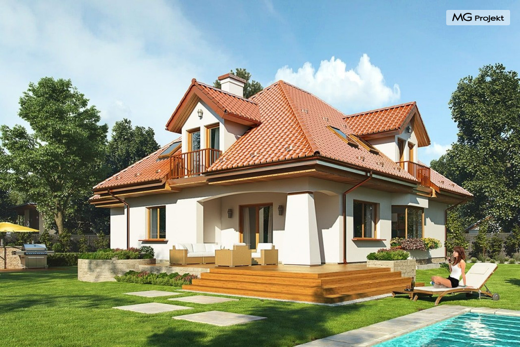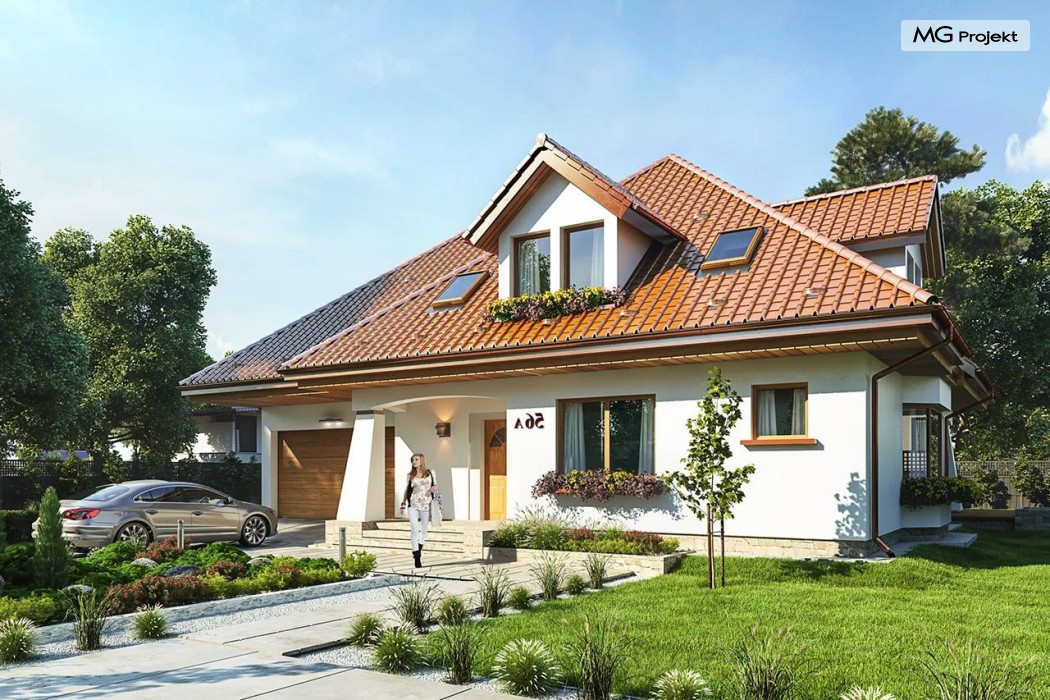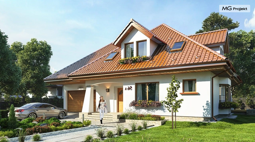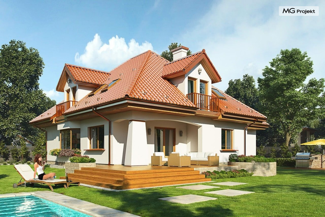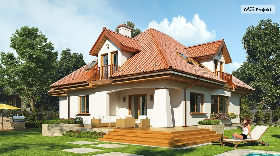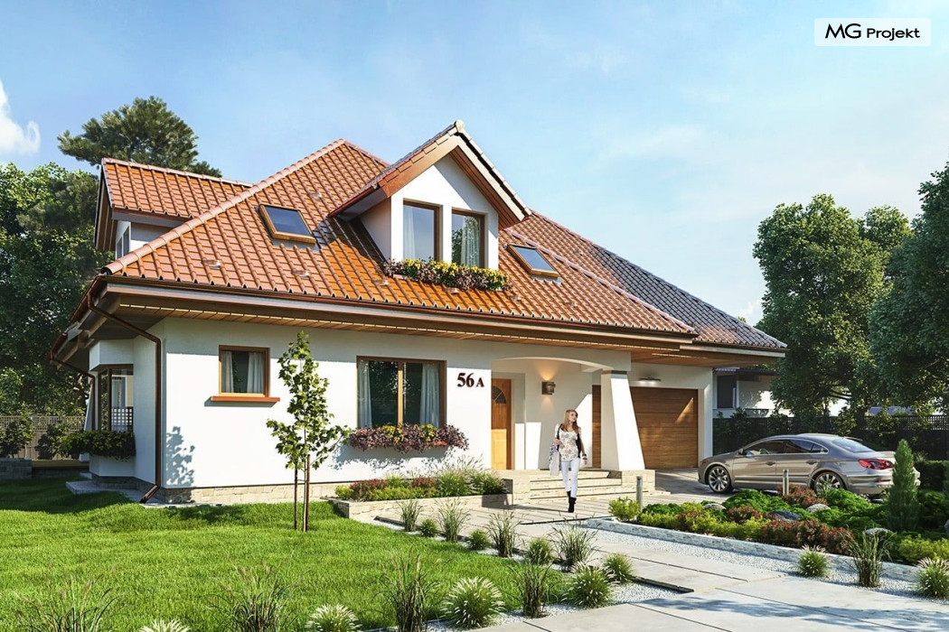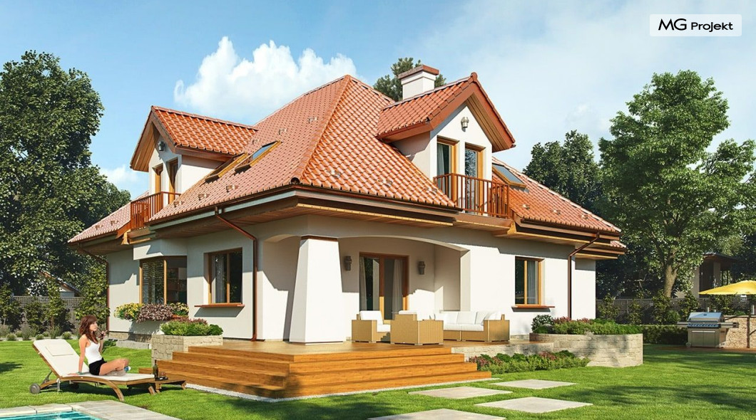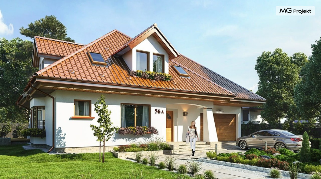Projekt domu Agnieszka 3 jest nową wersją projektu - Agnieszka. Projekt domu parterowego z poddaszem użytkowym, dla 4-6 osobowej rodziny. Budynek złożony jest z głównej bryły przekrytej czterospadowym dachem, oraz dobudowanej części garażowej. Architektura domu to połączenie nowoczesnych materiałów, detali i kolorystyki, z tradycyjną formą domu z poddaszem. Agnieszka 3 to okazały, reprezentacyjny dom, o komfortowym wnętrzu. Front domu ozdabia wejściowy podcień z przyporą, oraz lukarna poddasza. Od strony ogrodowej również znajduje się obszerny podcień zadaszający częściowo taras, oraz duże okna (z wykuszem jadalni) i lukarny z balkonikami na poddaszu. Wnętrze : na parterze mamy przede wszystkim wielką cześć dzienną, z połączonych pomieszczeń salonu jadalni, holu i kuchni. Z przedsionka z wygodną szatnią przechodzimy wprost do holu z szerokimi pięknymi schodami na poddasze. Od frontu umiejscowiona jest kuchnia z wyspą i spiżarnią. Na parterze mamy też dodatkowy pokój i łazienkę, oraz praktyczny schowek gospodarczy. Z szatni przechodzimy również do podwójnego garażu i kotłowni. Na poddaszu mamy trzy sypialnie i dwie łazienki. Sypialnie dzieci z szafami, a sypialnia rodziców z własną garderobą i łazienką, oraz balkonem z widokiem na ogród. Nad częścią garażową z podestu schodów wschodzimy na strych, który może pełnić rolę części gospodarczej ( na przykład pralnia –suszarnia i magazyn ), ale można go też dowolnie zagospodarować wedle potrzeb Inwestorów. Agnieszka 3 jest zgrabnym budynkiem o zwartej bryle, prostym i niedrogim w budowie – biorąc pod uwagę uzyskaną powierzchnię. Dom jest bardzo dobrze ocieplony, zawiera rozwiązania energooszczędne. W łatwy sposób można go dostosować do standardu NF40. Agnieszka 3 to doskonała propozycja dla osób planujących reprezentacyjnego budowę domu z poddaszem użytkowym, dużego, ale za sensowne pieniądze. Zapraszamy do zapoznania się z pełną ofertą pracowni MG Projekt: projekt domu Agnieszka, projekt domu Agnieszka 2, projekt domu Agnieszka 3 B