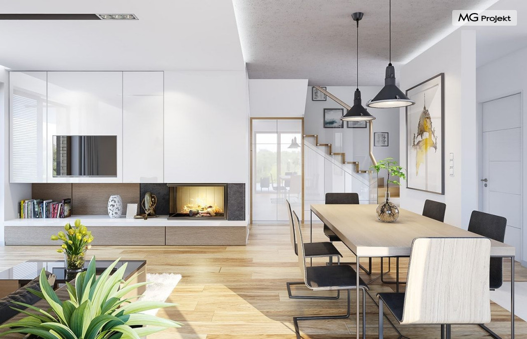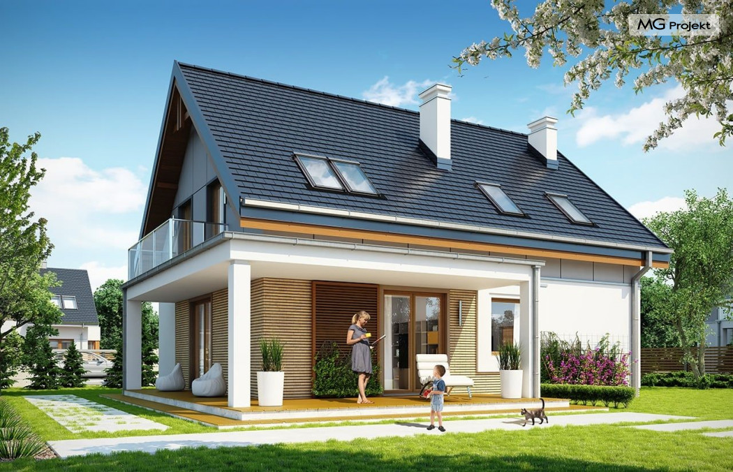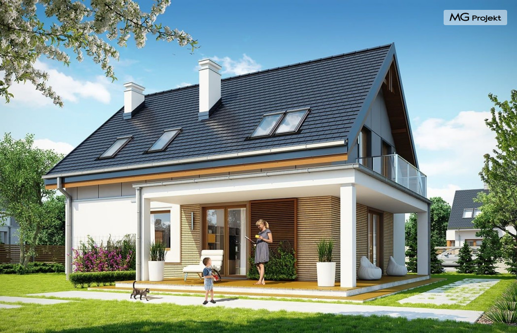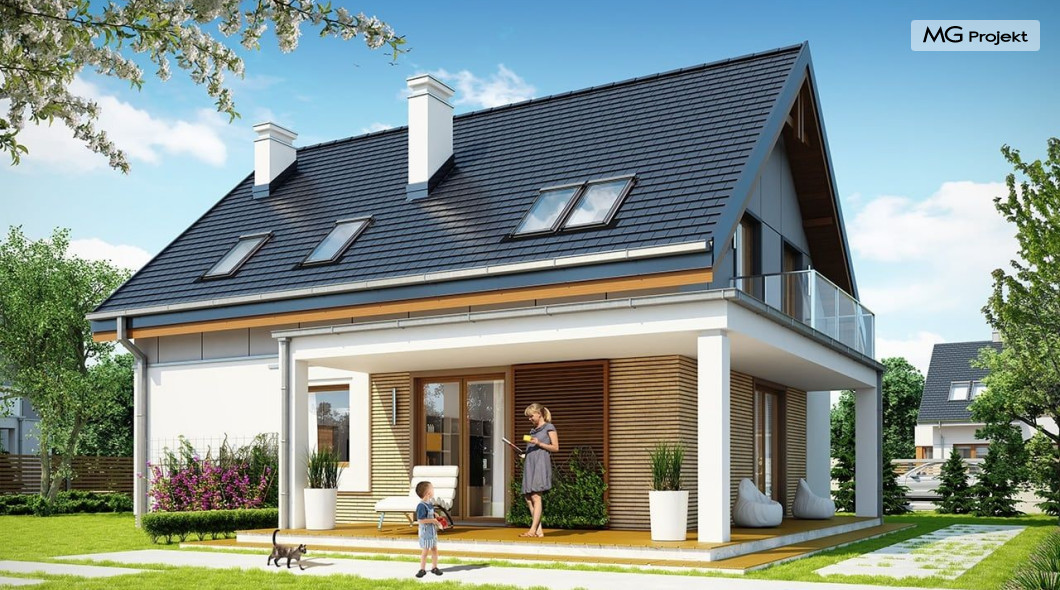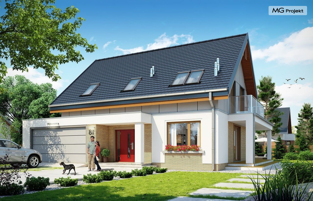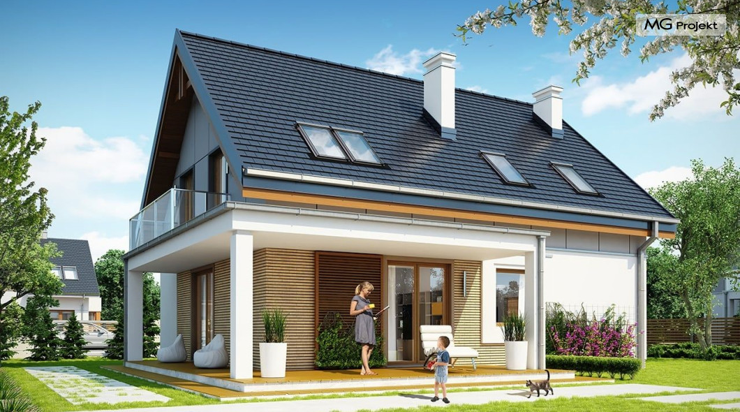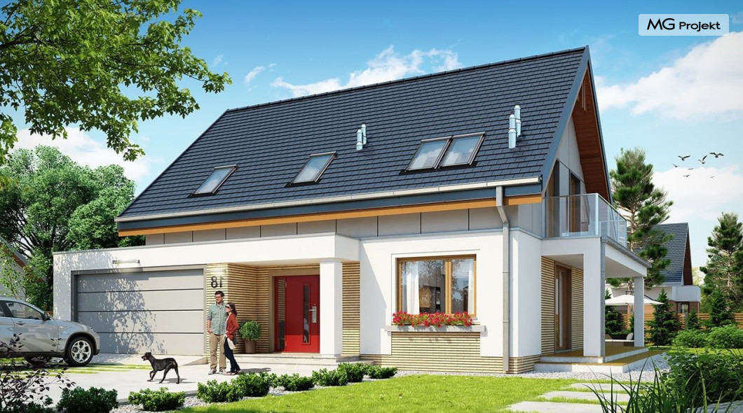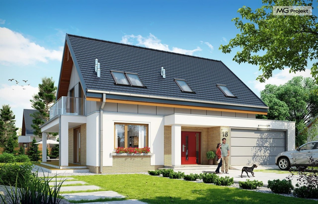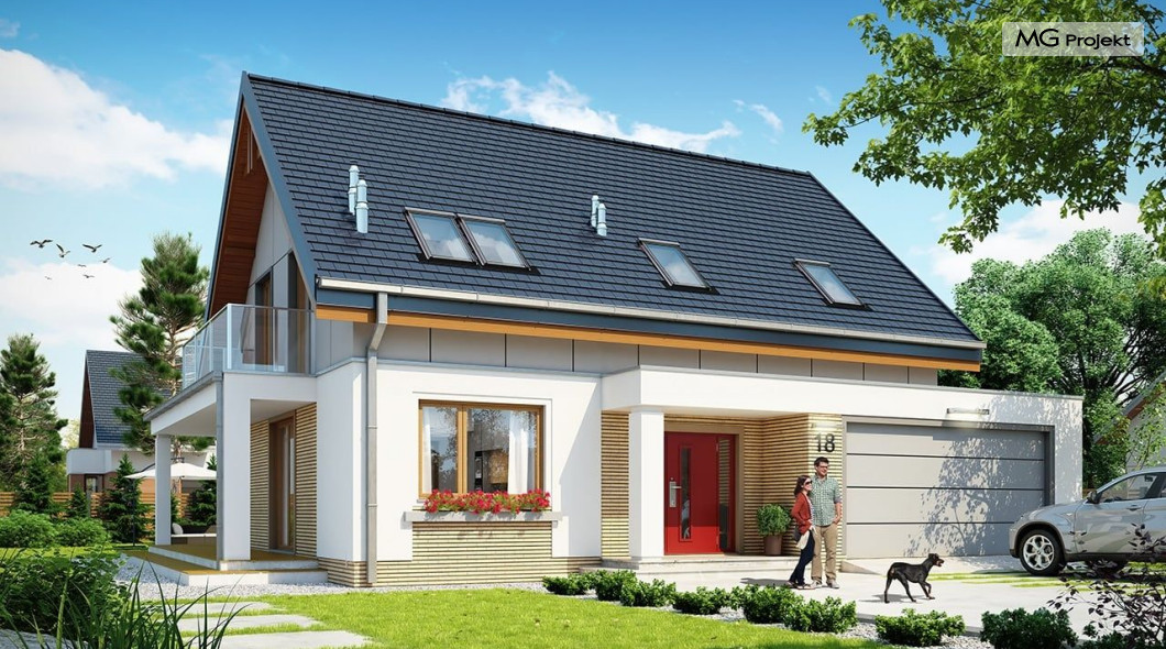 Projekt domu Albatros 2 jest wersją wariantową popularnego projektu „Albatros” z podwójnym garażem. Jest to prosty w budowie, niedrogi dom z poddaszem użytkowym dla 4-5 osobowej rodziny. Bryła budynku została zaprojektowana na planie prostokąta - do głównej bryły dobudowany jest częściowo wchodzący w nią garaż na dwa auta. Poddasze wieńczy symetryczny dwuspadowy dach. Projekt podporządkowano połączeniu ekonomicznych i funkcjonalnych rozwiązań, z nowoczesną i ciekawą estetyką budynku. Dom ma w sobie „to coś”: ciekawie dobrane materiały, dobre proporcje brył, właściwą wielkość okien, no i przede wszystkim – funkcjonalne, rozsądnie zaplanowane wnętrze. Parter domu, to przestrzeń dzienna, z wygodnym salonem, centralnym holem z ozdobnymi schodami, częściowo otwartą na salon kuchnią, oraz dodatkowy pokój - gabinet lub sypialnia gościnna i część gospodarcza, czyli garaż i kotłownia. Na poddaszu, dzięki wysokim ściankom kolankowym, mieszczą się trzy przestronne sypialnie, w tym sypialnia rodziców z osobną łazienka i garderobą. Dodatkowo przewidziano tu też miejsce na pralnię – ewentualnie schowek. „Albatros” mimo niewielkiej powierzchni jest przestronny i wygodny i zapewni komfortowe warunki do życia nawet licznej rodzinie. Energooszczędne rozwiązania – dobre docieplenia, zwarta bryła budynku - pozwolą ograniczyć koszty przyszłej eksploatacji, a prostota konstrukcji domu zapewni mniej stresów podczas budowy. Zapraszamy do zapoznania się z pełną ofertą pracowni MG Projekt: projekt domu Albatros