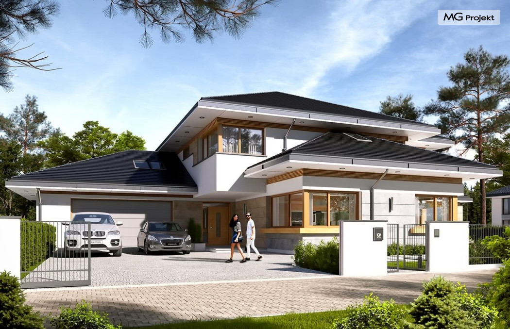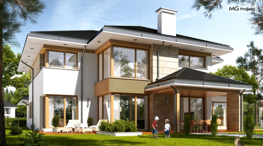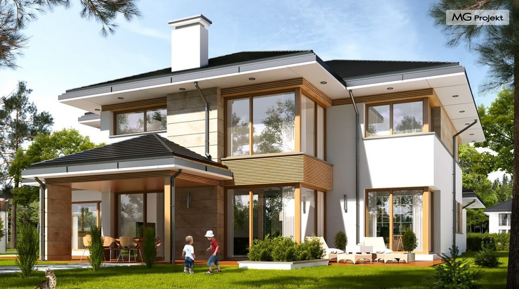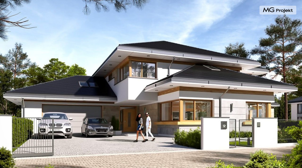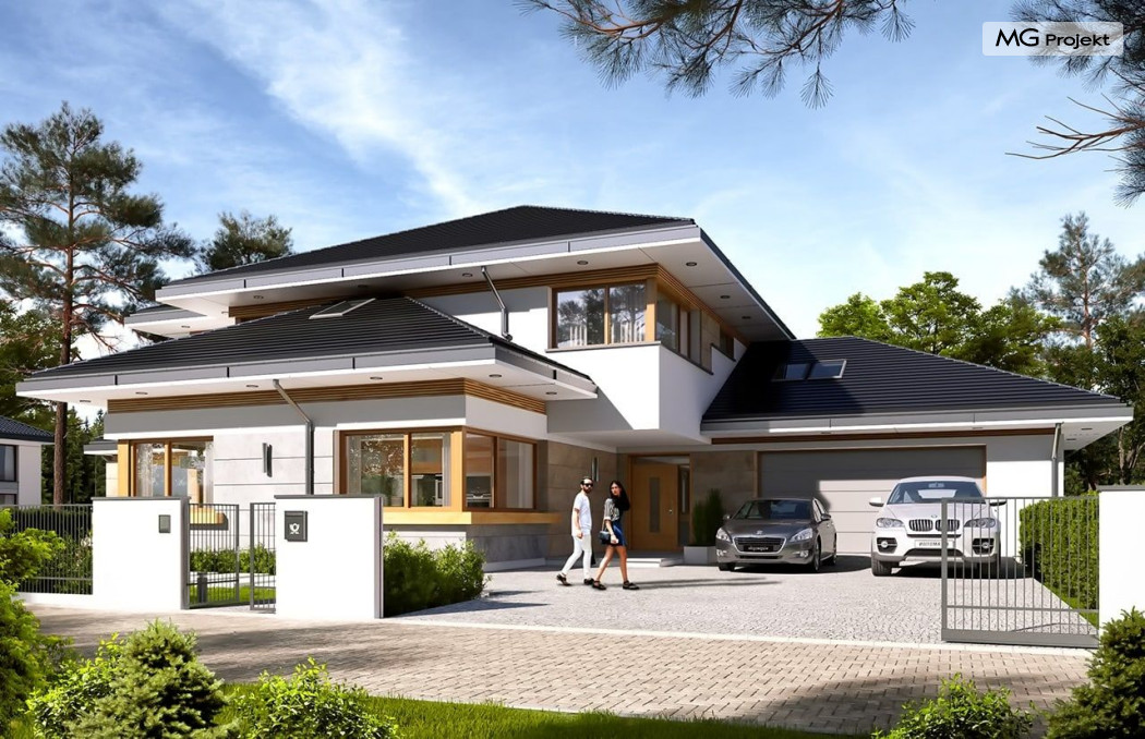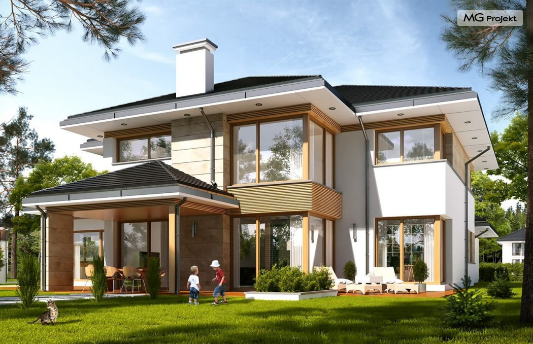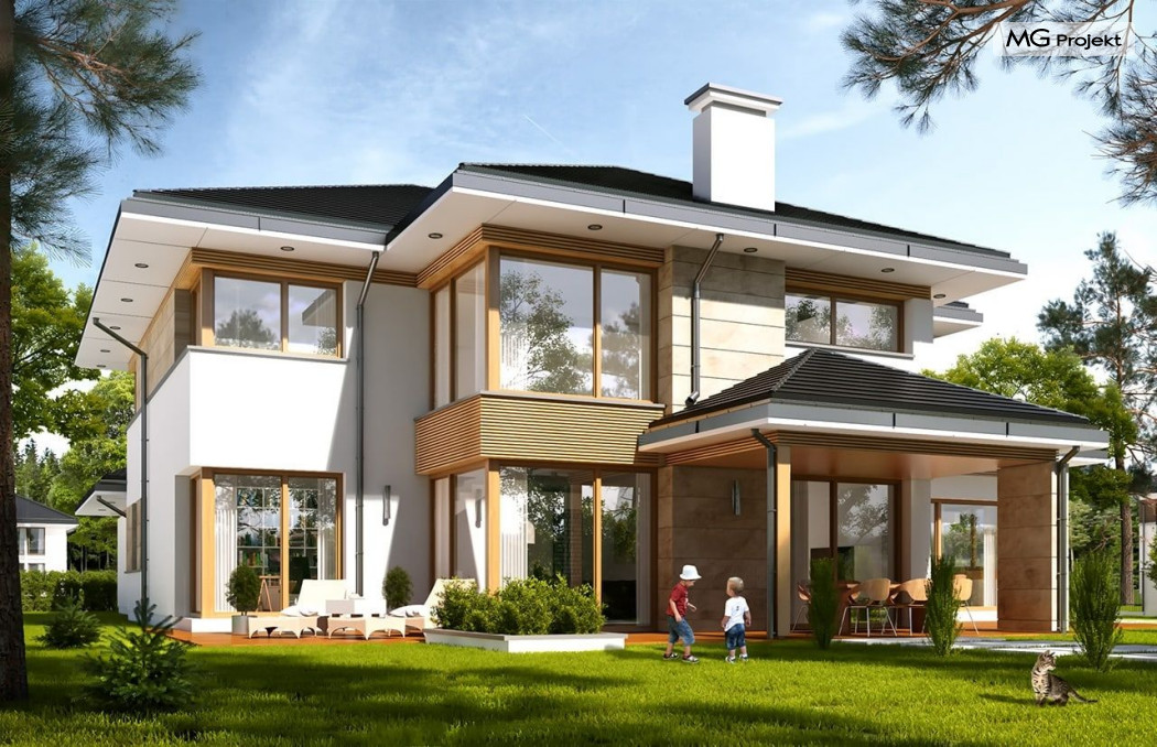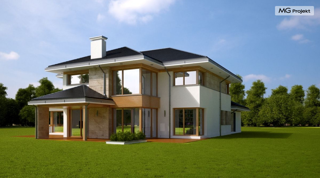 Projekt domu Dom z widokiem 4 jest kolejną wersją popularnego projektu Dom z widokiem. Jest to bardzo komfortowa podmiejska willa dla 4-6-cio osobowej rodziny. Dom składa się z piętrowej głównej bryły i dodanych parterowych mniejszych części. Całość tworzy układ litery „T”. Budynek można ustawić na działce tak, aby ściana z drzwiami wejściowymi i bramą garażową była frontem lub bokiem do drogi dojazdowej -w zależności od sytuacji. Ogród, tarasy i główne przeszklenia są wówczas usytuowane w przeciwległym narożniku działki. Także dom można postawić zarówno na działce z niekorzystnym nasłonecznieniem - z ogrodem od frontu, czy boku, ale również z ogrodem z tyłu domu. Nowoczesna architektura domu wpasuje się doskonale zarówno w ścisłą willową zabudowę, jak i w wiejski teren. Charakterystycznym elementem są tutaj duże narożne okna, okapy łagodnych dachów, oraz elewacje podzielone na pasy wykończone różnymi materiałami, jak tynk, kamień, czy drewno. Projekt domu Dom z widokiem 4 ma nowoczesną, ale stonowaną architekturę. Emanuje z niej spokój i elegancja. Dzięki połączeniu dobrych sprawdzonych detali architektura domu nigdy się nie zestarzeje i nie wyjdzie z mody. Jednymi z głównych atrakcji wilii są jej przeszklenia - największą jest dwukondygnacyjny szklany narożnik salonu, łączący pokój dzienny z pustką z tarasem i ogrodem. Pozostałe przeszklenia : w jadalni, w kuchni, sypialniach, czy przy wejściu do domu, dodatkowo potęgują efekt otwartości wnętrza. Przestrzeń jest luksusem - wnętrze domu zagospodarowano kierując się tą myślą. Parter to w dużej mierze otwarta część dzienna - salon, jadalnia, hol, kuchnia. Na parterze zmieściliśmy dodatkowy pokój - gabinet. Piętro to sypialnie rodziców i dzieci, z łazienkami i garderobami. Na piętrze mieści się duża antresola nad salonem , którą można wykorzystać jako dodatkowy pokój. Projekt domu Dom z widokiem 4 to dom dla ludzi wyjątkowych, z wizją, z pragnieniem życia w nietuzinkowym otoczeniu, wśród pięknych wnętrz. Dostaępna jest także wersja domu w odbiciu lustrzanym (garaż po prawej stronie), oraz: Dom z widokiem, Dom z widokiem 2, Dom z widokiem 2C, Dom z widokiem 3, Dom z widokiem 3F, Dom z widokiem 5, Dom z widokiem 6, Dom z widokiem 6B, Dom z widokiem B, Dom z widokiem E.