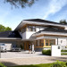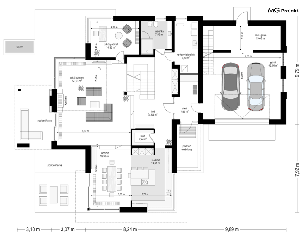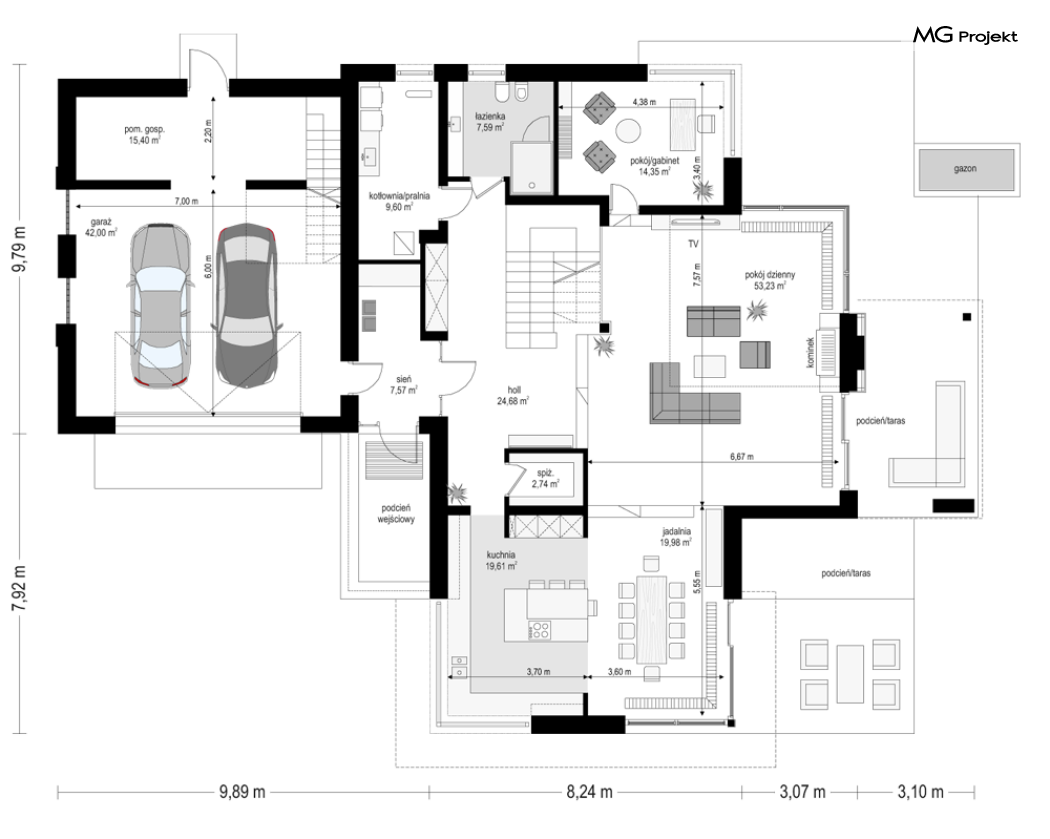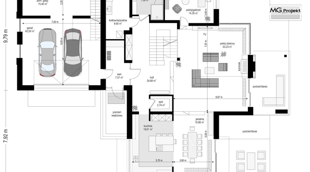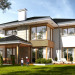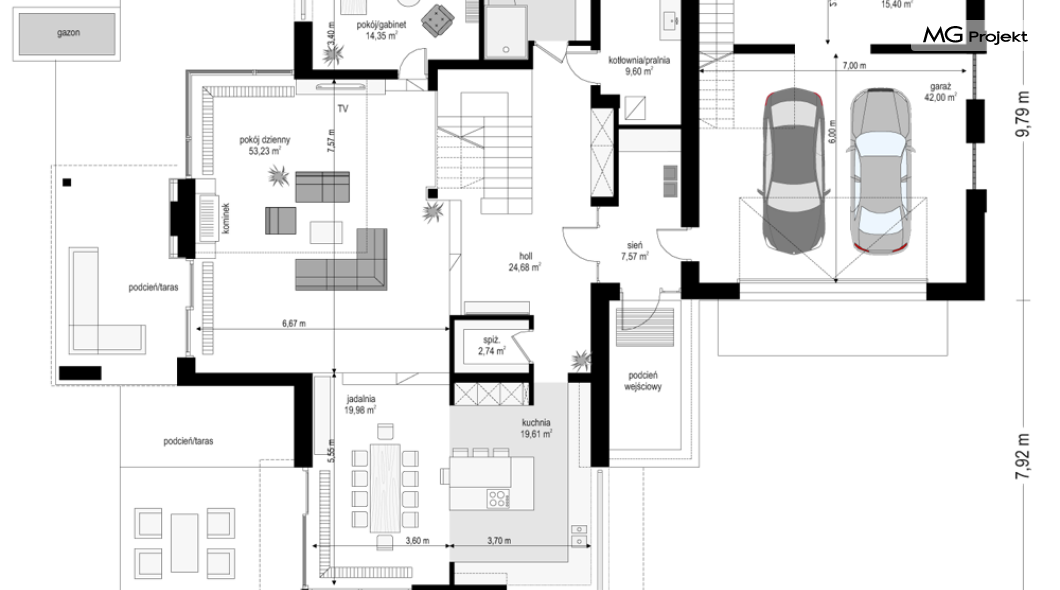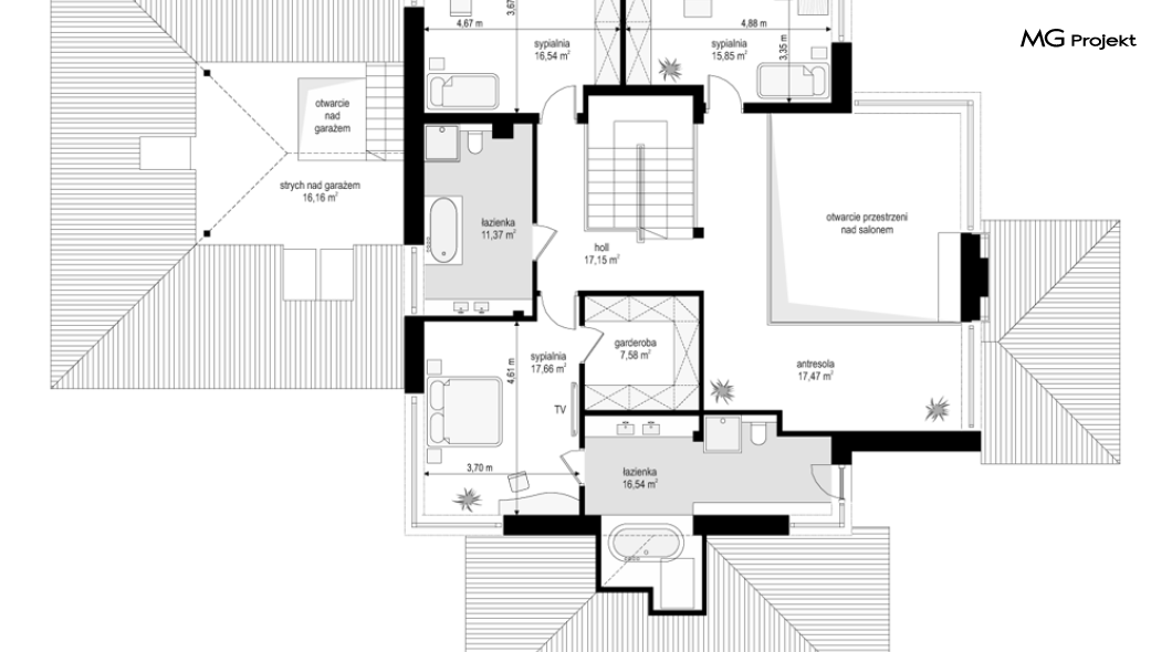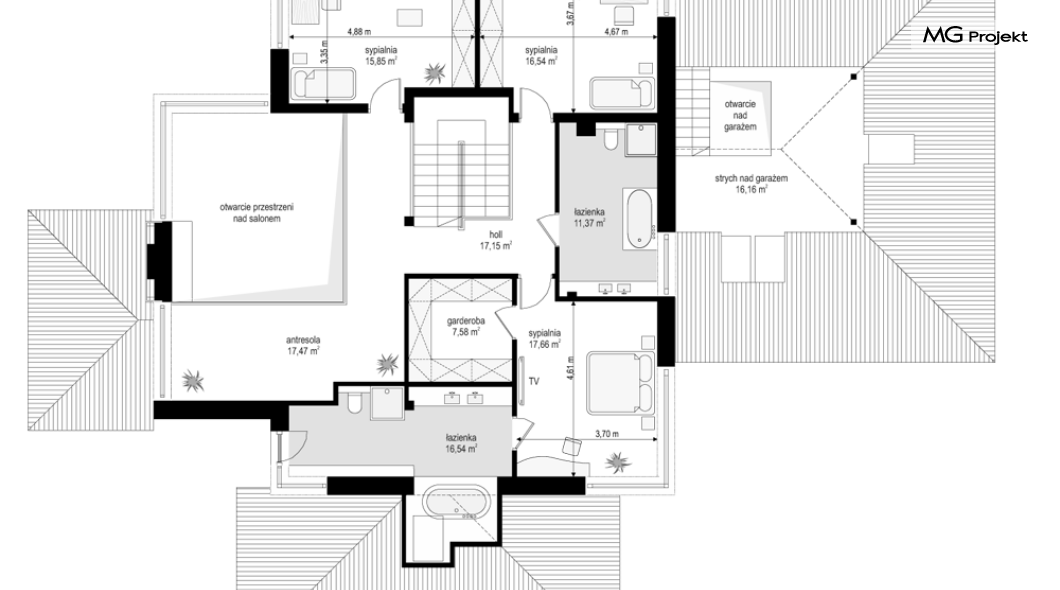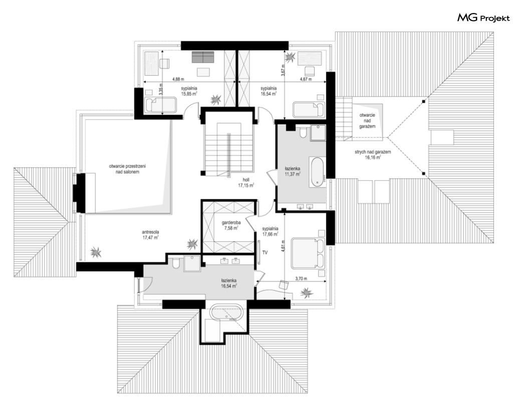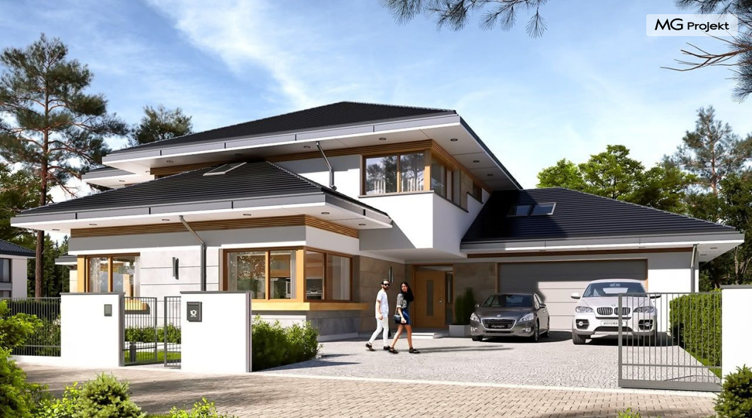 Projekt domu Dom z widokiem 4 jest kolejną wersją popularnego projektu Dom z widokiem. Jest to bardzo komfortowa podmiejska willa dla 4-6-cio osobowej rodziny. Dom składa się z piętrowej głównej bryły i dodanych parterowych mniejszych części. Całość tworzy układ litery „T”. Budynek można ustawić na działce tak, aby ściana z drzwiami wejściowymi i bramą garażową była frontem lub bokiem do drogi dojazdowej -w zależności od sytuacji. Ogród, tarasy i główne przeszklenia są wówczas usytuowane w przeciwległym narożniku działki. Także dom można postawić zarówno na działce z niekorzystnym nasłonecznieniem - z ogrodem od frontu, czy boku, ale również z ogrodem z tyłu domu. Nowoczesna architektura domu wpasuje się doskonale zarówno w ścisłą willową zabudowę, jak i w wiejski teren. Charakterystycznym elementem są tutaj duże narożne okna, okapy łagodnych dachów, oraz elewacje podzielone na pasy wykończone różnymi materiałami, jak tynk, kamień, czy drewno. Projekt domu Dom z widokiem 4 ma nowoczesną, ale stonowaną architekturę. Emanuje z niej spokój i elegancja. Dzięki połączeniu dobrych sprawdzonych detali architektura domu nigdy się nie zestarzeje i nie wyjdzie z mody. Jednymi z głównych atrakcji wilii są jej przeszklenia - największą jest dwukondygnacyjny szklany narożnik salonu, łączący pokój dzienny z pustką z tarasem i ogrodem. Pozostałe przeszklenia : w jadalni, w kuchni, sypialniach, czy przy wejściu do domu, dodatkowo potęgują efekt otwartości wnętrza. Przestrzeń jest luksusem - wnętrze domu zagospodarowano kierując się tą myślą. Parter to w dużej mierze otwarta część dzienna - salon, jadalnia, hol, kuchnia. Na parterze zmieściliśmy dodatkowy pokój - gabinet. Piętro to sypialnie rodziców i dzieci, z łazienkami i garderobami. Na piętrze mieści się duża antresola nad salonem , którą można wykorzystać jako dodatkowy pokój. Projekt domu Dom z widokiem 4 to dom dla ludzi wyjątkowych, z wizją, z pragnieniem życia w nietuzinkowym otoczeniu, wśród pięknych wnętrz. Dostaępna jest także wersja domu w odbiciu lustrzanym (garaż po prawej stronie), oraz: Dom z widokiem, Dom z widokiem 2, Dom z widokiem 2C, Dom z widokiem 3, Dom z widokiem 3F, Dom z widokiem 5, Dom z widokiem 6, Dom z widokiem 6B, Dom z widokiem B, Dom z widokiem E.