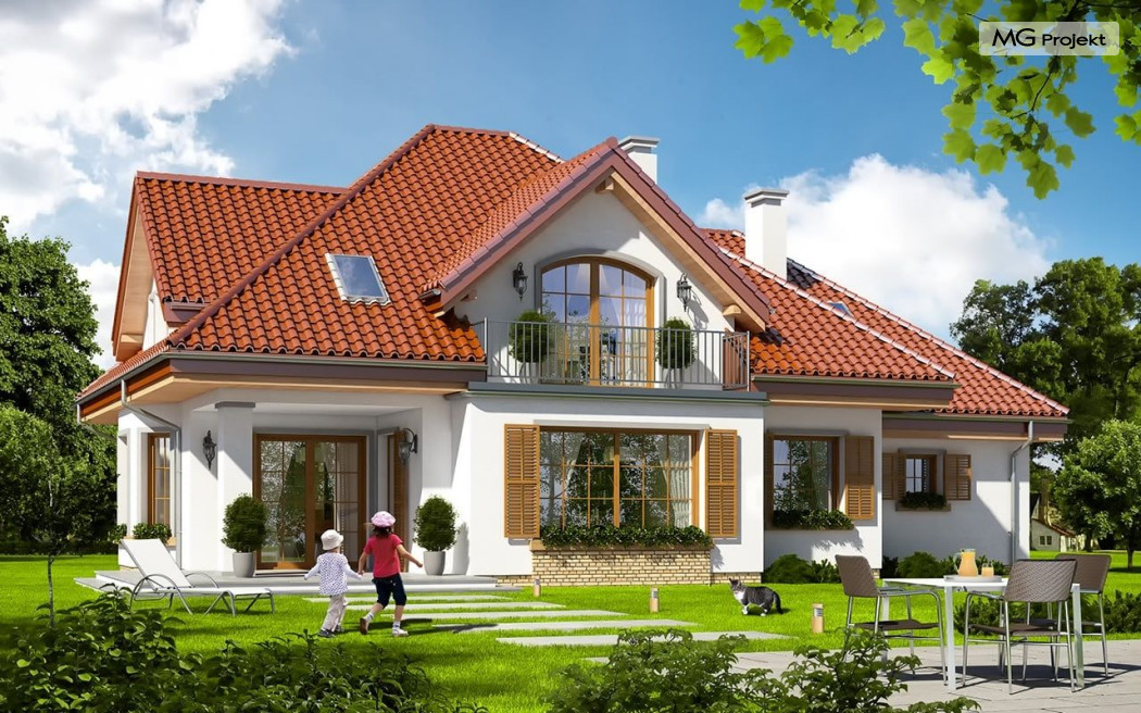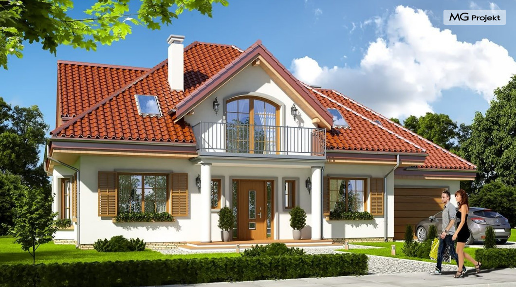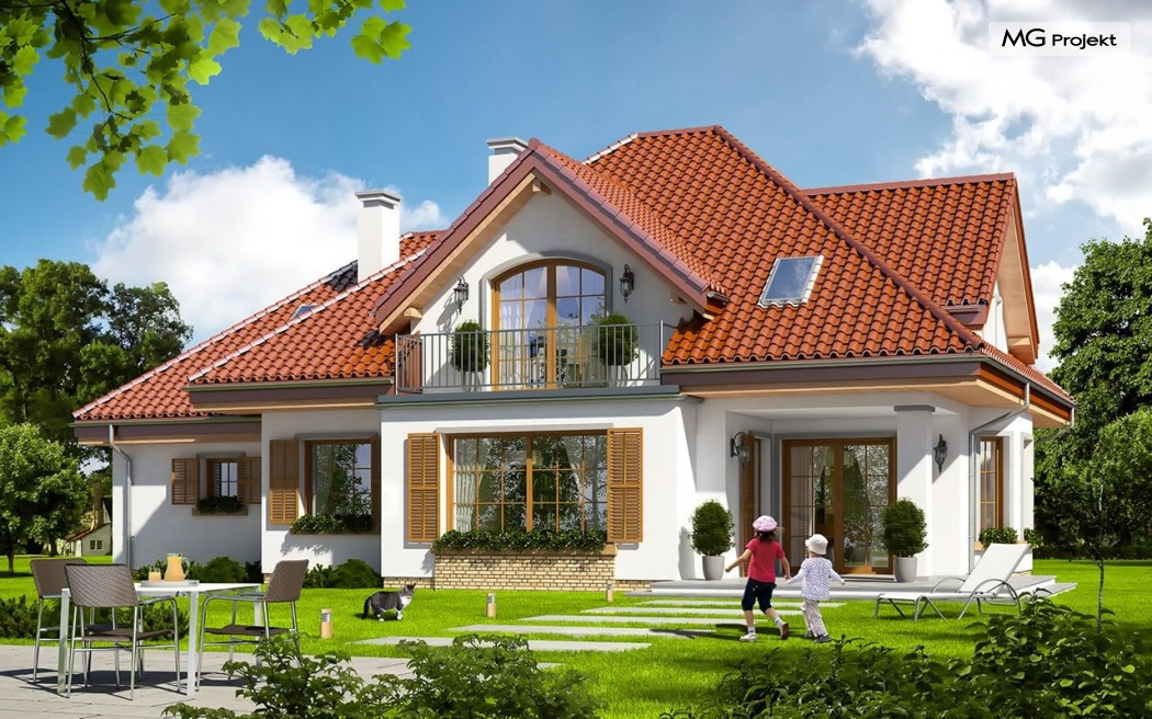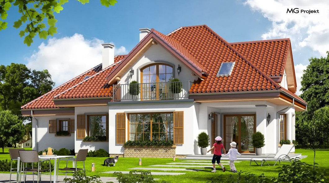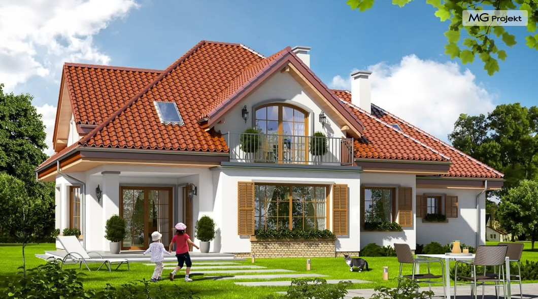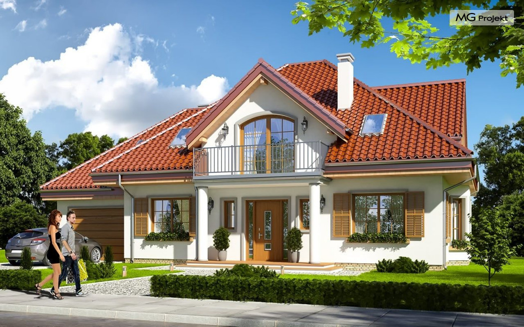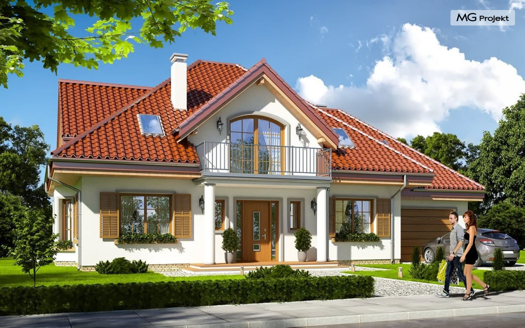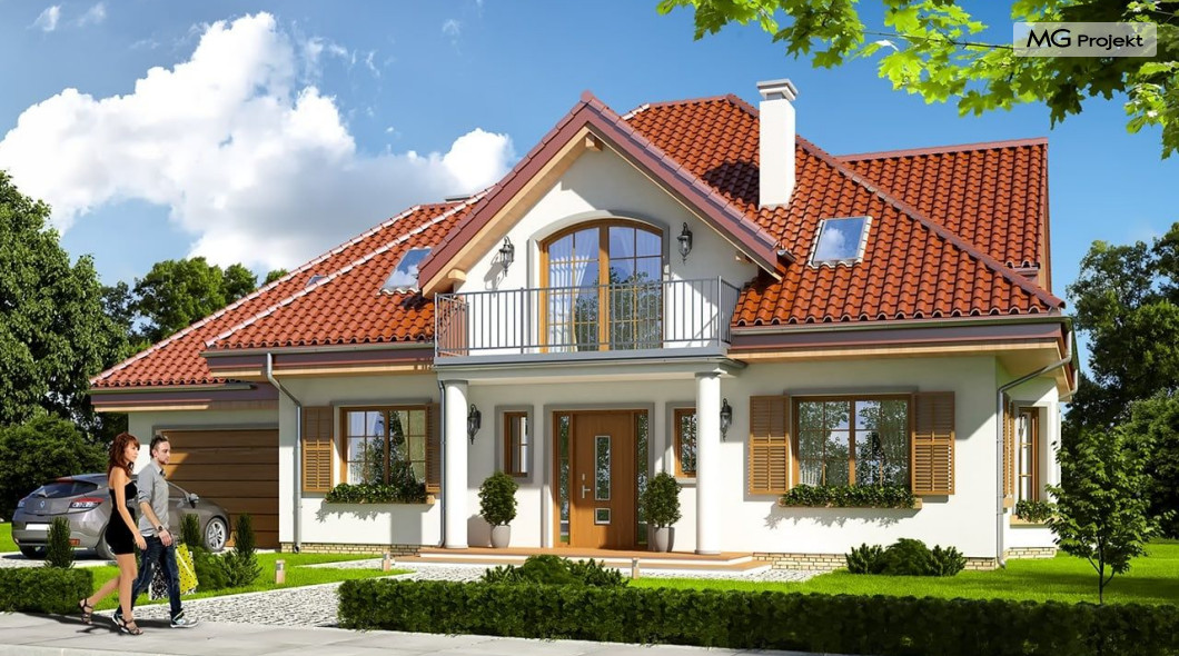 Projekt domu Ofelia 2 jest wersją wariantową popularnego projektu „Ofelia”, czyli wersję z pojedynczym garażem, nieco mniejszą, nadającą się na węższą działkę. Ofelia 2 nawiązuje do ponadczasowego stylu dworku polskiego, czy polskiego dachowca, ale w nowoczesnym ujęciu. Projekt domu Ofelia 2 ma symetryczną bryłę i właściwe proporcje. Parterowa bryła budynku przykryta jest czterospadowym dachem, z dużymi lukarnami z trzech stron, które minimalizują skosy w pokojach na poddaszu. Z czwartej strony znajduje się bryła garażowa z trójspadowym dachem kryjącym strych/poddasze. Wejście do domu podkreślone jest reprezentacyjnym portykiem z kolumnami. Od strony ogrodu mamy narożny podcień - zadaszenie tarasu, oraz piękne wykuszowe okno salonu. Wnętrze domu jest funkcjonalne i kryje w sobie wiele pomieszczeń. Na parterze mamy dużą przestrzeń dzienną połączonego salonu, jadalni, holu i częściowo otwartej kuchni. Z reprezentacyjnego holu mamy dostęp do dwóch dodatkowych pokoi na parterze, co jest rzadkością w domach tej wielkości. Można te pokoje wykorzystać na przykład jako gabinet lub sypialnie gościnną, a drugi ( przy łazience ) jako pokój seniora. Na parterze mieści się jeszcze spiżarnia przy kuchni, spory przedsionek, łazienka, oraz garaż i kotłownia. Poddasze mieści trzy sypialnie i dużą łazienkę. Dwie sypialnie mają własne garderoby i balkony. Nad garażem znajduje się strych, który można zagospodarować na poddasze użytkowe i urządzić tam dodatkowy pokój. Projekt domu Ofelia 2 to doskonała propozycja dla osób lubiących tradycyjny styl domu, nie ulegających chwilowym modom. Tradycyjny w formie, a jednocześnie z nowoczesnym funkcjonalnym wnętrzem, zastosowanymi nowoczesnymi materiałami i technologiami. Dom jest energooszczędny i dość prosty i niedrogi w budowie. Zapraszamy do zapoznania się z pełną ofertą pracowni MG Projekt tej serii: z dwustanowiskowym garażem (projekt domu Ofelia), z jednostanowiskowym garażem (projekt domu Ofelia 2), najmniejsza wersja (projekt domu Ofelia 3). Zapraszam!
