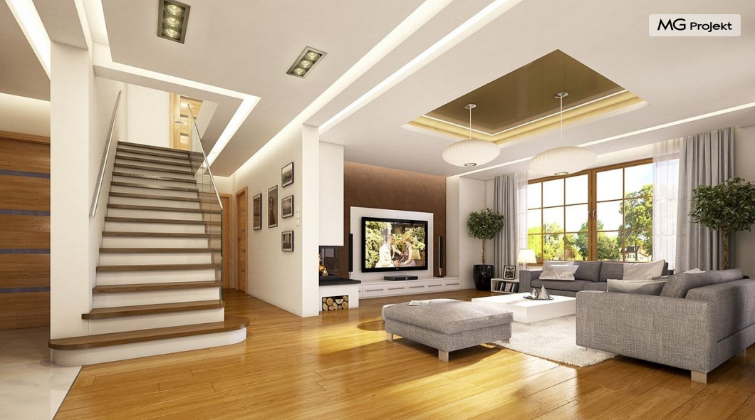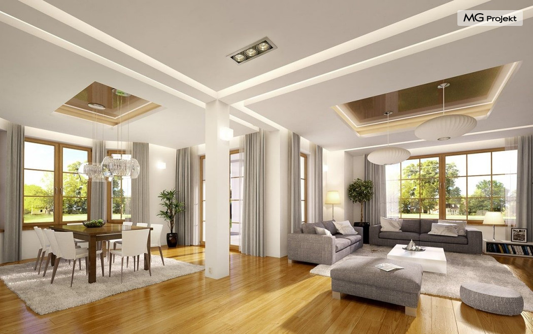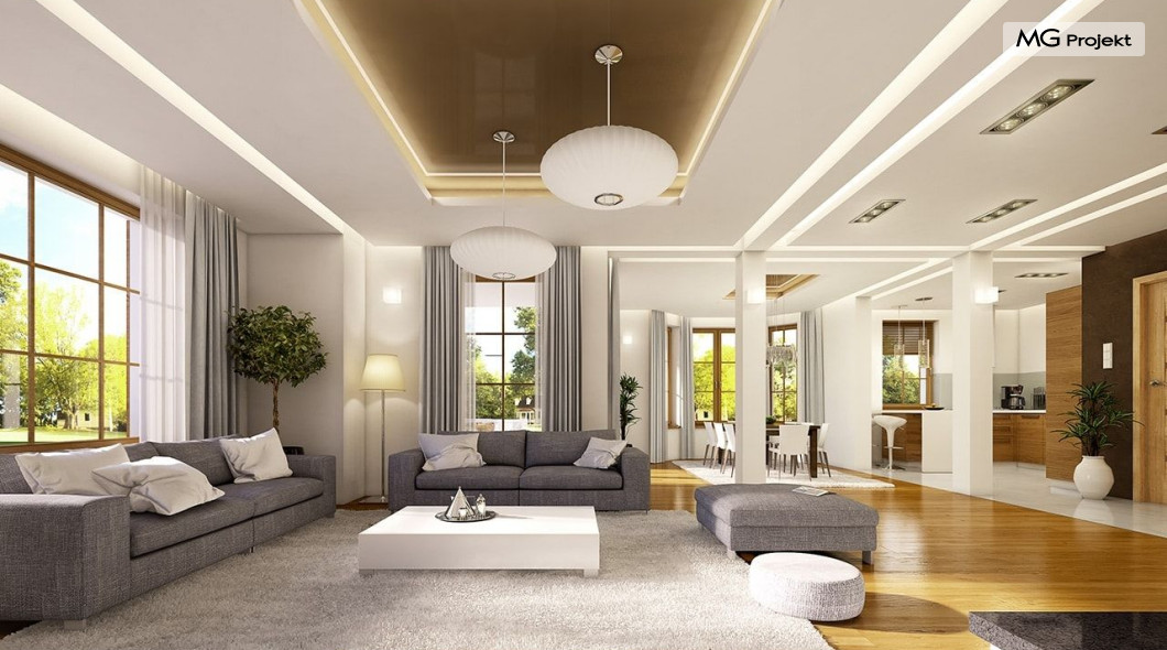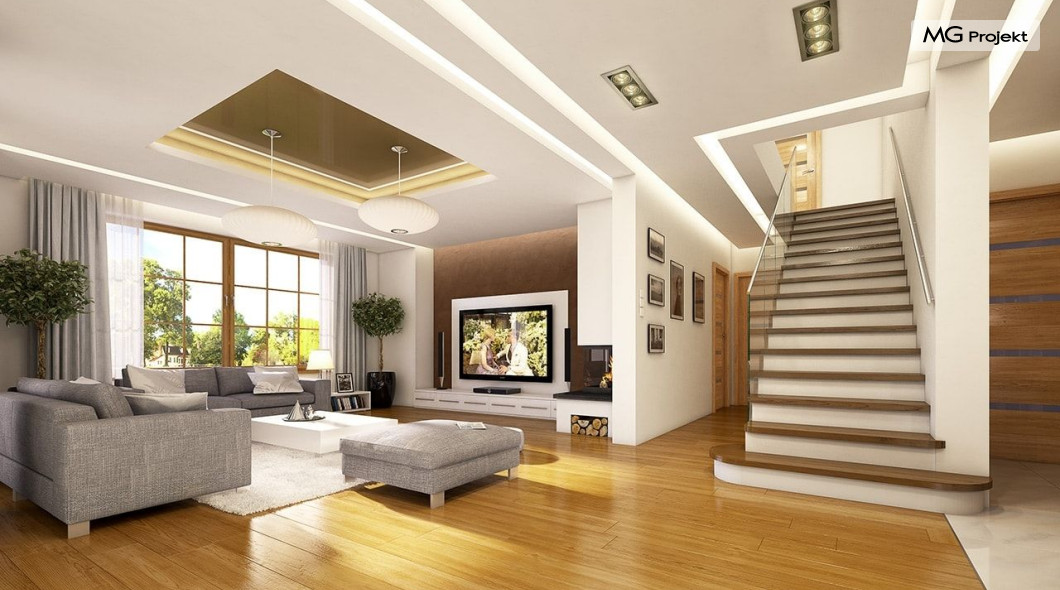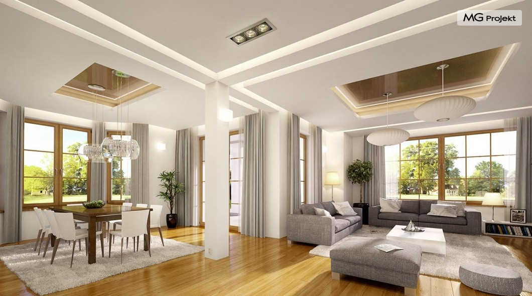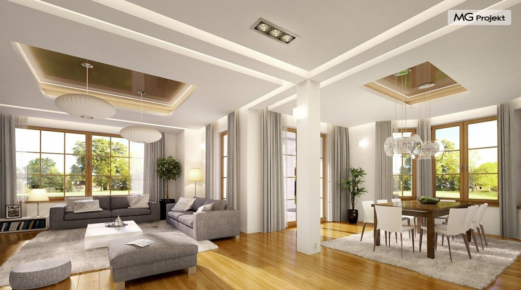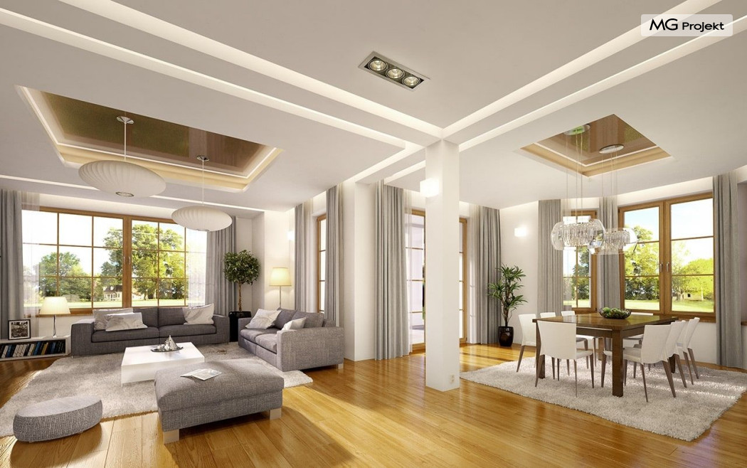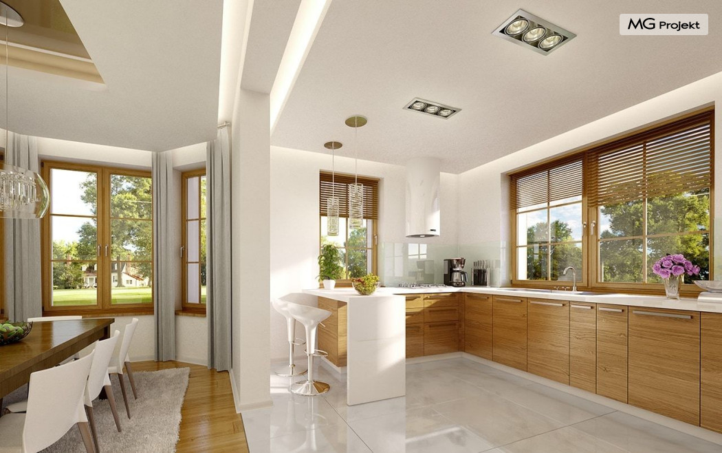 Projekt domu Ofelia 2 jest wersją wariantową popularnego projektu „Ofelia”, czyli wersję z pojedynczym garażem, nieco mniejszą, nadającą się na węższą działkę. Ofelia 2 nawiązuje do ponadczasowego stylu dworku polskiego, czy polskiego dachowca, ale w nowoczesnym ujęciu. Projekt domu Ofelia 2 ma symetryczną bryłę i właściwe proporcje. Parterowa bryła budynku przykryta jest czterospadowym dachem, z dużymi lukarnami z trzech stron, które minimalizują skosy w pokojach na poddaszu. Z czwartej strony znajduje się bryła garażowa z trójspadowym dachem kryjącym strych/poddasze. Wejście do domu podkreślone jest reprezentacyjnym portykiem z kolumnami. Od strony ogrodu mamy narożny podcień - zadaszenie tarasu, oraz piękne wykuszowe okno salonu. Wnętrze domu jest funkcjonalne i kryje w sobie wiele pomieszczeń. Na parterze mamy dużą przestrzeń dzienną połączonego salonu, jadalni, holu i częściowo otwartej kuchni. Z reprezentacyjnego holu mamy dostęp do dwóch dodatkowych pokoi na parterze, co jest rzadkością w domach tej wielkości. Można te pokoje wykorzystać na przykład jako gabinet lub sypialnie gościnną, a drugi ( przy łazience ) jako pokój seniora. Na parterze mieści się jeszcze spiżarnia przy kuchni, spory przedsionek, łazienka, oraz garaż i kotłownia. Poddasze mieści trzy sypialnie i dużą łazienkę. Dwie sypialnie mają własne garderoby i balkony. Nad garażem znajduje się strych, który można zagospodarować na poddasze użytkowe i urządzić tam dodatkowy pokój. Projekt domu Ofelia 2 to doskonała propozycja dla osób lubiących tradycyjny styl domu, nie ulegających chwilowym modom. Tradycyjny w formie, a jednocześnie z nowoczesnym funkcjonalnym wnętrzem, zastosowanymi nowoczesnymi materiałami i technologiami. Dom jest energooszczędny i dość prosty i niedrogi w budowie. Zapraszamy do zapoznania się z pełną ofertą pracowni MG Projekt tej serii: z dwustanowiskowym garażem (projekt domu Ofelia), z jednostanowiskowym garażem (projekt domu Ofelia 2), najmniejsza wersja (projekt domu Ofelia 3). Zapraszam!
