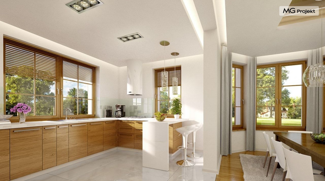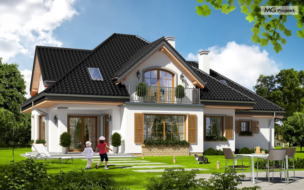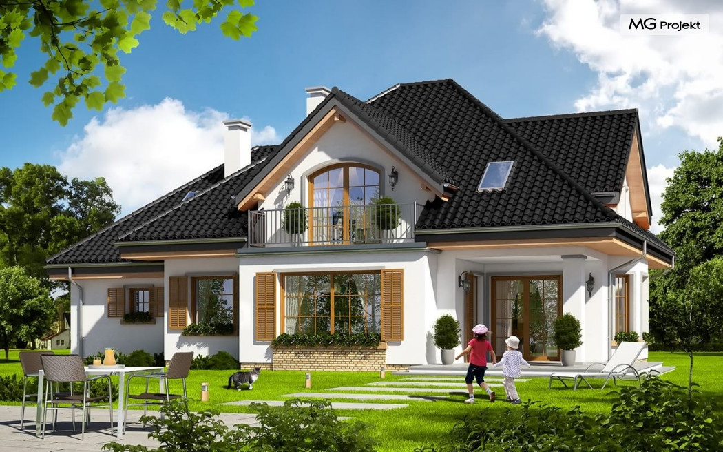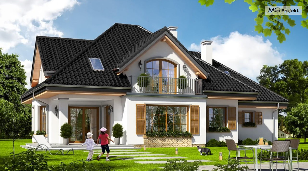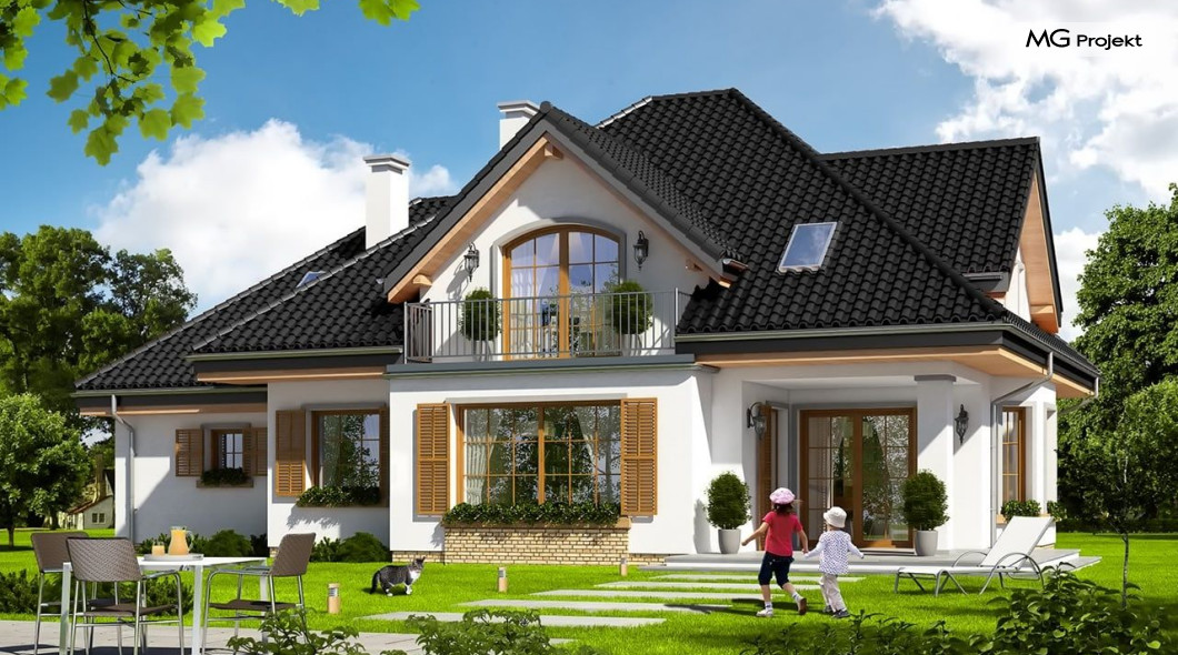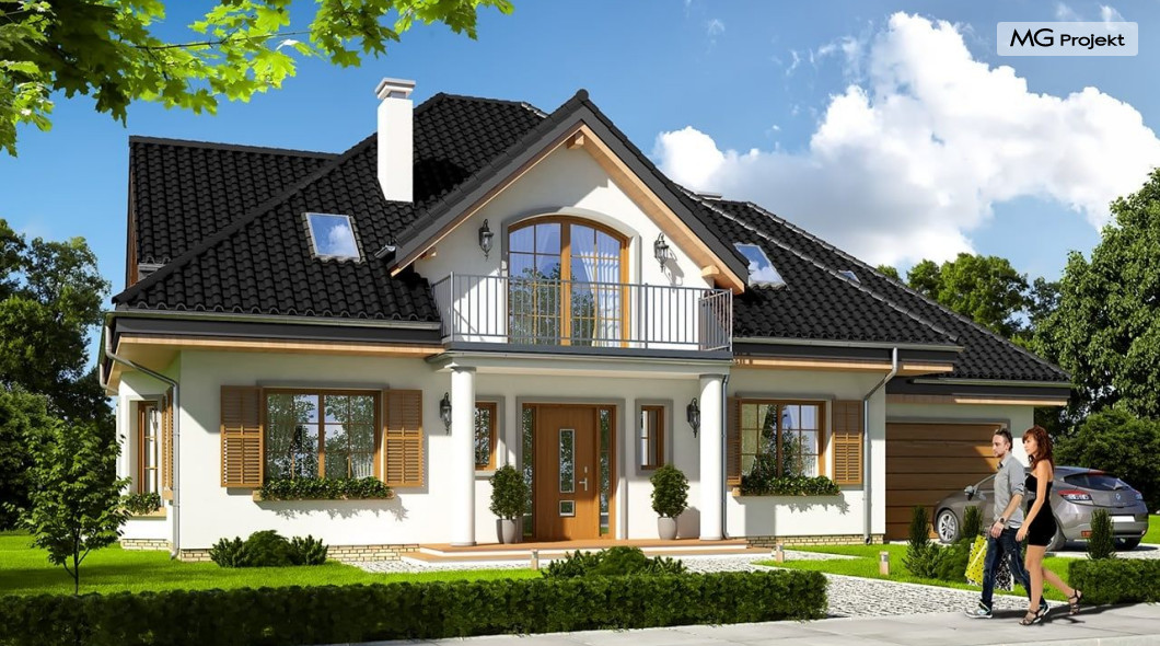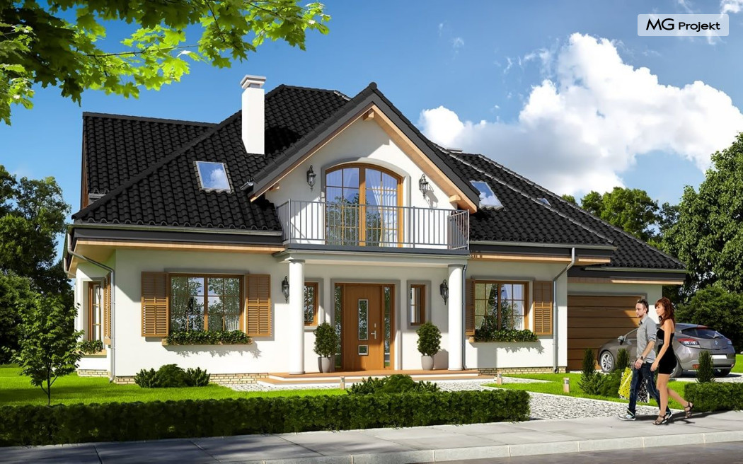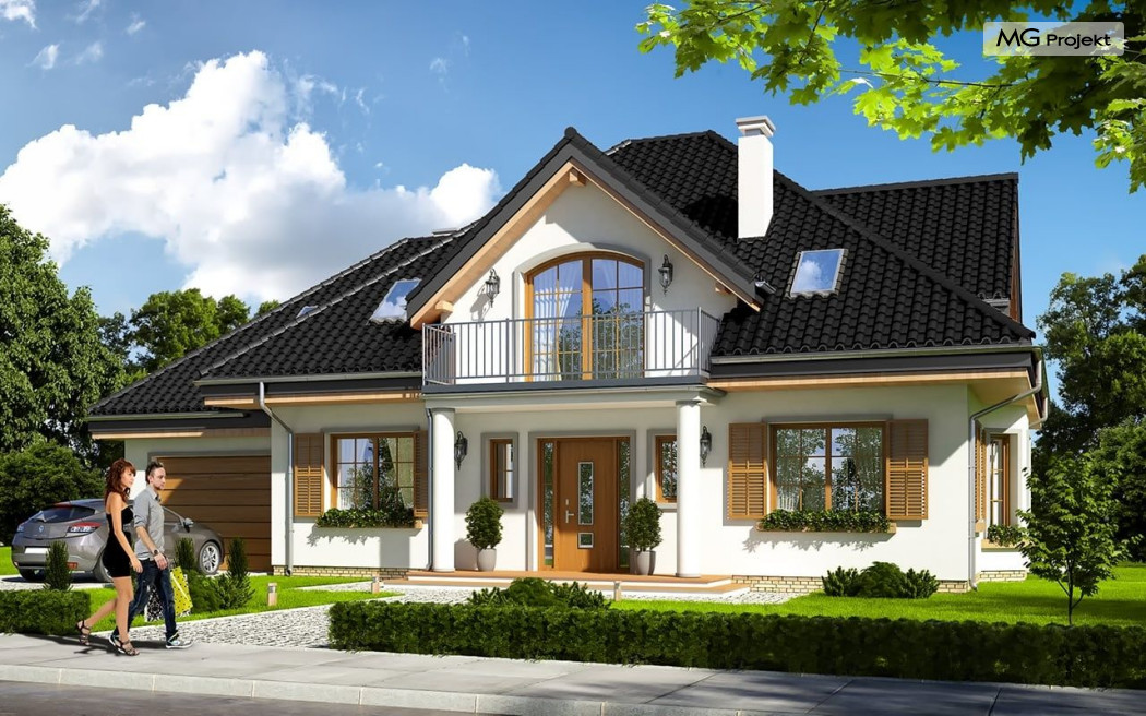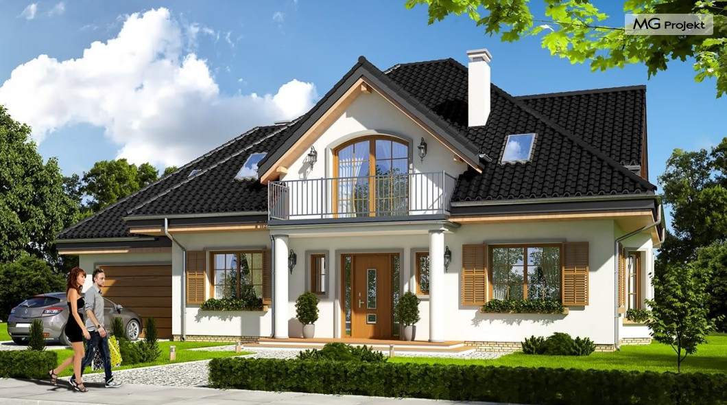 Projekt domu Ofelia 3 jest kolejną wersją projektu z serii domów „Ofelia”. Jest to projekt zmniejszony w stosunku do bazowej wersji, z pojedynczym garażem i z dodatkowym lokalem na parterze : mieszkaniem dla seniorów lub dorosłych dzieci, albo przestrzenią biurową. Ofelia 3 to projekt jednorodzinnego domu, parterowy z poddaszem użytkowym, przykryty czterospadowym dachem, z dobudowaną częścią garażową. Tradycyjna architektura domu, z dworkową bryłą, łączy się z nowoczesnymi materiałami i detalami. Całość zyskuje dzięki temu ponadczasowy charakter. Front domu został zaakcentowany szeroką lukarną z balkonem wspartym na kolumnach. Wejście do domu szerokimi drzwiami z naświetlami bocznymi jest bardzo reprezentacyjne. Od strony ogrodowej elewacja urozmaicona jest lukarną z balkonem, wykuszem salonu z pięknym nisko schodzącym oknem, oraz podcieniem częściowo zadaszającym taras. Wnętrze domu : na parterze wydzielono część dzienną domu, oraz dodatkowy lokal ( mieszkanie, lub na przykład biuro ), do którego dostajemy się z obszernego przedsionka. W części dziennej mamy salon z jadalnią i holem, oraz kuchnię ze spiżarnią. Dodatkowo z boku domu dobudowany jest garaż z kotłownią ( część garażową można połączyć z domem dodatkowymi drzwiami ). Na poddaszu zaprojektowano trzy sypialnie z dużą łazienką, oraz dodatkowy pokój nad garażem. Sypialnia rodziców posiada własną garderobę, oraz balkon z widokiem na ogród. Ofelia 3 to świetna propozycja dla wielopokoleniowej rodziny, albo dla Inwestorów prowadzących swój biznes w domu. Budynek na dość prostą konstrukcję. Jest łatwy w budowie, a dzięki energooszczędnym rozwiązaniom będzie niedrogi w eksploatacji. Ofelię 3 można łatwo dostosować do standardu NF40. Zapraszamy.