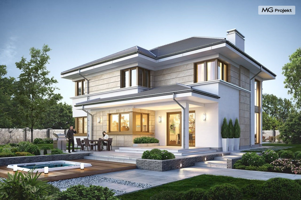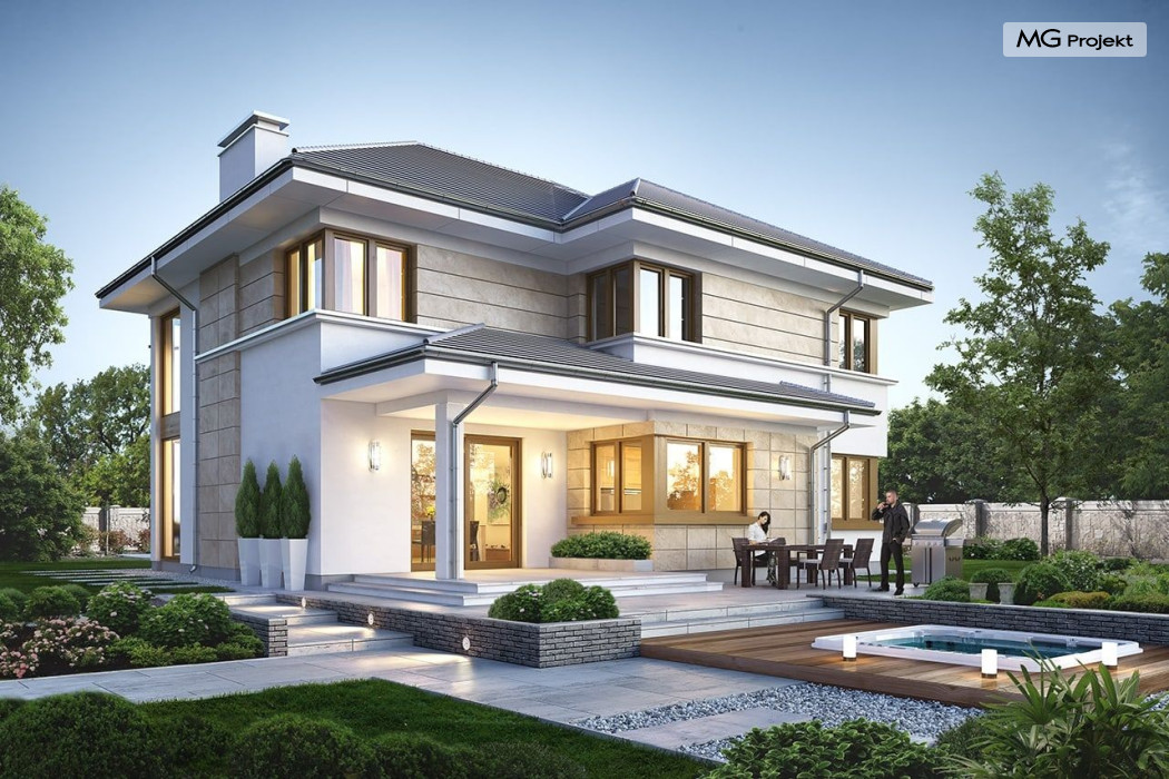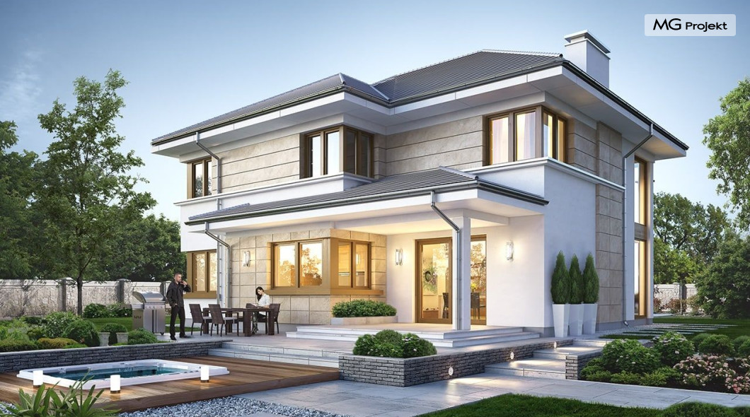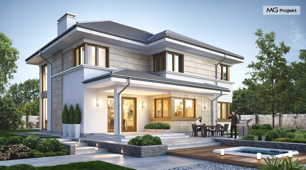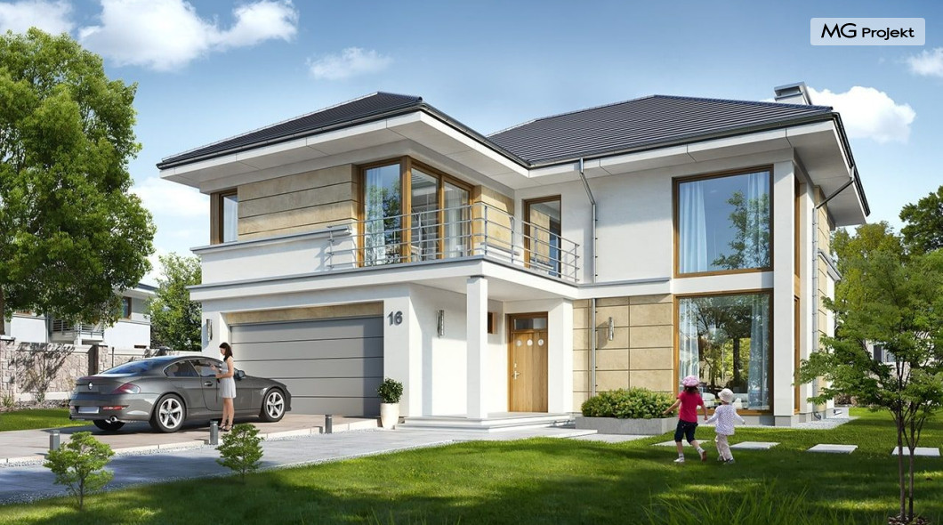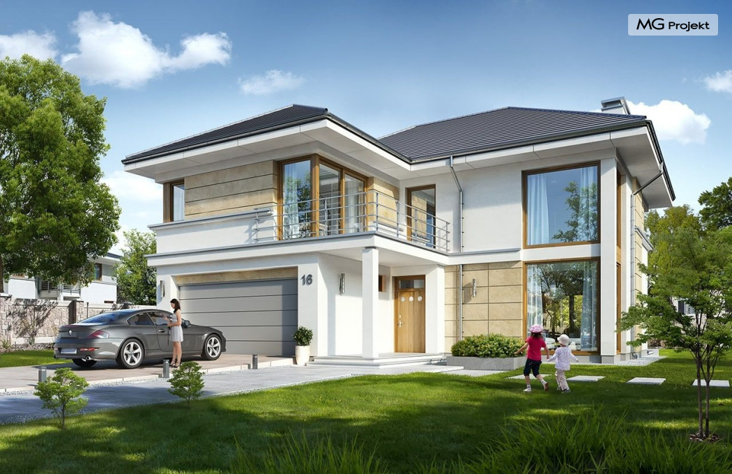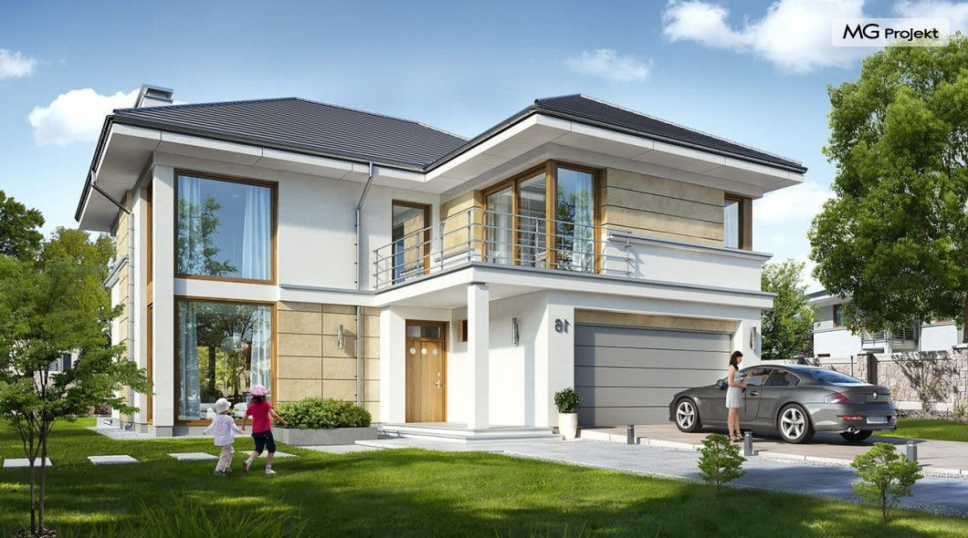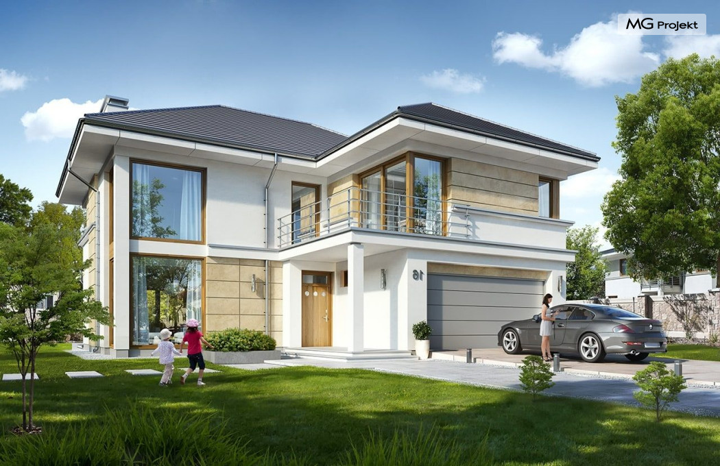 Projekt domu Riwiera 5 to kolejny z popularnych projektów z serii Riwiera, czyli zmodyfikowana i ulepszona wersja bazowego projektu. Projekt domu Riwiera 5 to dom bez podpiwniczenia, z dachem o wyższym kącie nachylenia, oraz z wariantowym wnętrzem piętra : z pustką i antresolą nad salonem, oraz bez pustki. To piętrowy dom, zbudowany na planie litery „T”, z wystającą nieco do przodu częścią garażową. Przykryty jest wielospadowym dachem krytym dachówką. Nowoczesna bryła ozdobiona została dużymi oknami, kamiennymi okładzinami ścian, boniowaniami, oraz gzymsami oddzielającymi parter i piętro. Szczególnie widowiskowe są narożne okna części dziennej, połączone z oknami piętra. Architektura domu jest nowoczesna, a jednocześnie powściągliwa, stonowana i nie przesadzona. Dzięki temu budynek nie traci na swojej przytulności. Dzięki układowi wnętrza i odpowiedniemu rozmieszczeniu okien budynek może być postawiony także na działce z wjazdem od południa. Wnętrze : na parterze zaprojektowano otwartą przestrzeń dzienną - w wersji z pustką z otwarciem sufitu nad salonem. Kuchnia z wyspą oddzielona od holu szklaną ścianą stanowi ozdobę salonu. Pokój dzienny, jadalnia i hol tworzą razem piękne wnętrze. Na parterze mamy też dodatkowy pokój ( gabinet lub sypialnię gościnną ), wc, kotłownię i dwustanowiskowy garaż. Na piętrze, w zależności od wersji ( z pustką lub bez ) mamy trzy lub cztery sypialnie, 2 łazienki, garderoby i pralnię. Sypialnia rodziców to oddzielny apartament z łazienką i dwiema garderobami. W wersji z pustką nad salonem mamy piękną antresolę będącą kontynuacją salonu. Projekt domu Riwiera 5 - wizualizacja frontu - odbicie lustrzane to atrakcyjny, nowoczesny dom, o energooszczędnych rozwiązaniach. Projekt można bardzo łatwo dostosować do standardu NF40. Pracownia posiada wersję odbicia lustrzanego oraz inne propozycje tej serii: bazowa (Projekt domu Riwiera), pomniejszonej (Projekt domu Riwiera 2), poszerzonej, o mniejszej głębokości (Projekt domu Rwiera 3), pomniejszonej ze zmienionym układem wewnętrznym (Projekt domu Riwiera 4). Zapraszamy!
