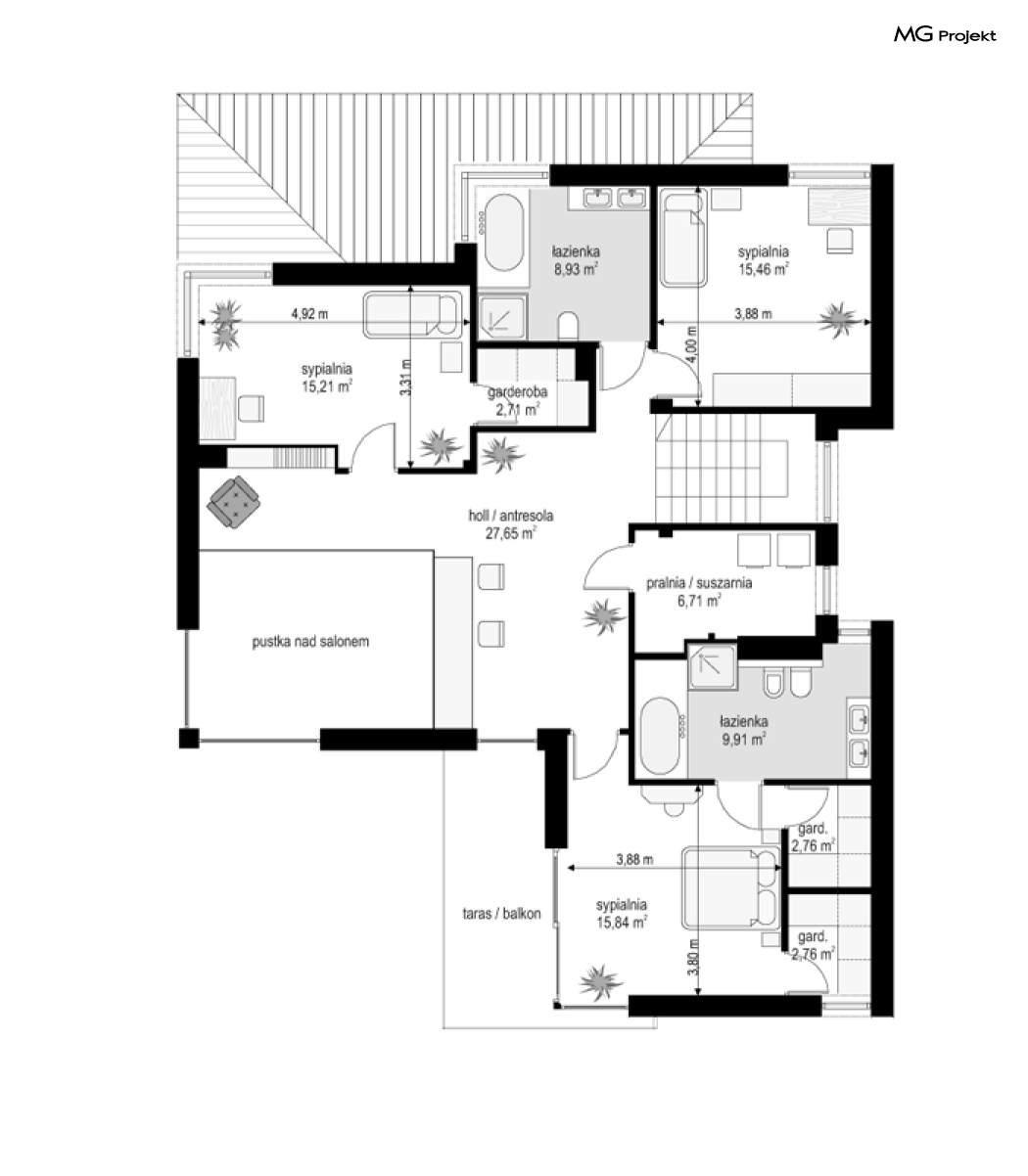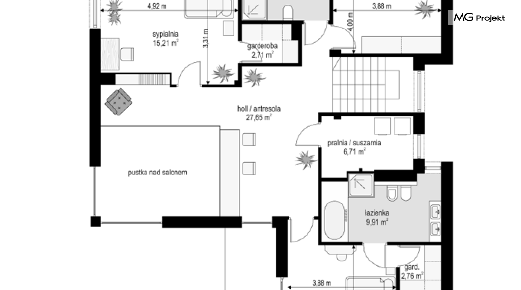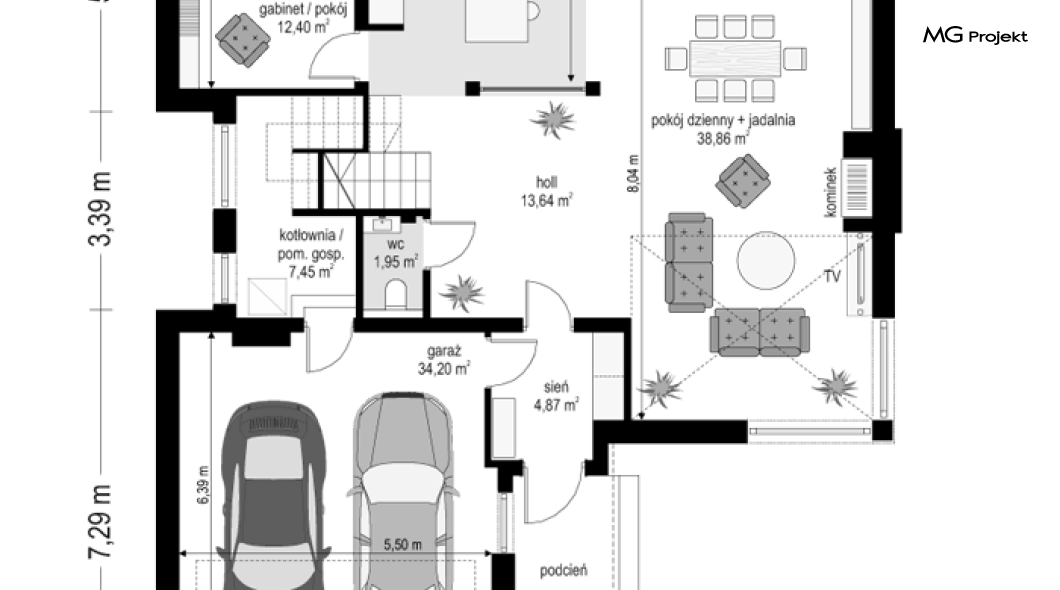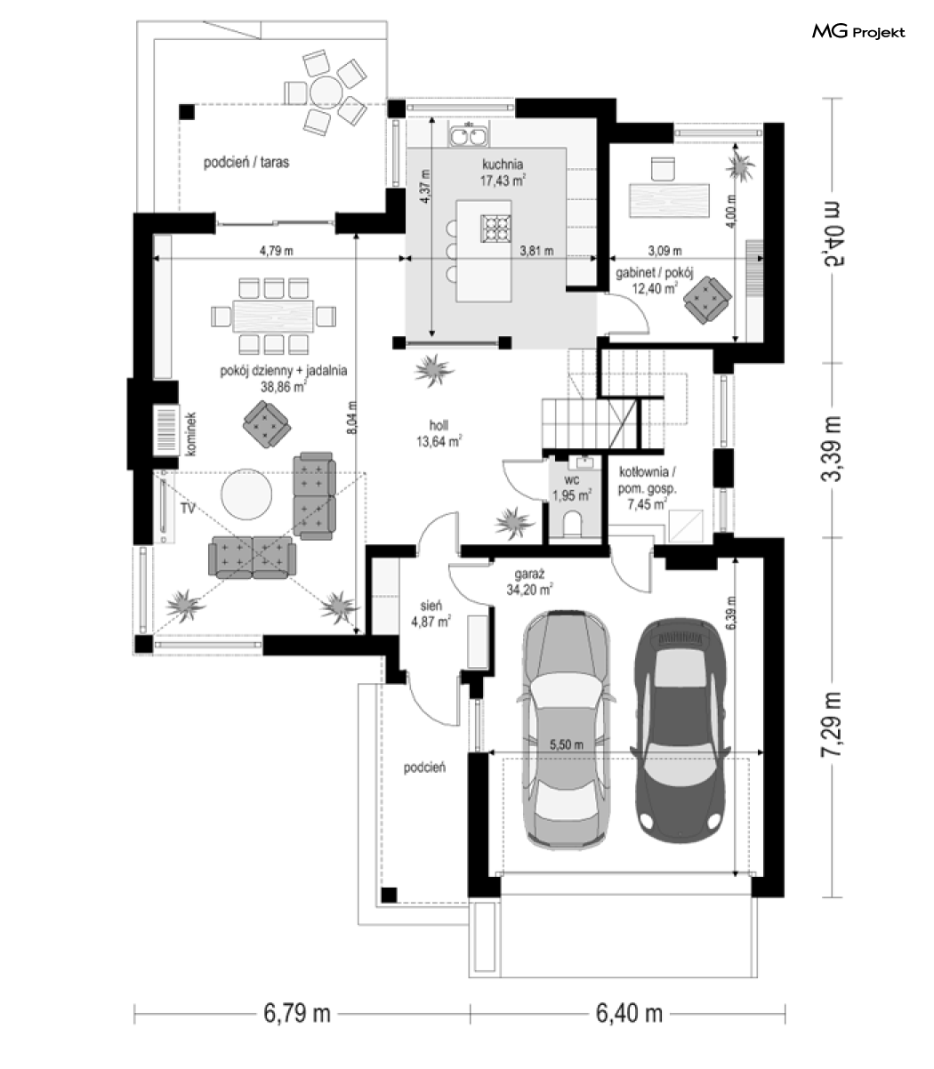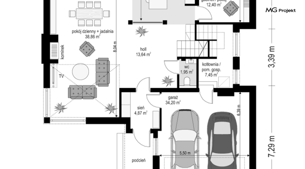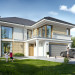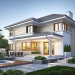 Projekt domu Riwiera 5 to kolejny z popularnych projektów z serii Riwiera, czyli zmodyfikowana i ulepszona wersja bazowego projektu. Projekt domu Riwiera 5 to dom bez podpiwniczenia, z dachem o wyższym kącie nachylenia, oraz z wariantowym wnętrzem piętra : z pustką i antresolą nad salonem, oraz bez pustki. To piętrowy dom, zbudowany na planie litery „T”, z wystającą nieco do przodu częścią garażową. Przykryty jest wielospadowym dachem krytym dachówką. Nowoczesna bryła ozdobiona została dużymi oknami, kamiennymi okładzinami ścian, boniowaniami, oraz gzymsami oddzielającymi parter i piętro. Szczególnie widowiskowe są narożne okna części dziennej, połączone z oknami piętra. Architektura domu jest nowoczesna, a jednocześnie powściągliwa, stonowana i nie przesadzona. Dzięki temu budynek nie traci na swojej przytulności. Dzięki układowi wnętrza i odpowiedniemu rozmieszczeniu okien budynek może być postawiony także na działce z wjazdem od południa. Wnętrze : na parterze zaprojektowano otwartą przestrzeń dzienną - w wersji z pustką z otwarciem sufitu nad salonem. Kuchnia z wyspą oddzielona od holu szklaną ścianą stanowi ozdobę salonu. Pokój dzienny, jadalnia i hol tworzą razem piękne wnętrze. Na parterze mamy też dodatkowy pokój ( gabinet lub sypialnię gościnną ), wc, kotłownię i dwustanowiskowy garaż. Na piętrze, w zależności od wersji ( z pustką lub bez ) mamy trzy lub cztery sypialnie, 2 łazienki, garderoby i pralnię. Sypialnia rodziców to oddzielny apartament z łazienką i dwiema garderobami. W wersji z pustką nad salonem mamy piękną antresolę będącą kontynuacją salonu. Projekt domu Riwiera 5 - wizualizacja frontu - odbicie lustrzane to atrakcyjny, nowoczesny dom, o energooszczędnych rozwiązaniach. Projekt można bardzo łatwo dostosować do standardu NF40. Pracownia posiada wersję odbicia lustrzanego oraz inne propozycje tej serii: bazowa (Projekt domu Riwiera), pomniejszonej (Projekt domu Riwiera 2), poszerzonej, o mniejszej głębokości (Projekt domu Rwiera 3), pomniejszonej ze zmienionym układem wewnętrznym (Projekt domu Riwiera 4). Zapraszamy!
