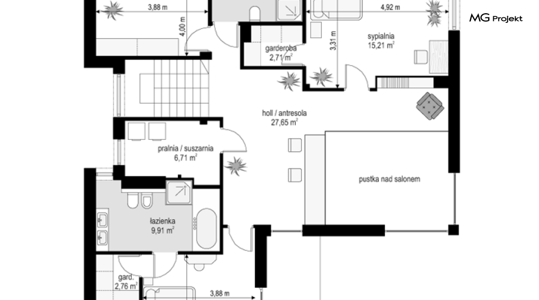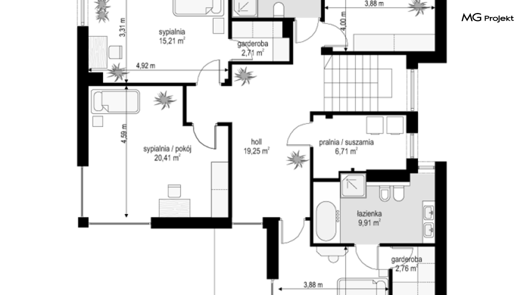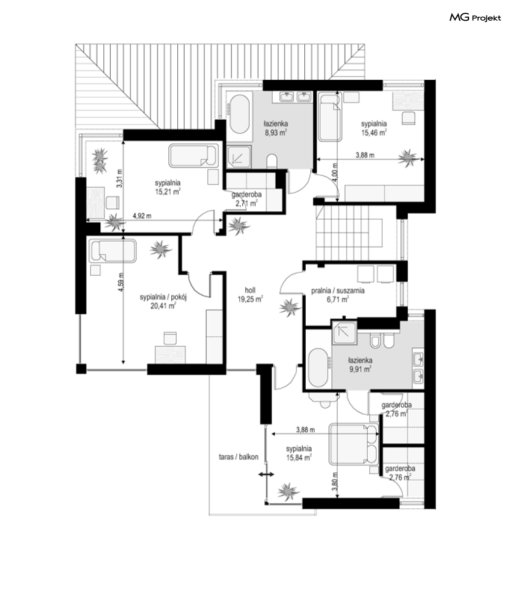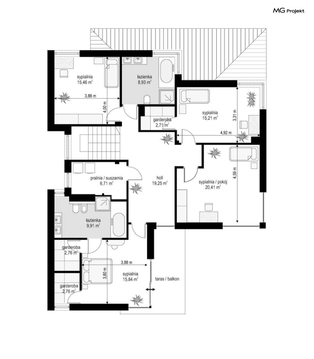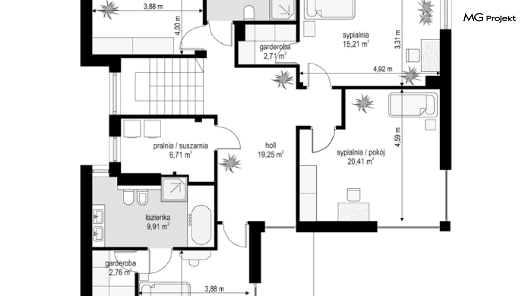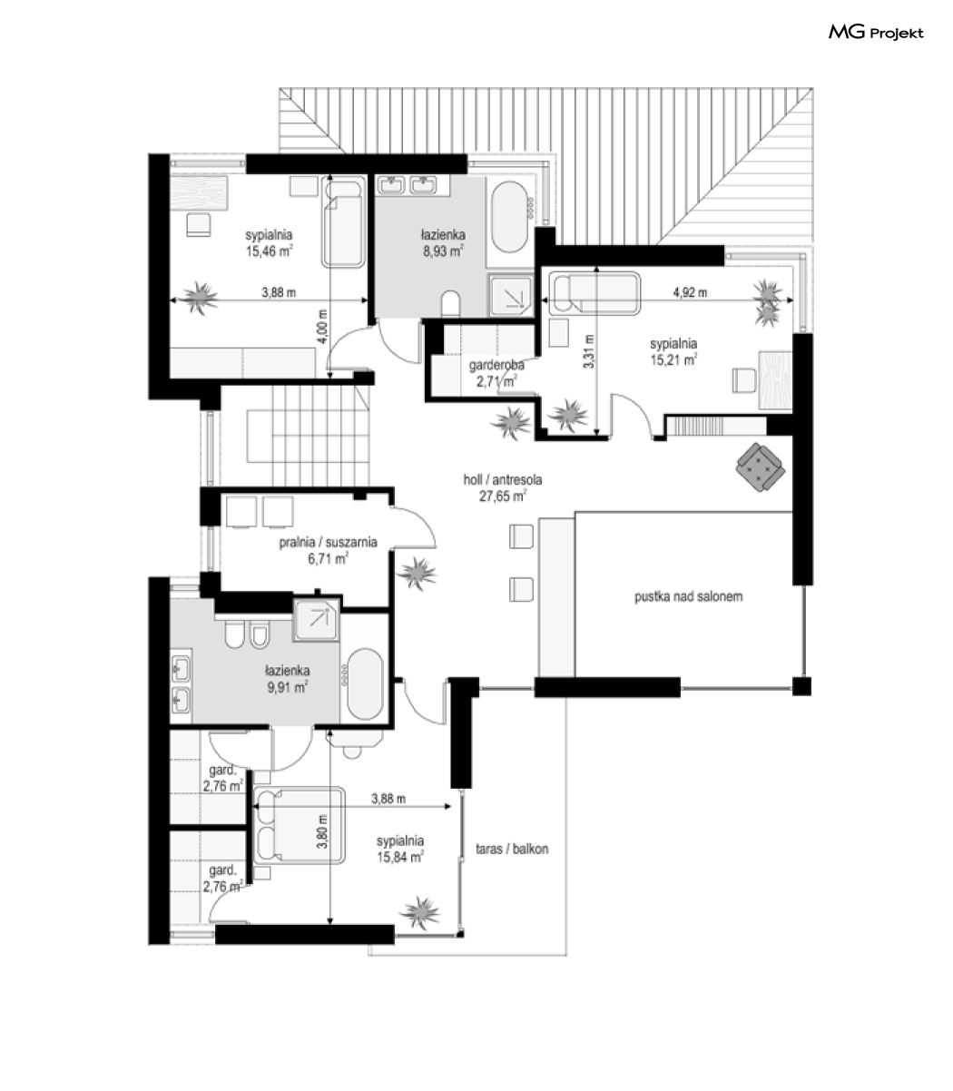 Projekt domu Riwiera 5 to kolejny z popularnych projektów z serii Riwiera, czyli zmodyfikowana i ulepszona wersja bazowego projektu. Projekt domu Riwiera 5 to dom bez podpiwniczenia, z dachem o wyższym kącie nachylenia, oraz z wariantowym wnętrzem piętra : z pustką i antresolą nad salonem, oraz bez pustki. To piętrowy dom, zbudowany na planie litery „T”, z wystającą nieco do przodu częścią garażową. Przykryty jest wielospadowym dachem krytym dachówką. Nowoczesna bryła ozdobiona została dużymi oknami, kamiennymi okładzinami ścian, boniowaniami, oraz gzymsami oddzielającymi parter i piętro. Szczególnie widowiskowe są narożne okna części dziennej, połączone z oknami piętra. Architektura domu jest nowoczesna, a jednocześnie powściągliwa, stonowana i nie przesadzona. Dzięki temu budynek nie traci na swojej przytulności. Dzięki układowi wnętrza i odpowiedniemu rozmieszczeniu okien budynek może być postawiony także na działce z wjazdem od południa. Wnętrze : na parterze zaprojektowano otwartą przestrzeń dzienną - w wersji z pustką z otwarciem sufitu nad salonem. Kuchnia z wyspą oddzielona od holu szklaną ścianą stanowi ozdobę salonu. Pokój dzienny, jadalnia i hol tworzą razem piękne wnętrze. Na parterze mamy też dodatkowy pokój ( gabinet lub sypialnię gościnną ), wc, kotłownię i dwustanowiskowy garaż. Na piętrze, w zależności od wersji ( z pustką lub bez ) mamy trzy lub cztery sypialnie, 2 łazienki, garderoby i pralnię. Sypialnia rodziców to oddzielny apartament z łazienką i dwiema garderobami. W wersji z pustką nad salonem mamy piękną antresolę będącą kontynuacją salonu. Projekt domu Riwiera 5 - wizualizacja frontu - odbicie lustrzane to atrakcyjny, nowoczesny dom, o energooszczędnych rozwiązaniach. Projekt można bardzo łatwo dostosować do standardu NF40. Pracownia posiada wersję odbicia lustrzanego oraz inne propozycje tej serii: bazowa (Projekt domu Riwiera), pomniejszonej (Projekt domu Riwiera 2), poszerzonej, o mniejszej głębokości (Projekt domu Rwiera 3), pomniejszonej ze zmienionym układem wewnętrznym (Projekt domu Riwiera 4). Zapraszamy!