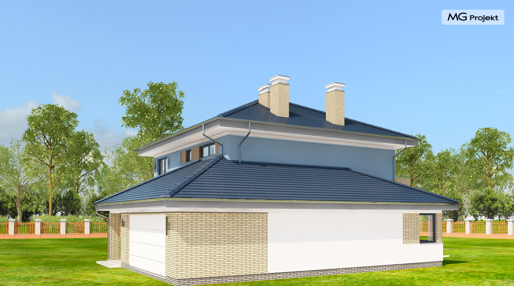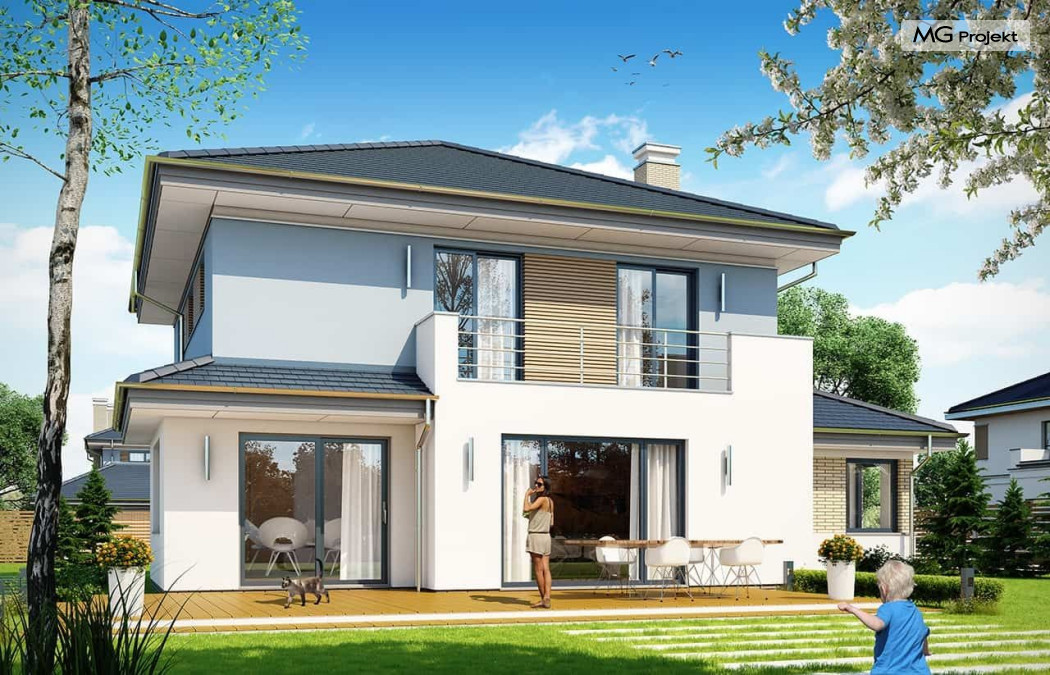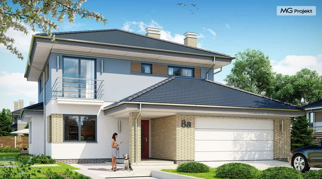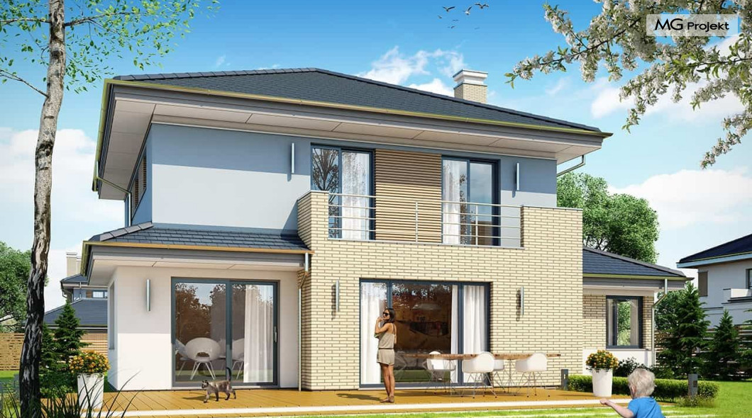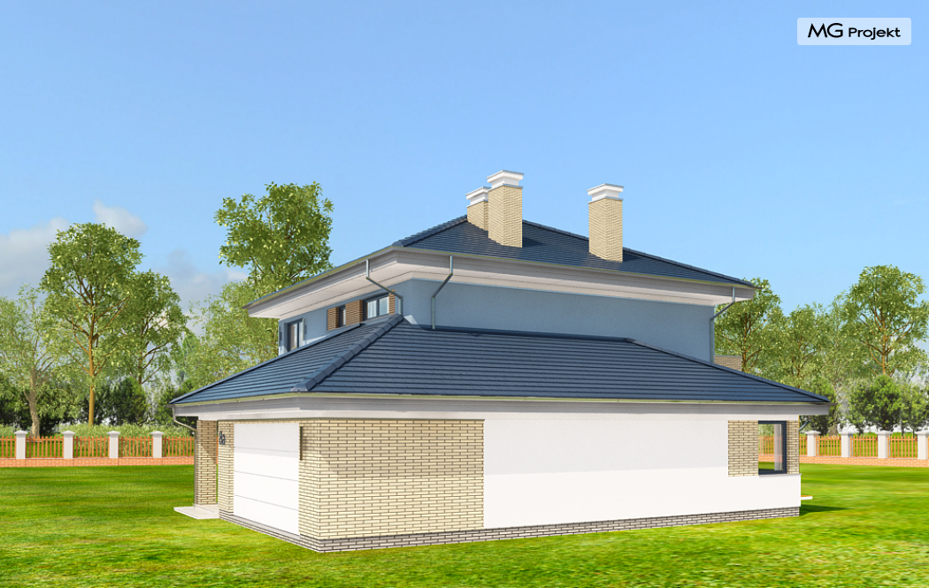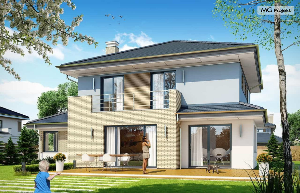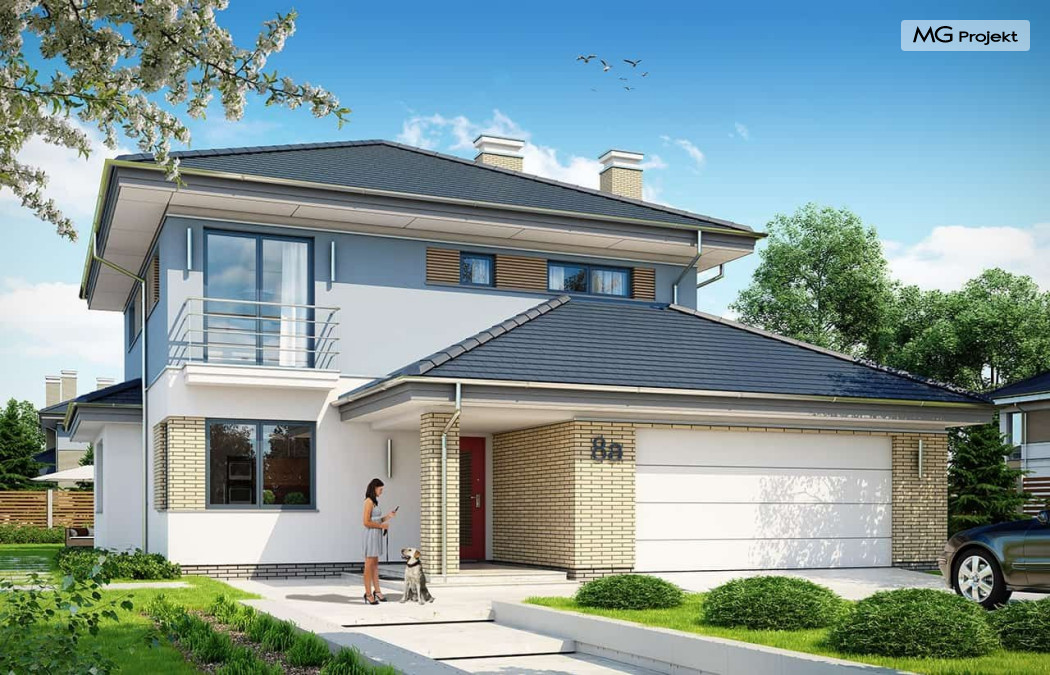Projekt domu Szmaragd 5 Prezentujemy kolejną wersję wariantową domu z serii Szmaragd. Tym razem jest to Szmaragd 5. Projekt domu jednorodzinnego piętrowego, z garażem częściowo wbudowanym w bryłę. Projekt domu Szmaragd 5 przeznaczony dla 4-5cioosobowej rodziny. Dom ma nowoczesną, ale nie agresywną architekturę. Bryła budynku jest zwarta, przykryta kopertowym dachem. Dzięki temu dom będzie łatwy i niedrogi zarówno w budowie, jak i późniejszym utrzymaniu. Parter domu to otwarta część dzienna, z salonem, holem, jadalnią i otwartą kuchnią. Razem pomieszczenia tworzą dużą wspólną przestrzeń. Dodatkowo na parterze przewidziano pokój - gabinet lub sypialnię gościnną, łazienkę, oraz duży garaż i kotłownię. Przy kuchni zmieściła się niewielka spiżarka. Na piętrze mamy trzy ładne sypialnie (sypialnia rodziców z garderobą), oraz bardzo ładną łazienkę. Jest też dodatkowe pomieszczenie, które może służyć jako pokój, albo domowe biuro, lub pralnię – garderobę. Nad piętrem mamy jeszcze sporej wielkości strych - magazyn domowych rupieci. Projekt domu Szmaragd 5 to komfortowy, wygodny dom. Ma w sobie wszystko czego można potrzebować od prawdziwego domu. Nowoczesny wygląd domu, kolorystyka i materiały tworzą spójną całość z przestronnym wnętrzem. Dom jest energooszczędny. Dobre ocieplenia i nowoczesne instalacje pozwalają go w łatwy sposób przystosować do standardu NF40. Projekt dostępny jest w odbiciu lustrzanym jak i w kilku innych wersjach : wersja bazowa (projekt domu Szmaragd), zbliźniaczona (projekt domu Szmaragd 2), wersja z dodatkowym pokojem na parterze (projekt domu Szmaragd 3), komfortowa ( projekt domu Szmaragd 4), oraz najnowszą (projekt domu Szmaragd 6). Zapraszamy !