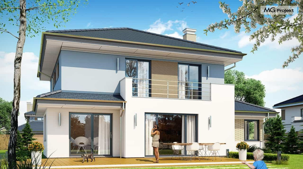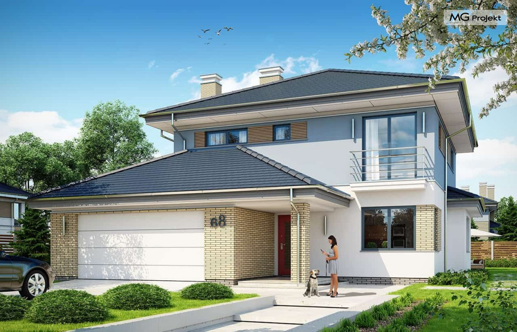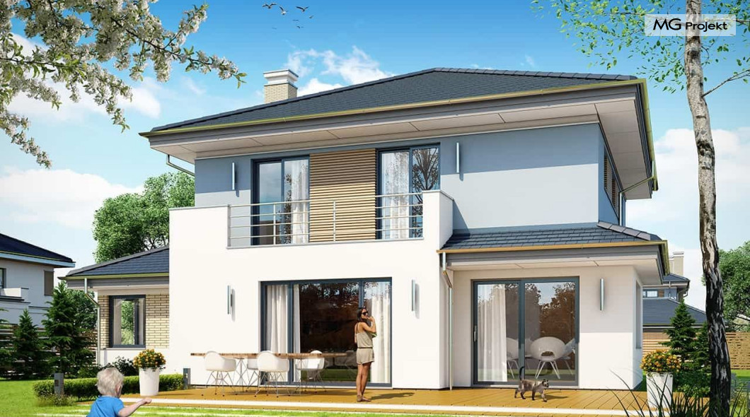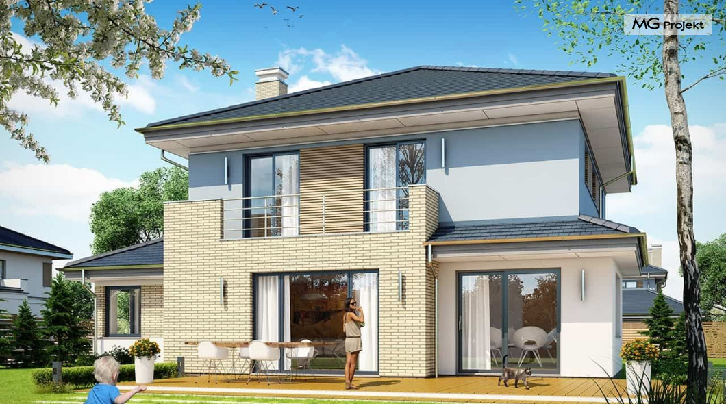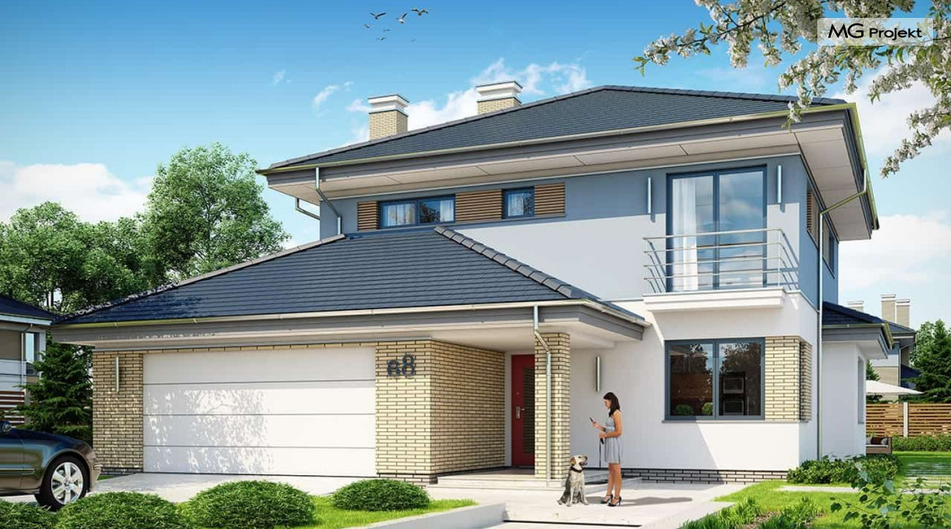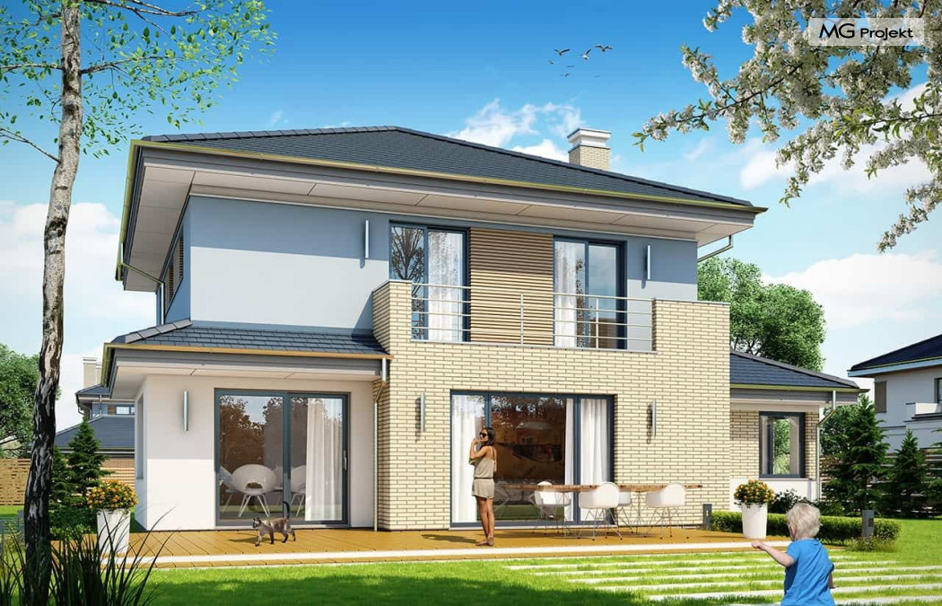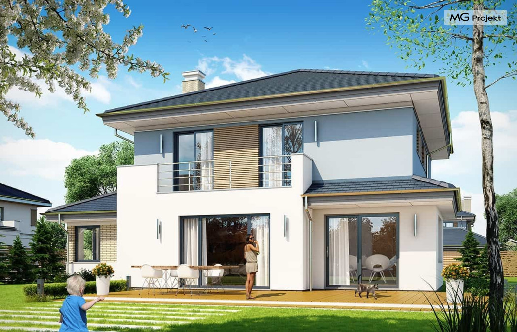 Projekt domu Szmaragd 5 Prezentujemy kolejną wersję wariantową domu z serii Szmaragd. Tym razem jest to Szmaragd 5. Projekt domu jednorodzinnego piętrowego, z garażem częściowo wbudowanym w bryłę. Projekt domu Szmaragd 5 przeznaczony dla 4-5cioosobowej rodziny. Dom ma nowoczesną, ale nie agresywną architekturę. Bryła budynku jest zwarta, przykryta kopertowym dachem. Dzięki temu dom będzie łatwy i niedrogi zarówno w budowie, jak i późniejszym utrzymaniu. Parter domu to otwarta część dzienna, z salonem, holem, jadalnią i otwartą kuchnią. Razem pomieszczenia tworzą dużą wspólną przestrzeń. Dodatkowo na parterze przewidziano pokój - gabinet lub sypialnię gościnną, łazienkę, oraz duży garaż i kotłownię. Przy kuchni zmieściła się niewielka spiżarka. Na piętrze mamy trzy ładne sypialnie (sypialnia rodziców z garderobą), oraz bardzo ładną łazienkę. Jest też dodatkowe pomieszczenie, które może służyć jako pokój, albo domowe biuro, lub pralnię – garderobę. Nad piętrem mamy jeszcze sporej wielkości strych - magazyn domowych rupieci. Projekt domu Szmaragd 5 to komfortowy, wygodny dom. Ma w sobie wszystko czego można potrzebować od prawdziwego domu. Nowoczesny wygląd domu, kolorystyka i materiały tworzą spójną całość z przestronnym wnętrzem. Dom jest energooszczędny. Dobre ocieplenia i nowoczesne instalacje pozwalają go w łatwy sposób przystosować do standardu NF40. Projekt dostępny jest w odbiciu lustrzanym jak i w kilku innych wersjach : wersja bazowa (projekt domu Szmaragd), zbliźniaczona (projekt domu Szmaragd 2), wersja z dodatkowym pokojem na parterze (projekt domu Szmaragd 3), komfortowa ( projekt domu Szmaragd 4), oraz najnowszą (projekt domu Szmaragd 6). Zapraszamy !