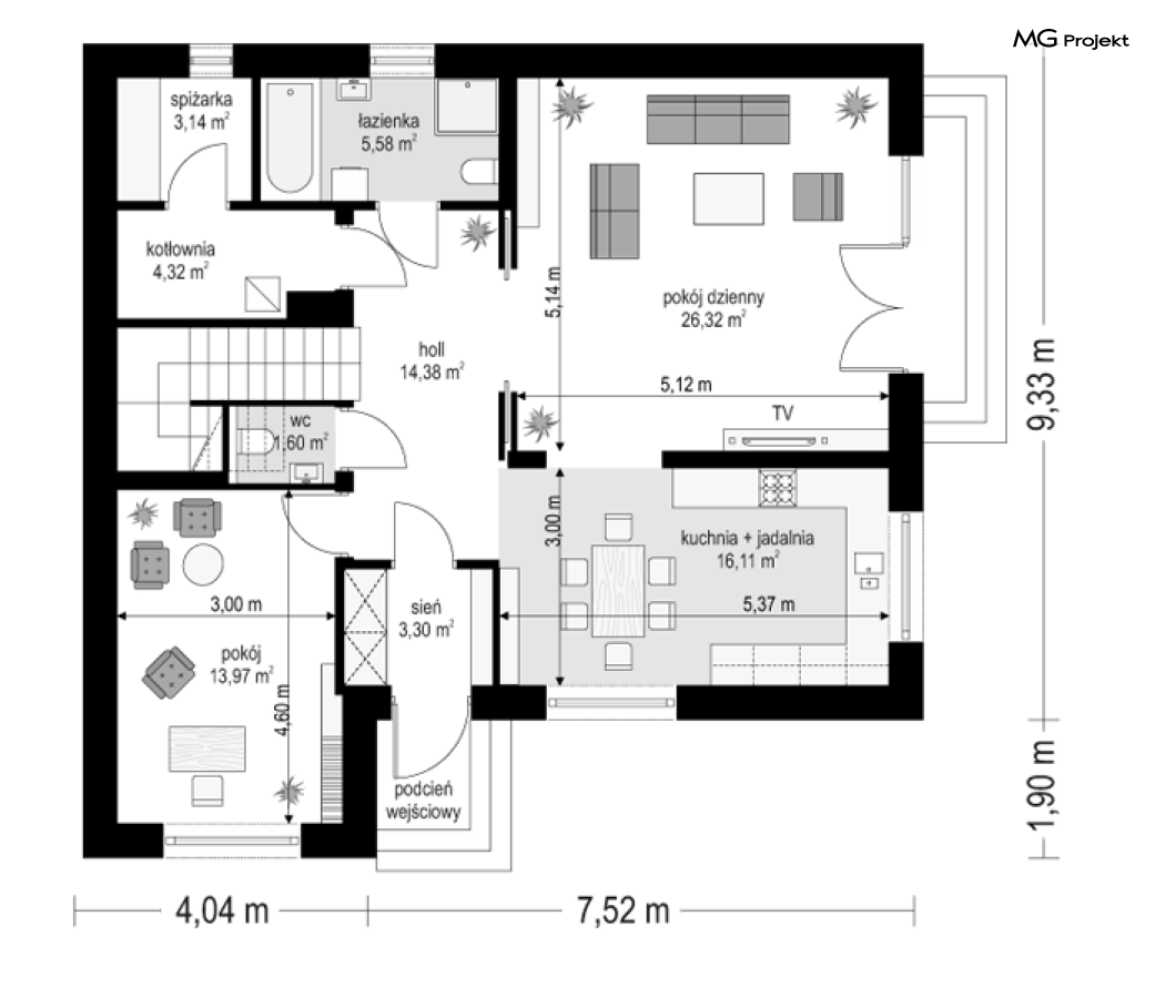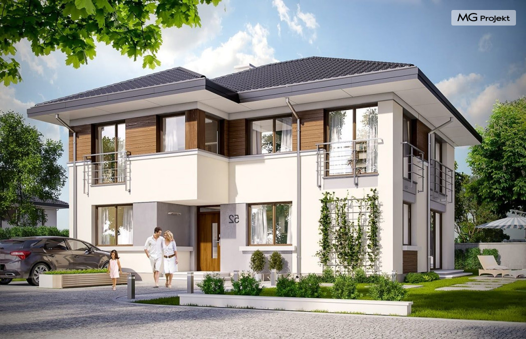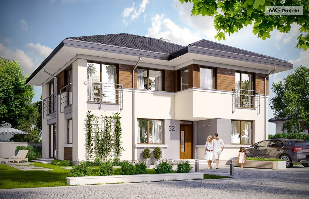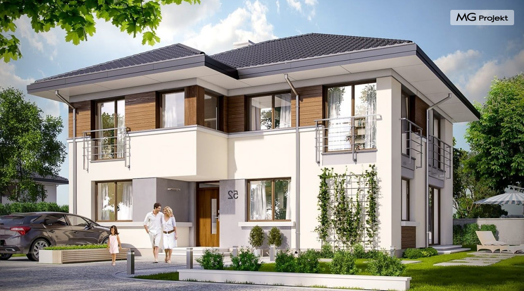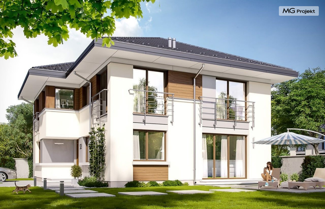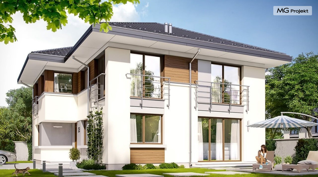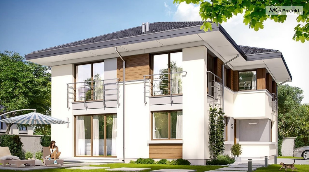 Projekt domu Tytan 2 jest kolejną wersją wariantową popularnego projektu Tytan. Tytan 2 występuje w trzech wersjach wariantowych: prezentowany Tytan 2, następnie Tytan 2 wariant B - dom z mniejszą liczbą okien balkonowych na parterze i na piętrze ( z mniejszą liczbą przeszkleń ), oraz Tytan 2 wariant C - projekt z dachem o większym kącie nachylenia (30 stopni). Każda z wymienionych wersji projektu jest bardzo podobne, wszystkie są zbudowane na tej samej bryle, o tej samej wielkości. Projekt domu Tytan 2 to budynek piętrowy, przeznaczony dla 5-7 osobowej rodziny. Dom dla inwestorów chcących wycisnąć maksymalnie dużą ilość pokoi z niedużej przestrzeni. Aby maksymalnie wykorzystać przestrzeń wnętrza zrezygnowano z garażu. dom jest maksymalnie prosty i praktyczny. Na parterze mamy salon, kuchnię z aneksem jadalnym, dodatkowy spory pokój ( np. dla seniorów ), oraz łazienkę i pomieszczenia gospodarcze. Na piętrze mamy cztery pełnowymiarowe pokoje, dużą garderobę i bardzo ładną łazienkę. A wszystko na 170 metrach powierzchni. Bryła domu jest prosta, ale wkomponowana w nowoczesną ładną architekturę. Elewacje piętrowego domu podzielono na poziome pasy, obniżając optycznie bryłę. Projekt domu Tytan 2 nadaje się na działkę z ogródkiem z boku - tam, gdzie mamy niekorzystne usytuowanie wjazdu na działkę w stosunku do nasłonecznienia. Dom jest bardzo dobrze ocieplony, energooszczędny. A dzięki prostej bryle będzie łatwy i niedrogi w budowie. Zapraszamy do zapoznania się z pełną ofertą pracowni MG Projekt: projekt domu Tytan, projekt domu Tytan 2B, projekt domu Tytan 3, projekt domu Tytan 4.