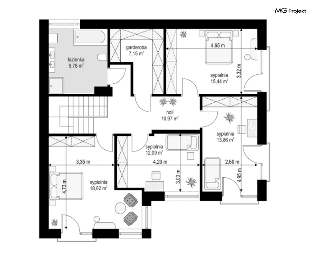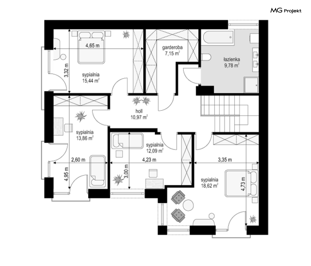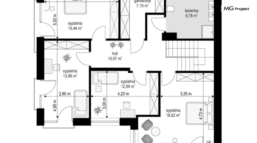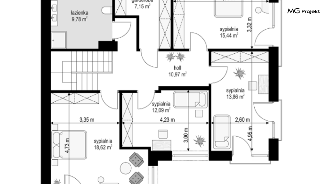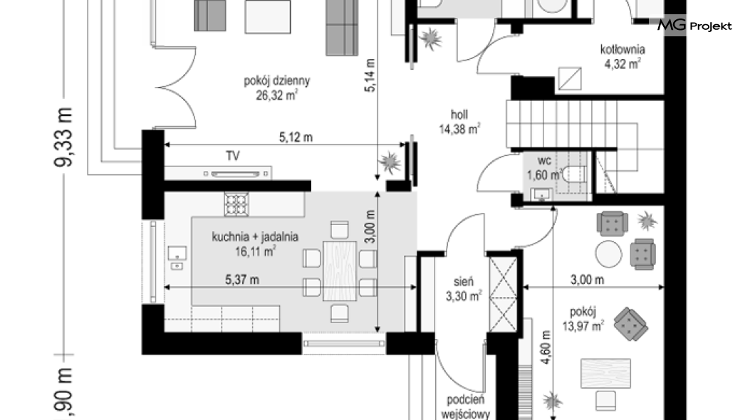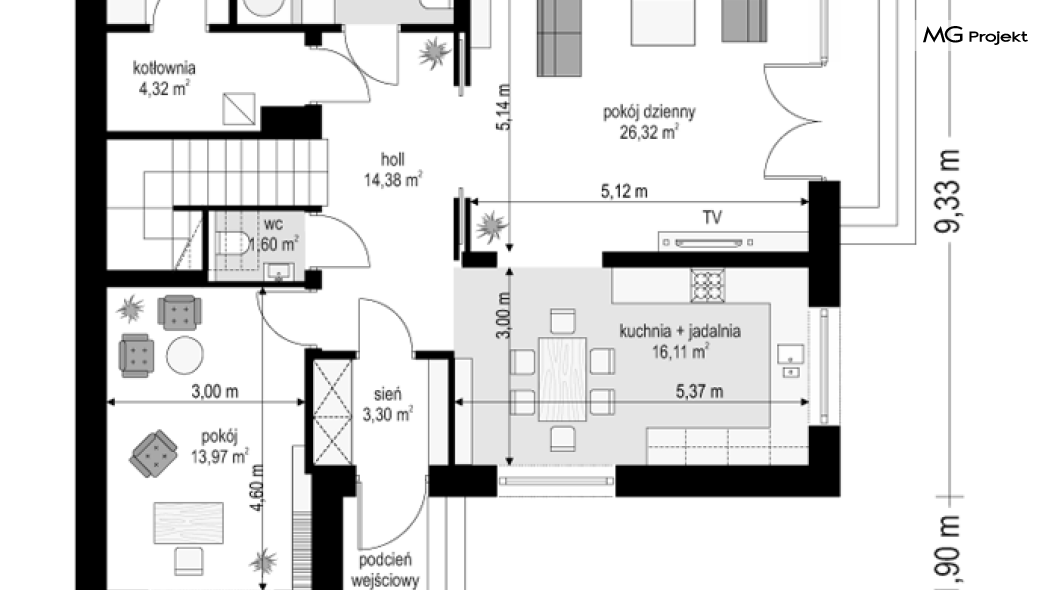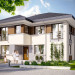 Projekt domu Tytan 2 jest kolejną wersją wariantową popularnego projektu Tytan. Tytan 2 występuje w trzech wersjach wariantowych: prezentowany Tytan 2, następnie Tytan 2 wariant B - dom z mniejszą liczbą okien balkonowych na parterze i na piętrze ( z mniejszą liczbą przeszkleń ), oraz Tytan 2 wariant C - projekt z dachem o większym kącie nachylenia (30 stopni). Każda z wymienionych wersji projektu jest bardzo podobne, wszystkie są zbudowane na tej samej bryle, o tej samej wielkości. Projekt domu Tytan 2 to budynek piętrowy, przeznaczony dla 5-7 osobowej rodziny. Dom dla inwestorów chcących wycisnąć maksymalnie dużą ilość pokoi z niedużej przestrzeni. Aby maksymalnie wykorzystać przestrzeń wnętrza zrezygnowano z garażu. dom jest maksymalnie prosty i praktyczny. Na parterze mamy salon, kuchnię z aneksem jadalnym, dodatkowy spory pokój ( np. dla seniorów ), oraz łazienkę i pomieszczenia gospodarcze. Na piętrze mamy cztery pełnowymiarowe pokoje, dużą garderobę i bardzo ładną łazienkę. A wszystko na 170 metrach powierzchni. Bryła domu jest prosta, ale wkomponowana w nowoczesną ładną architekturę. Elewacje piętrowego domu podzielono na poziome pasy, obniżając optycznie bryłę. Projekt domu Tytan 2 nadaje się na działkę z ogródkiem z boku - tam, gdzie mamy niekorzystne usytuowanie wjazdu na działkę w stosunku do nasłonecznienia. Dom jest bardzo dobrze ocieplony, energooszczędny. A dzięki prostej bryle będzie łatwy i niedrogi w budowie. Zapraszamy do zapoznania się z pełną ofertą pracowni MG Projekt: projekt domu Tytan, projekt domu Tytan 2B, projekt domu Tytan 3, projekt domu Tytan 4.