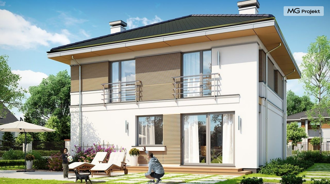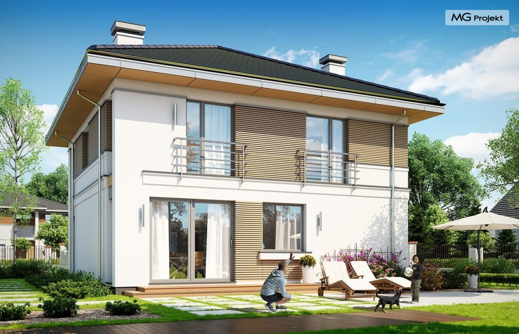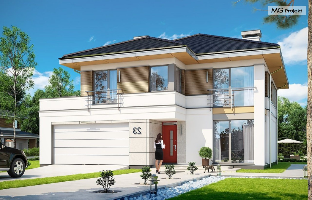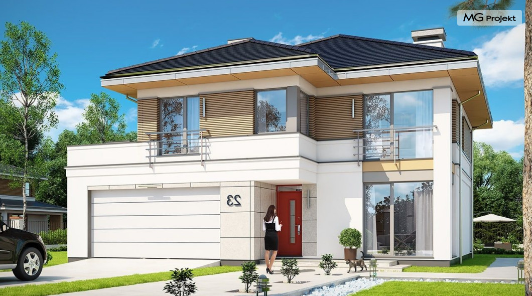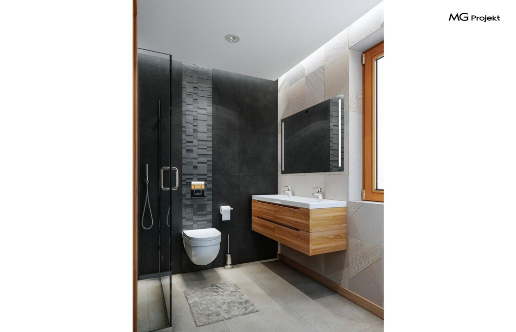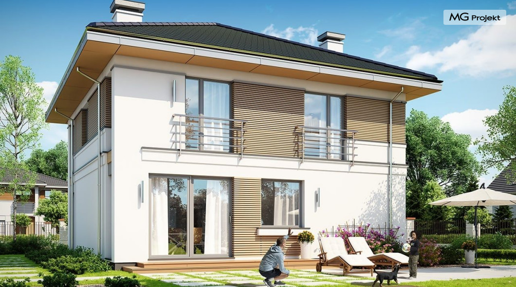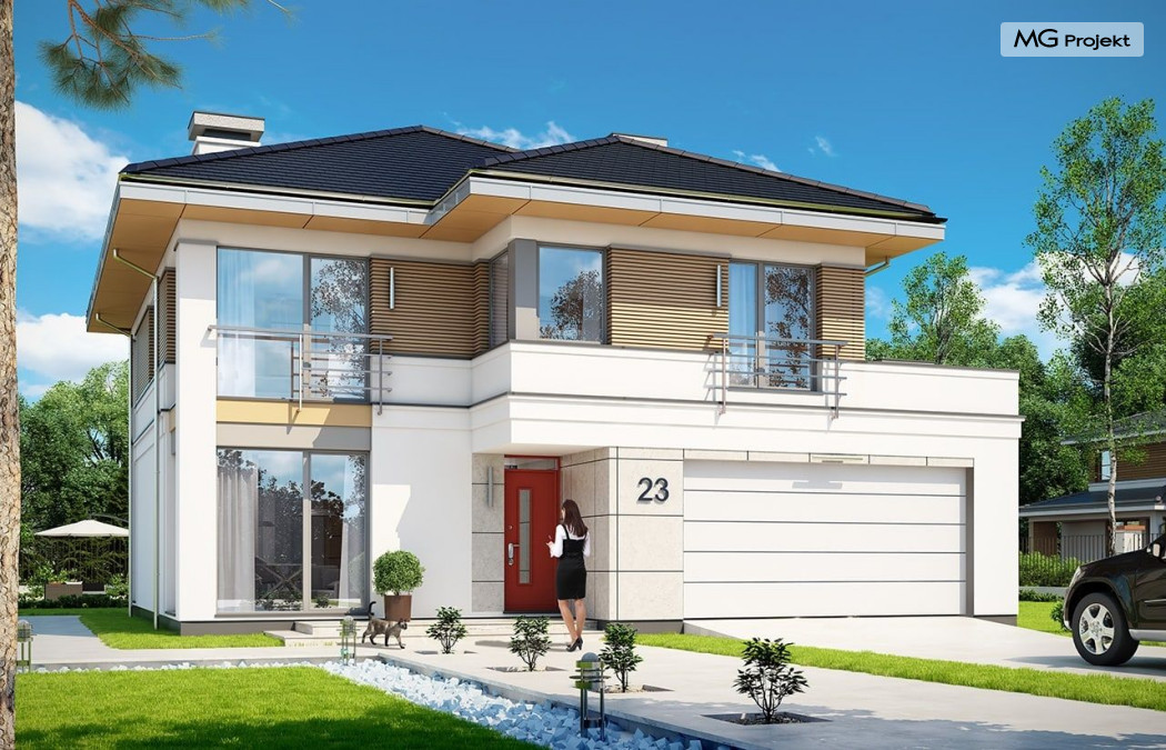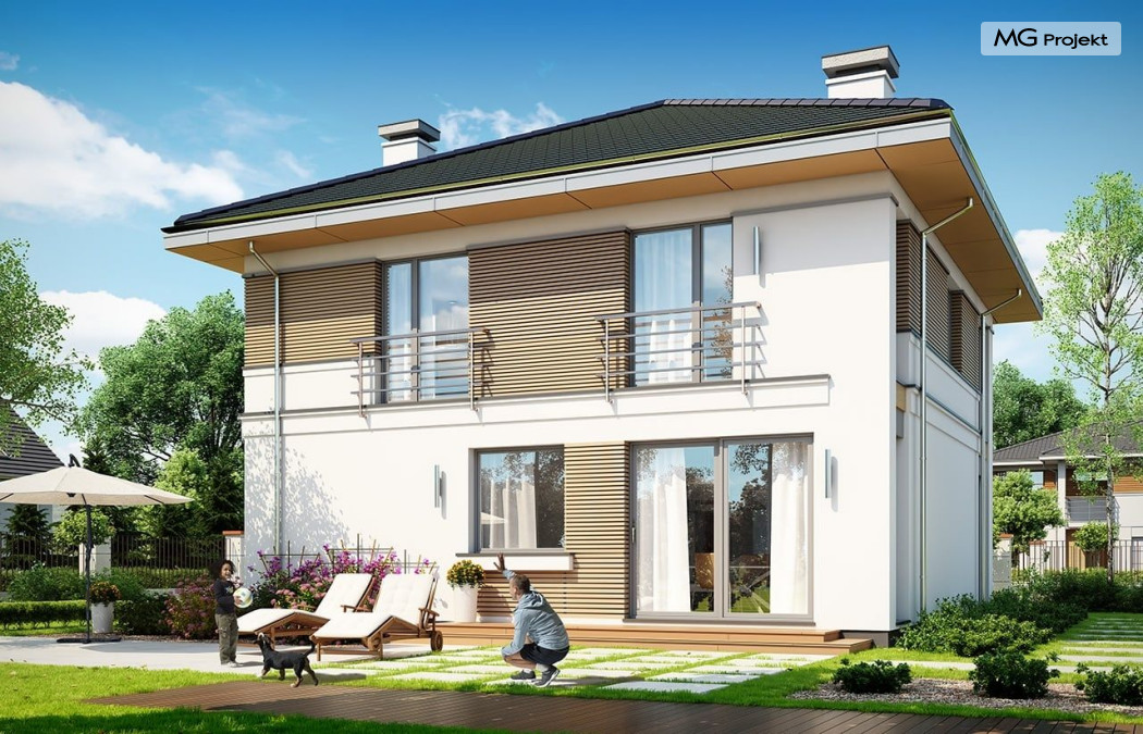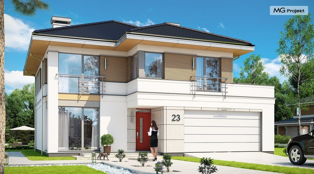 Projekt domu Tytan 4 jest nową wersją popularnego projektu Tytan. Piętrowy dom, przeznaczony dla 4-6cioosobowej rodziny, o zwartej bryle, zbudowany na planie prostokąta, z dobudowanym garażem dwustanowiskowym. Budynek doskonale nadaje się na działkę w niekorzystnym nasłonecznieniem (ze słońcem od strony wjazdu). Prosta bryła, nowoczesny wyraz architektoniczny, połączony z funkcjonalnym wnętrzem, daje bardzo korzystne połączenie. Projekt domu Tytan 4 mimo, że nie ma dużej powierzchni użytkowej, sprawia wrażenie przestronnego i komfortowego. Na parterze zaprojektowaną jedną otwartą przestrzeń dzienną z holem, salonem, aneksem jadalnym i kuchnią. Na piętrze zaprojektowano apartament rodziców, z dużą sypialnią, łazienką i garderobą, dwie sypialnie dzieci z łazienką, oraz dodatkowy pokój (gabinet, sypialnię gościnną). Na parterze mamy dodatkowo,duży dwustanowiskowy garaż, oraz kotłownię, a przy kuchni spiżarnię. Prosta konstrukcja domu, jego zwarta bryła zapewnią niedrogą i nieskomplikowaną budowę, oraz niewielkie późniejsze koszty utrzymania budynku. Zastosowane nowoczesne technologie, dobre izolacje polepszają energooszczędność budynku. Wygląd zewnętrzny domu : elewacje podzielono na poziome pasy wykończone różnymi materiałami (tynk, drewno, cegła klinkierowa). To daje wrażenie nowoczesności i właściwych proporcji. Detale wykończeń elewacji : gzymsy, parapety, okładziny ścian, czy duże przeszklenia - wszystkie one tworzą atrakcyjny styl domu. Projekt domu Tytan 4 to solidny, niewielki, funkcjonalnie zaprojektowany dom, w sam raz dla kilkuosobowej rodziny pragnącej mieszkać z nowoczesnej architekturze. Prostota konstrukcji pozwoli utrzymać koszt budowy w granicach rozsądku, a energooszczędne rozwiązania pozwolą osiągnąć niskie koszty utrzymania. Tytan 4 dostępny jest także odbiciu lustrzanym. Zapraszamy do zapoznania się z pełną ofertą pracowni MG Projekt: projekt domu Tytan, projekt domu Tytan 2, projekt domu Tytan 2B, projekt domu Tytan 3.