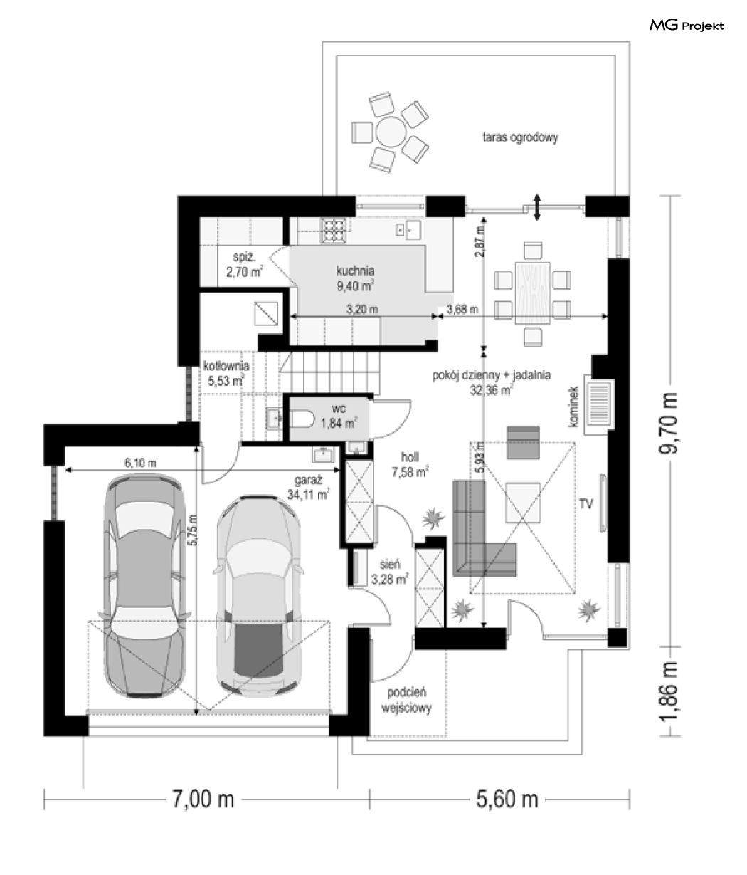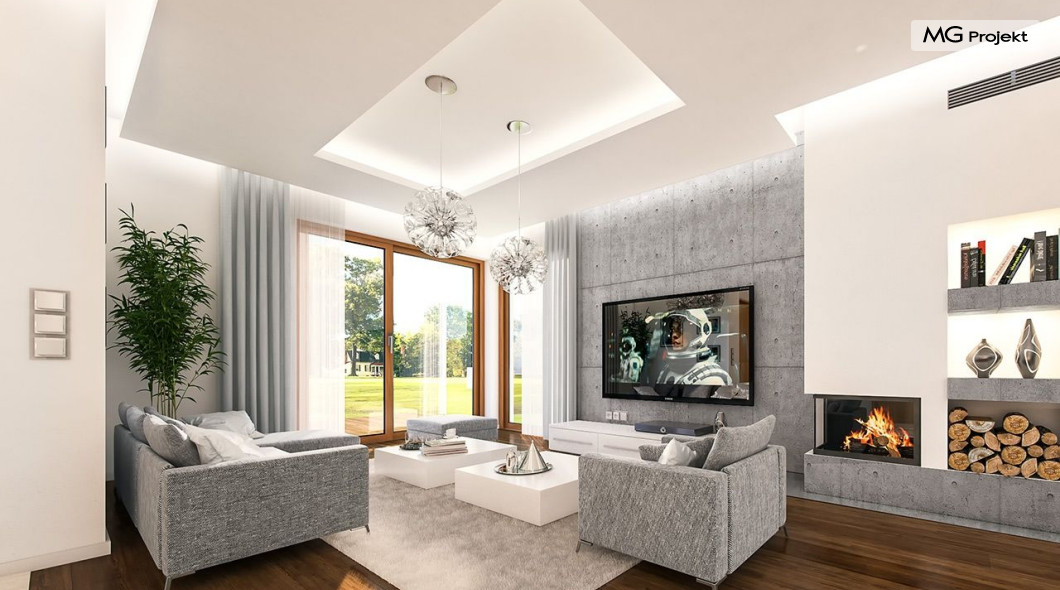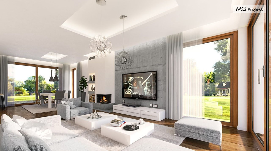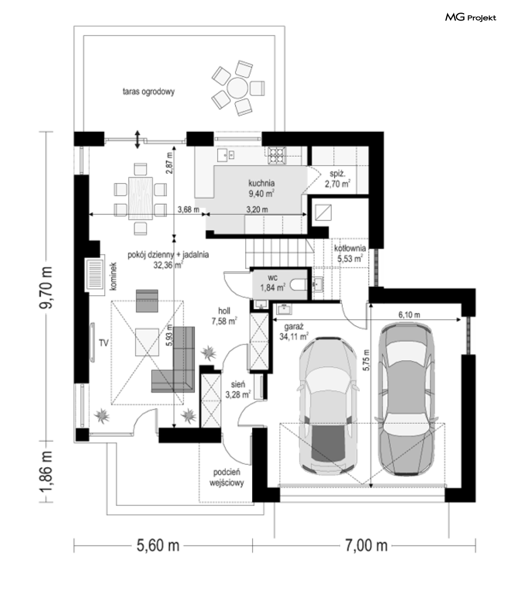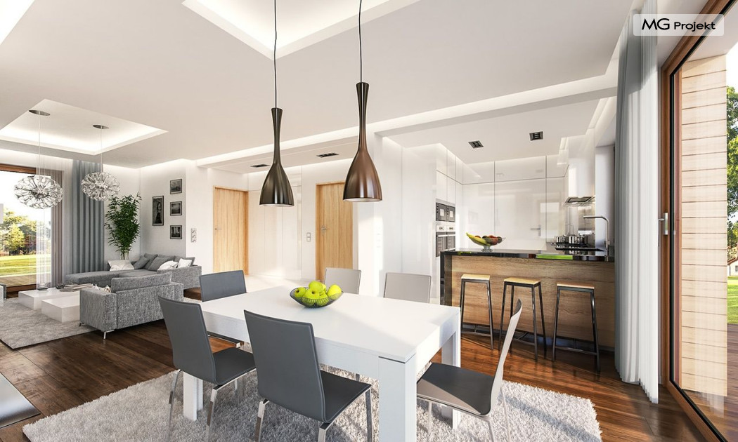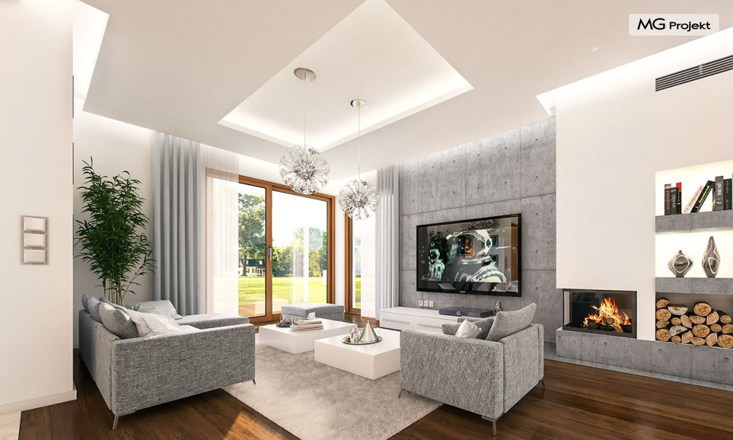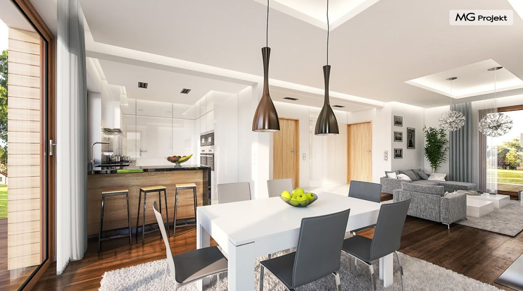 Projekt domu Tytan 4 jest nową wersją popularnego projektu Tytan. Piętrowy dom, przeznaczony dla 4-6cioosobowej rodziny, o zwartej bryle, zbudowany na planie prostokąta, z dobudowanym garażem dwustanowiskowym. Budynek doskonale nadaje się na działkę w niekorzystnym nasłonecznieniem (ze słońcem od strony wjazdu). Prosta bryła, nowoczesny wyraz architektoniczny, połączony z funkcjonalnym wnętrzem, daje bardzo korzystne połączenie. Projekt domu Tytan 4 mimo, że nie ma dużej powierzchni użytkowej, sprawia wrażenie przestronnego i komfortowego. Na parterze zaprojektowaną jedną otwartą przestrzeń dzienną z holem, salonem, aneksem jadalnym i kuchnią. Na piętrze zaprojektowano apartament rodziców, z dużą sypialnią, łazienką i garderobą, dwie sypialnie dzieci z łazienką, oraz dodatkowy pokój (gabinet, sypialnię gościnną). Na parterze mamy dodatkowo,duży dwustanowiskowy garaż, oraz kotłownię, a przy kuchni spiżarnię. Prosta konstrukcja domu, jego zwarta bryła zapewnią niedrogą i nieskomplikowaną budowę, oraz niewielkie późniejsze koszty utrzymania budynku. Zastosowane nowoczesne technologie, dobre izolacje polepszają energooszczędność budynku. Wygląd zewnętrzny domu : elewacje podzielono na poziome pasy wykończone różnymi materiałami (tynk, drewno, cegła klinkierowa). To daje wrażenie nowoczesności i właściwych proporcji. Detale wykończeń elewacji : gzymsy, parapety, okładziny ścian, czy duże przeszklenia - wszystkie one tworzą atrakcyjny styl domu. Projekt domu Tytan 4 to solidny, niewielki, funkcjonalnie zaprojektowany dom, w sam raz dla kilkuosobowej rodziny pragnącej mieszkać z nowoczesnej architekturze. Prostota konstrukcji pozwoli utrzymać koszt budowy w granicach rozsądku, a energooszczędne rozwiązania pozwolą osiągnąć niskie koszty utrzymania. Tytan 4 dostępny jest także odbiciu lustrzanym. Zapraszamy do zapoznania się z pełną ofertą pracowni MG Projekt: projekt domu Tytan, projekt domu Tytan 2, projekt domu Tytan 2B, projekt domu Tytan 3.