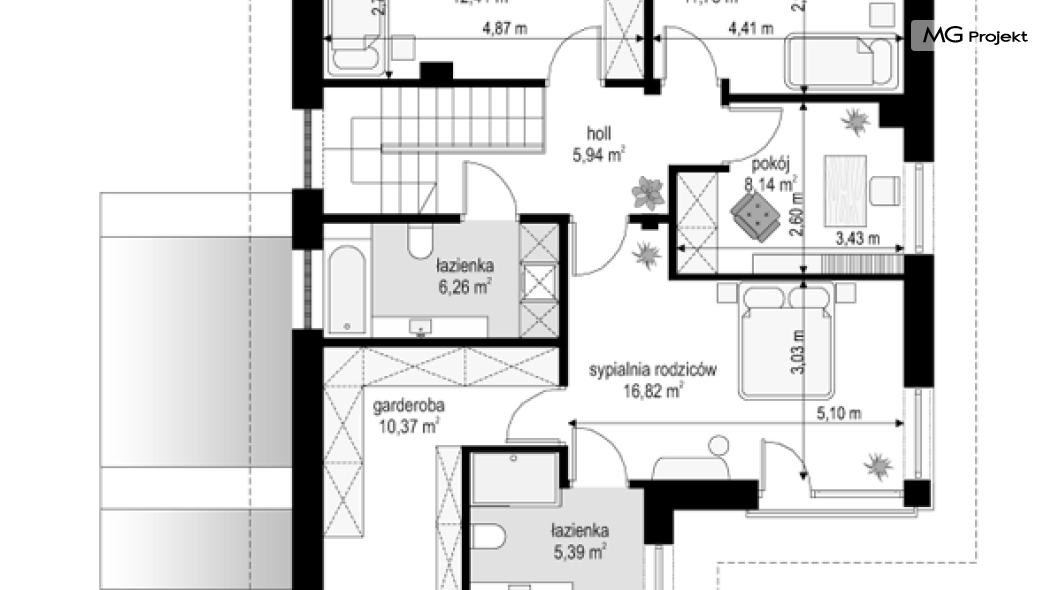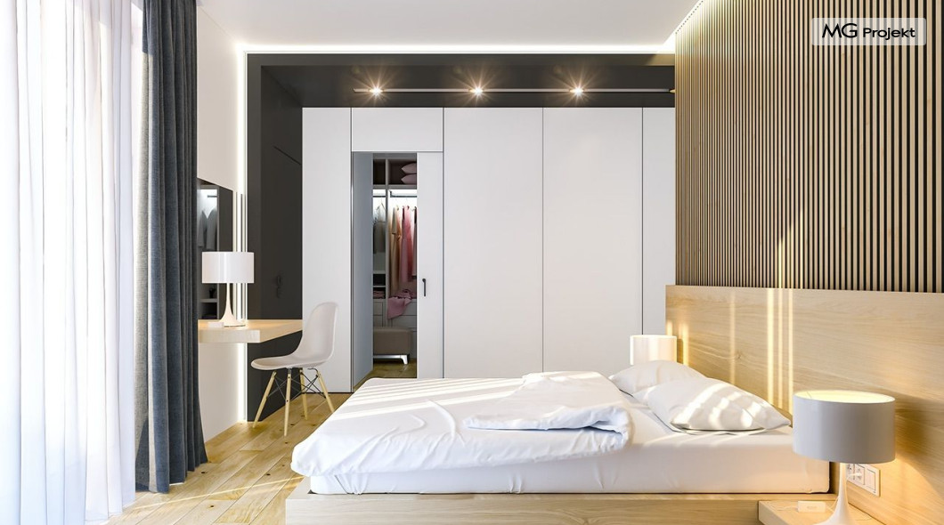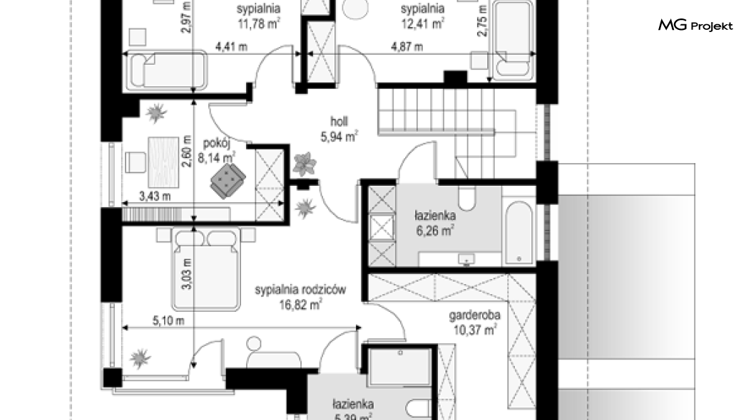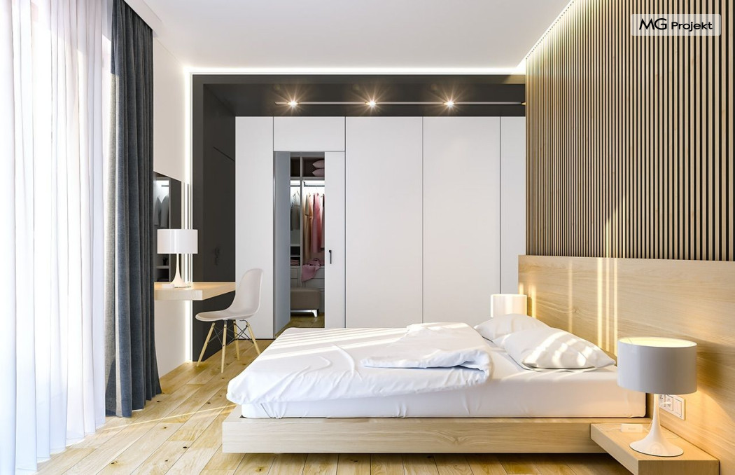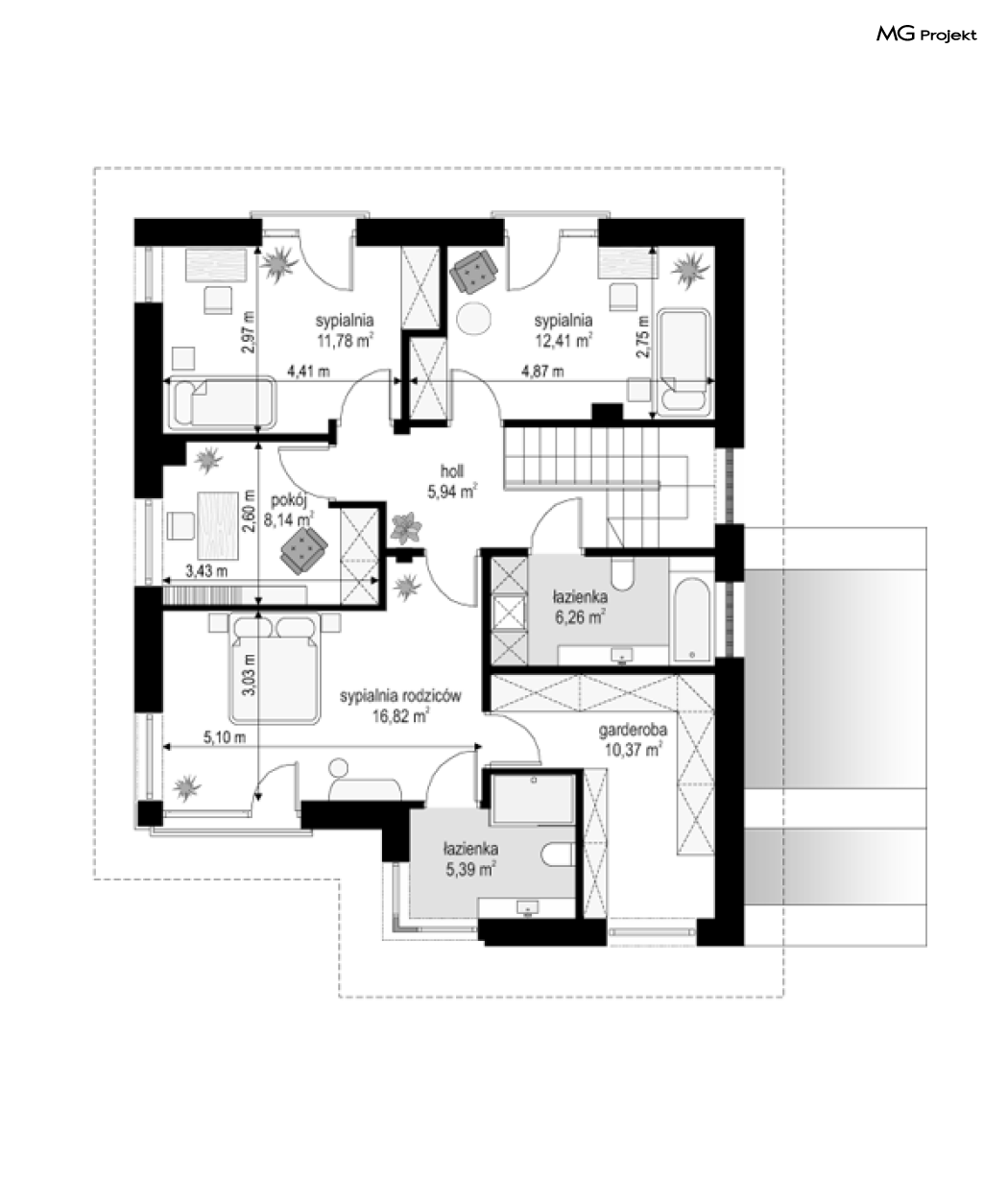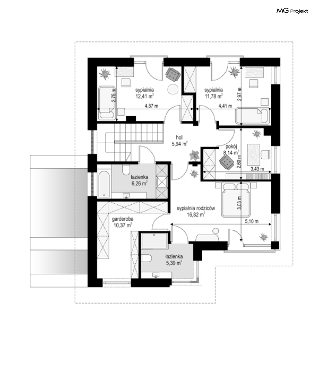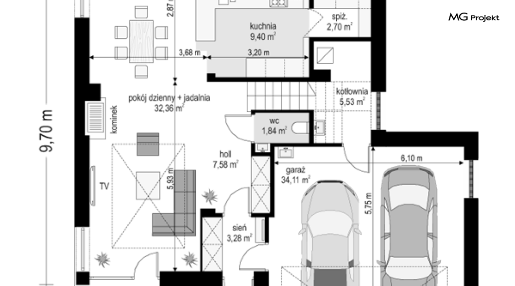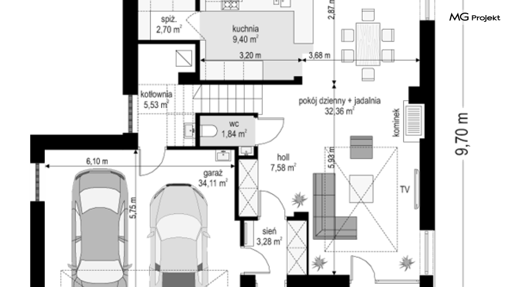 Projekt domu Tytan 4 jest nową wersją popularnego projektu Tytan. Piętrowy dom, przeznaczony dla 4-6cioosobowej rodziny, o zwartej bryle, zbudowany na planie prostokąta, z dobudowanym garażem dwustanowiskowym. Budynek doskonale nadaje się na działkę w niekorzystnym nasłonecznieniem (ze słońcem od strony wjazdu). Prosta bryła, nowoczesny wyraz architektoniczny, połączony z funkcjonalnym wnętrzem, daje bardzo korzystne połączenie. Projekt domu Tytan 4 mimo, że nie ma dużej powierzchni użytkowej, sprawia wrażenie przestronnego i komfortowego. Na parterze zaprojektowaną jedną otwartą przestrzeń dzienną z holem, salonem, aneksem jadalnym i kuchnią. Na piętrze zaprojektowano apartament rodziców, z dużą sypialnią, łazienką i garderobą, dwie sypialnie dzieci z łazienką, oraz dodatkowy pokój (gabinet, sypialnię gościnną). Na parterze mamy dodatkowo,duży dwustanowiskowy garaż, oraz kotłownię, a przy kuchni spiżarnię. Prosta konstrukcja domu, jego zwarta bryła zapewnią niedrogą i nieskomplikowaną budowę, oraz niewielkie późniejsze koszty utrzymania budynku. Zastosowane nowoczesne technologie, dobre izolacje polepszają energooszczędność budynku. Wygląd zewnętrzny domu : elewacje podzielono na poziome pasy wykończone różnymi materiałami (tynk, drewno, cegła klinkierowa). To daje wrażenie nowoczesności i właściwych proporcji. Detale wykończeń elewacji : gzymsy, parapety, okładziny ścian, czy duże przeszklenia - wszystkie one tworzą atrakcyjny styl domu. Projekt domu Tytan 4 to solidny, niewielki, funkcjonalnie zaprojektowany dom, w sam raz dla kilkuosobowej rodziny pragnącej mieszkać z nowoczesnej architekturze. Prostota konstrukcji pozwoli utrzymać koszt budowy w granicach rozsądku, a energooszczędne rozwiązania pozwolą osiągnąć niskie koszty utrzymania. Tytan 4 dostępny jest także odbiciu lustrzanym. Zapraszamy do zapoznania się z pełną ofertą pracowni MG Projekt: projekt domu Tytan, projekt domu Tytan 2, projekt domu Tytan 2B, projekt domu Tytan 3.