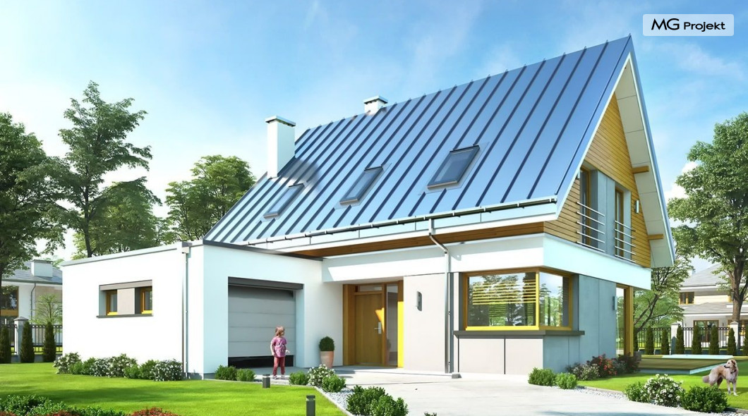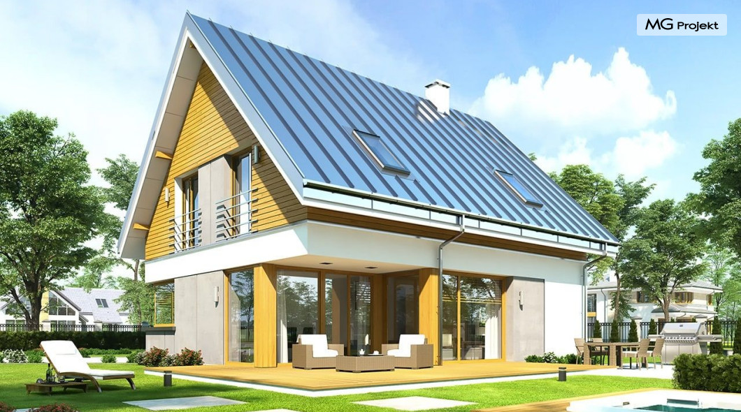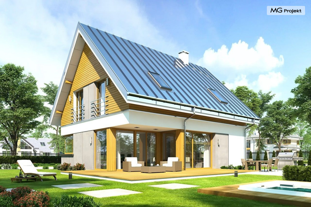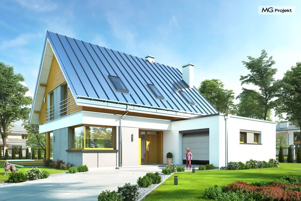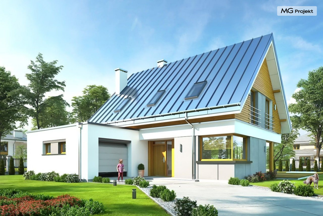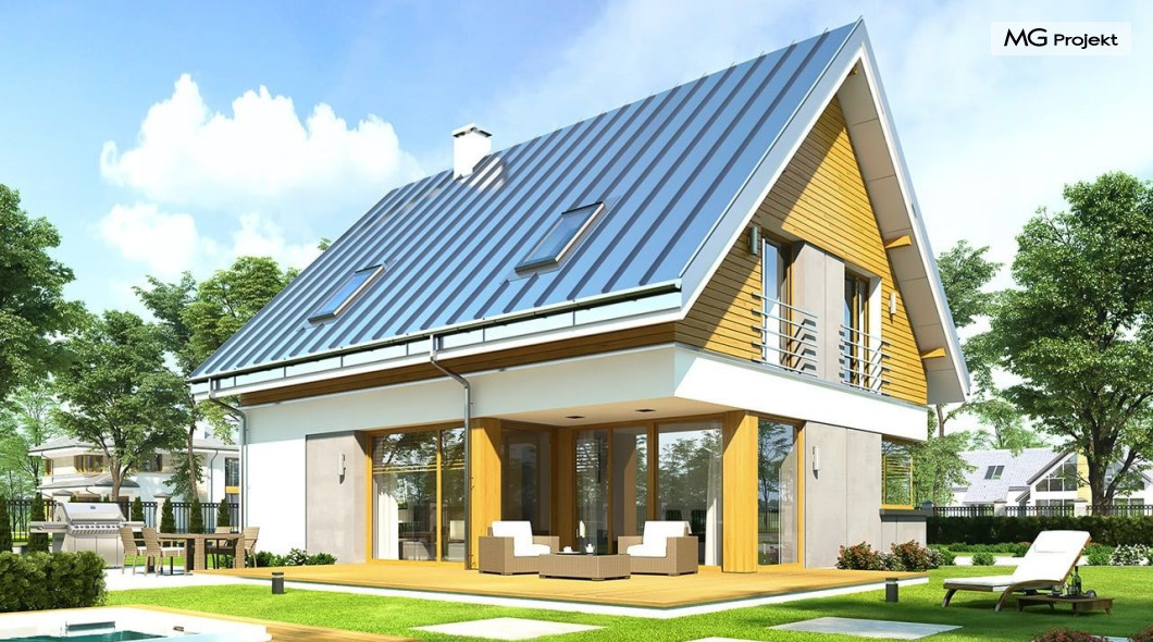Projekt domu Viking 2 jest jednym z projektów z serii domów "Viking" - pomniejszoną wersją ze zwężoną bryłą główną i pojedynczym garażem. Budynek zaprojektowano na planie prostokąta, przykrytego dwuspadowym symetrycznym dachem, z dobudowanym parterowym garażem. Prosta nowoczesna architektura idzie w parze z funkcjonalnie zaprojektowanym wnętrzem. Front domu zaakcentowano szerokimi drzwiami wejściowym z bocznym naświetlem, umieszczonymi w podcieniu wejściowym, oraz narożnym dużym oknem kuchennym. Drzwi garażowe z boku pozwalają na stworzenie urokliwego placyku wjazdowego przed domem. Co więcej : dzięki temu projekt domu Viking 2 nadaje się zarówno na działkę z wjazdem od północy, jak i od strony południowej ( bramą garażową do drogi ). Podział elewacji na poziome pasy, okładziny z drewna i z płyt włókowo-cementowych urozmaicają sylwetkę domu. Od strony ogrodowej zaprojektowano duże przeszklenie z salonu i z jadalni, otwierające część dzienną na ogród, oraz ładny podcień zadaszający częściowo taras ogrodowy. Wnętrze : na parterze zaprojektowaliśmy jednoprzestrzenną powierzchnię z połączonych pomieszczeń salonu, jadalni, holu i kuchni ze spiżarnią. Przy schodach przechodzimy do części gospodarczej, z magazynem, kotłownią i garażem. Na poddaszu mamy trzy ładne sypialnie ( w tym sypialnię rodziców z garderobą ), oraz łazienkę z kącikiem na pralnię. Dom choć niewielki jest bardzo funkcjonalny. Projekt domu Viking 2 będzie wygodnym miejscem do życia dla 3-5cioosobowej rodziny. Prosta konstrukcja budynku, łatwa zwarta bryła bez żadnych udziwnień, nowoczesne technologie i dobre ocieplenia dają energooszczędny, niedrogi w budowie i późniejszym utrzymaniu dom. Pracownia oferuje też wersję domu w odbiciu lustrzanym, wersję bazową (projekt domu Viking), wersję najmniejszą bez garażu (projekt domu Viking 3), wersję o pow. użytkowej: 156.1 m2 (projekt domu Viking 4), oraz wersję największą (projekt domu Viking 5). Vikinga można bardzo łatwo dostosować do standardu NF40. Zapraszamy.