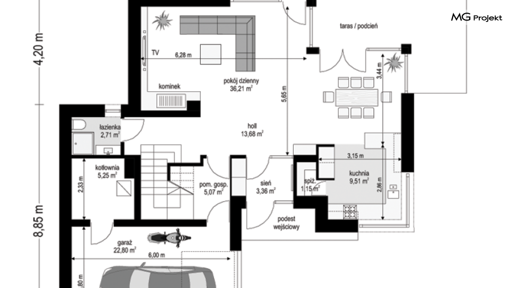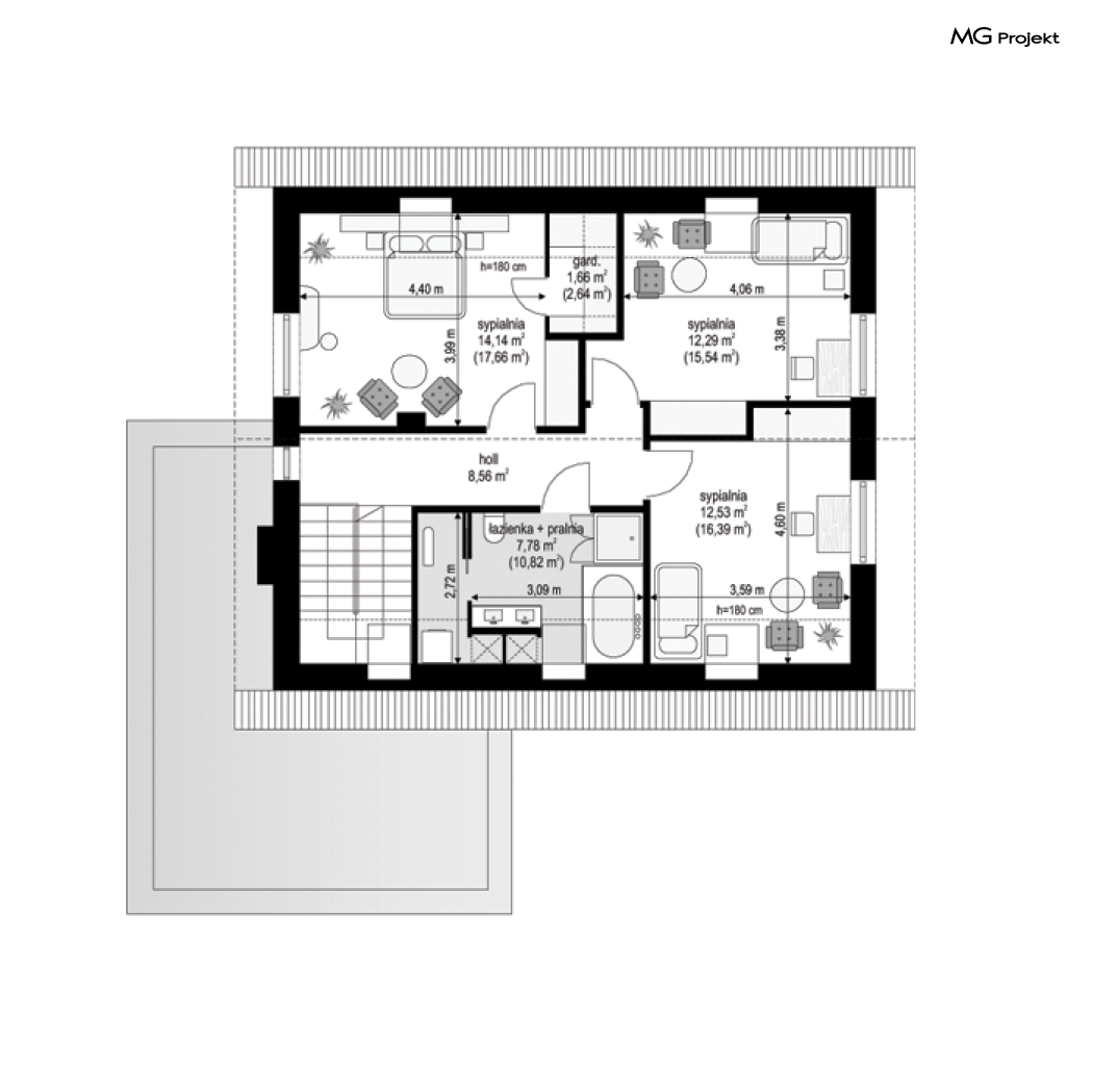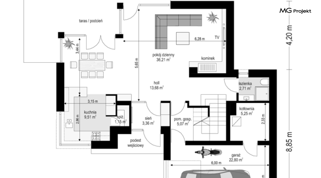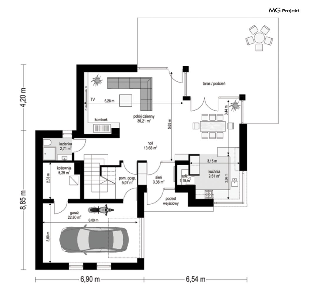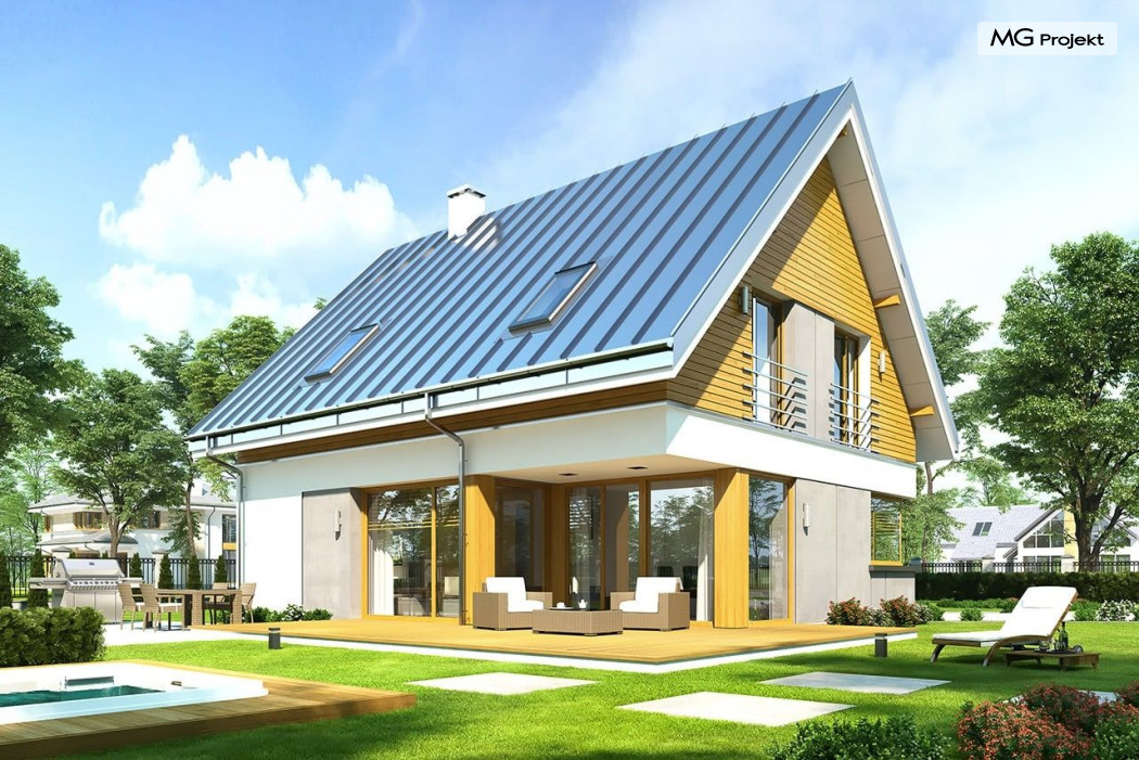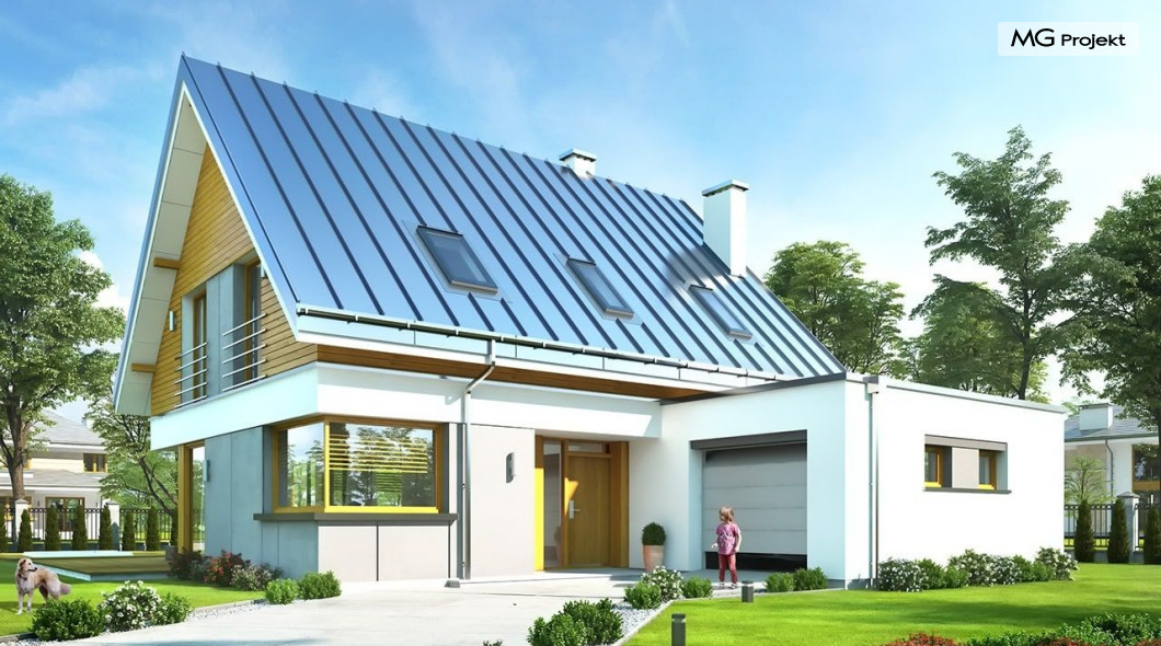 Projekt domu Viking 2 jest jednym z projektów z serii domów "Viking" - pomniejszoną wersją ze zwężoną bryłą główną i pojedynczym garażem. Budynek zaprojektowano na planie prostokąta, przykrytego dwuspadowym symetrycznym dachem, z dobudowanym parterowym garażem. Prosta nowoczesna architektura idzie w parze z funkcjonalnie zaprojektowanym wnętrzem. Front domu zaakcentowano szerokimi drzwiami wejściowym z bocznym naświetlem, umieszczonymi w podcieniu wejściowym, oraz narożnym dużym oknem kuchennym. Drzwi garażowe z boku pozwalają na stworzenie urokliwego placyku wjazdowego przed domem. Co więcej : dzięki temu projekt domu Viking 2 nadaje się zarówno na działkę z wjazdem od północy, jak i od strony południowej ( bramą garażową do drogi ). Podział elewacji na poziome pasy, okładziny z drewna i z płyt włókowo-cementowych urozmaicają sylwetkę domu. Od strony ogrodowej zaprojektowano duże przeszklenie z salonu i z jadalni, otwierające część dzienną na ogród, oraz ładny podcień zadaszający częściowo taras ogrodowy. Wnętrze : na parterze zaprojektowaliśmy jednoprzestrzenną powierzchnię z połączonych pomieszczeń salonu, jadalni, holu i kuchni ze spiżarnią. Przy schodach przechodzimy do części gospodarczej, z magazynem, kotłownią i garażem. Na poddaszu mamy trzy ładne sypialnie ( w tym sypialnię rodziców z garderobą ), oraz łazienkę z kącikiem na pralnię. Dom choć niewielki jest bardzo funkcjonalny. Projekt domu Viking 2 będzie wygodnym miejscem do życia dla 3-5cioosobowej rodziny. Prosta konstrukcja budynku, łatwa zwarta bryła bez żadnych udziwnień, nowoczesne technologie i dobre ocieplenia dają energooszczędny, niedrogi w budowie i późniejszym utrzymaniu dom. Pracownia oferuje też wersję domu w odbiciu lustrzanym, wersję bazową (projekt domu Viking), wersję najmniejszą bez garażu (projekt domu Viking 3), wersję o pow. użytkowej: 156.1 m2 (projekt domu Viking 4), oraz wersję największą (projekt domu Viking 5). Vikinga można bardzo łatwo dostosować do standardu NF40. Zapraszamy.
